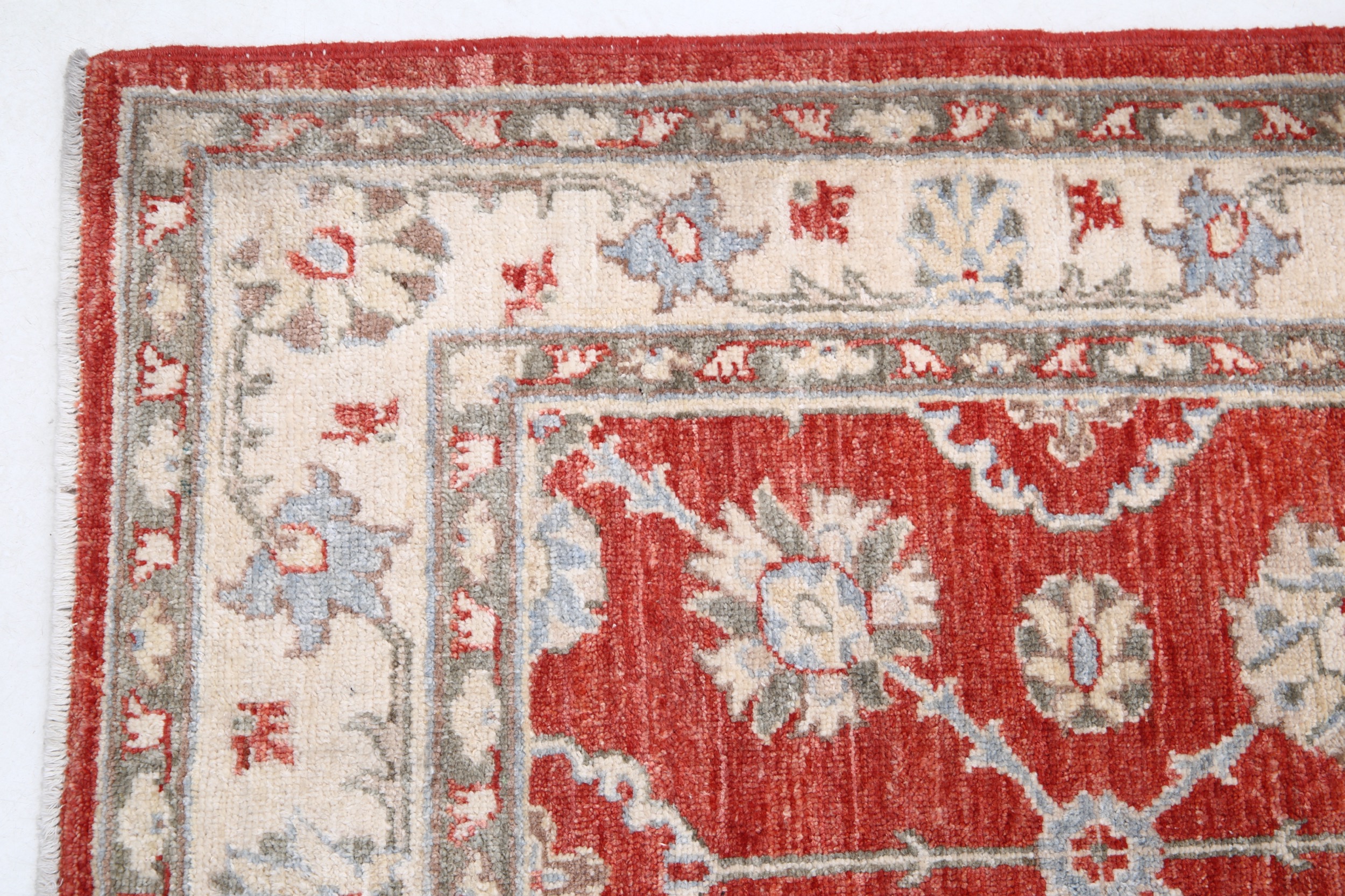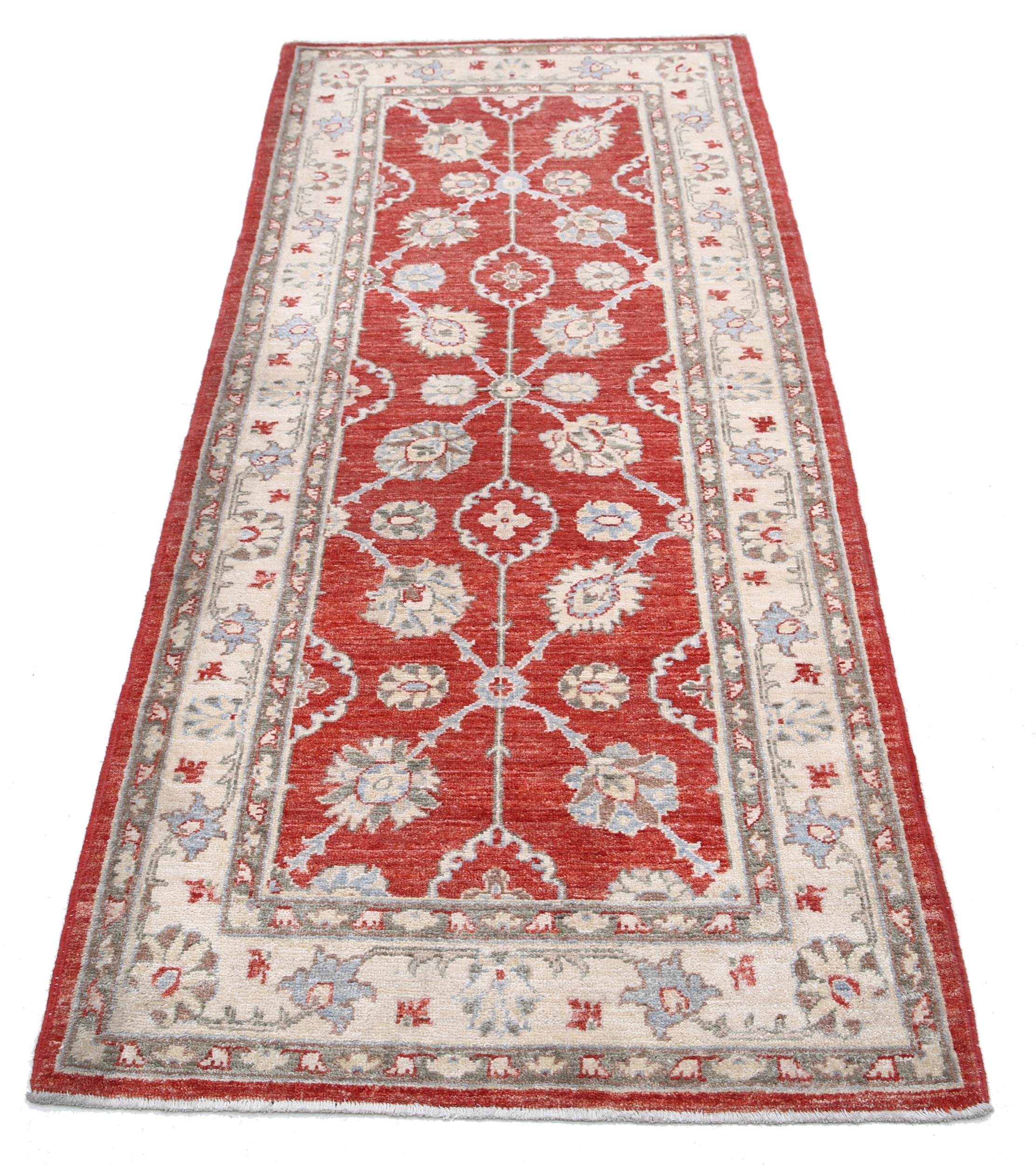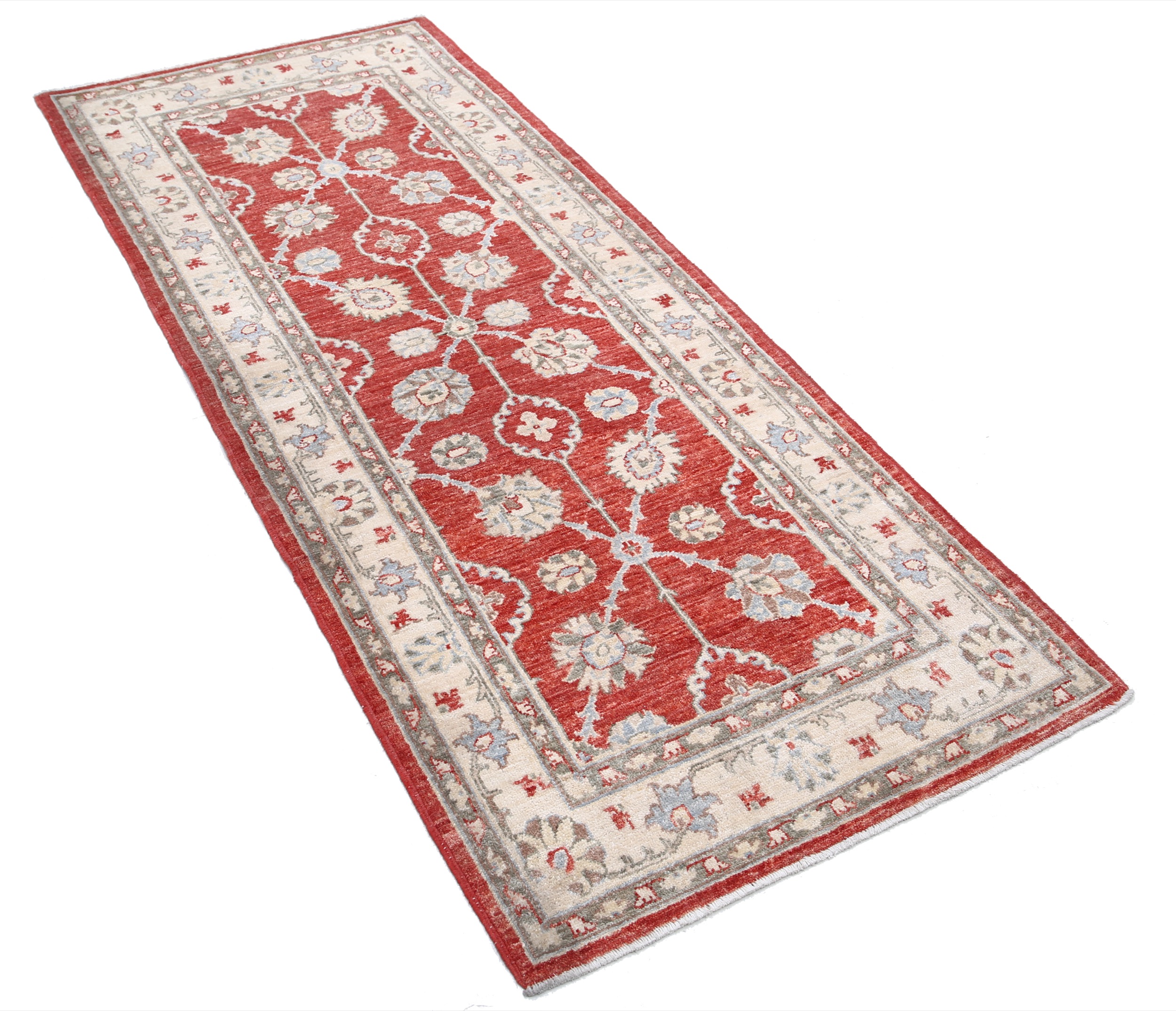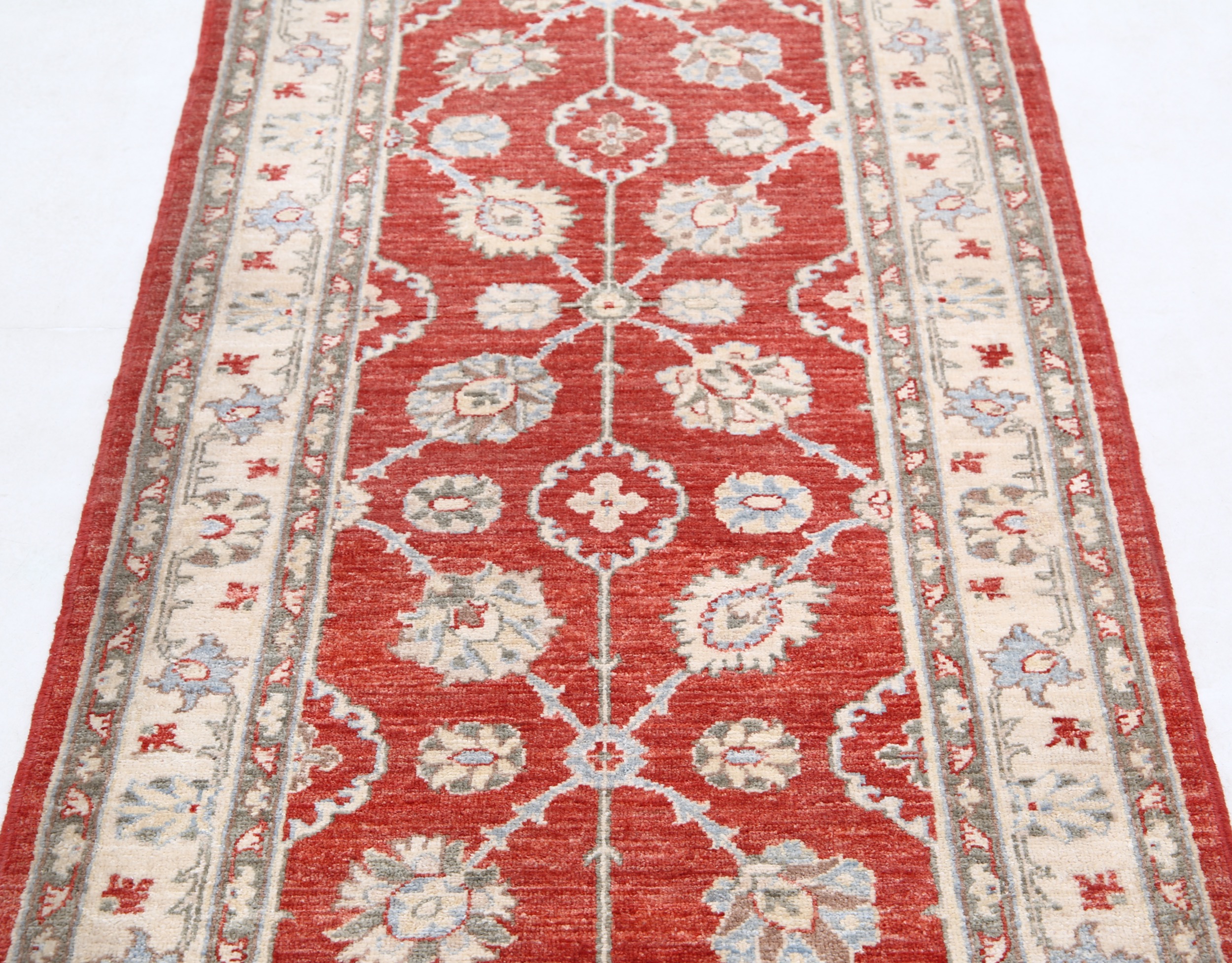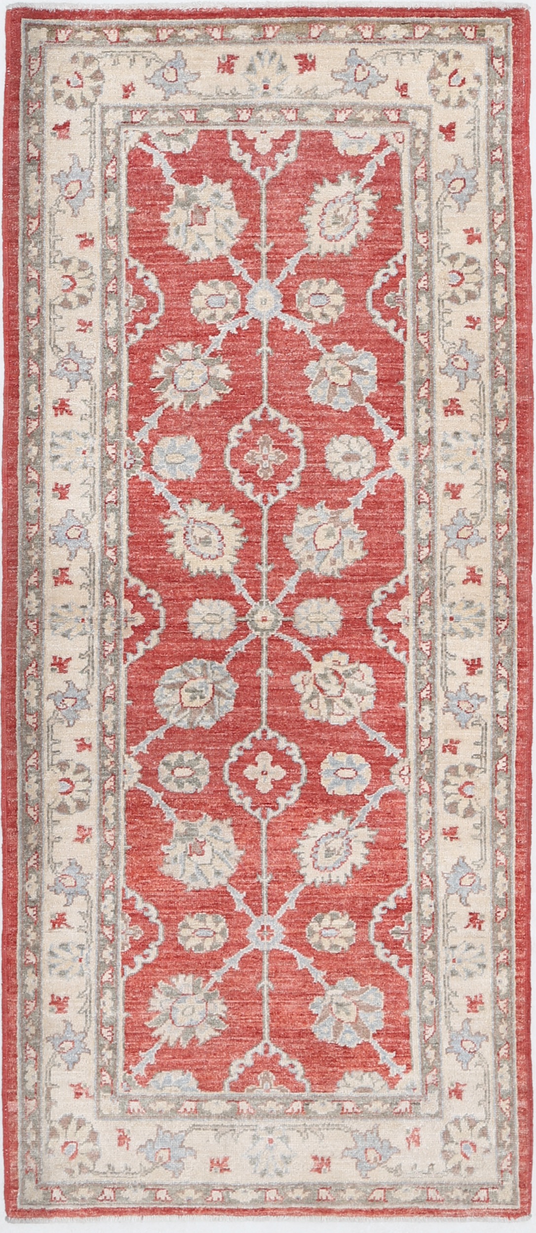 Authentic hand-knotted Oushak rug (2’9″ x 6’7″) from Afghanistan/Pakistan. This beautiful red, beige, and blue/green/brown floral rug features a low-medium pile (1/4″-1/3″) and approximately 156 KPSI. 100% wool with a cotton foundation.