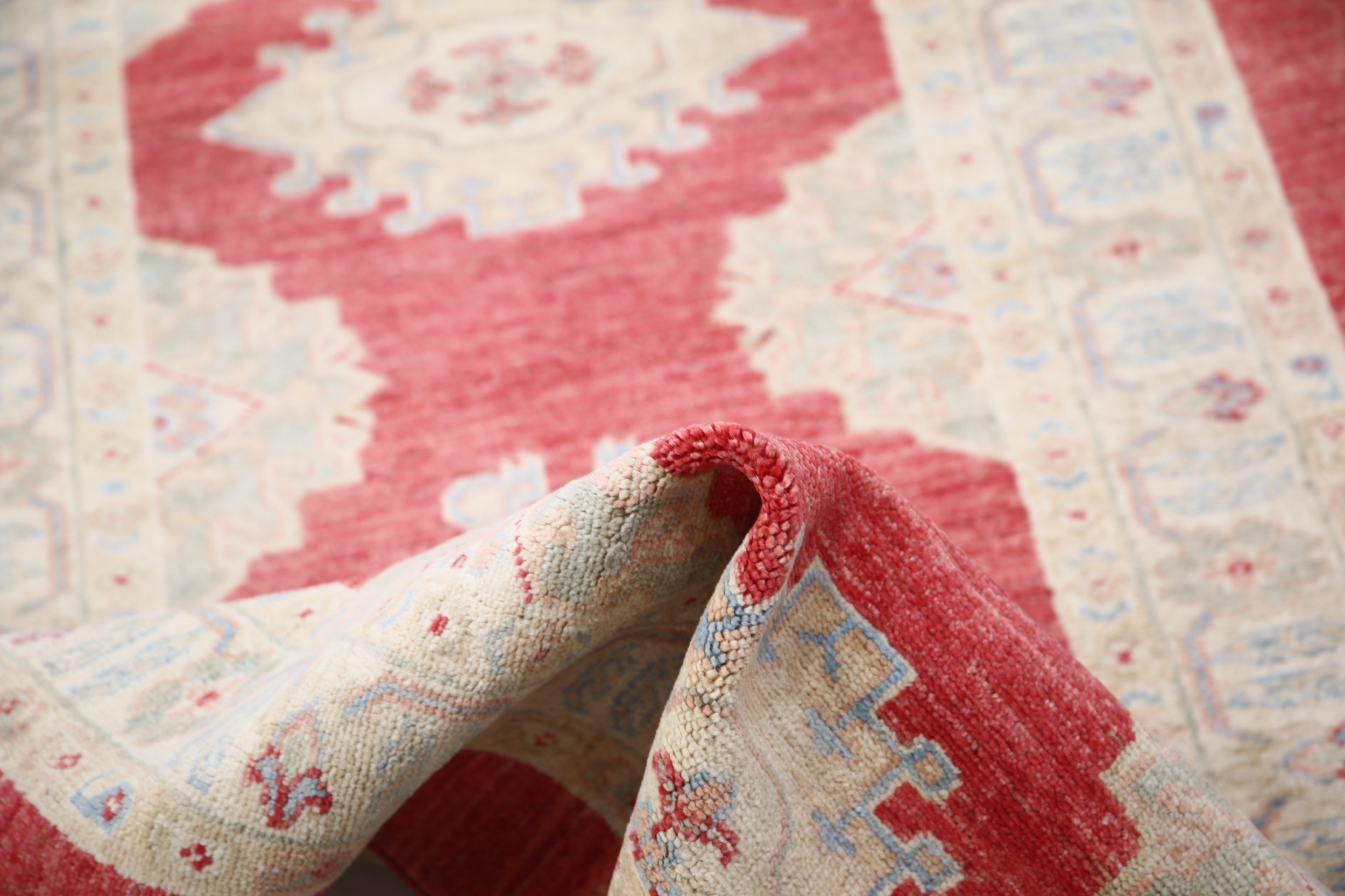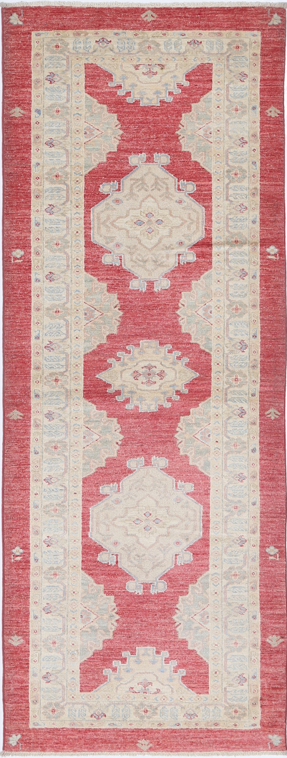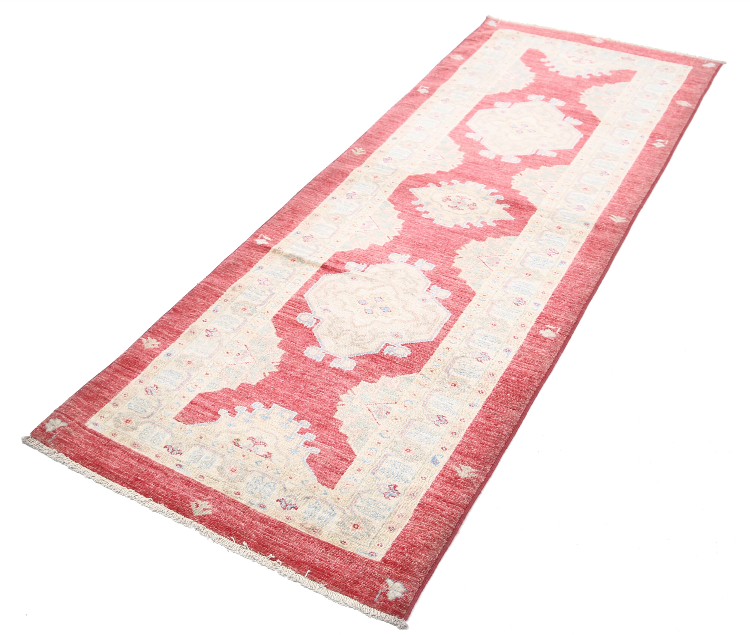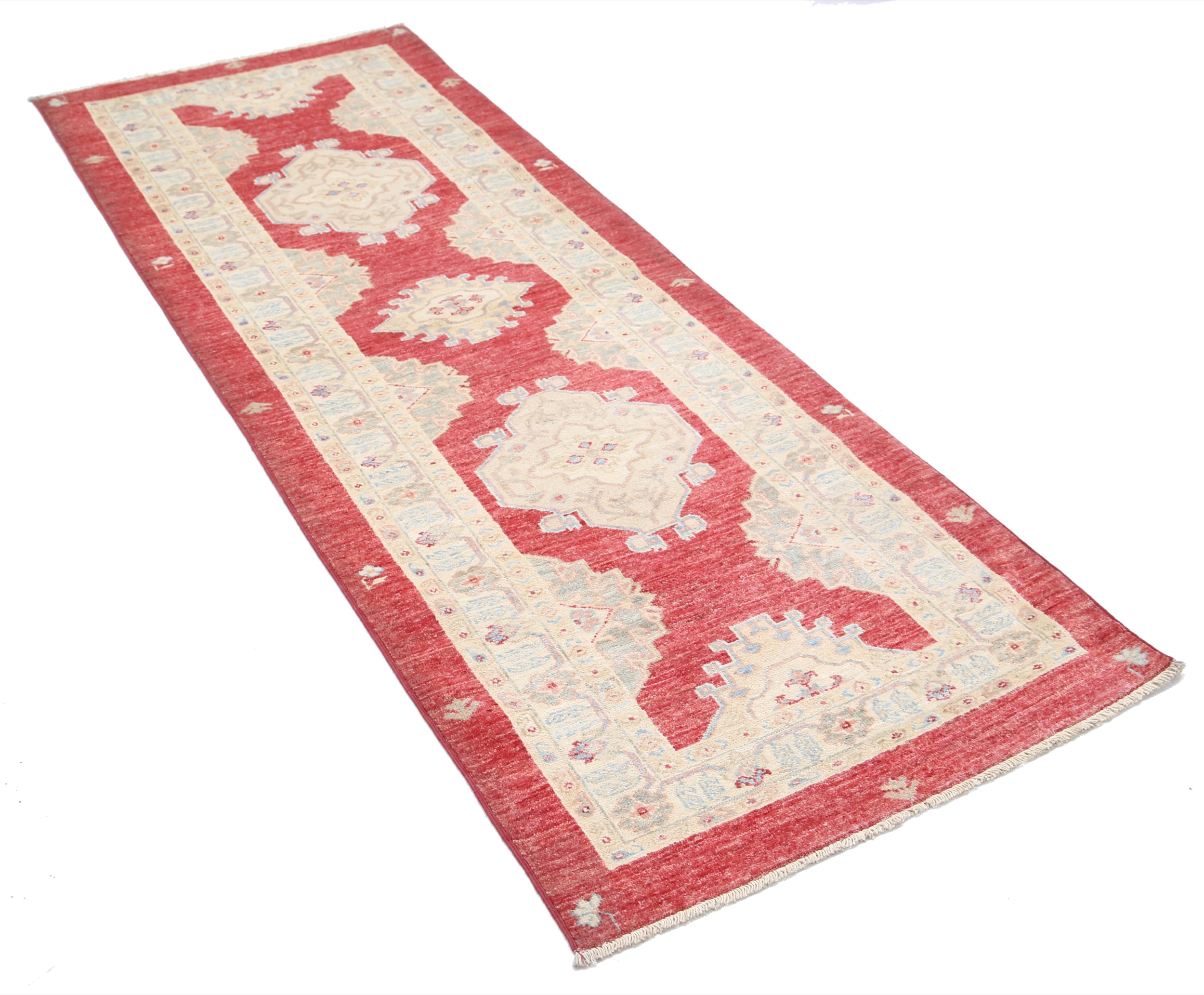 A stunning example of Oriental craftsmanship, this 2’9″ x 7’6″ Oushak rug is hand-knotted in Afghan / Pakistan. Its red field and beiges border frame a detailed allover design, known for its refined, traditional aesthetics. Durable and beautifully textured with a low medium pile 1/4″-1/3″ pile.