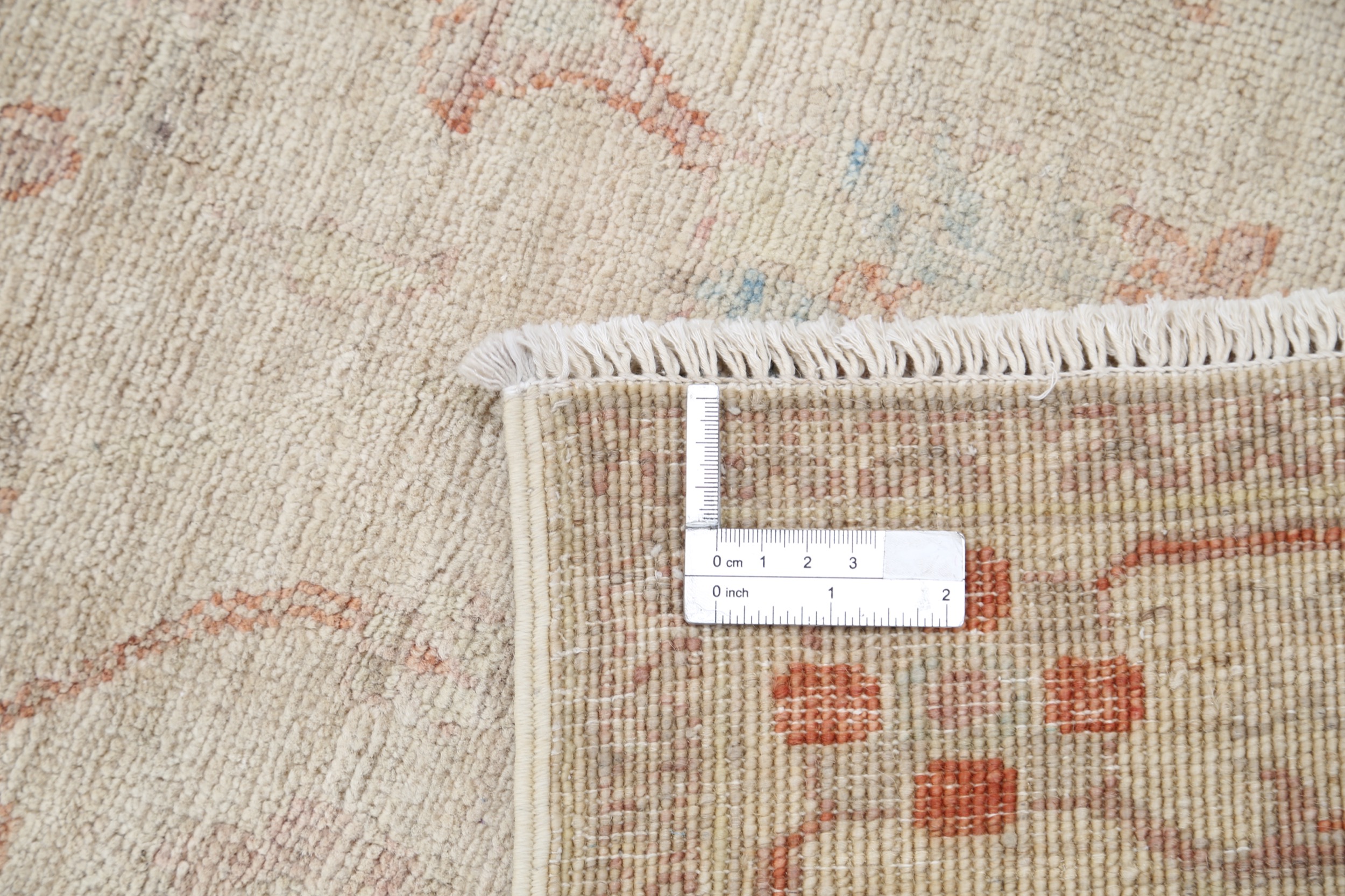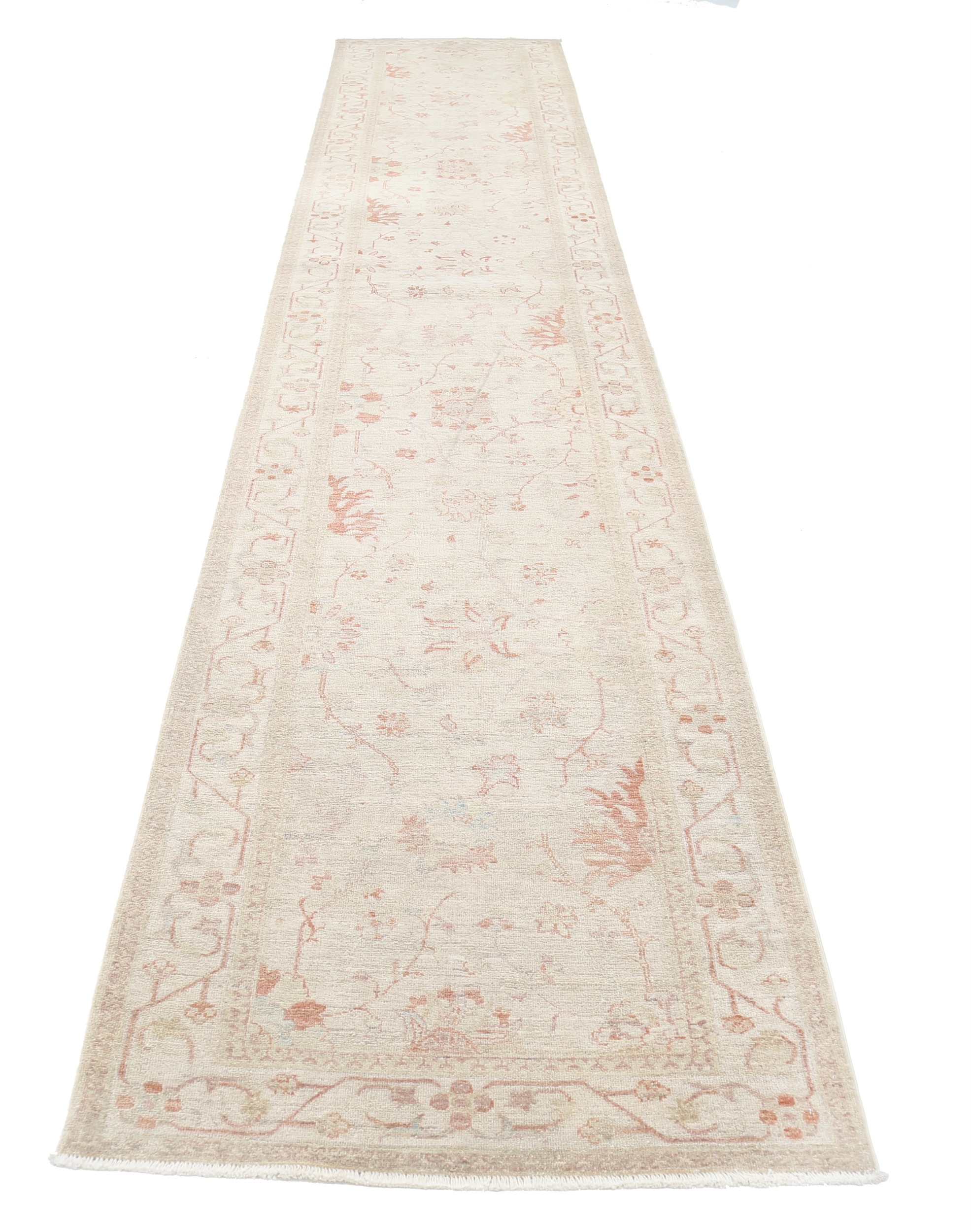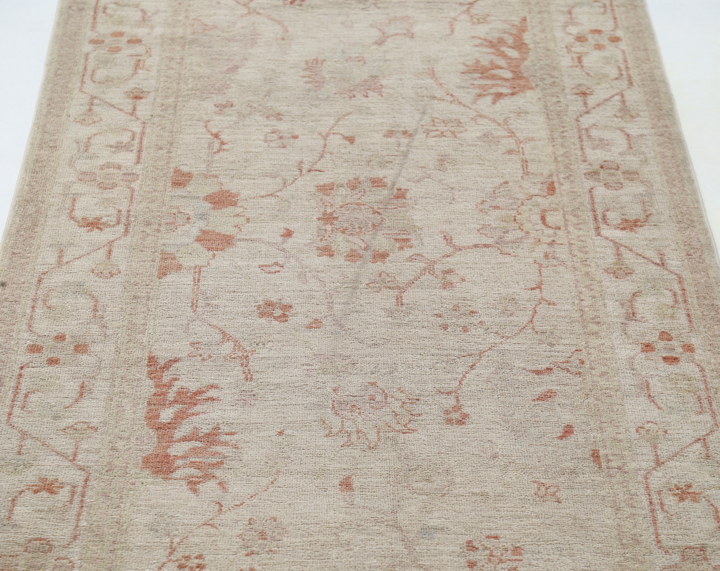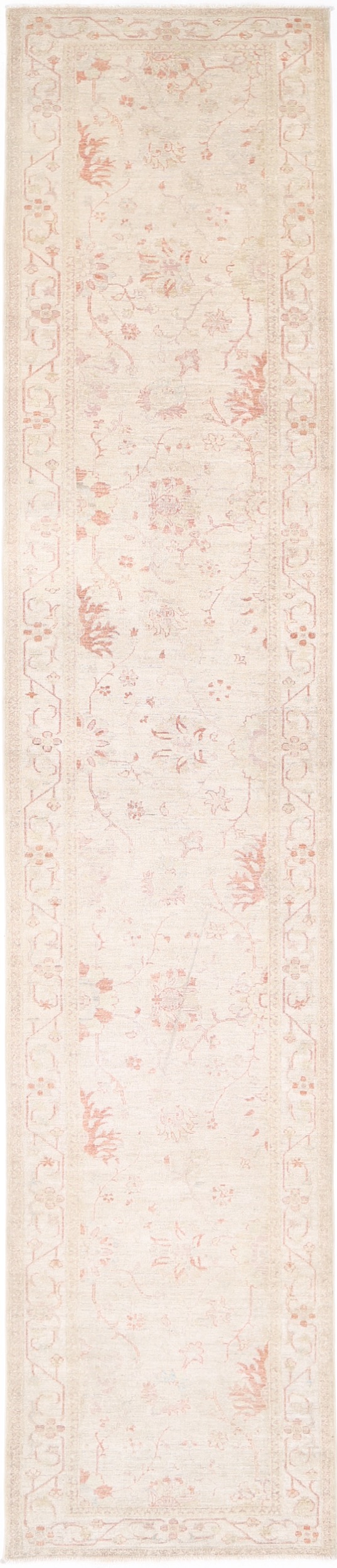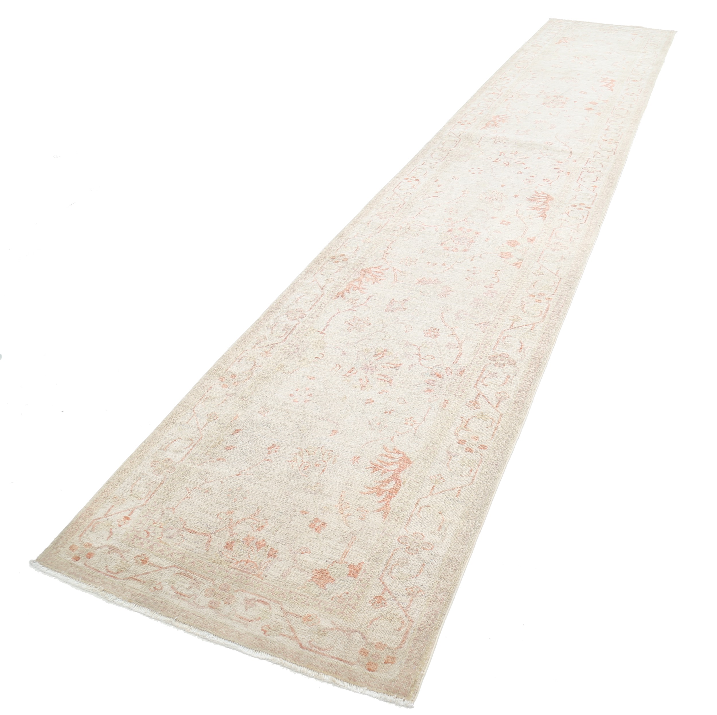 This 3’1″ x 16’7″ Oushak rug, hand-knotted in Afghan / Pakistan, features a floral design. Crafted with approx. 156 kpsi, its field color is Beige with a Beige border. The rug has a low medium pile 1/4″-1/3″ and a 100% wool pile, in excellent & washed condition.