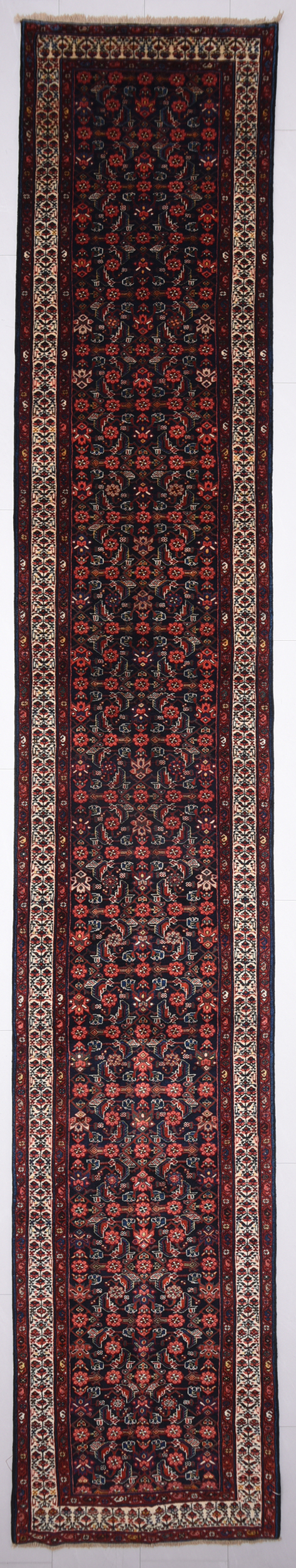 Hand Knotted Mehraban Persian rug, measuring 3’1″ x 17’7″, showcases a stunning blend of blue and beige hues. This exquisite rug features an intricate Herati design, representing nature and rebirth. Crafted using 100% wool and cotton, it boasts a medium pile height of 1/3″-3/8″. With an impressive knot count of approximately 225 KPSI, this rug is not only visually captivating but also durable. Its age of 80-100 years adds a touch of history and charm, making it a unique and valuable addition to any space.