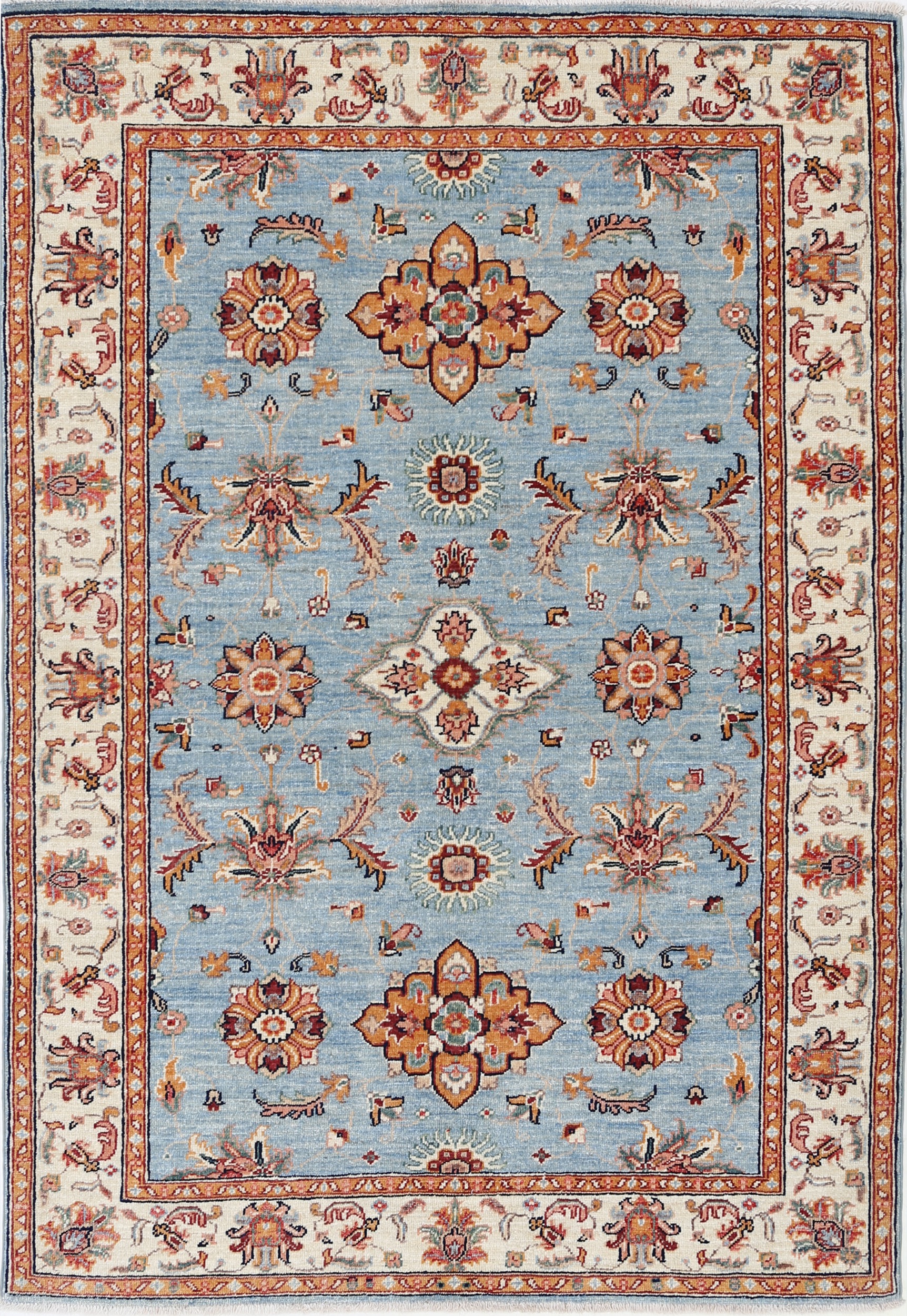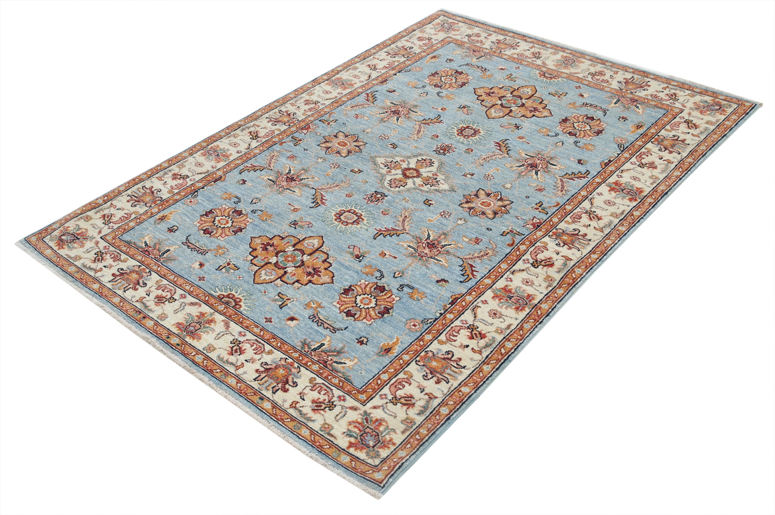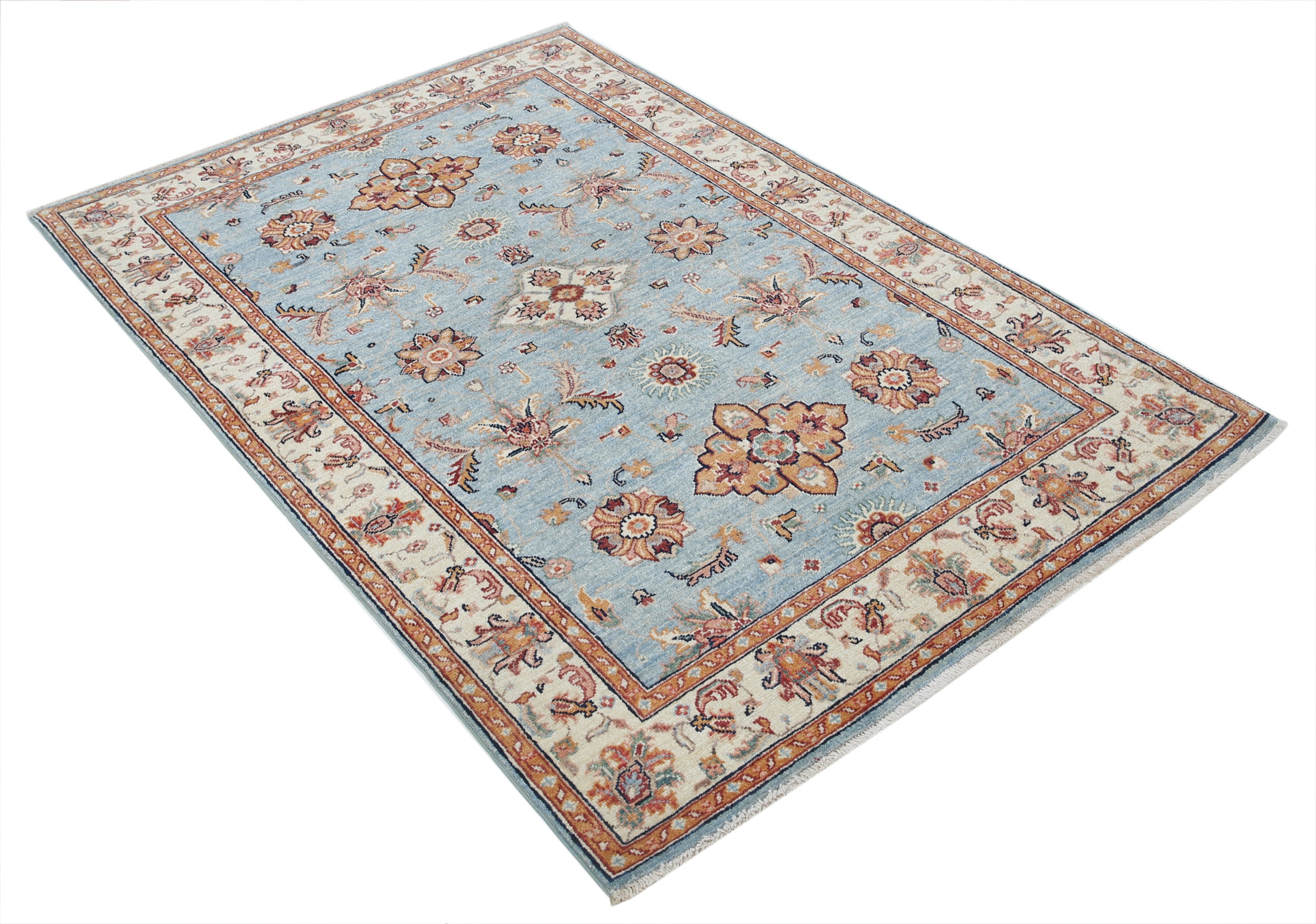 This beautiful Oushak rug (3’11” x 5’9″, approx. 4×6) is hand-knotted in Afghanistan/Pakistan. Featuring a vibrant floral design in blue, beige, orange, brown, and green, this 100% wool rug boasts a low-medium pile (1/4″-1/3″) and approximately 156 knots per square inch. A stunning addition to any room!
