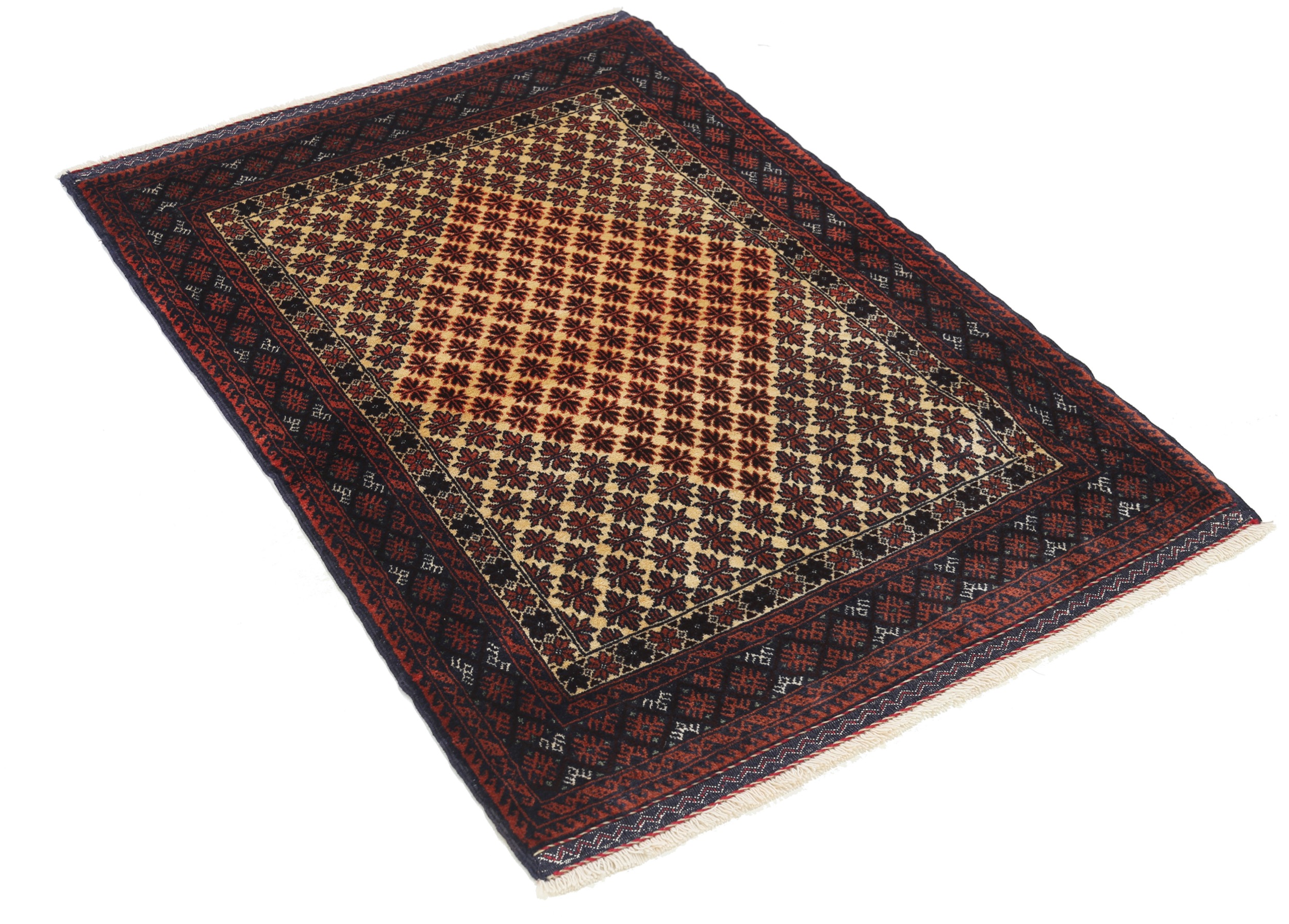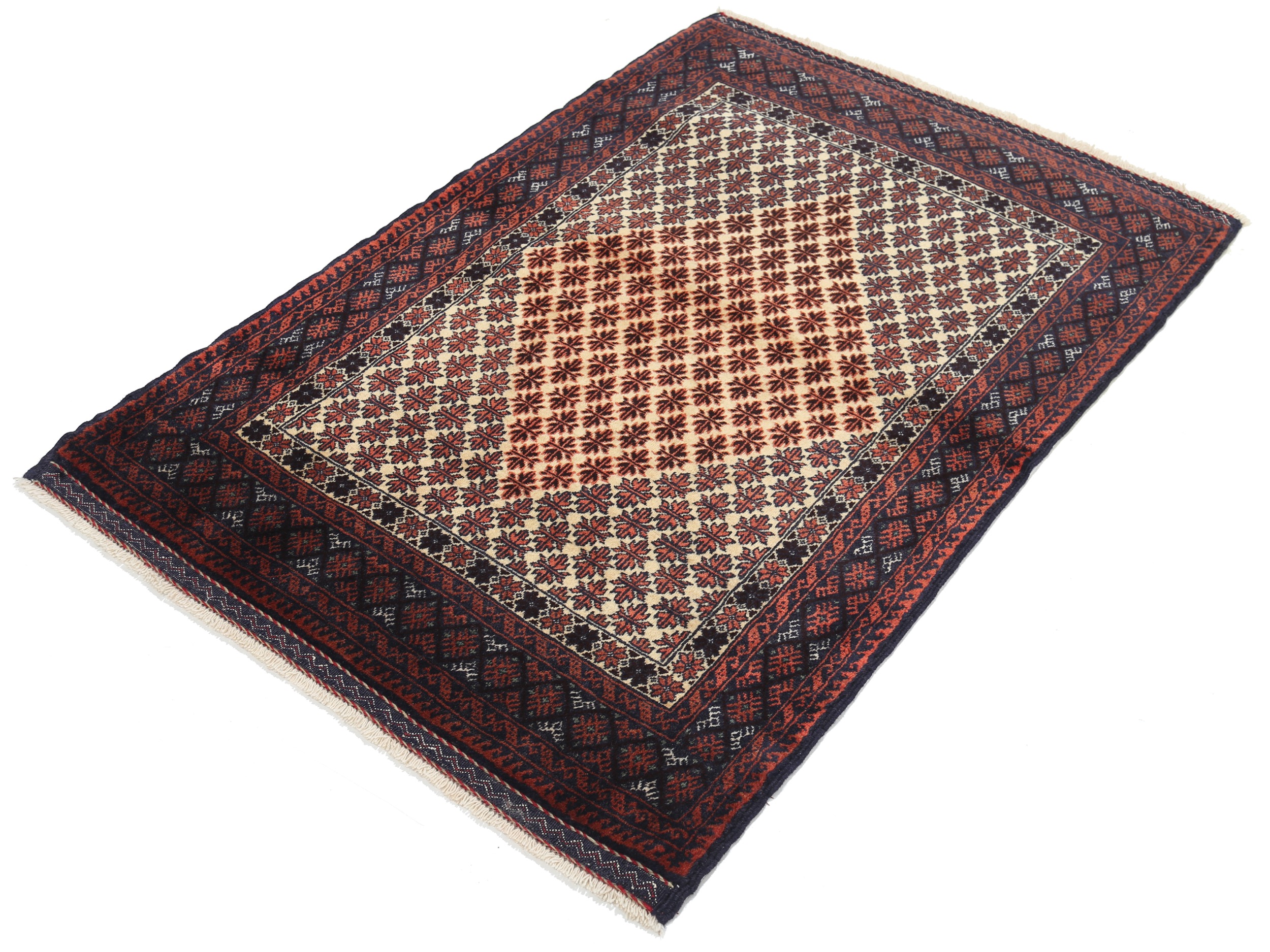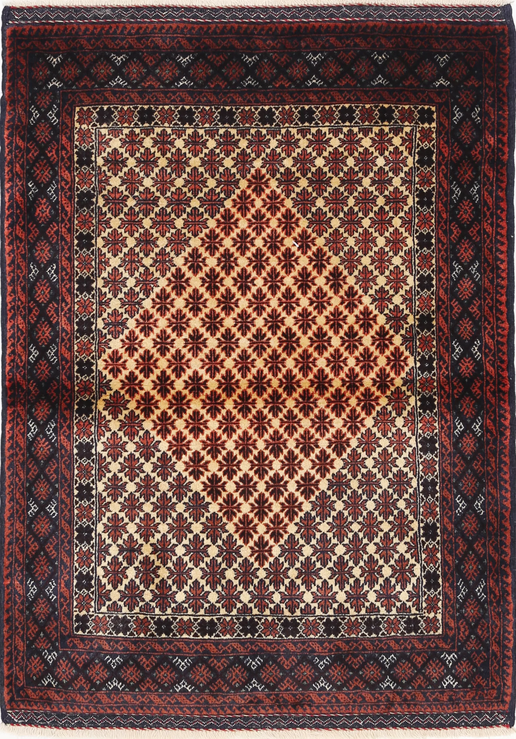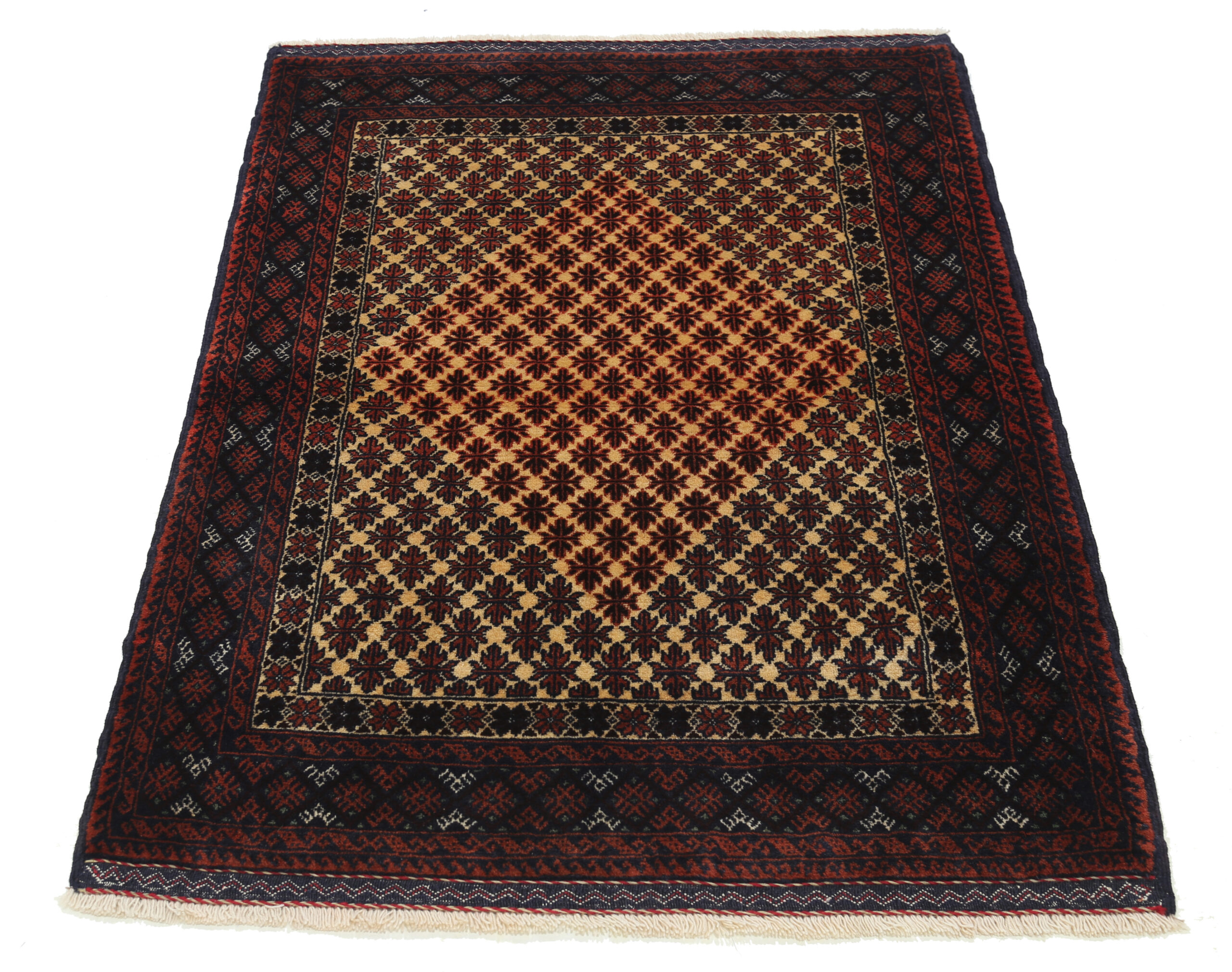 This Baluchi Persian rug features a vibrant allover design in black, green, orange, and brown. Made from 100% wool with a medium pile height of 1/3″-3/8″, it has a knot density of approximately 196 KPSI. The dimensions are 3’2″ x 4’6″, making it a perfect addition to any space.