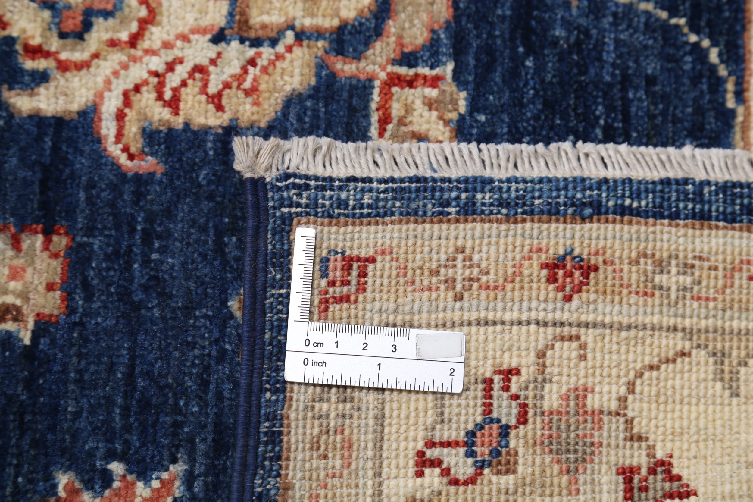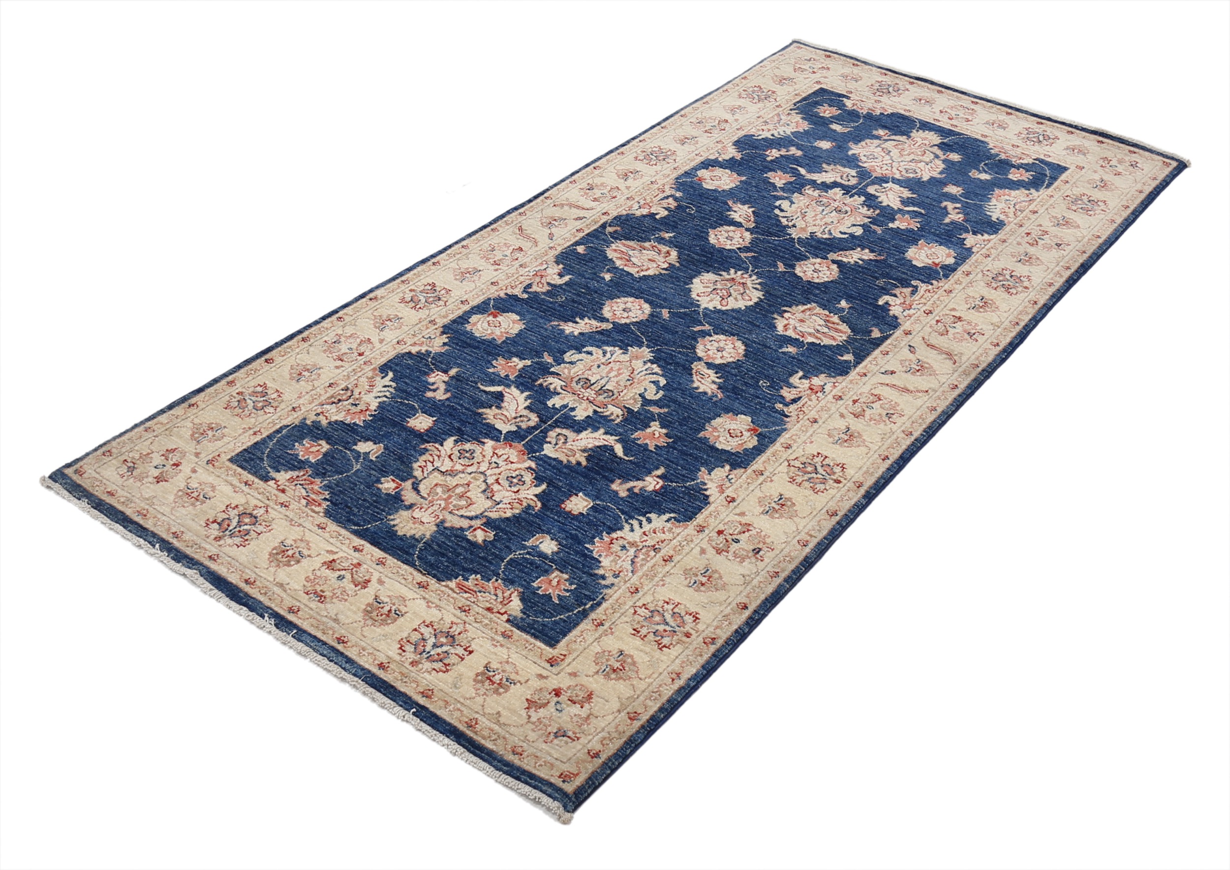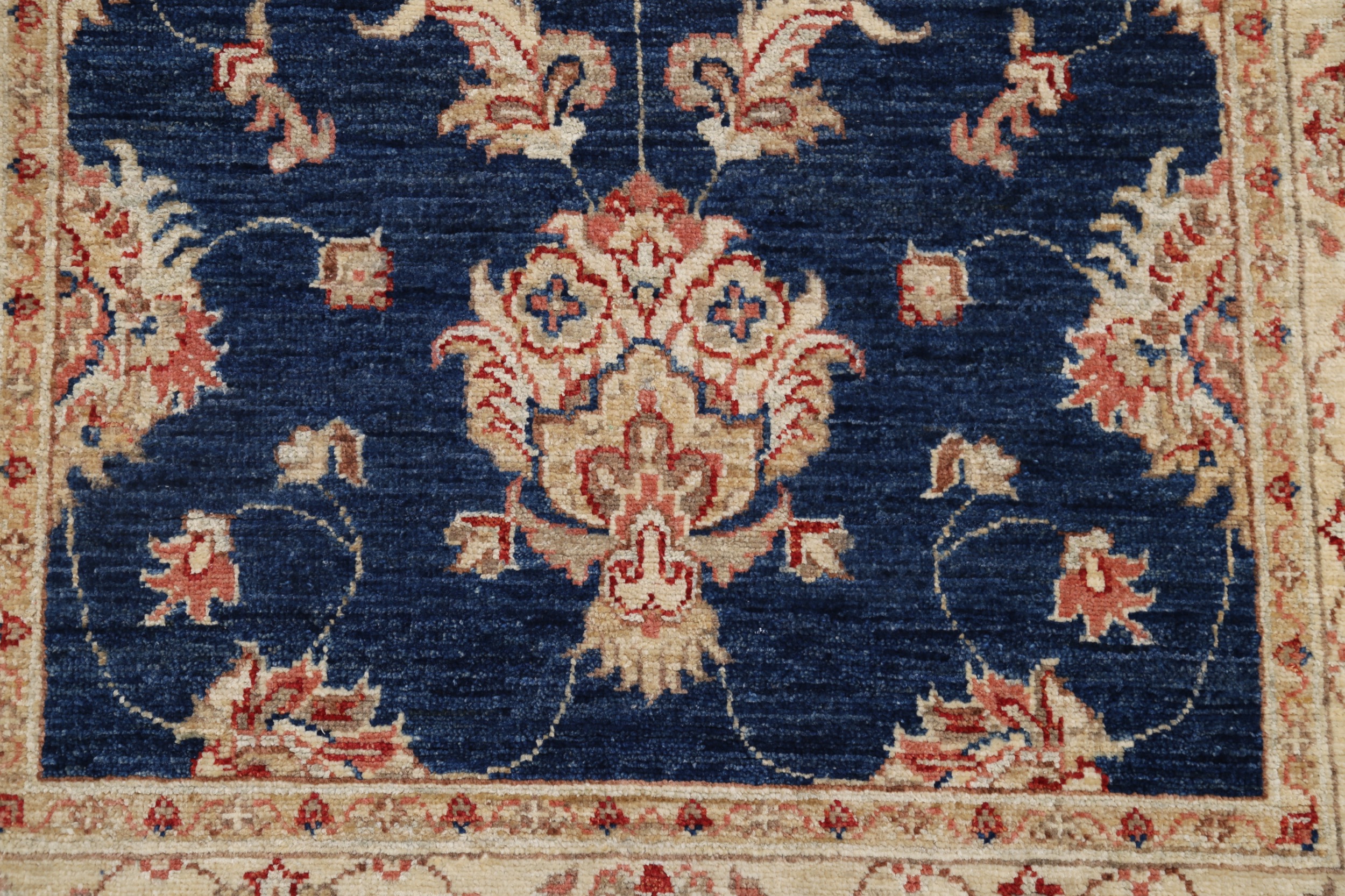 This 3’2″ x 6’11” Oushak rug, hand-knotted in Afghan / Pakistan, features a allover design. It is woven with Approx. 156KPSI, showcasing a field in Blue and a Beige border. The rug has a Low Medium Pile and a 100% Wool pile, and is in excellent condition.