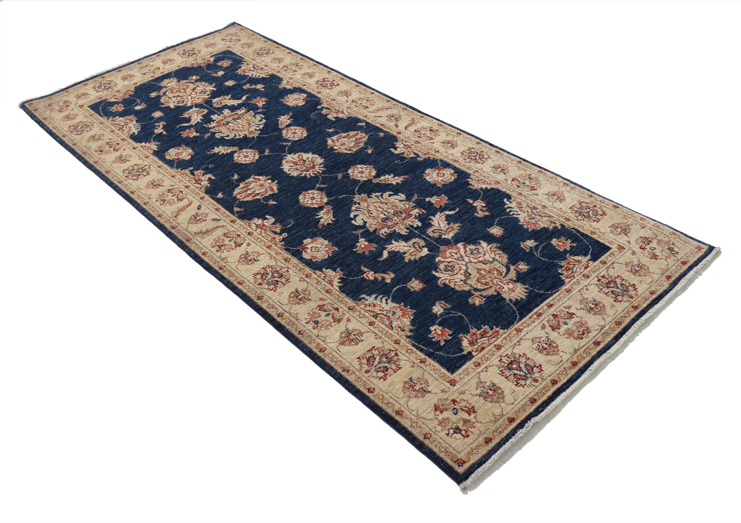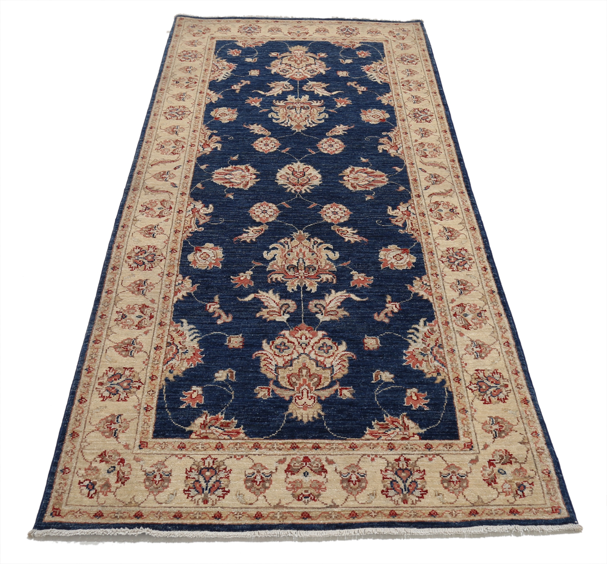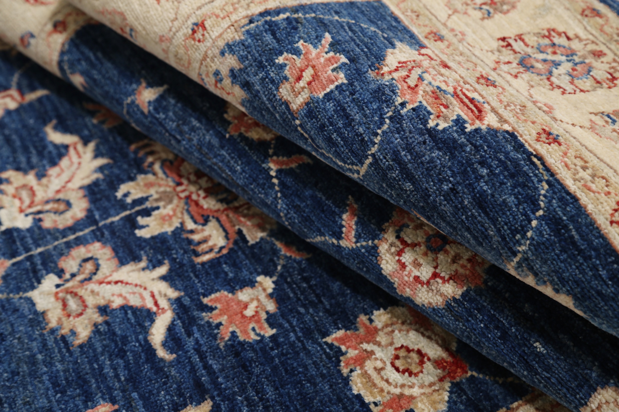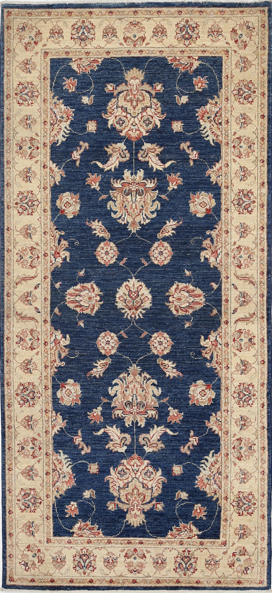 This 3’2″ x 6’11” Oushak rug, hand-knotted in Afghan / Pakistan, features a allover design. It is woven with Approx. 156KPSI, showcasing a field in Blue and a Beige border. The rug has a Low Medium Pile and a 100% Wool pile, and is in excellent condition.