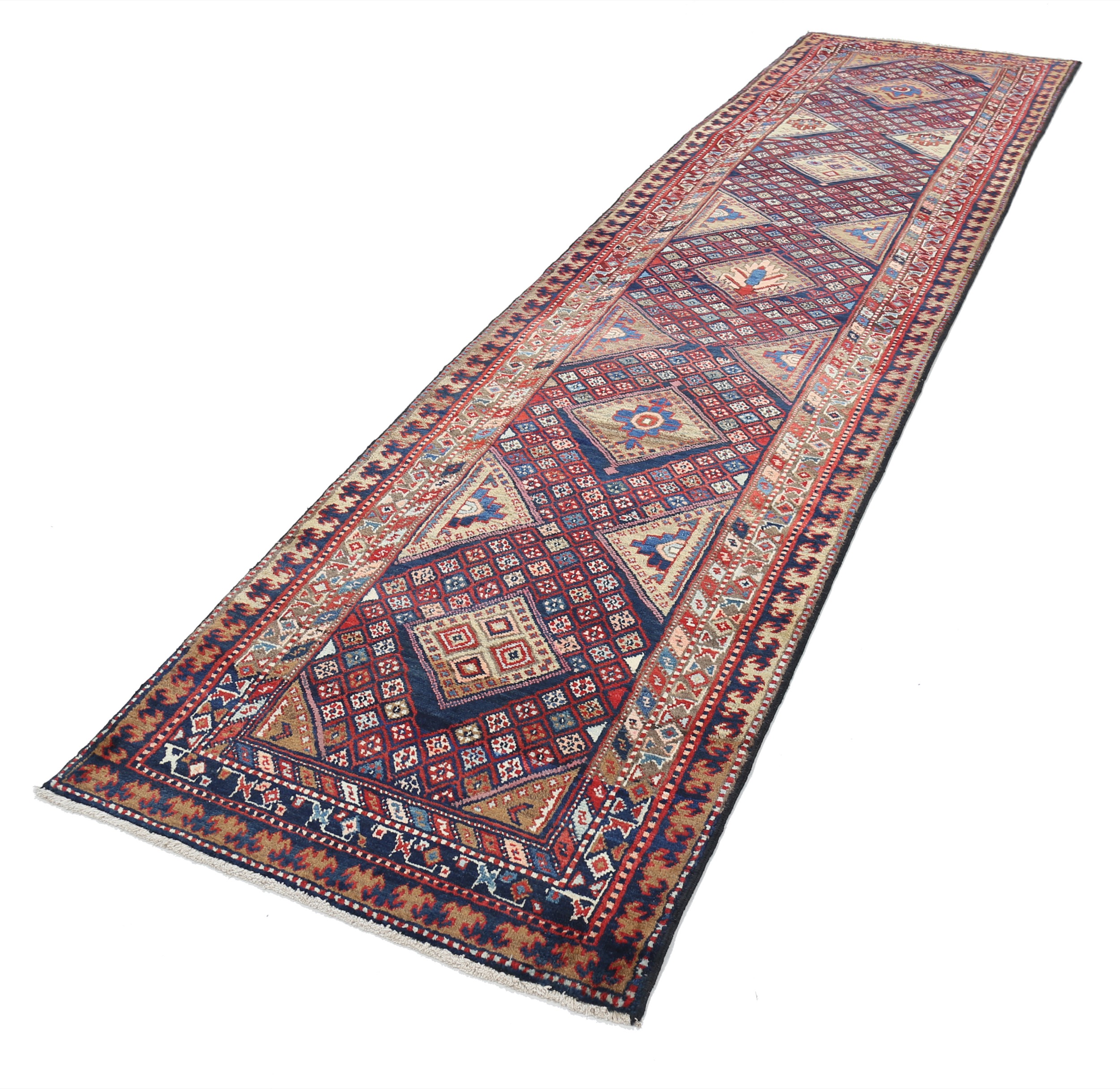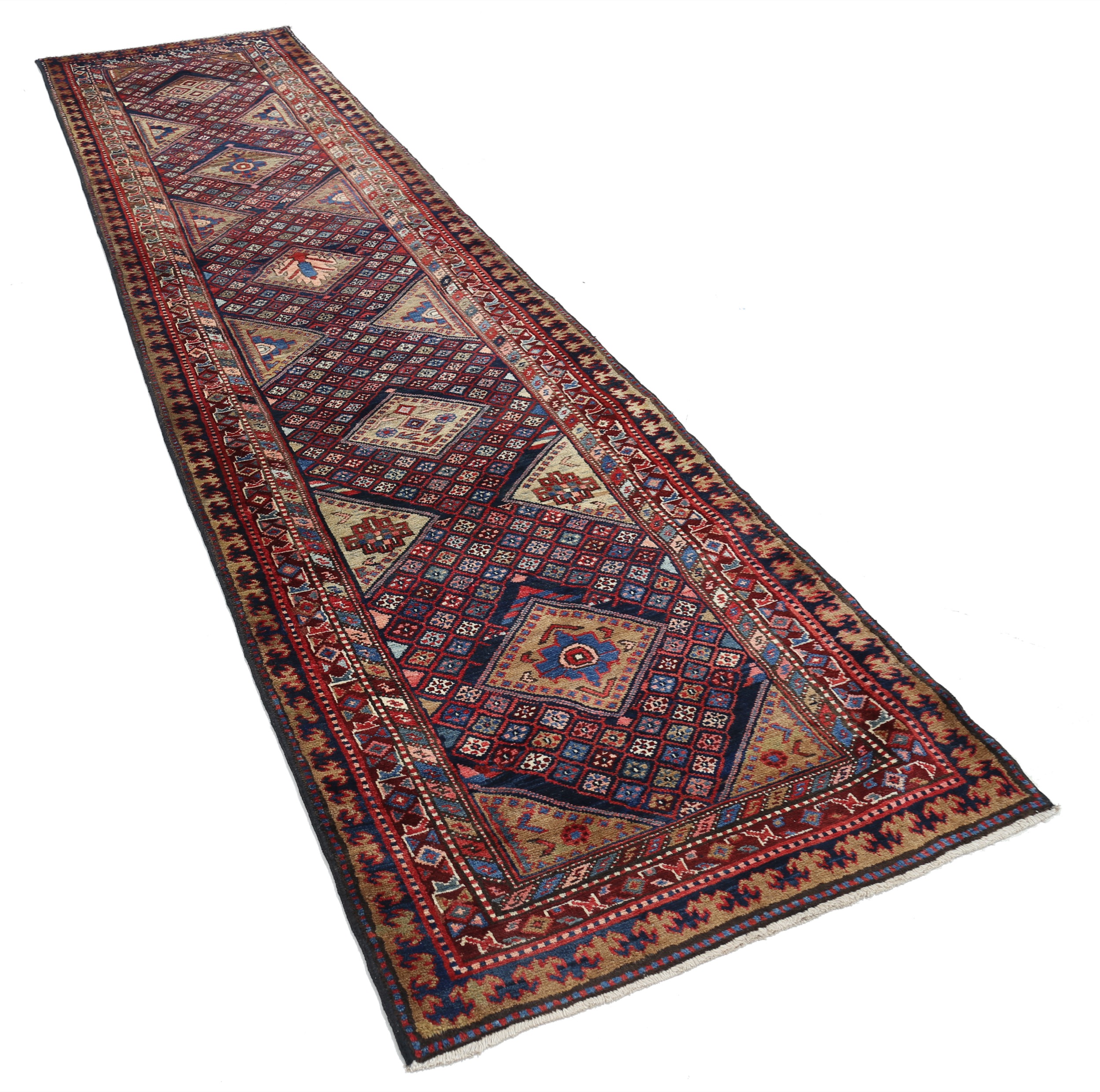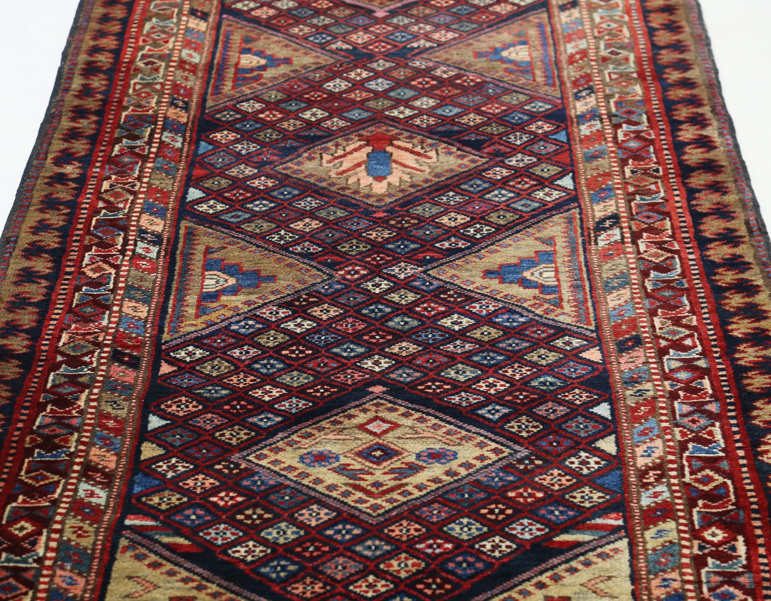 This vintage Persian Sarab rug, aged 40-50 years, features a stunning allover blue pattern on a red background. Made from 100% wool with a high pile of 1/2″-5/8″, it has a knot density of approximately 144 KPSI. The dimensions are 3’3″ x 12’5″.