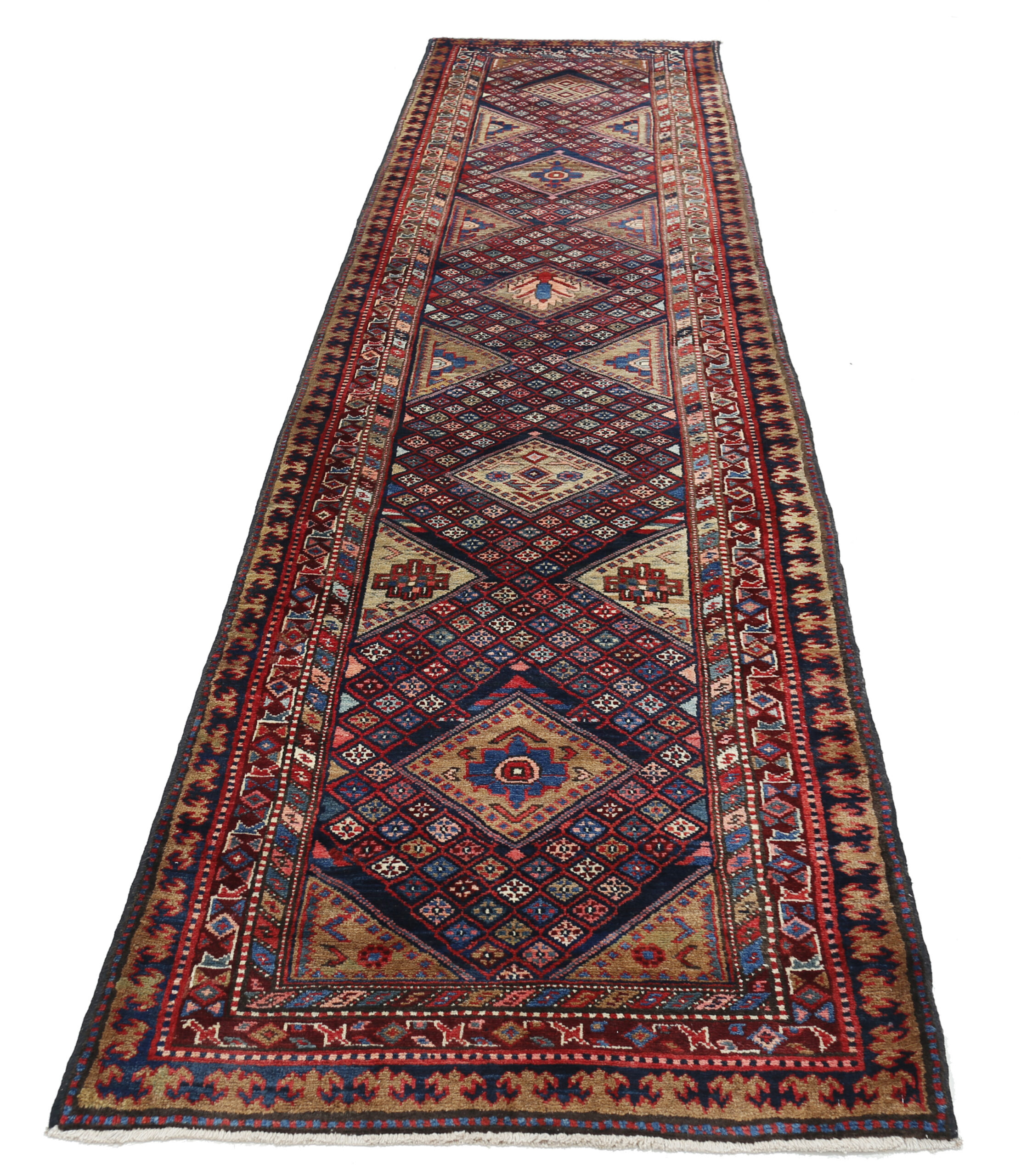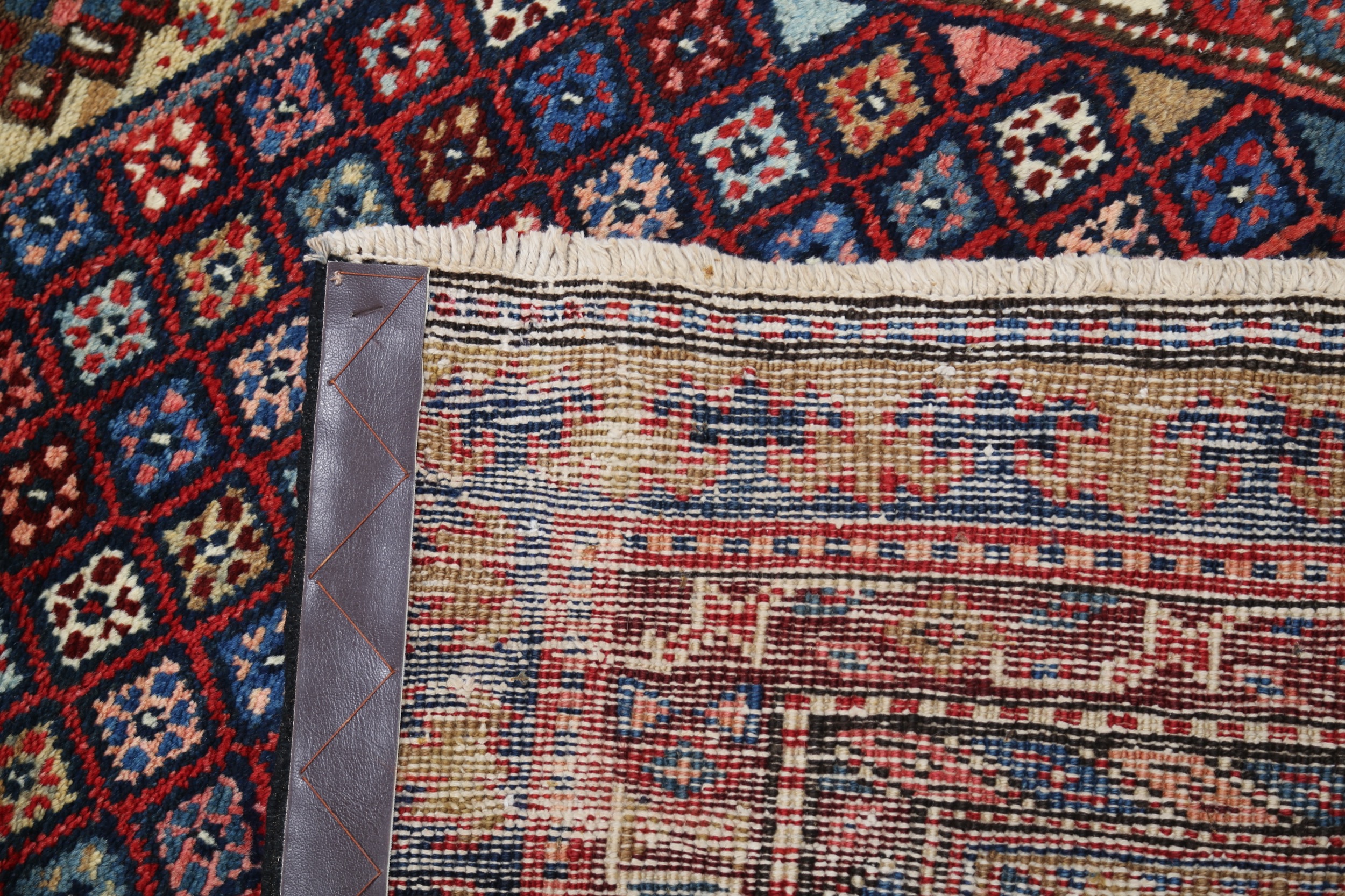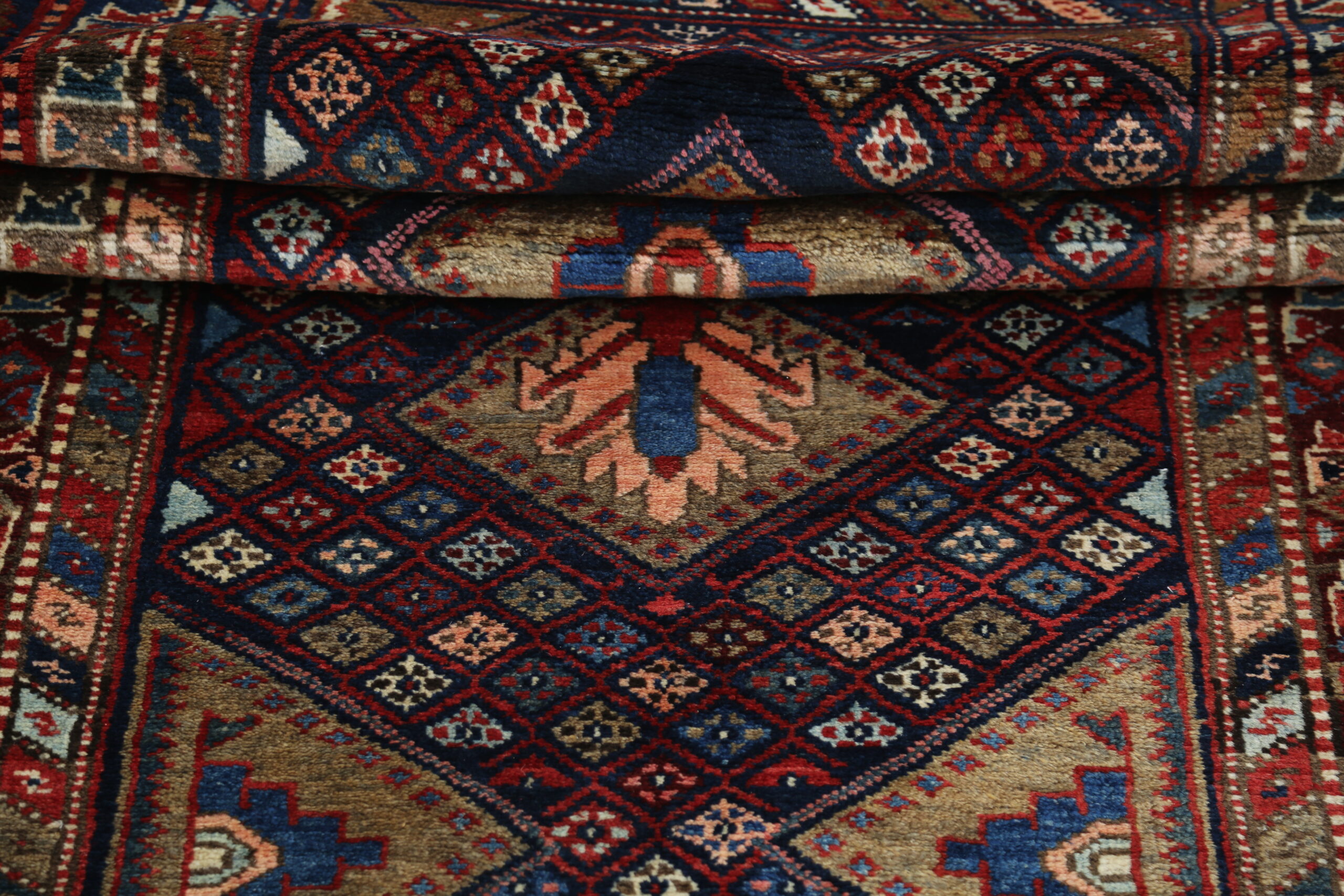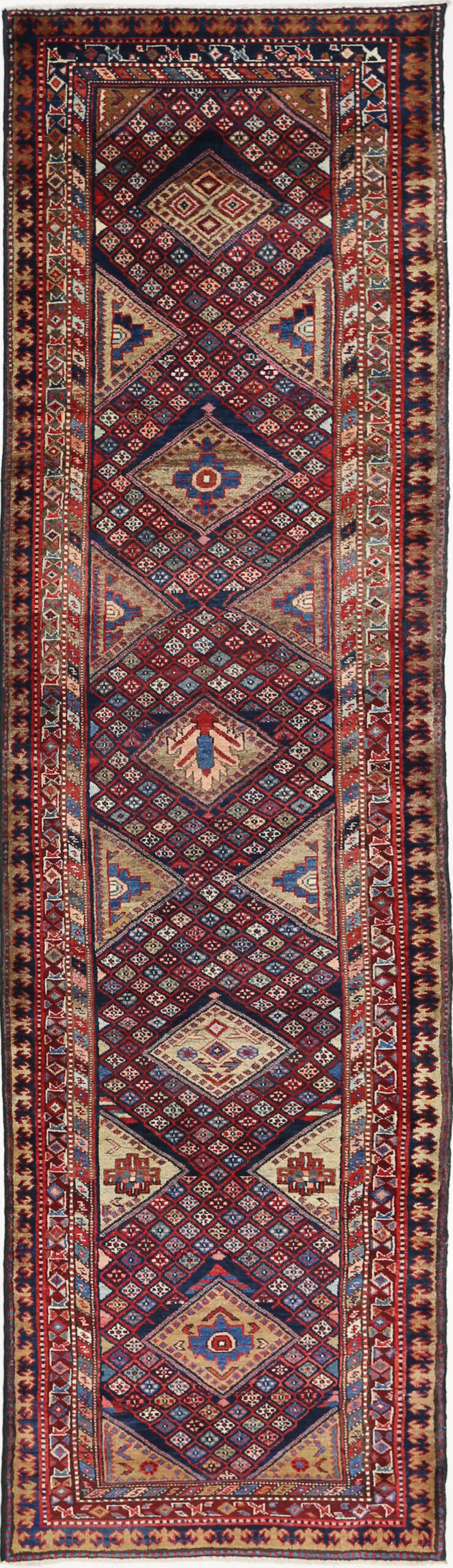 This vintage Persian Sarab rug, aged 40-50 years, features a stunning allover blue pattern on a red background. Made from 100% wool with a high pile of 1/2″-5/8″, it has a knot density of approximately 144 KPSI. The dimensions are 3’3″ x 12’5″.