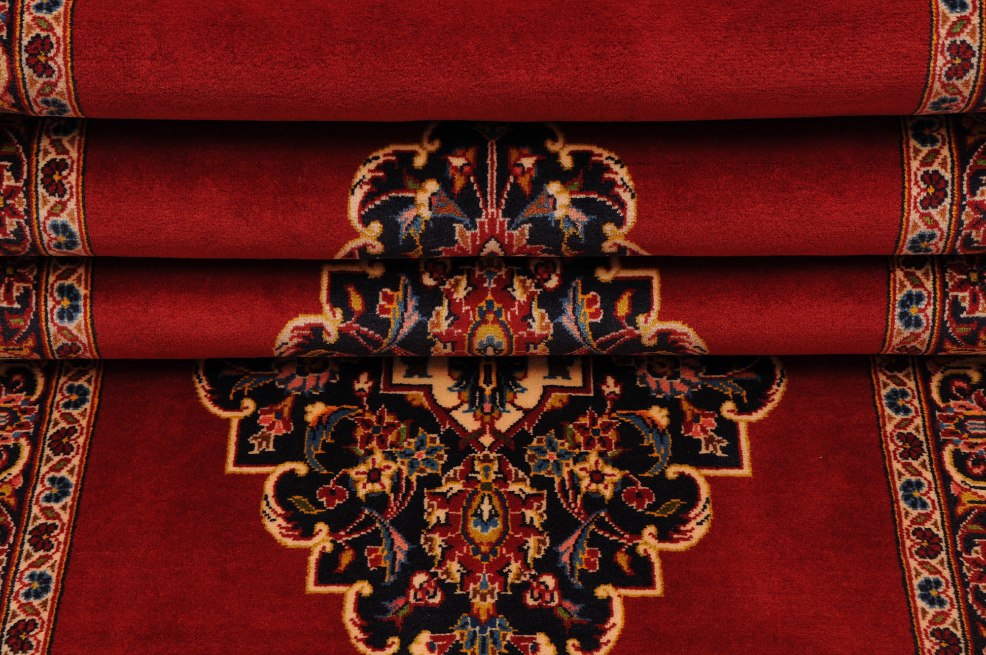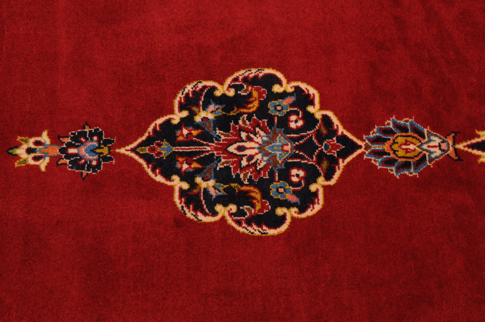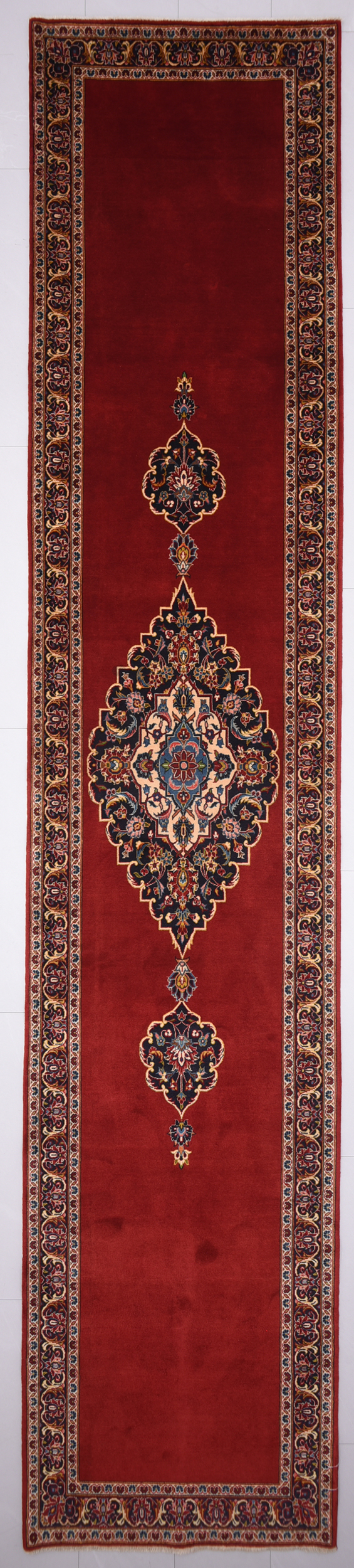 Hand Knotted Kashan rug with dimensions of 3’3″ x 16’2″. This rug has an aged appearance, estimated to be around 40-50 years old. The colors featured are red and blue on an open field. The rug has a density of approximately 196 knots per square inch (KPSI). Made from 100% wool with a high pile measuring 1/2″ to 5’8″. It also contains cotton.