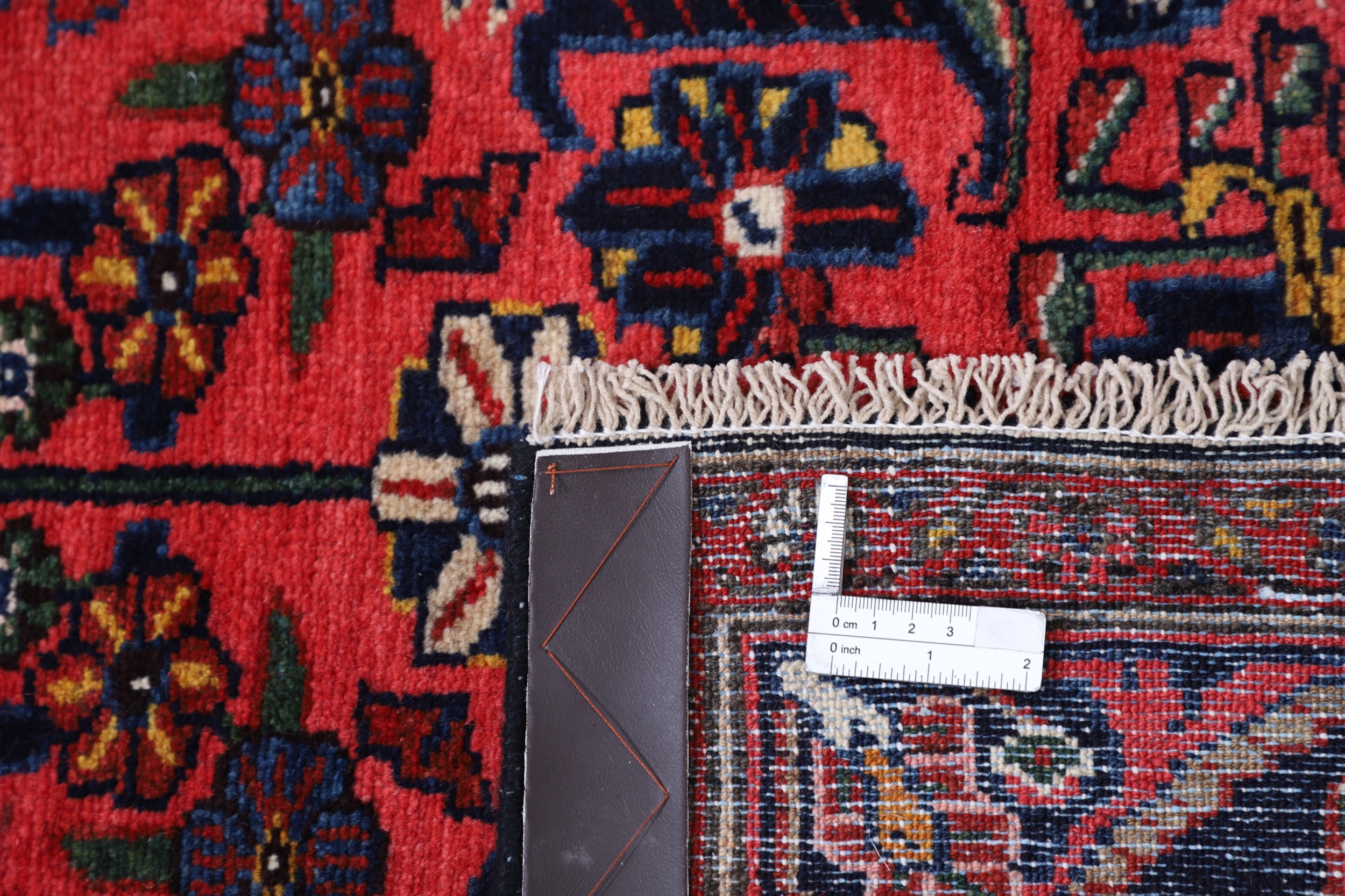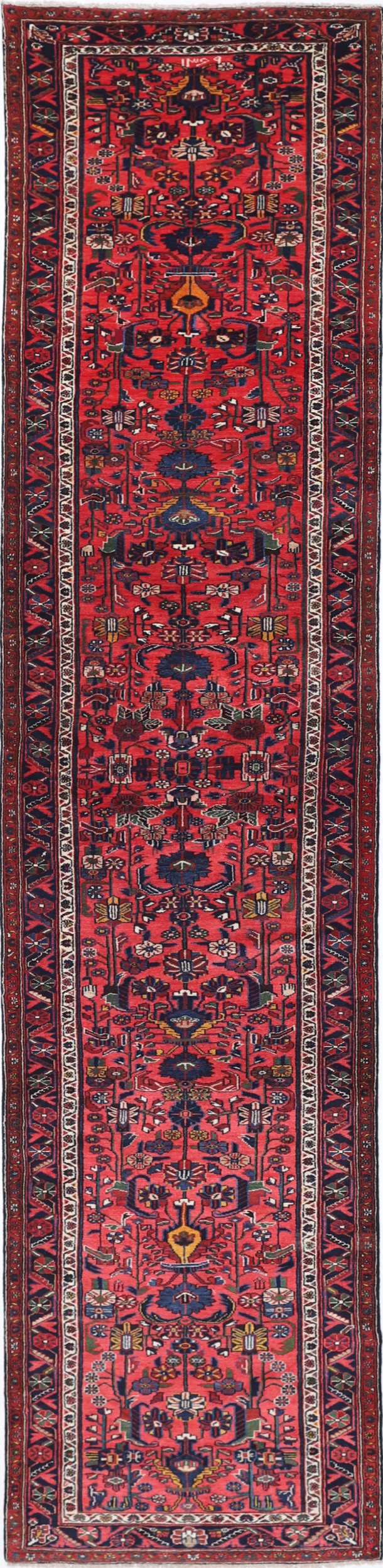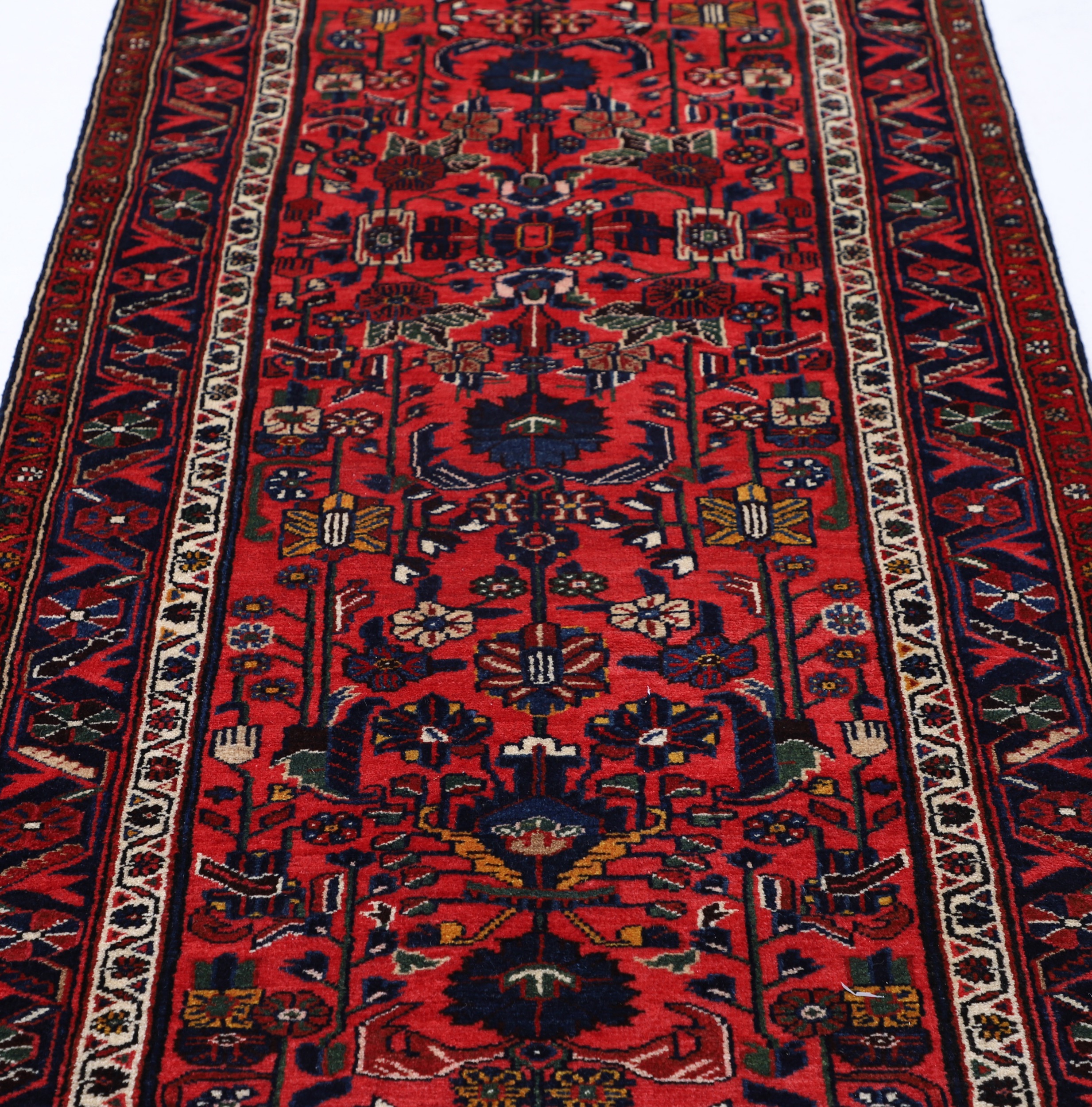 This aged Persian rug features an intricate floral design in rich red and blue hues. Hand knotted with 100% wool on a cotton base, this Mehraban rug boasts a medium pile height of 1/3″ – 3/8″ and a knot density of approximately 225 knots per square inch (KPSI). Measuring at 3’4″ x 16’10”, this stunning piece is sure to add warmth and depth to any room.