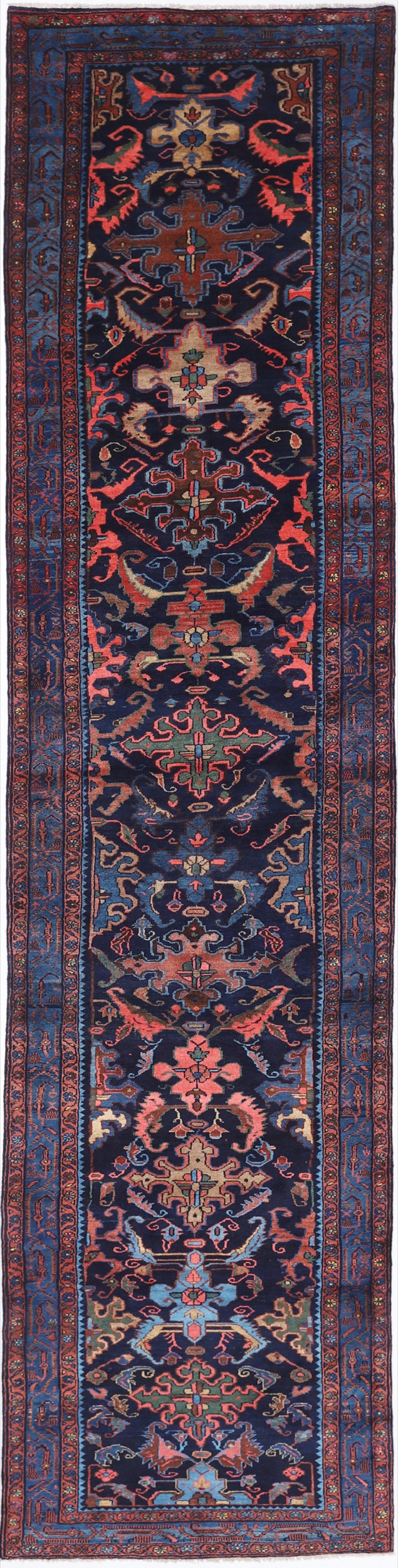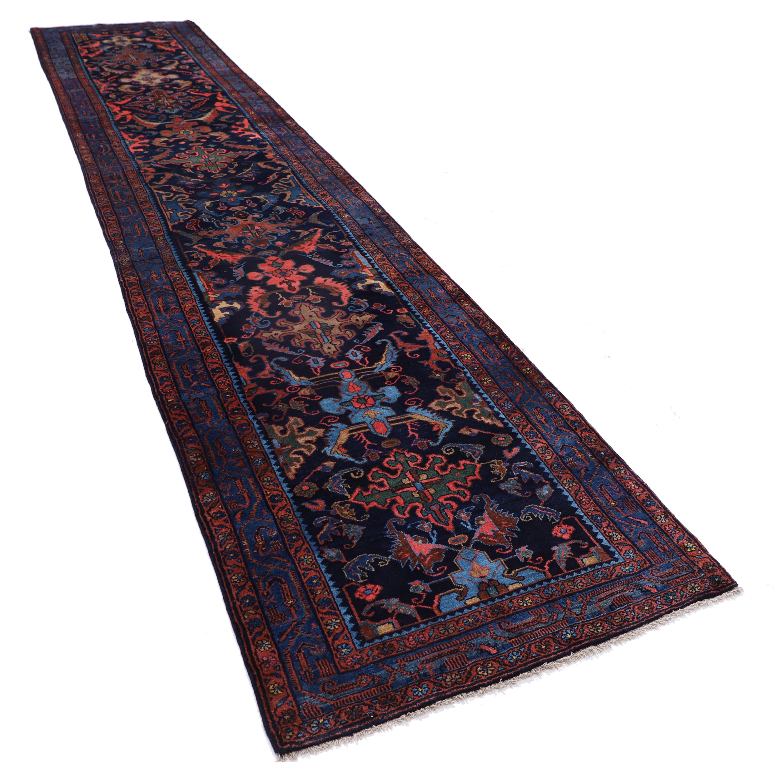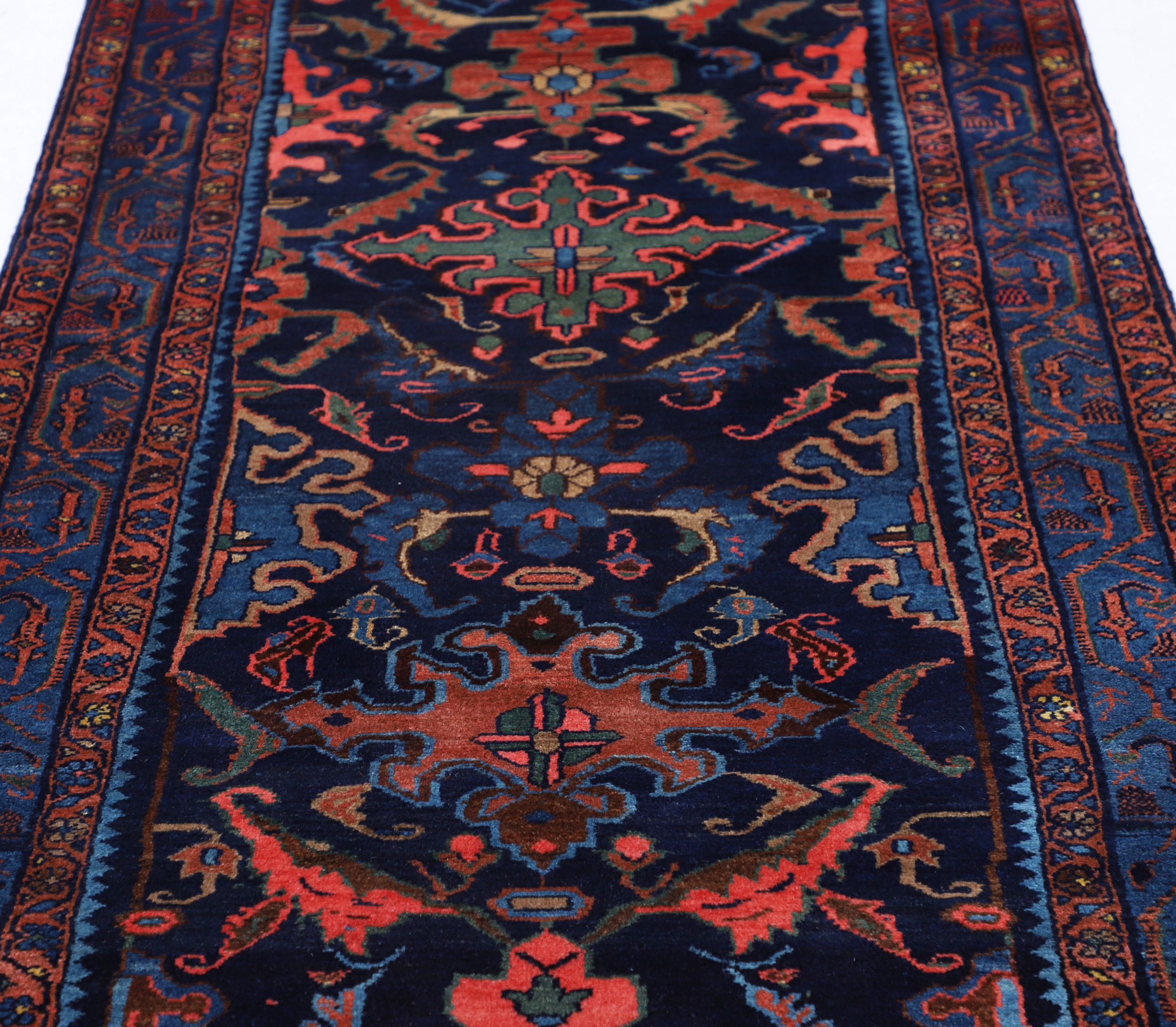 This Hand Knotted Mehraban Persian rug is a stunning piece with a rich history. Aged between 80-100 years, it showcases a beautiful blue geometric design that is both elegant and timeless. Crafted from 100% wool with a cotton foundation, this medium pile rug has an impressive knot count of approximately 225 KPSI. Measuring at 3’7″ x 13’4″, this rug is sure to add a touch of sophistication to any room with its intricate design and quality craftsmanship.