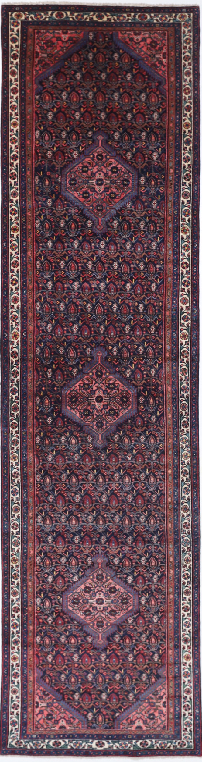 This vintage Persian rug is a Hand Knotted Mehraban measuring 4′ x 17’6″. Aged between 50-60 years, it features a beautiful Blue Beige Herati design with an approximate knot count of 196 KPSI. Made of 100% Wool, and Cotton, this rug has a medium pile measuring 1/3″-3/8″. It’s the perfect addition to any room, adding a touch of elegance and sophistication to your decor.