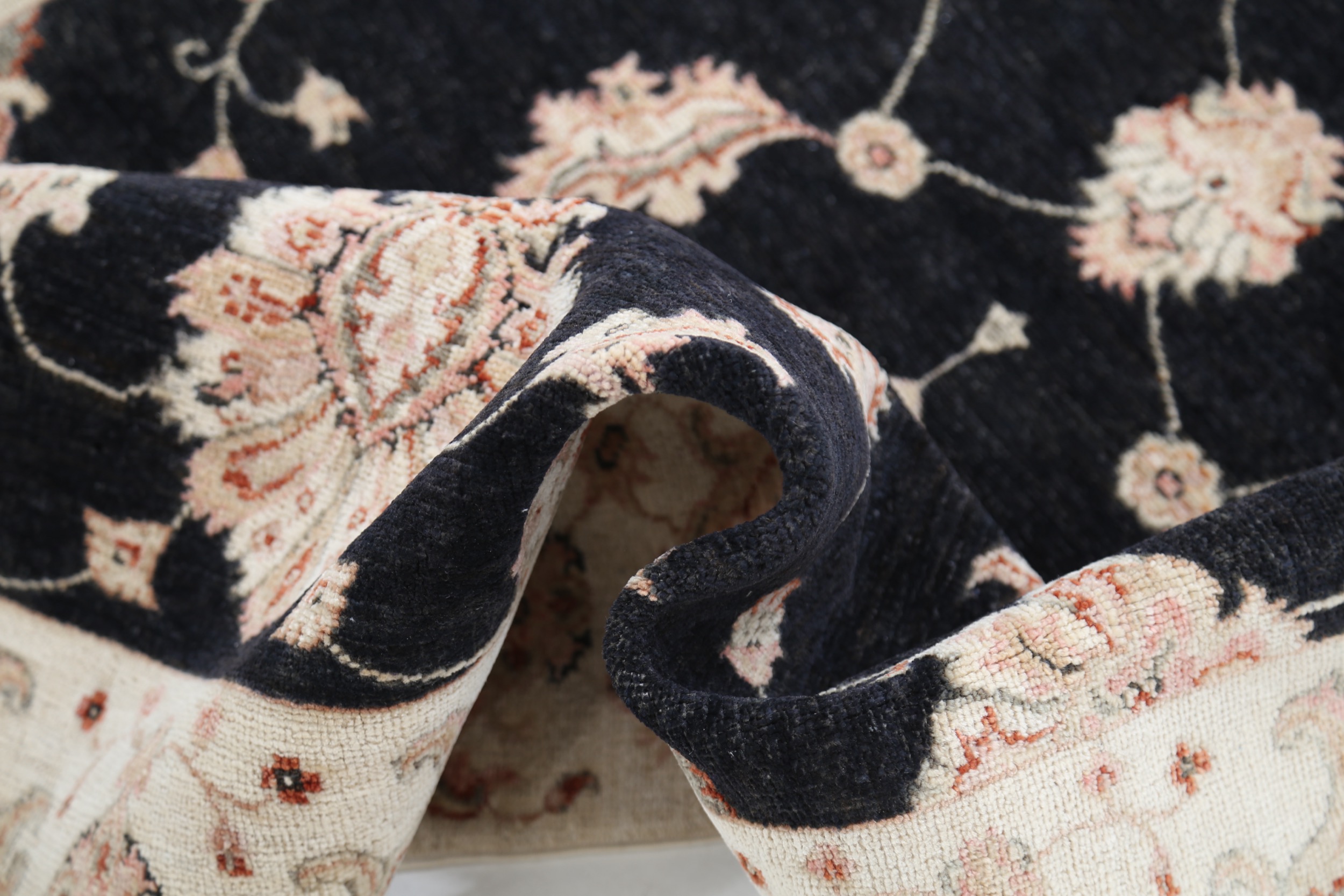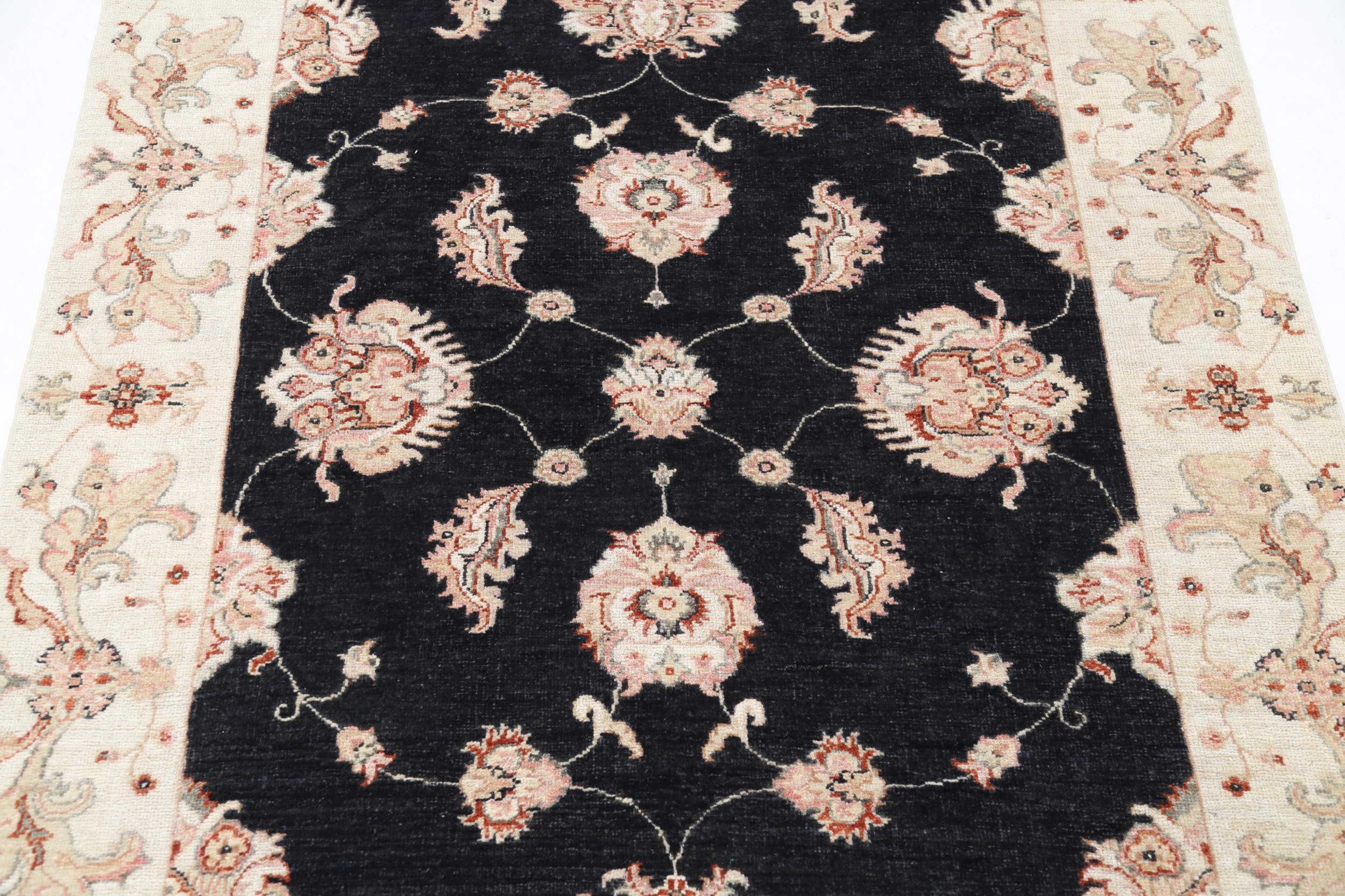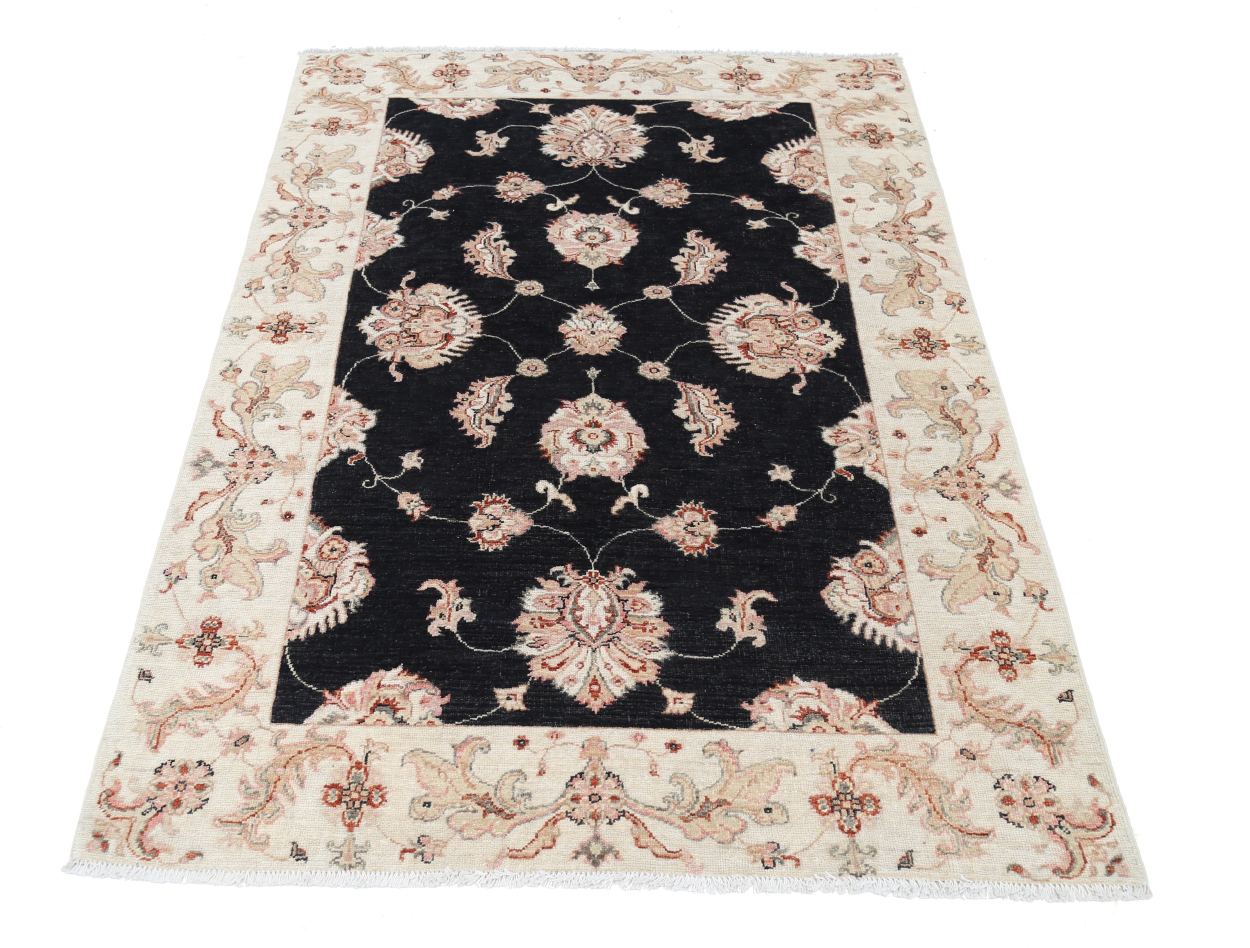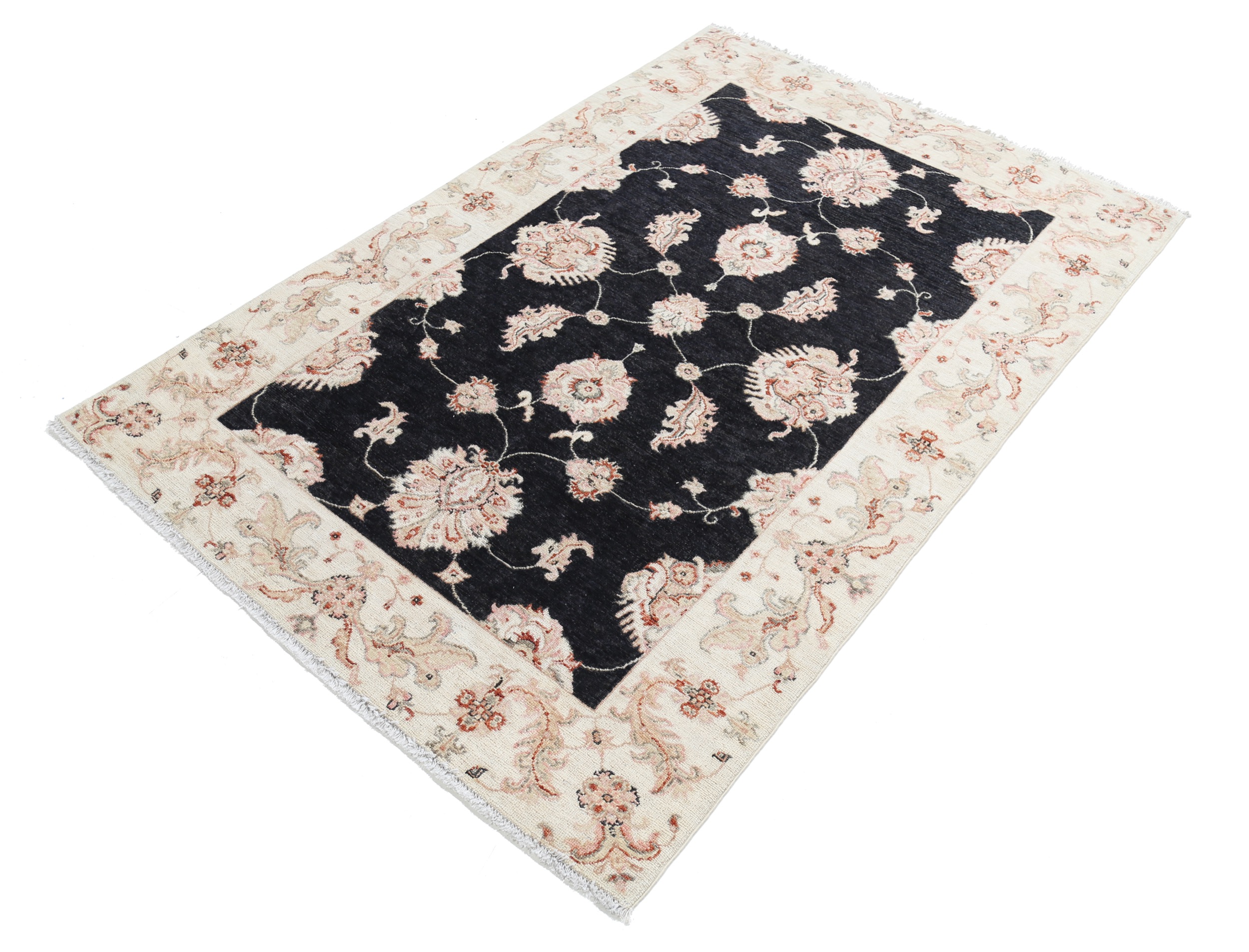 This exquisite 4′ x 5’10” Oushak rug from Afghan / Pakistan showcases a timeless floral pattern. Hand-knotted with 100% wool on a cotton foundation, it features a black field and beige border. The floral design adds an elegant character to any space.
