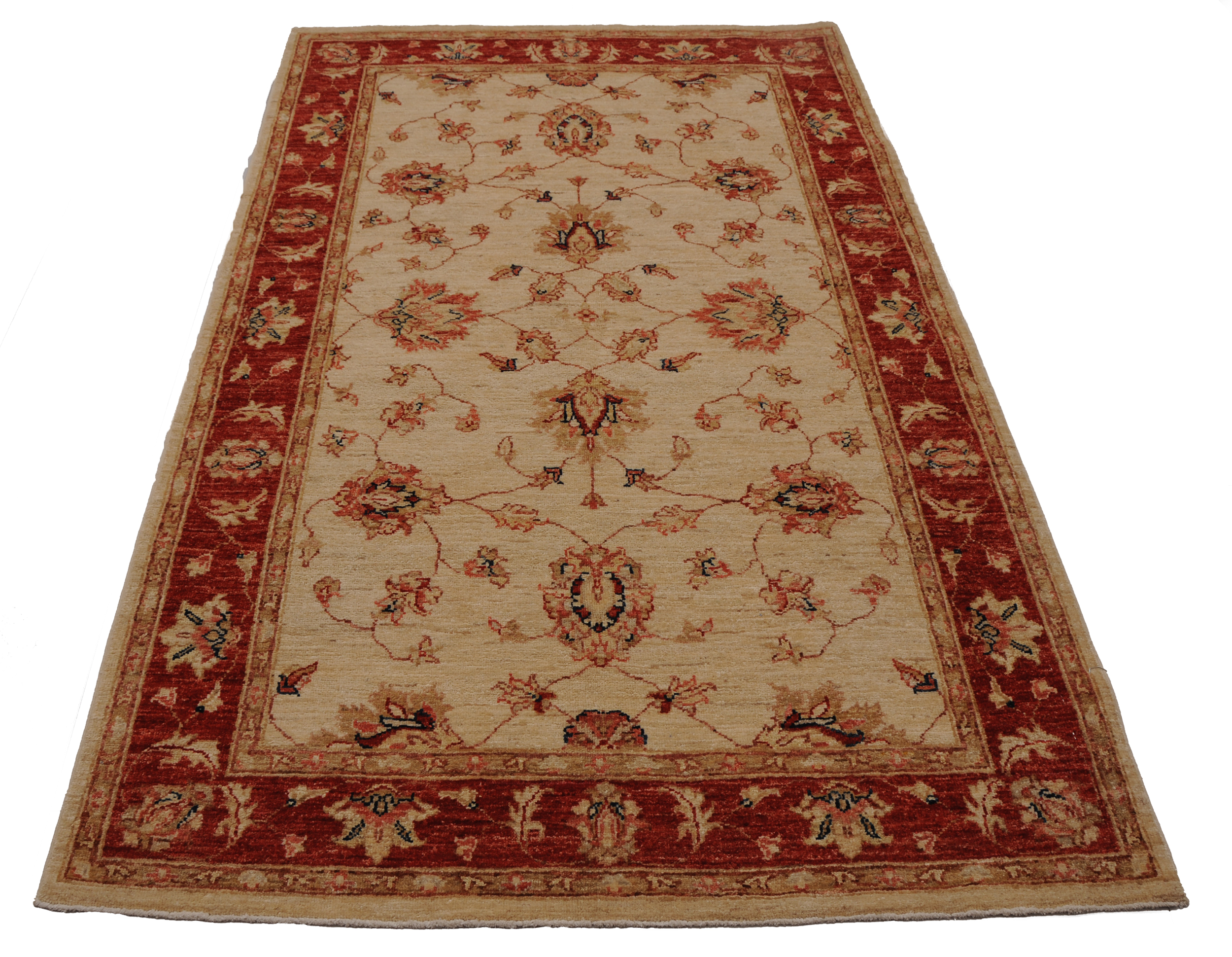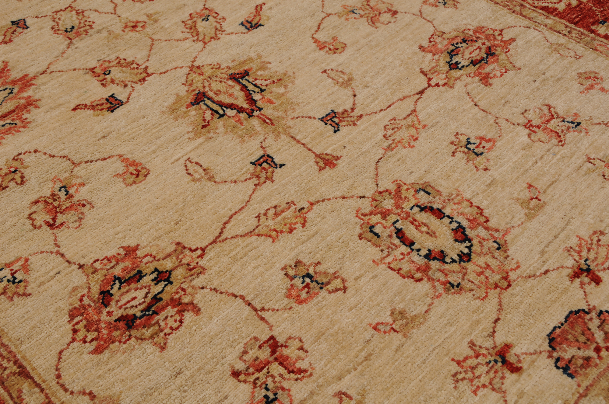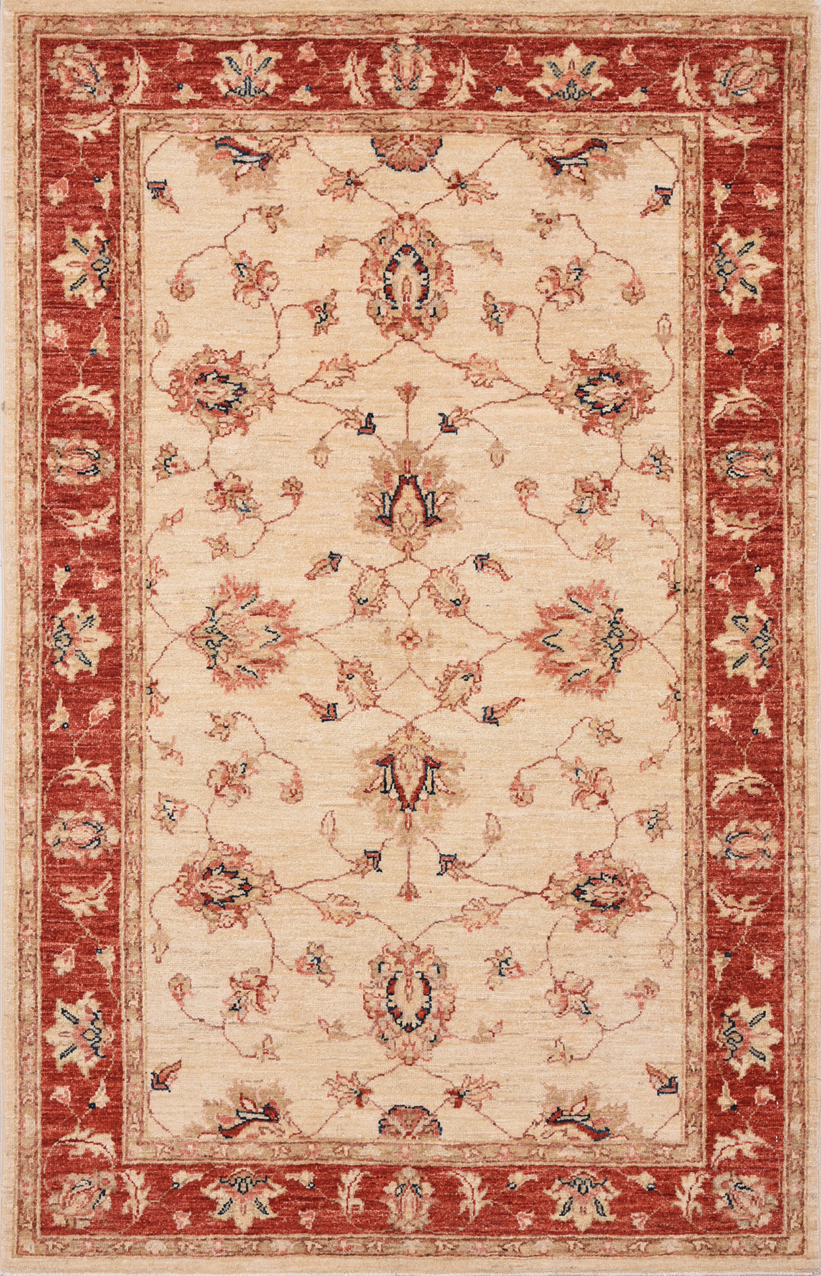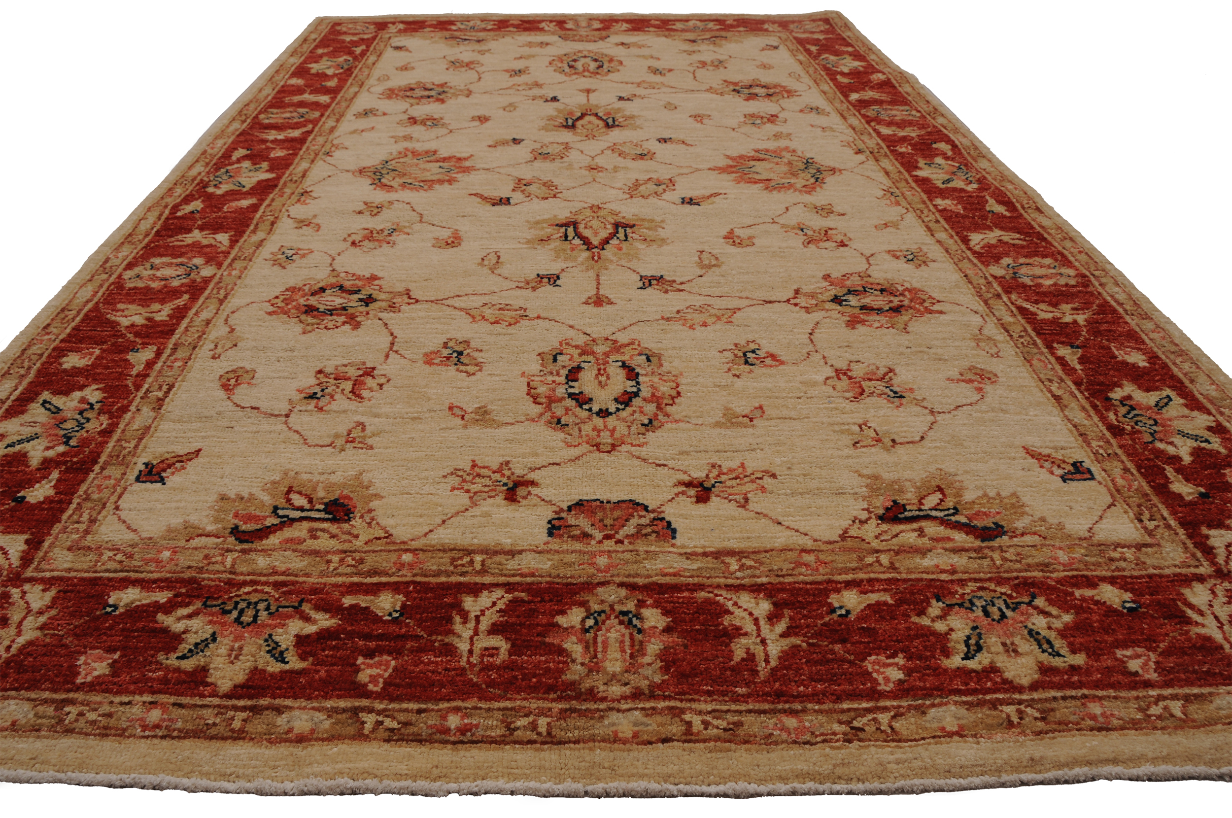 This 4’0″ x 6’3″ Oushak rug, hand-knotted in Afghan / Pakistan, features a allover design. It is woven with Approx. 156KPSI, showcasing a field in Ivory and a Red border. The rug has a Low Medium Pile and a 100% Wool pile, and is in excellent condition.