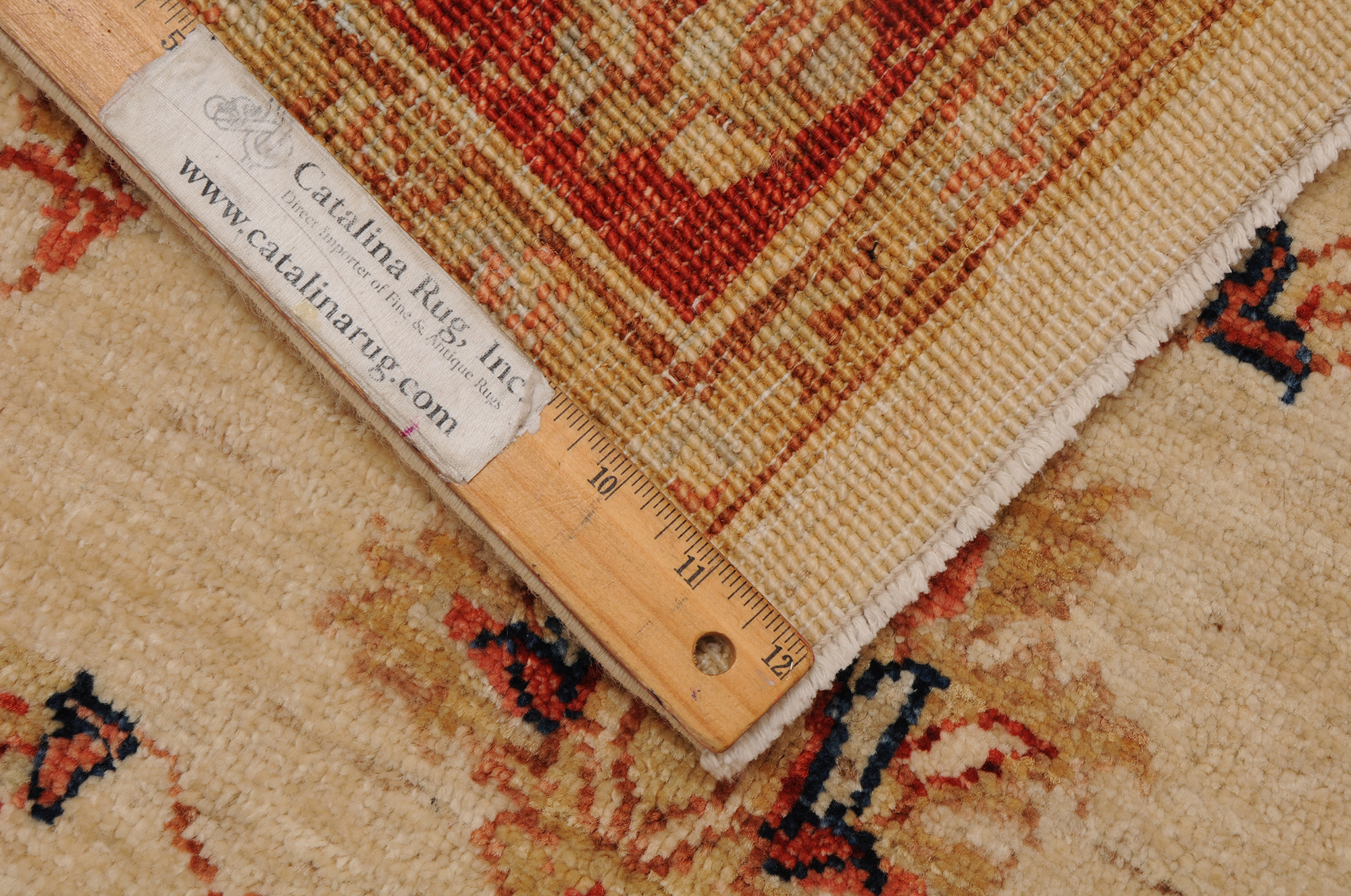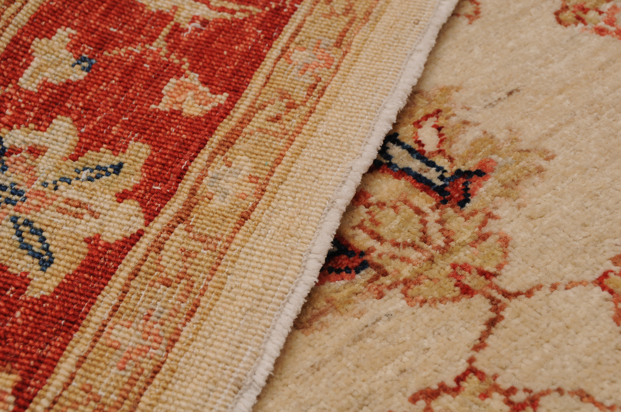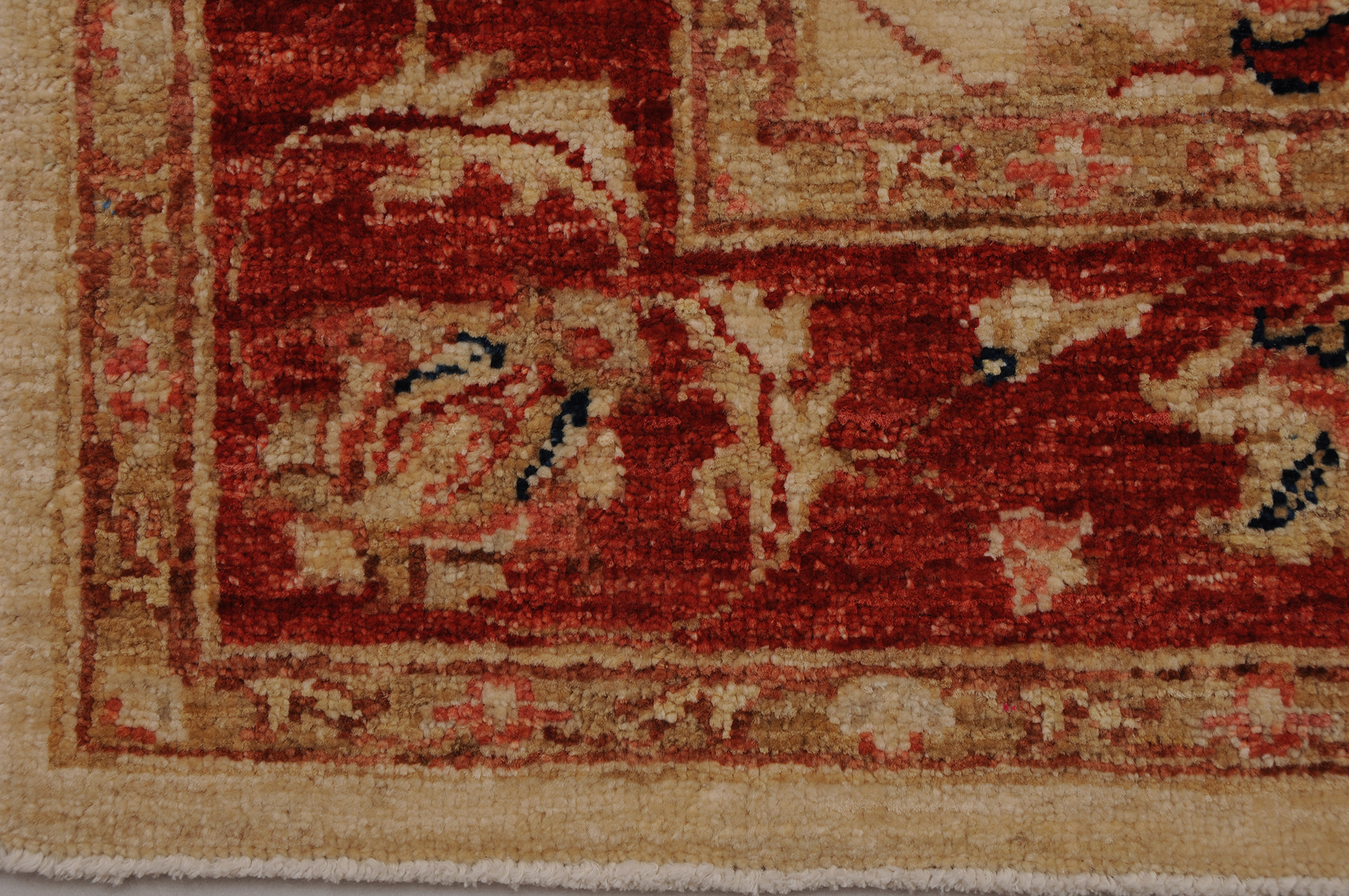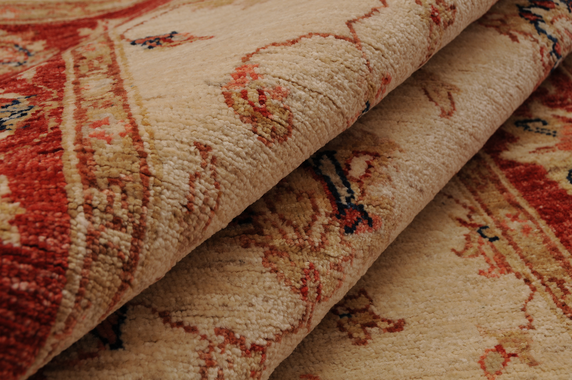 This 4’0″ x 6’3″ Oushak rug, hand-knotted in Afghan / Pakistan, features a allover design. It is woven with Approx. 156KPSI, showcasing a field in Ivory and a Red border. The rug has a Low Medium Pile and a 100% Wool pile, and is in excellent condition.