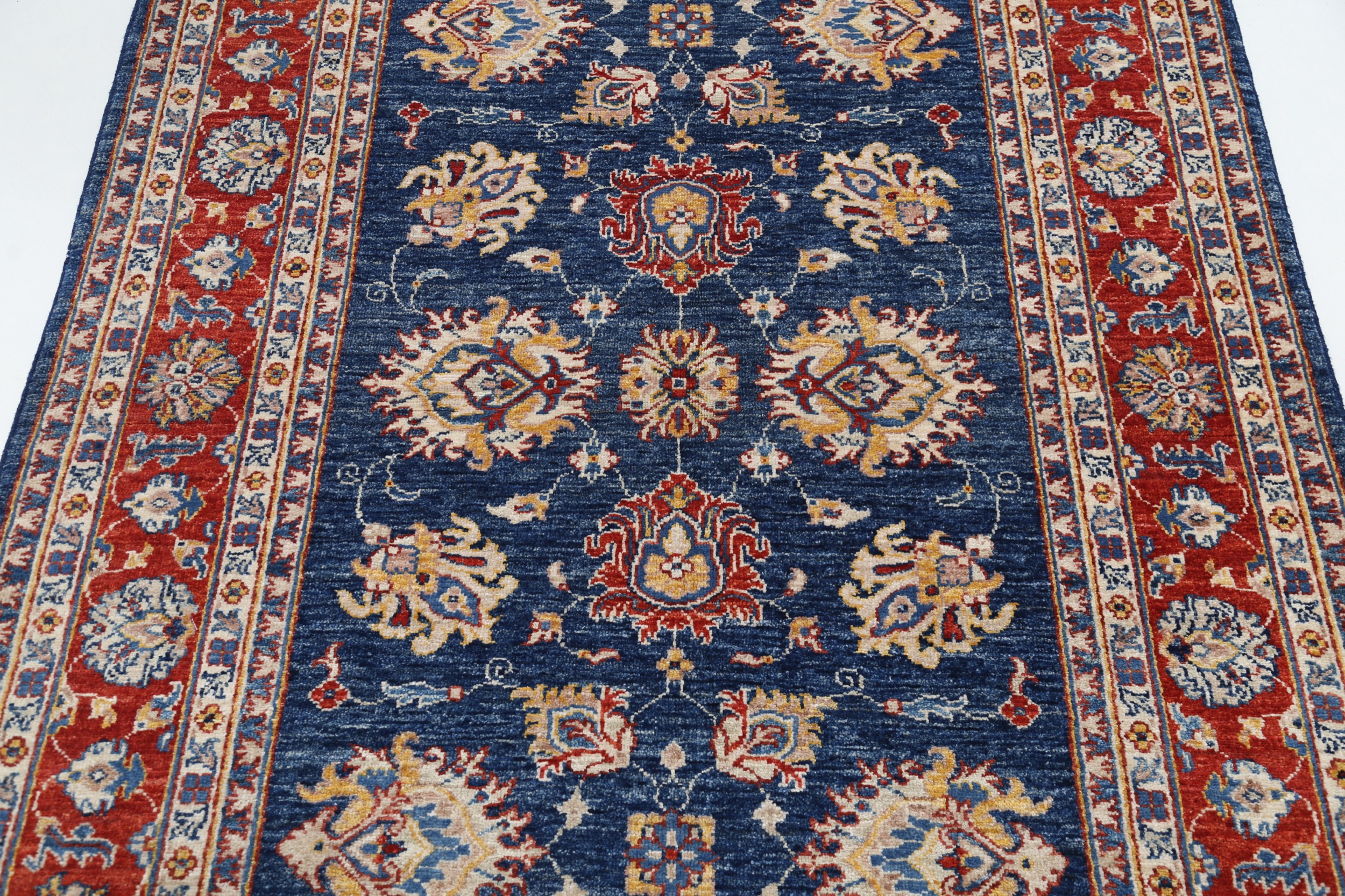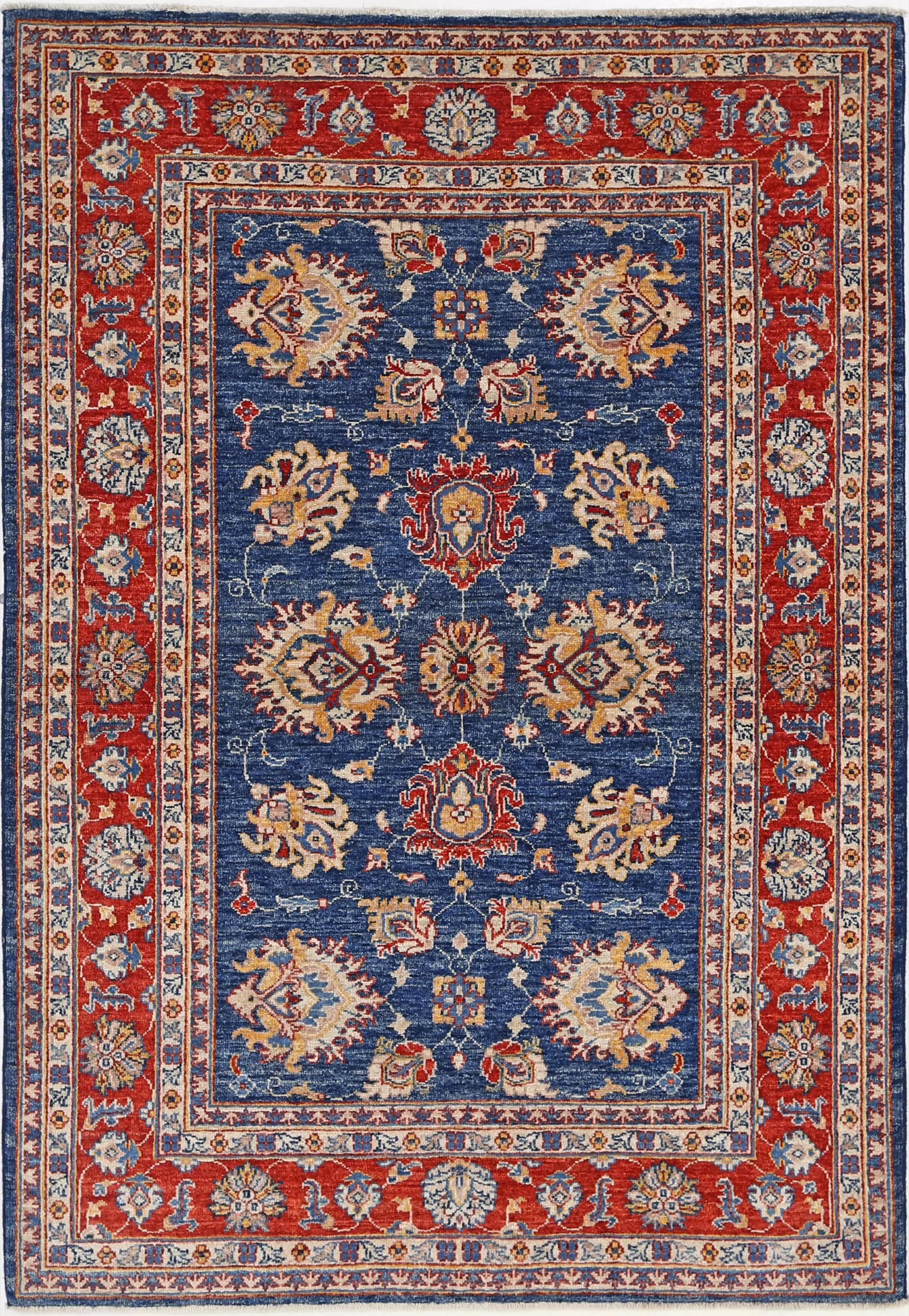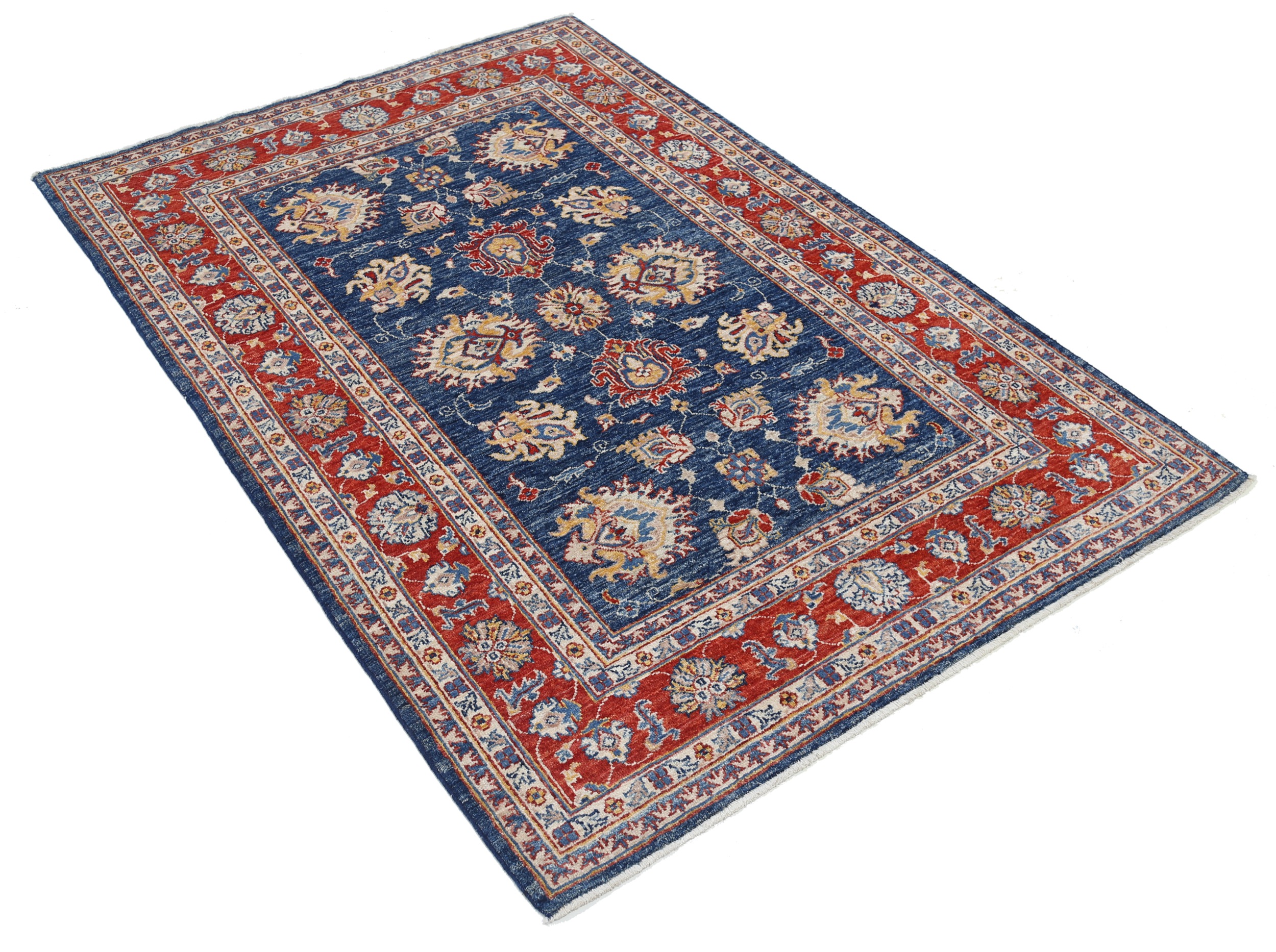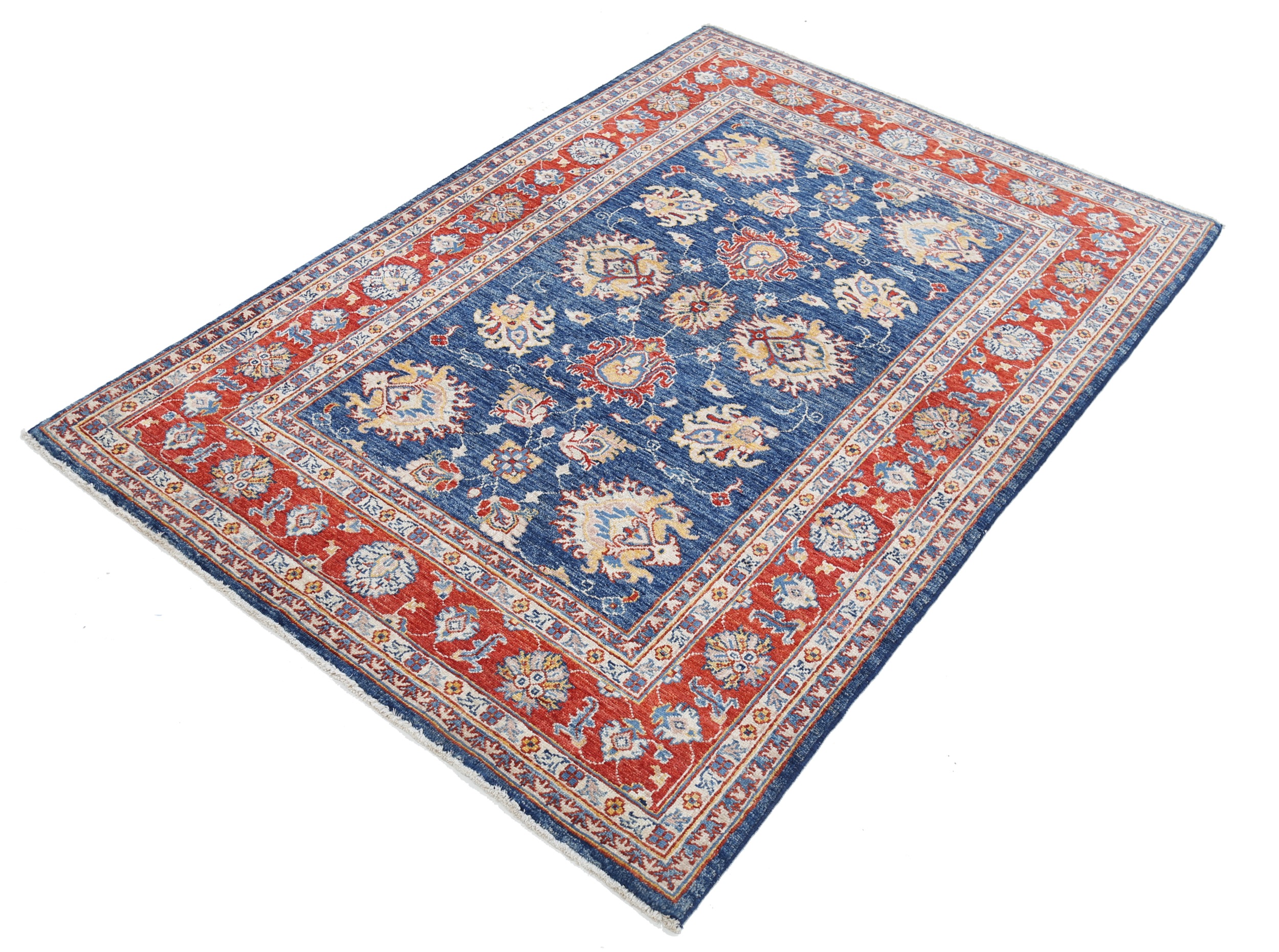Introducing our exquisite Oushak Oriental rug, skillfully hand-knotted with meticulous attention to detail. Measuring 4’1” x 5’11”, this stunning rug features a captivating combination of blue and red floral patterns, adding a touch of elegance to any space. With an approximate knot count of 156 KPSI, this rug is expertly crafted from 100% wool and cotton, ensuring durability and comfort. Its low to medium pile height of 1/4″-1/3″ offers a plush feel underfoot. Rest assured, this rug is in excellent condition and has been thoroughly washed, ready to enhance your home decor.