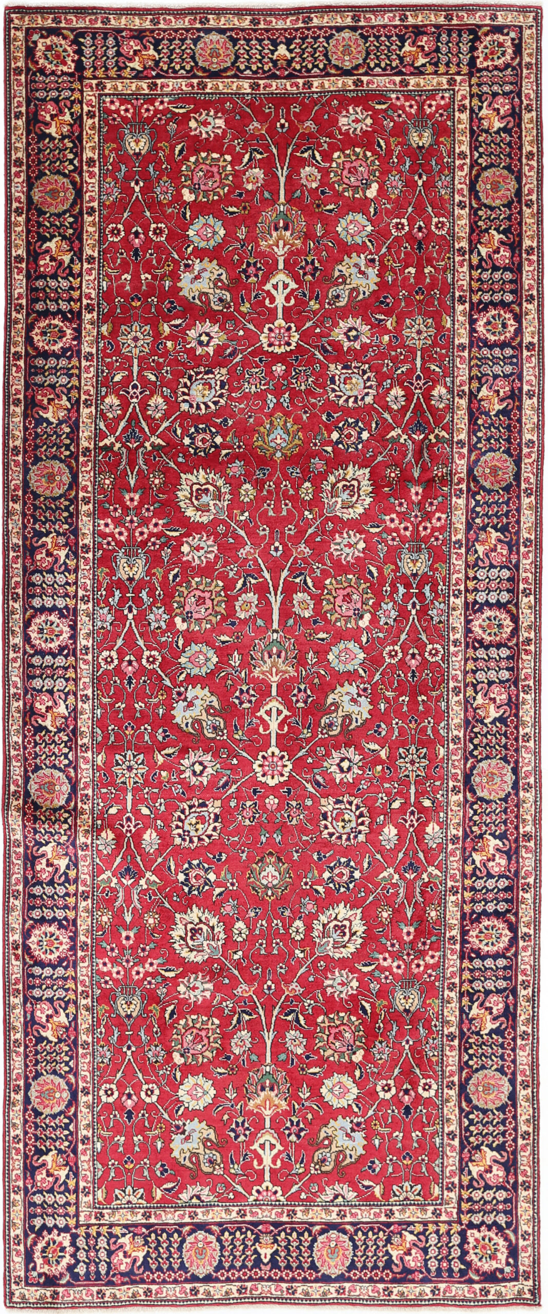This Persian Tabriz rug, aged 30-40 years, features a beautiful blue background with floral patterns in beige, green, and brown. Made of 100% wool with a medium pile height of 1/3″-3/8″, it has a knot density of approximately 196 KPSI. Measures 4’10” x 12’4″.