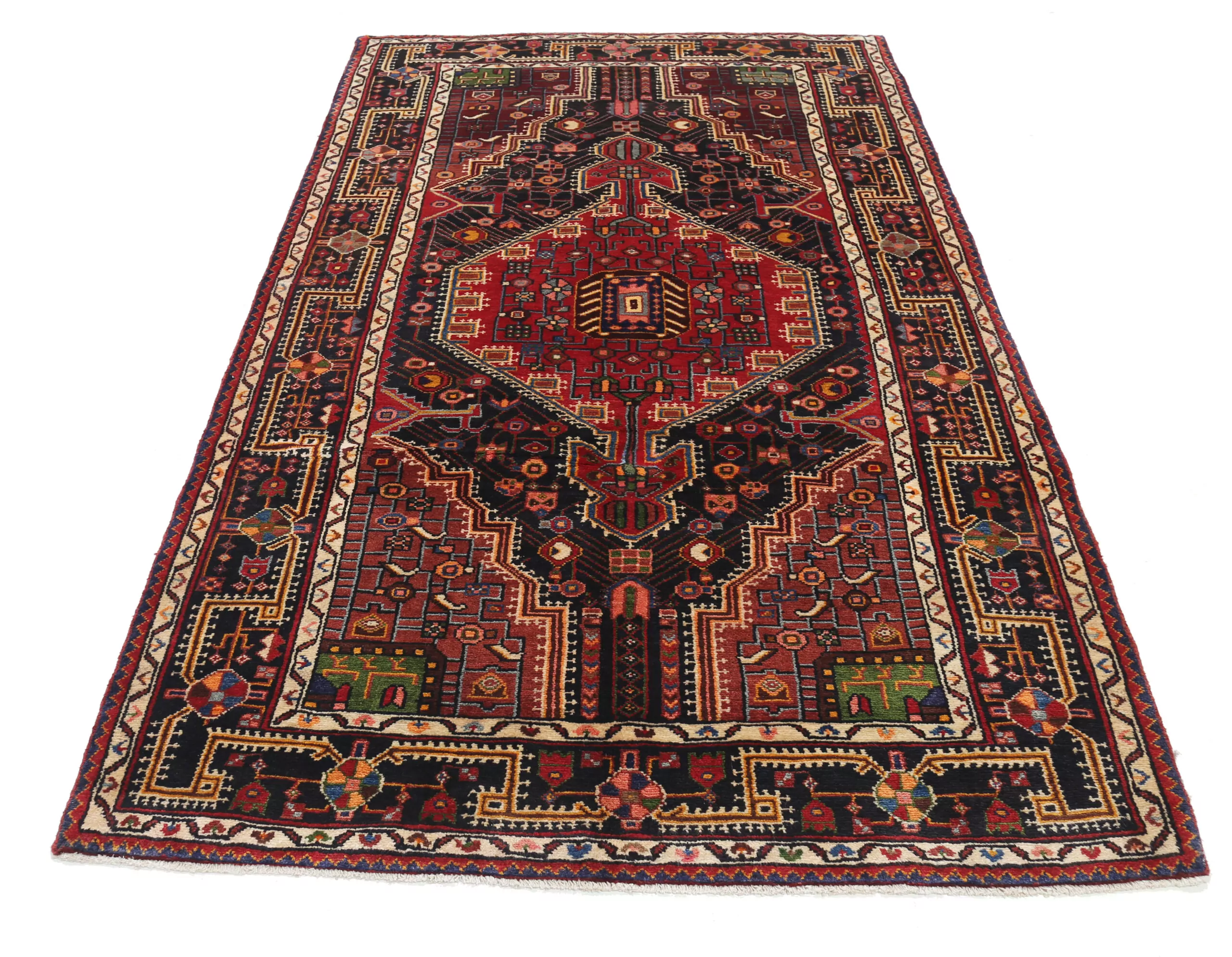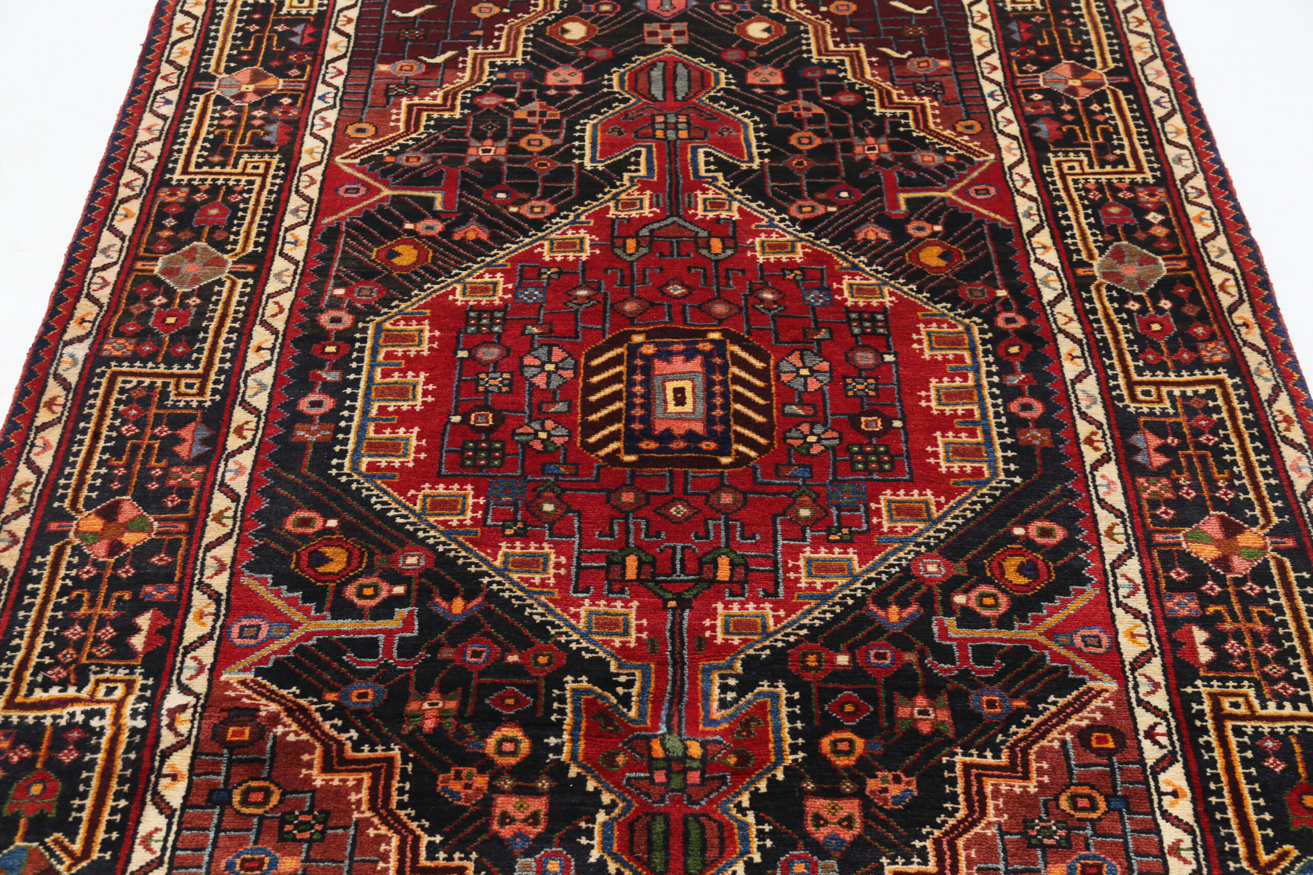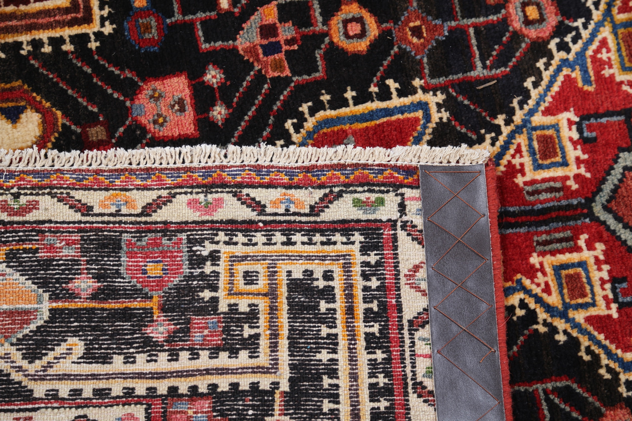 This Persian rug from Hamadan measures 4’10” x 8’2″ and features a medallion design in black, orange, red, and peach. Made of 100% wool with a medium pile height of 1/3″-3/8″, it has an approximate knot density of 156 KPSI.