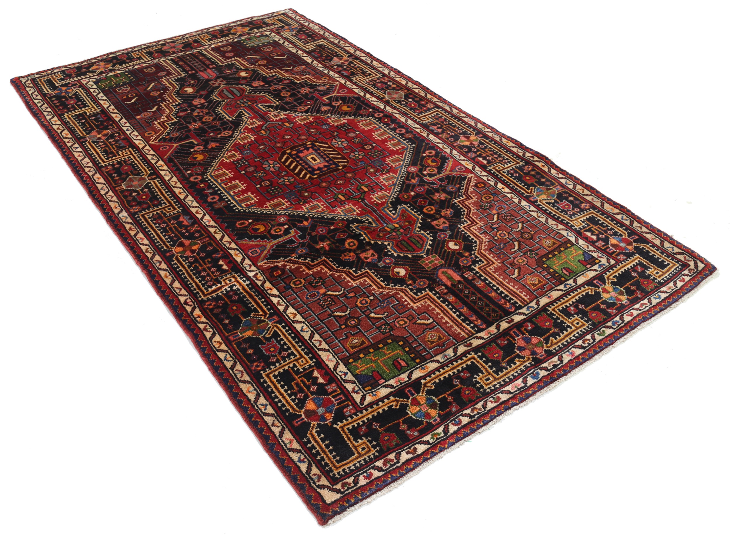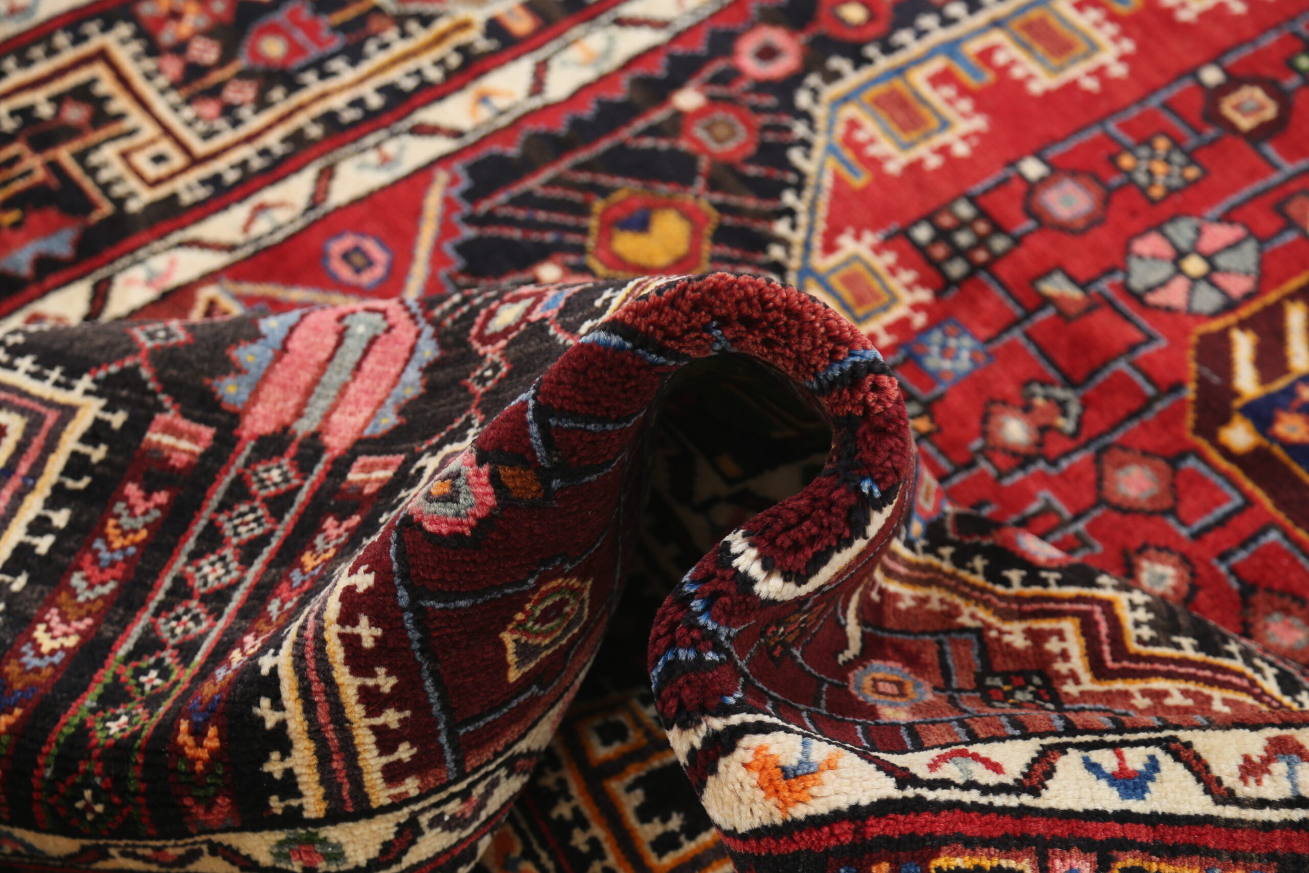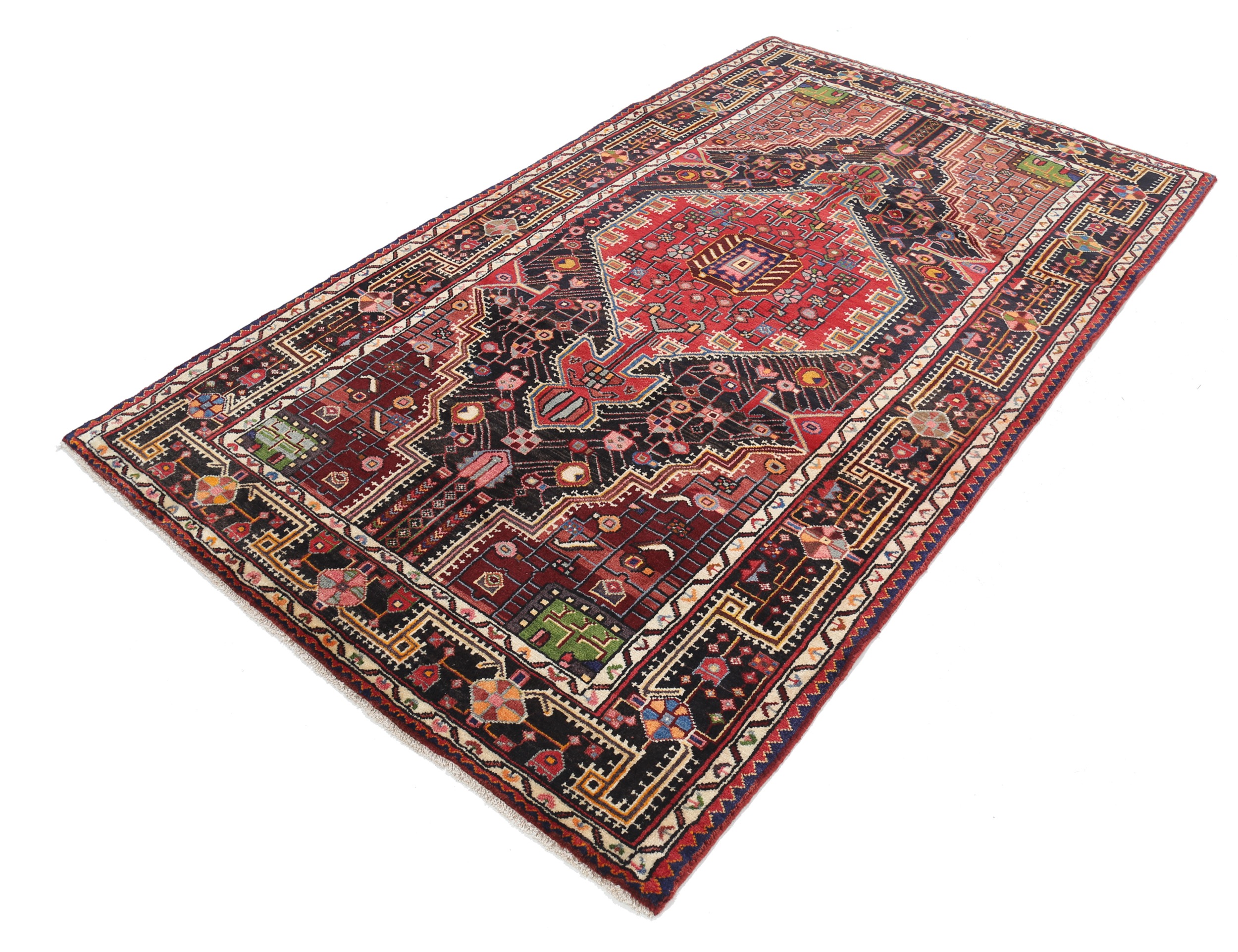 This Persian rug from Hamadan measures 4’10” x 8’2″ and features a medallion design in black, orange, red, and peach. Made of 100% wool with a medium pile height of 1/3″-3/8″, it has an approximate knot density of 156 KPSI.