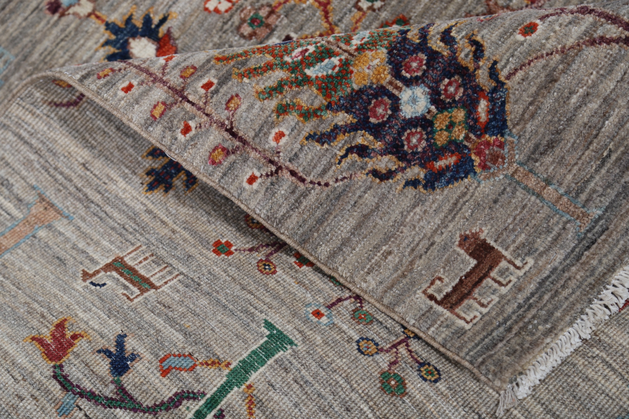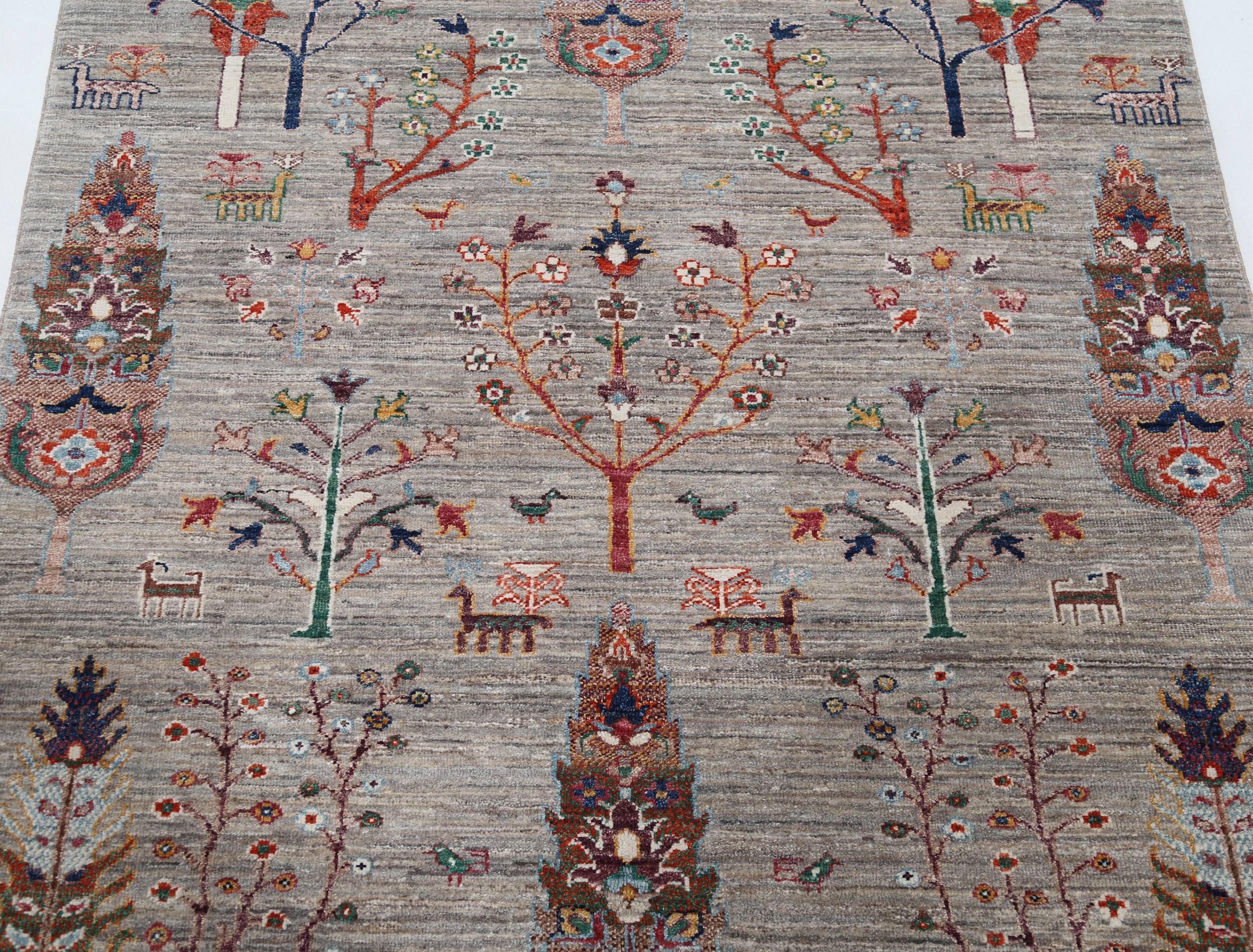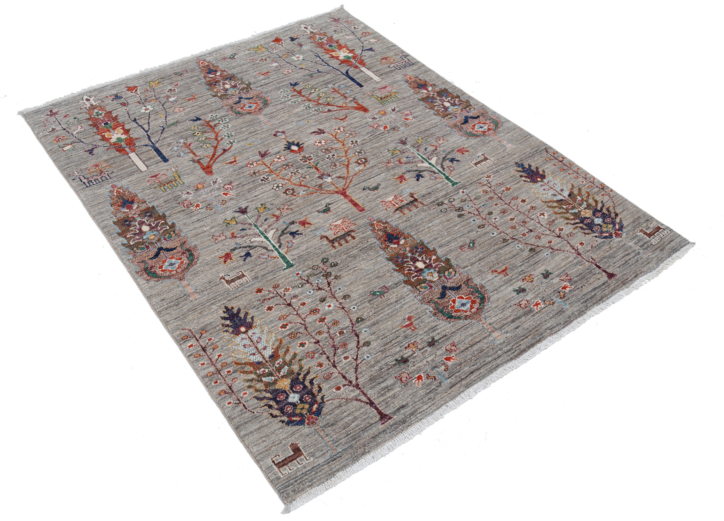 A stunning example of Oriental craftsmanship, this 4’2″ x 5’3″ Oushak rug is hand-knotted in Afghan / Pakistan. Its gray field and gray border frame a detailed floral design, known for its refined, traditional aesthetics. Durable and beautifully textured with a low medium pile 1/4″-1/3″ pile.