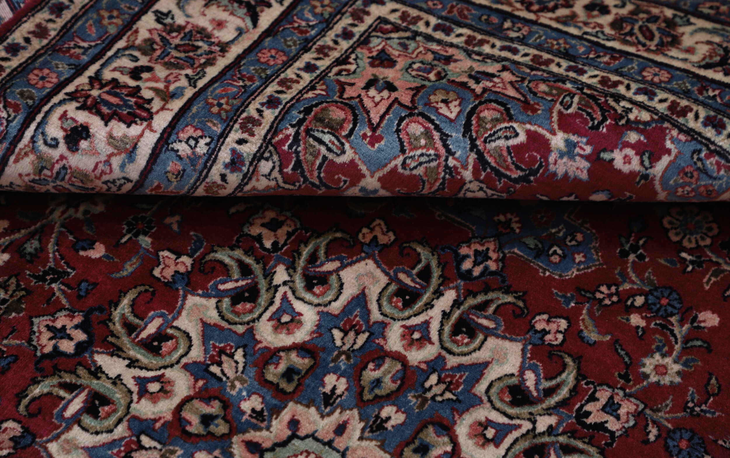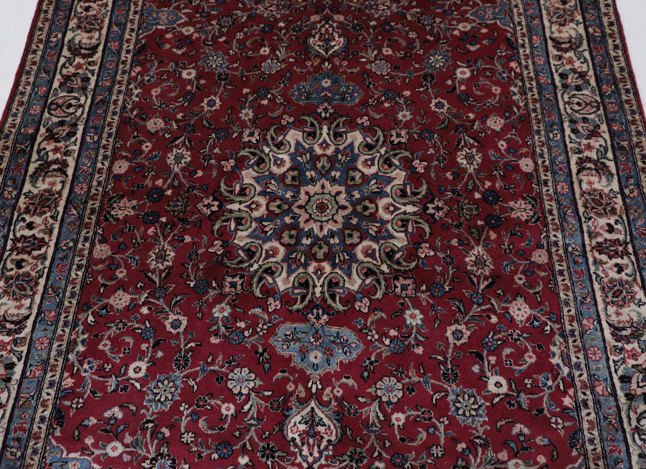 Hand-knotted in Hamadan, this Persian rug measures 4’6″ x 6’9″ and features a beautiful Red Blue Floral design. With an approximate of 324 knots per square inch (KPSI), this rug is made from 100% Wool with a medium pile height of 1/3″-3/8″. Aged between 50-60 years, it is a perfect blend of traditional craftsmanship and timeless elegance.