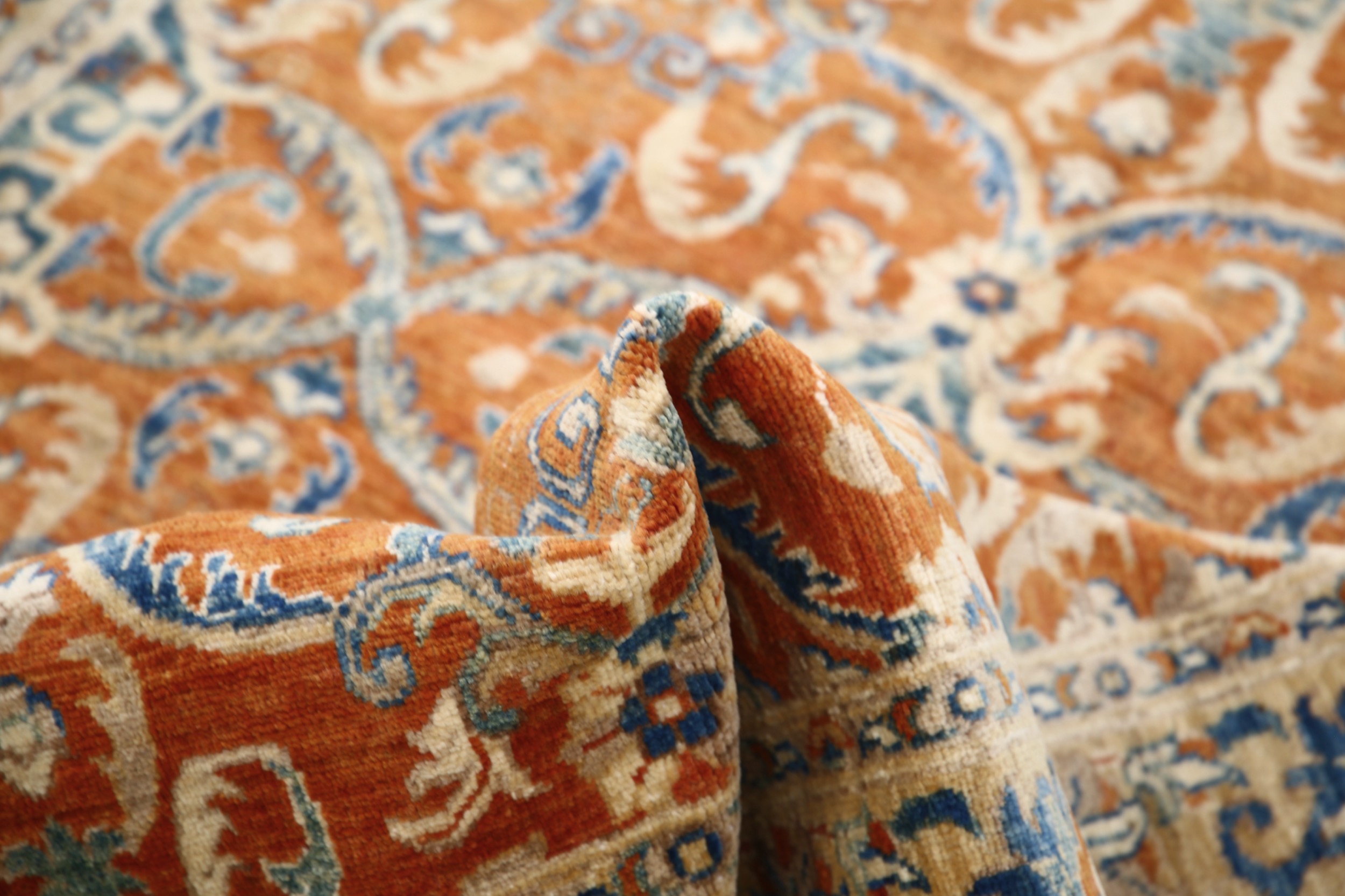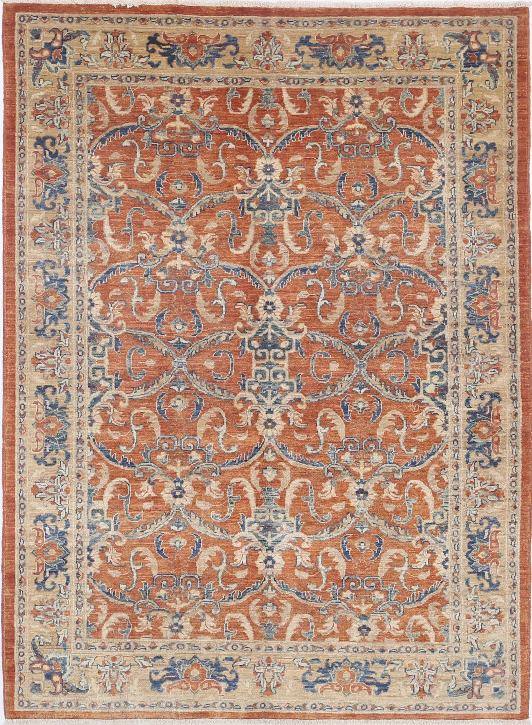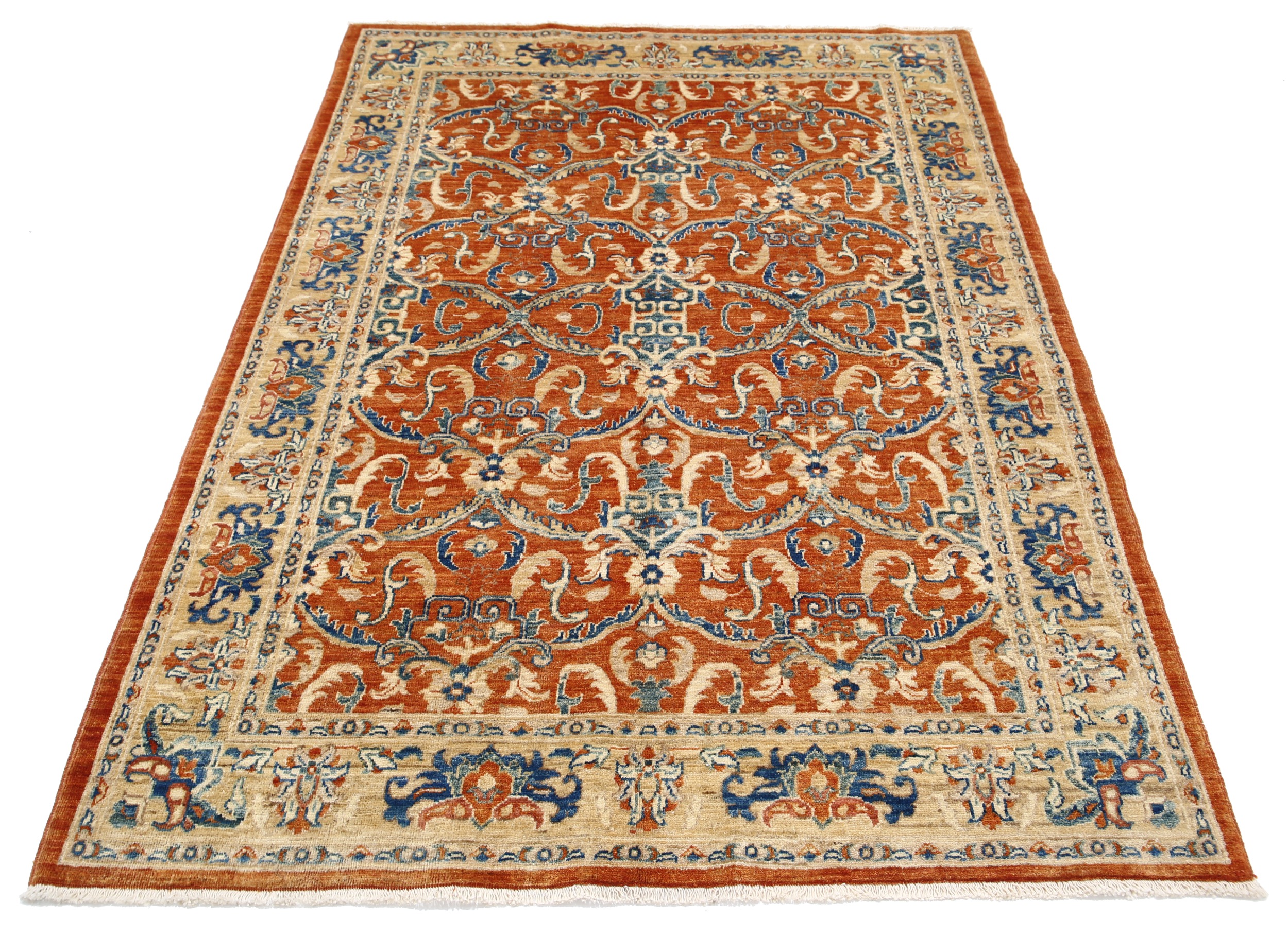 Introducing the Oushak Oriental rug, a stunning addition to any home decor. This hand-knotted masterpiece measures 4’6” x 6’3” and features a beautiful orange and beige allover design. With approximately 156 knots per square inch, this rug is meticulously crafted from 100% wool cotton blend, ensuring both durability and softness. The low to medium pile height of 1/4″-1/3″ provides a comfortable feel underfoot. This rug is in excellent condition and has been professionally washed, making it ready to enhance your living space with its timeless beauty.