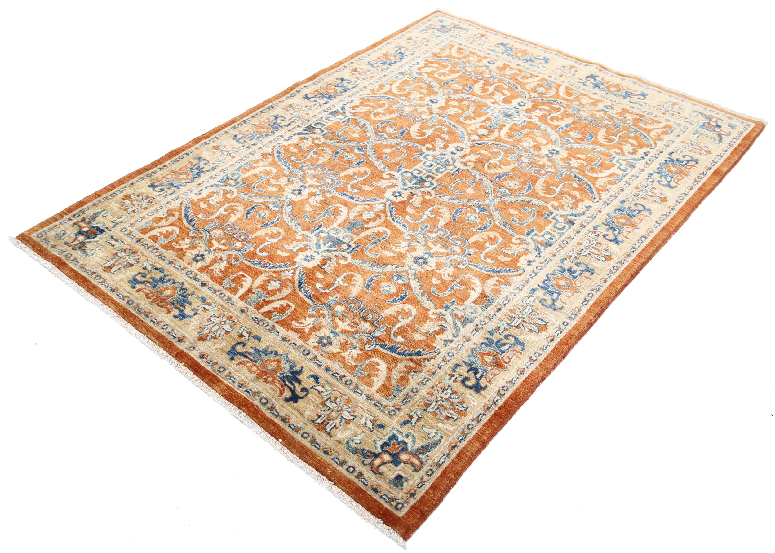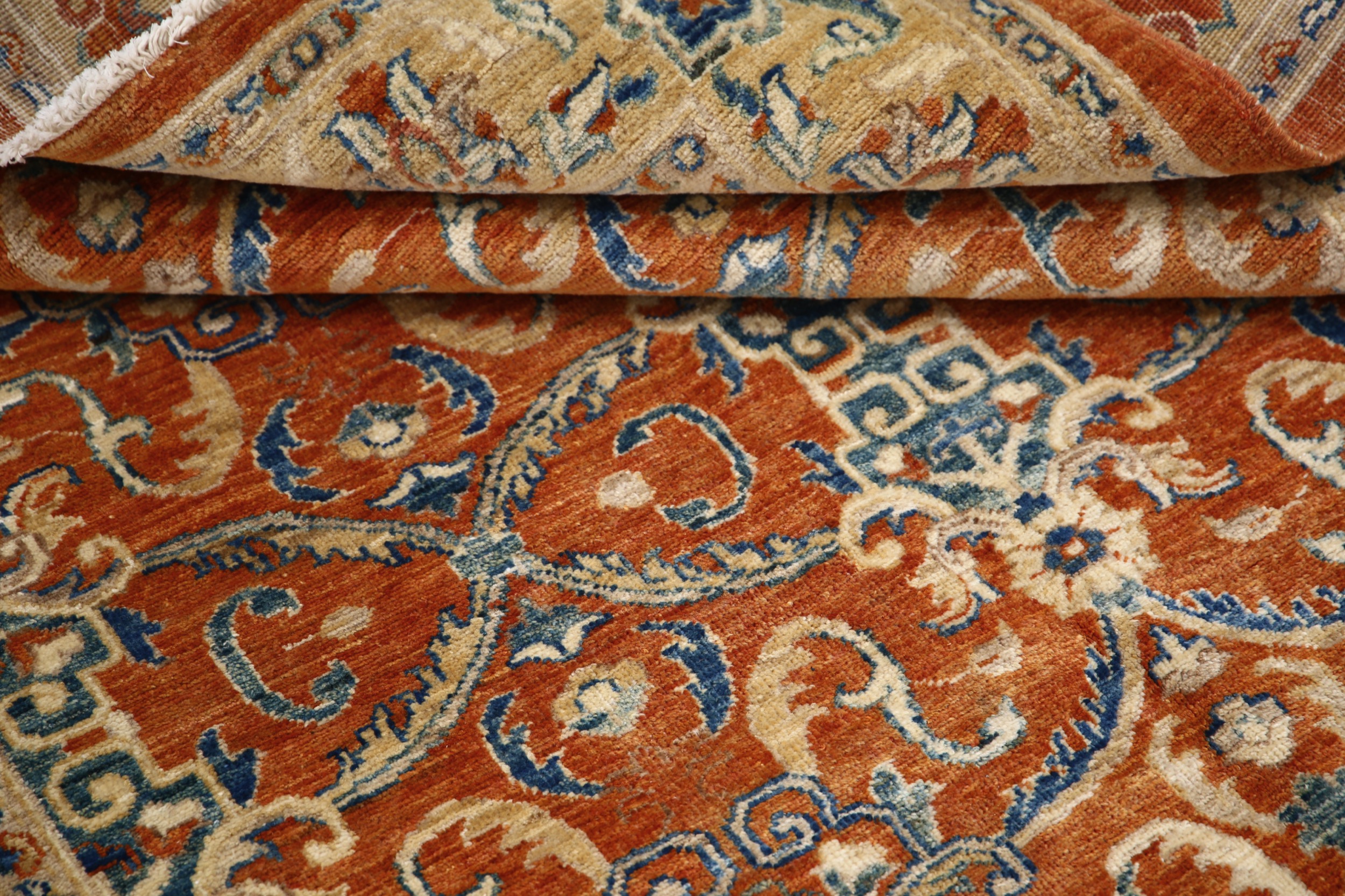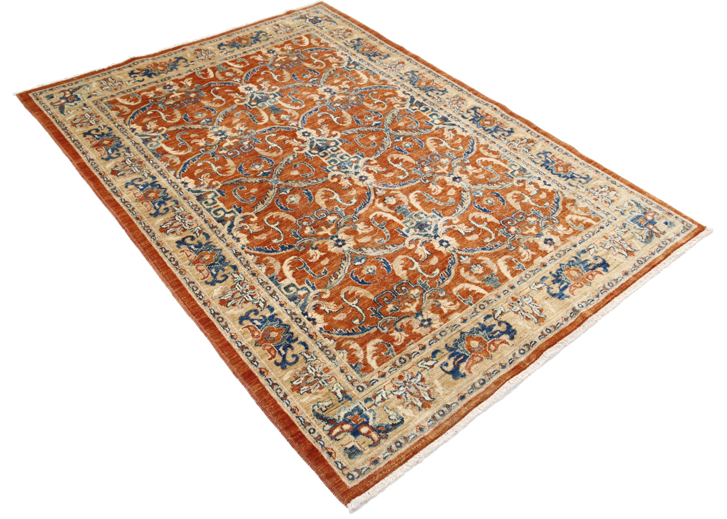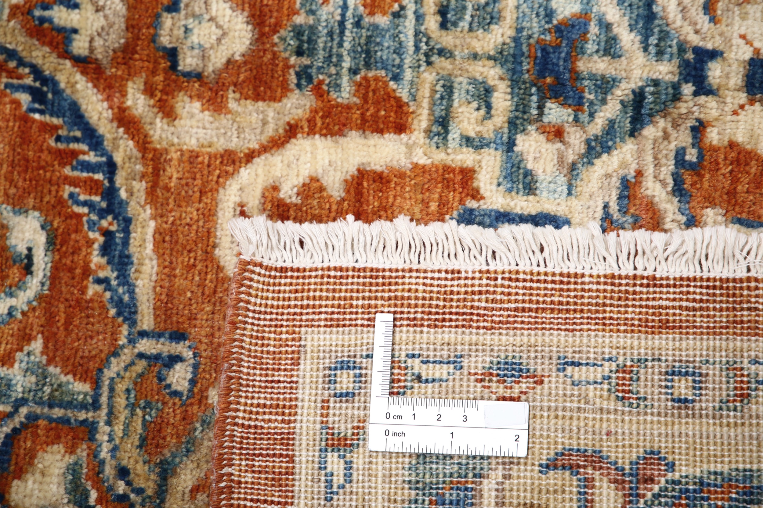 Introducing the Oushak Oriental rug, a stunning addition to any home decor. This hand-knotted masterpiece measures 4’6” x 6’3” and features a beautiful orange and beige allover design. With approximately 156 knots per square inch, this rug is meticulously crafted from 100% wool cotton blend, ensuring both durability and softness. The low to medium pile height of 1/4″-1/3″ provides a comfortable feel underfoot. This rug is in excellent condition and has been professionally washed, making it ready to enhance your living space with its timeless beauty.
