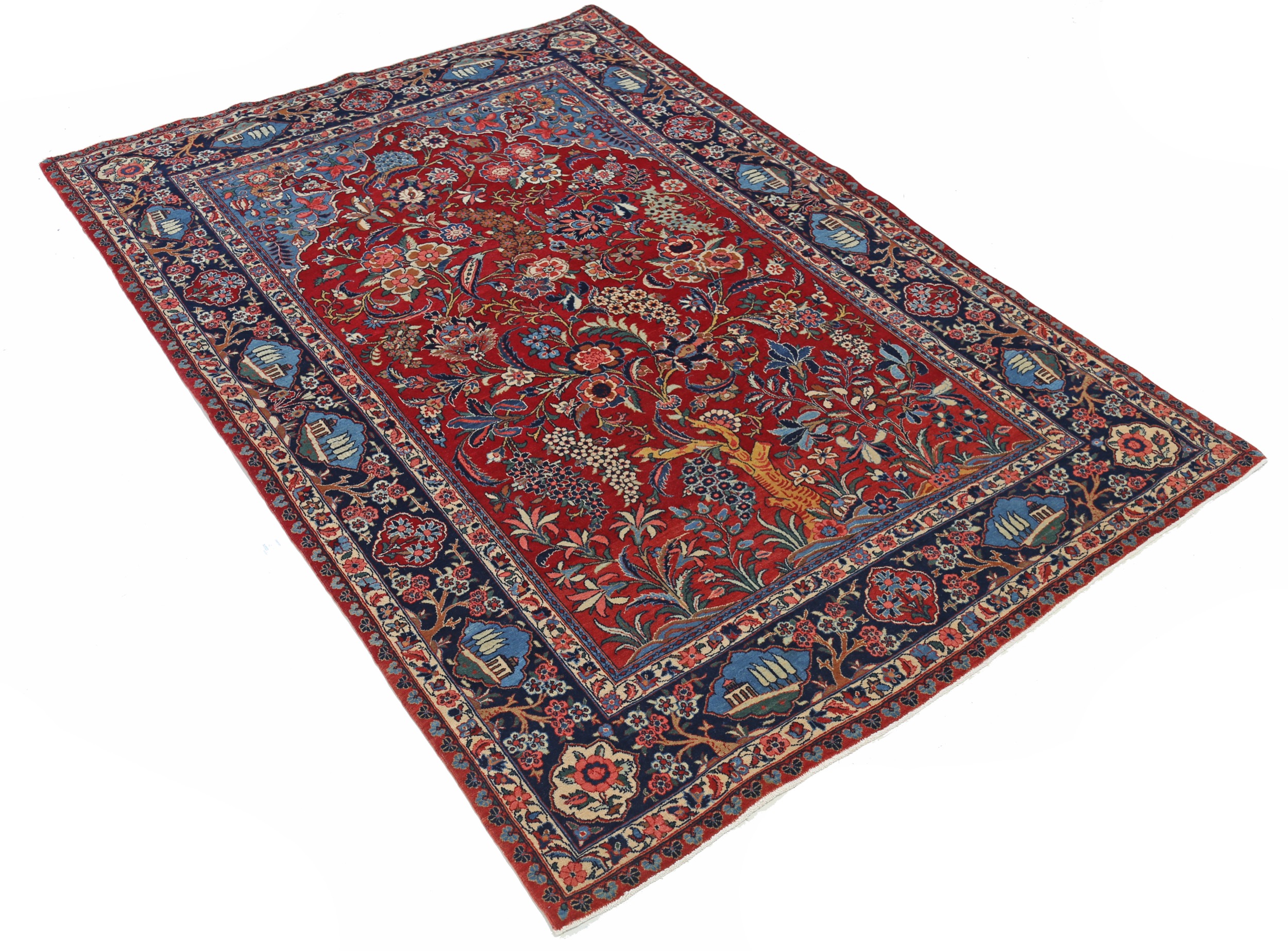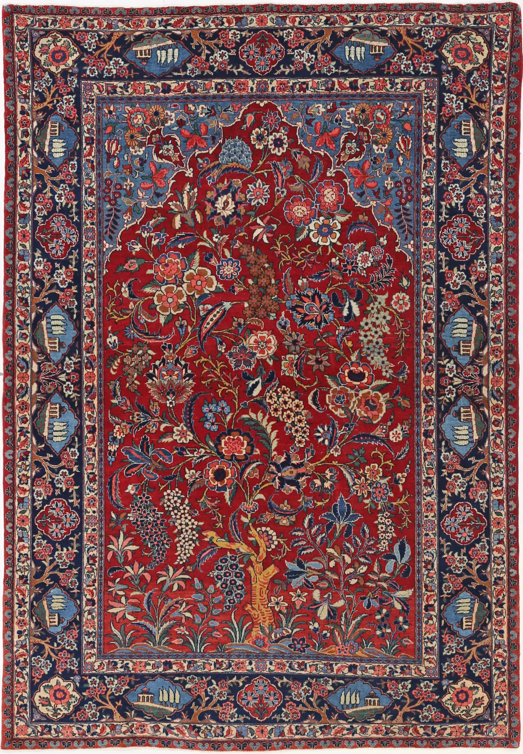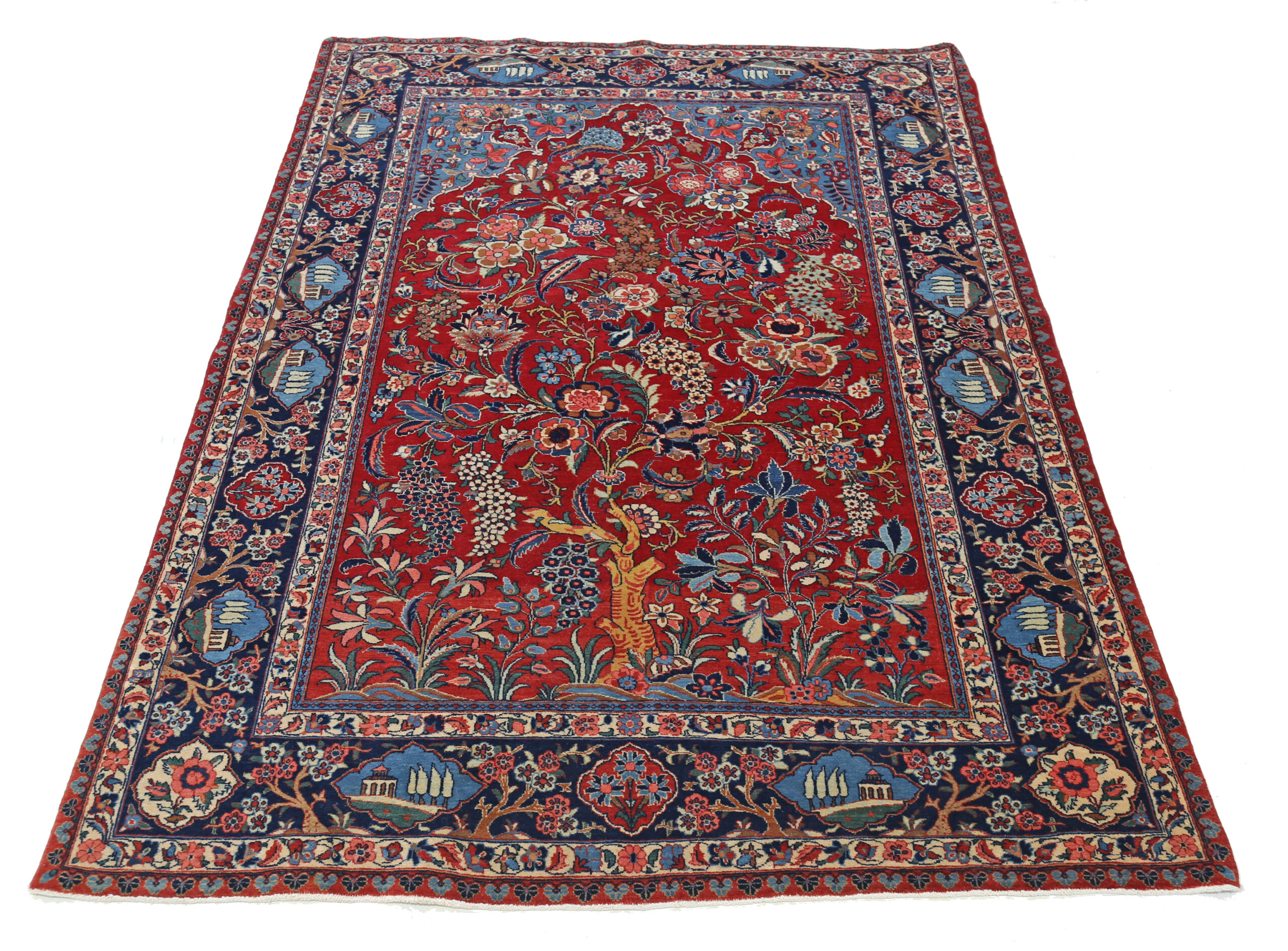 This Persian rug is a stunning piece with a rich history. Aged 100-110 years, it features a beautiful blue base with vibrant orange, beige, and peach floral patterns. Made from 100% wool with a medium pile, it has a knot density of approximately 324 KPSI. The dimensions are 4’7″ x 6’8″.