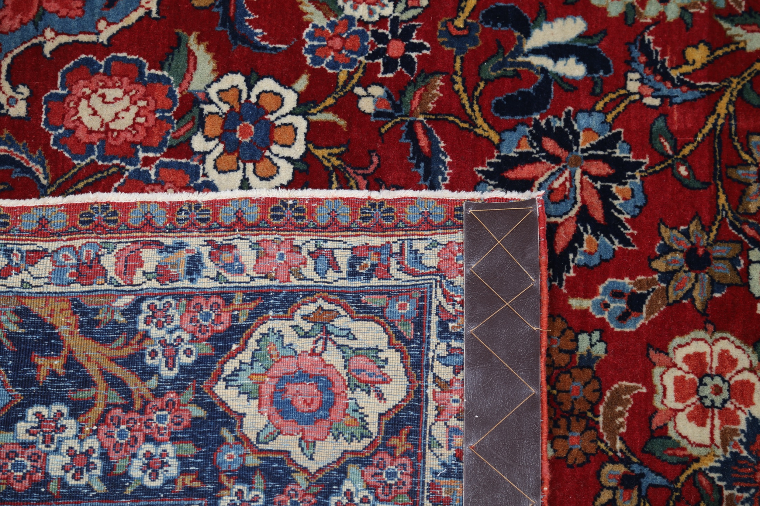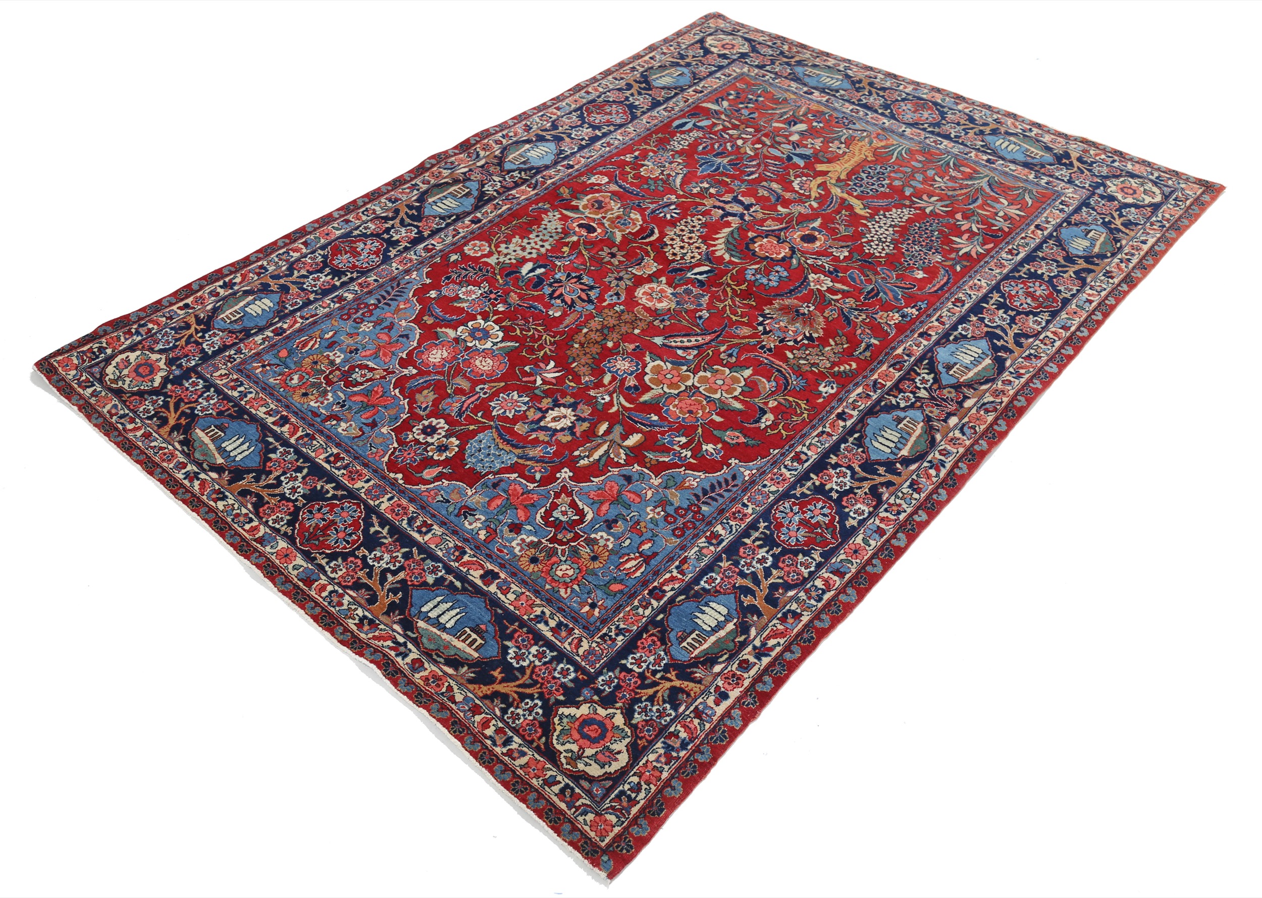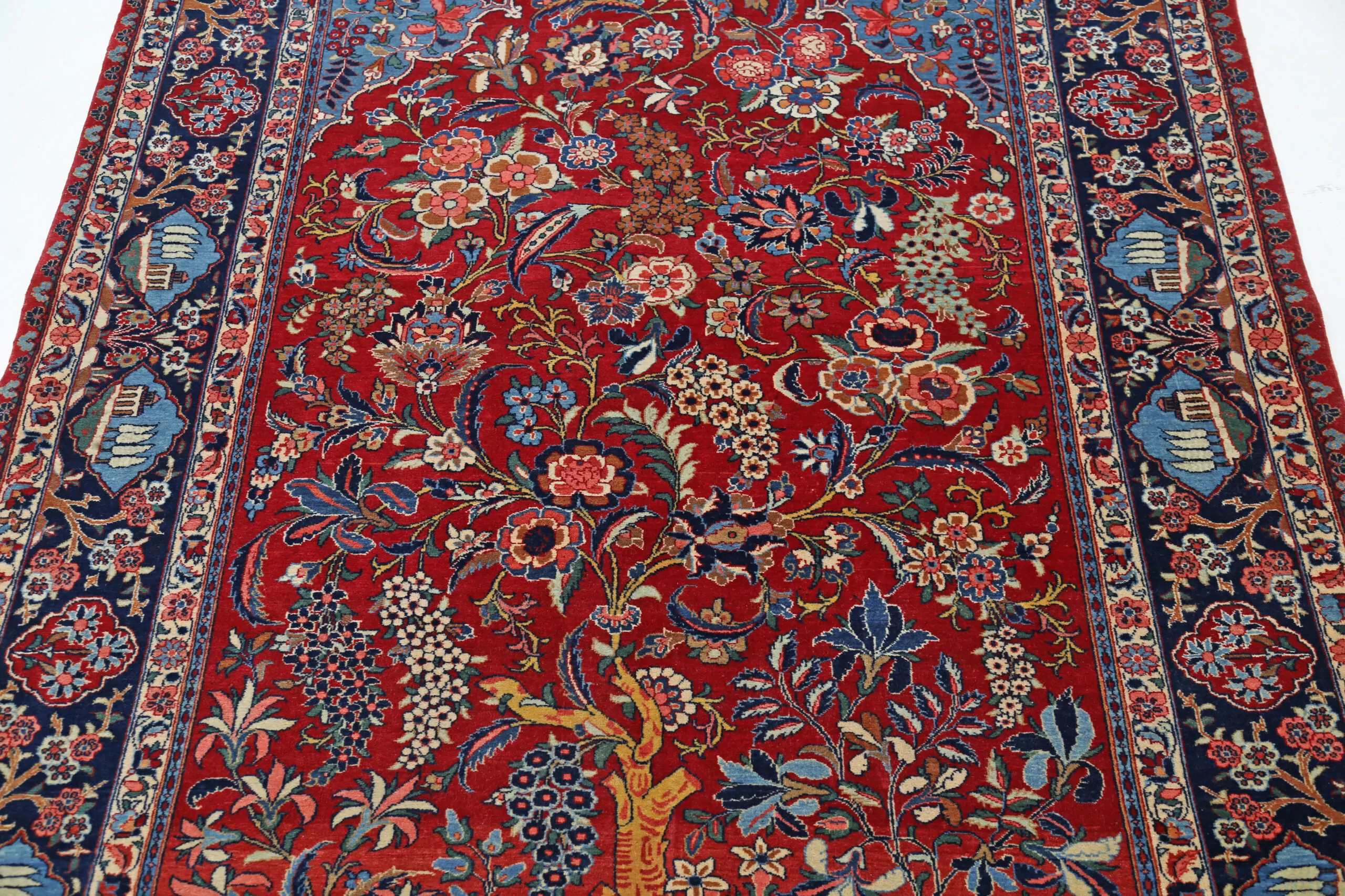 This Persian rug is a stunning piece with a rich history. Aged 100-110 years, it features a beautiful blue base with vibrant orange, beige, and peach floral patterns. Made from 100% wool with a medium pile, it has a knot density of approximately 324 KPSI. The dimensions are 4’7″ x 6’8″.