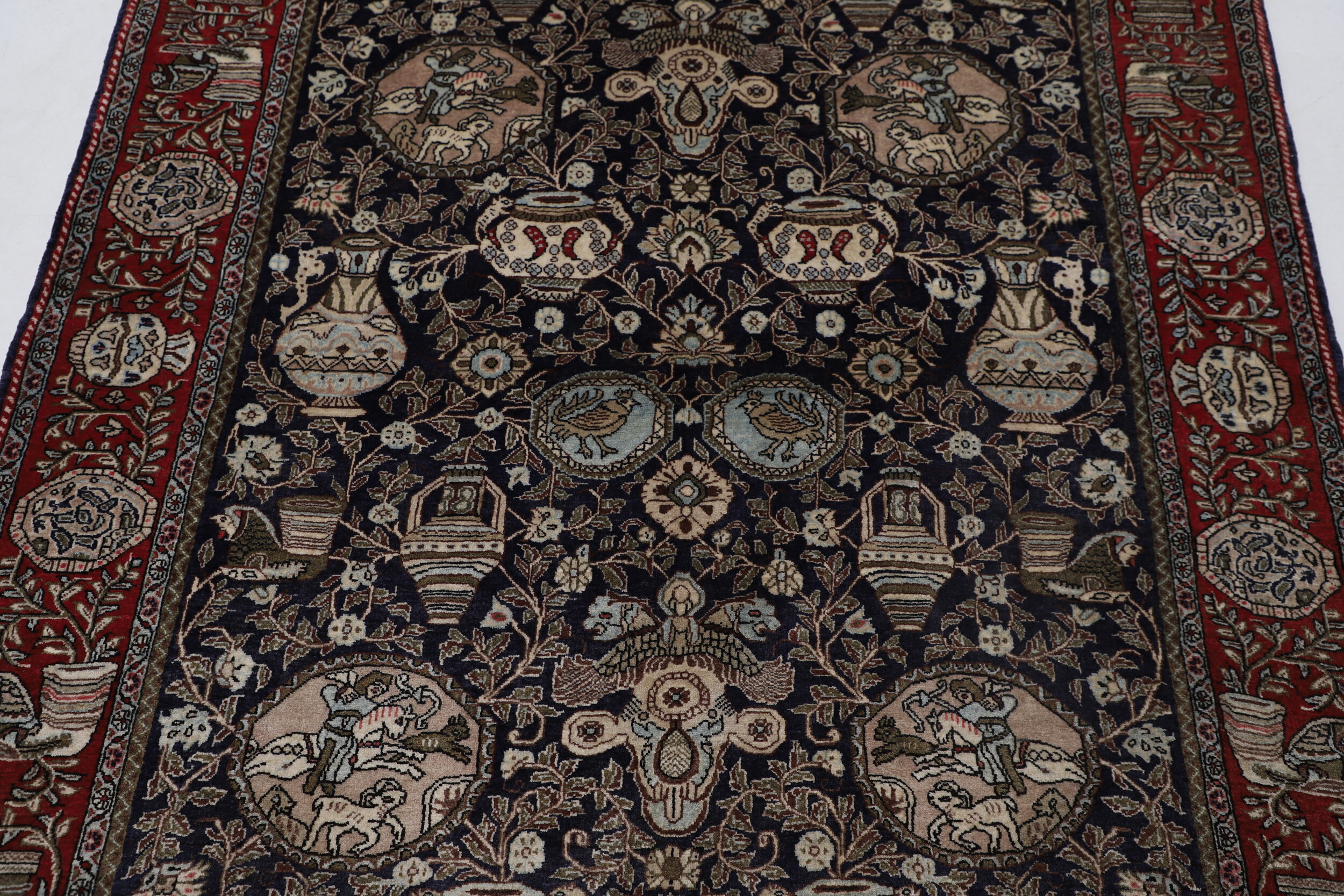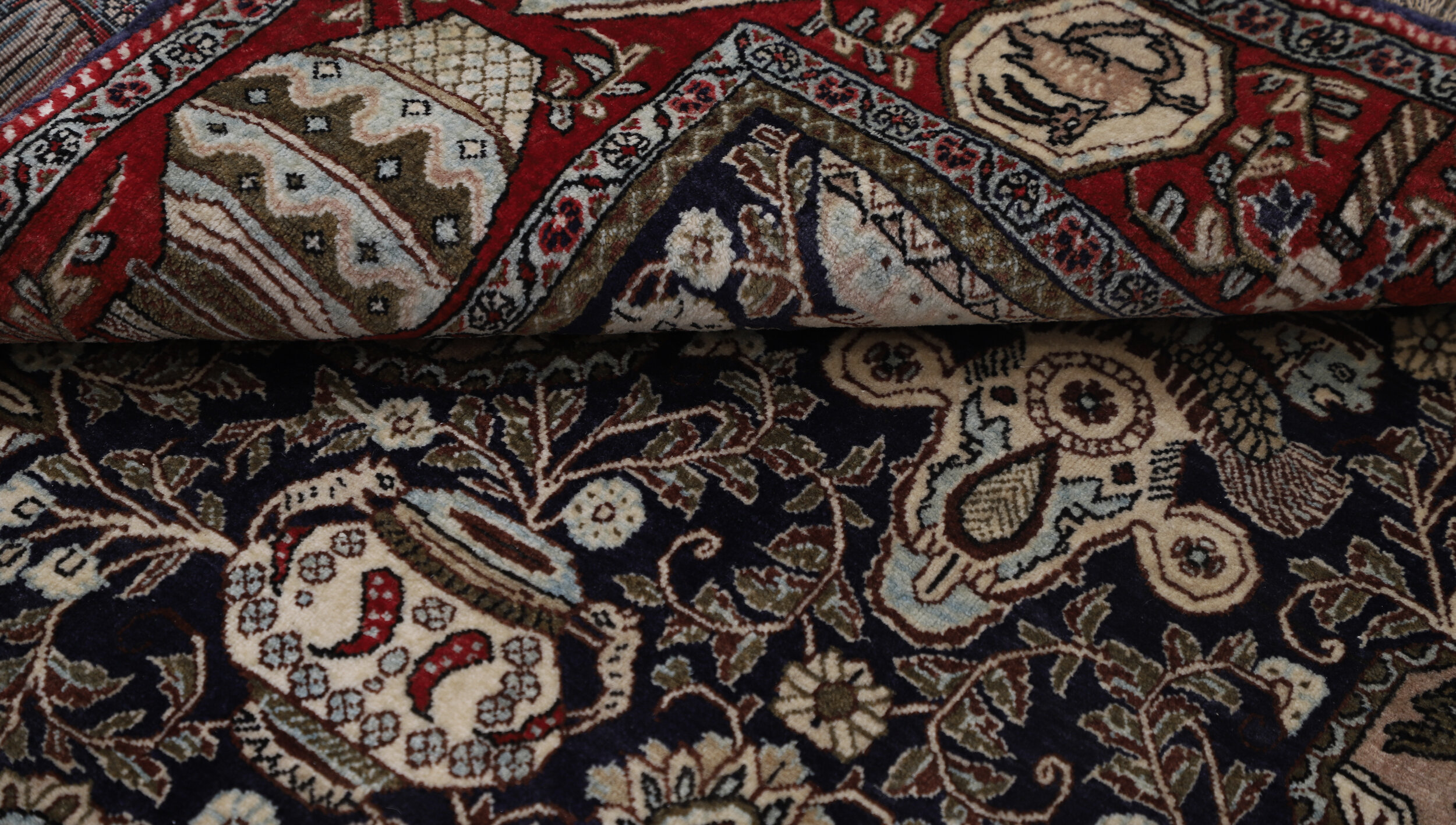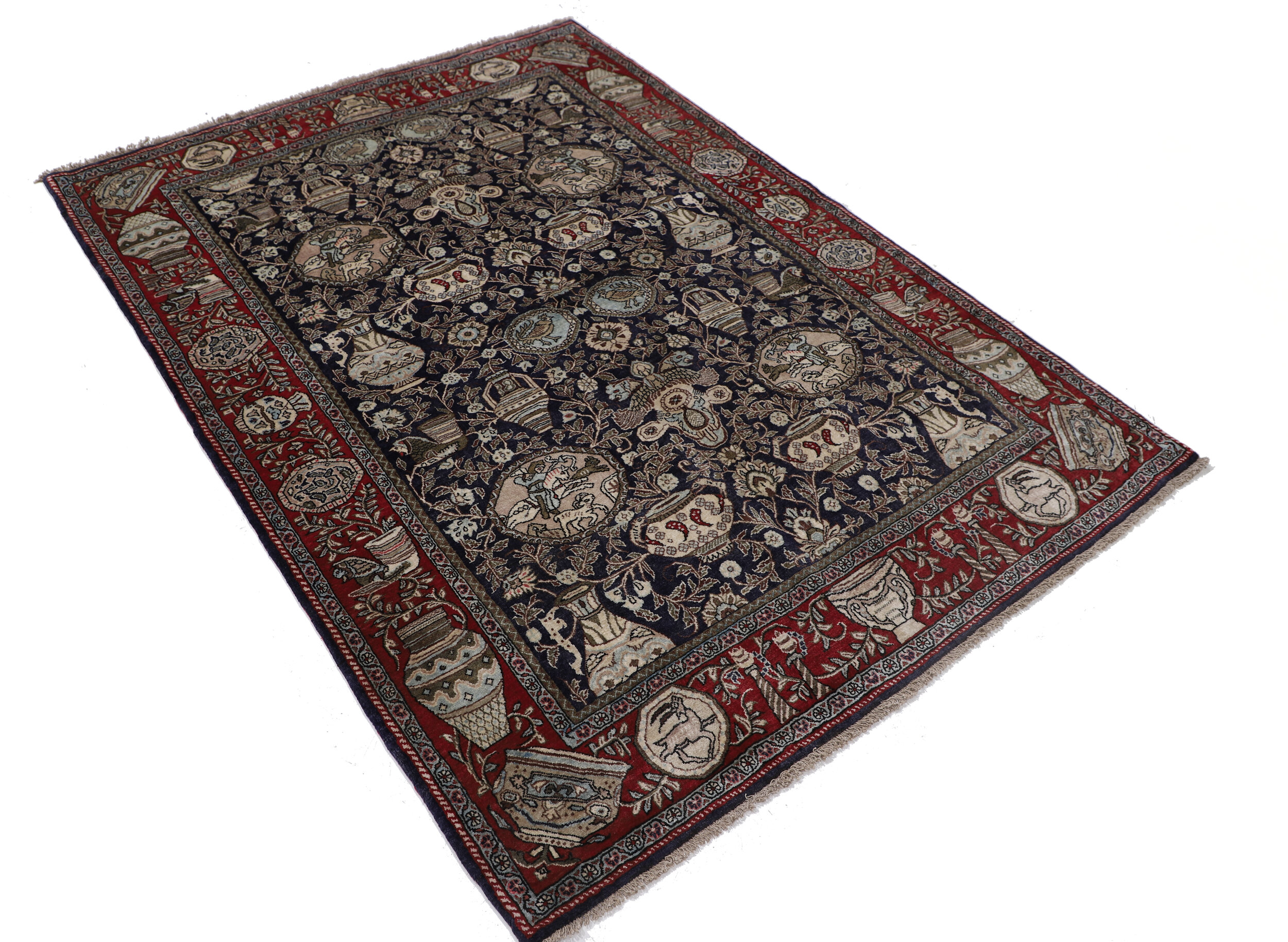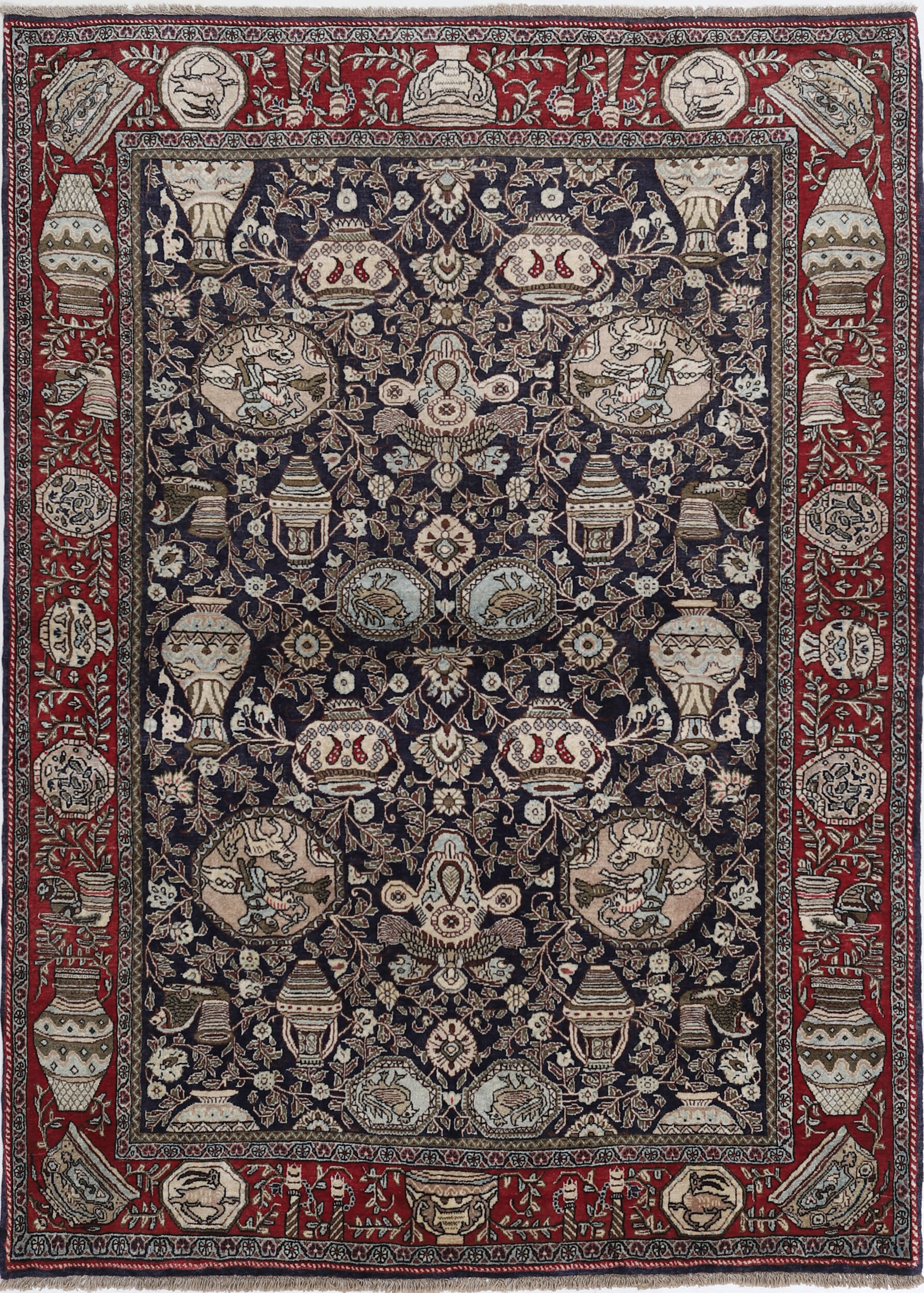 This exquisite hand-knotted Qum Persian rug boasts a stunning Vase design in hues of Blue and Red. Its high pile ranges from 1/2″ to 5/8″ and is made from 100% wool, while the foundation is crafted from cotton. With an impressive knot count of approximately 289 KPSI, this rug is a testament to the skilled craftsmanship of its makers. Aged between 50-60 years, this rug exudes a rich history and timeless elegance, making it a perfect addition to any home. Measuring at 4’9″ x 6’9″, this piece is sure to impress.