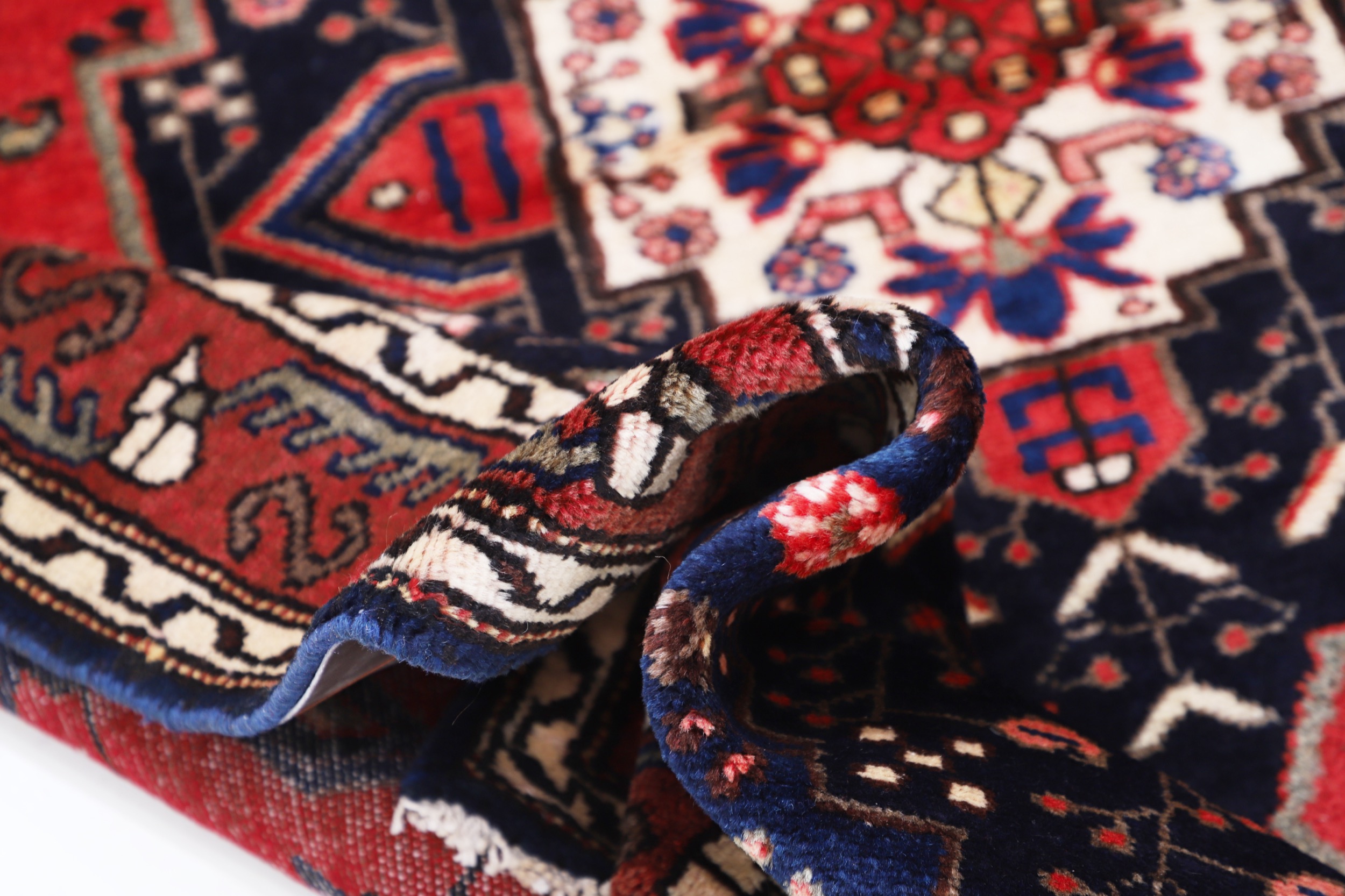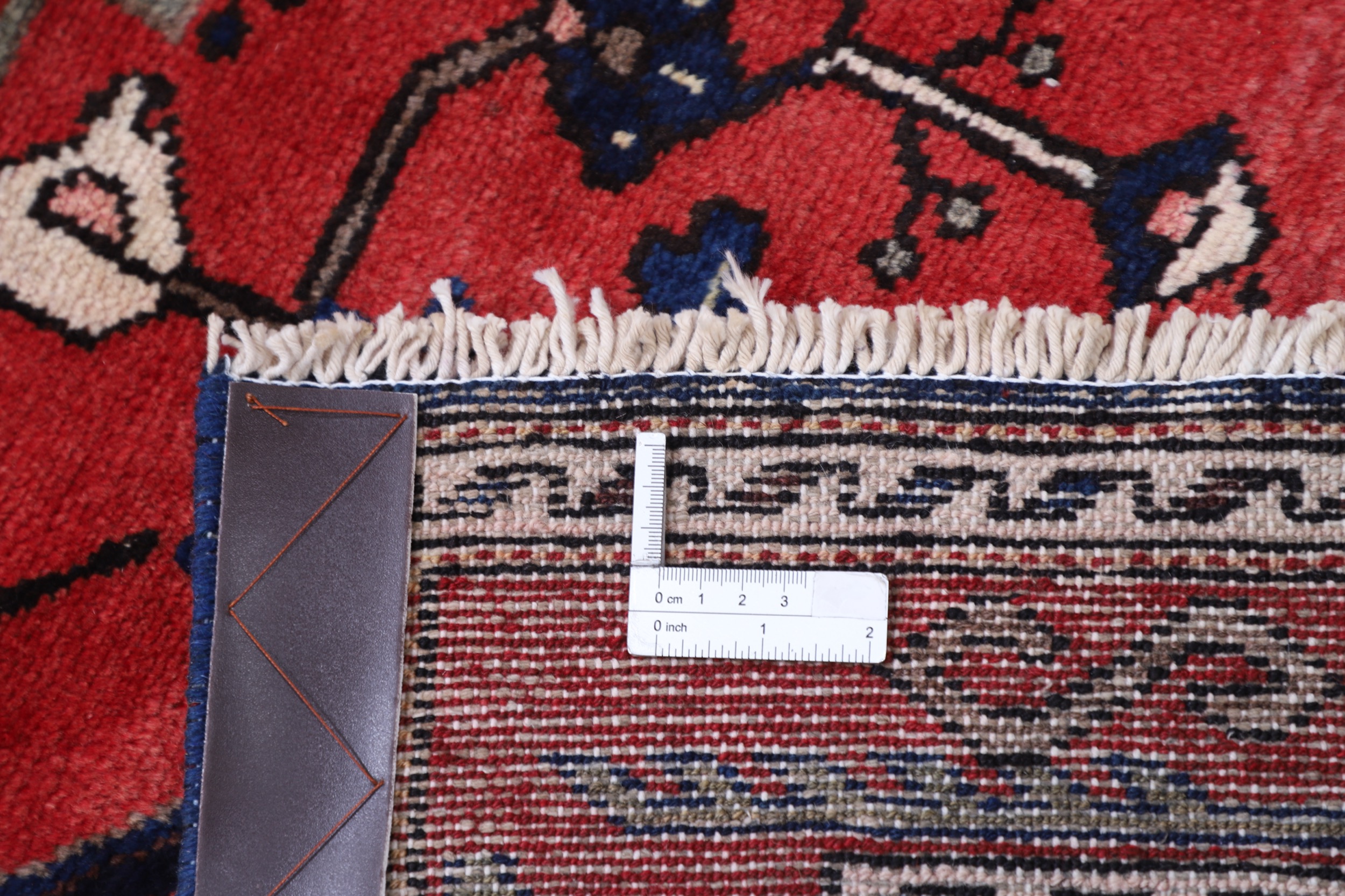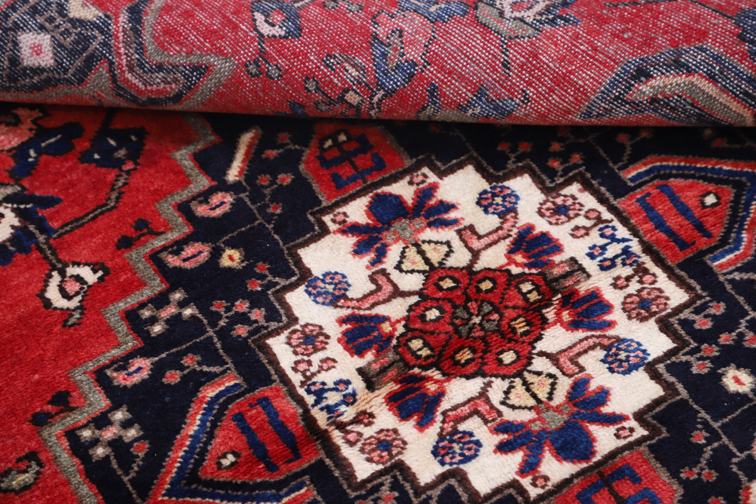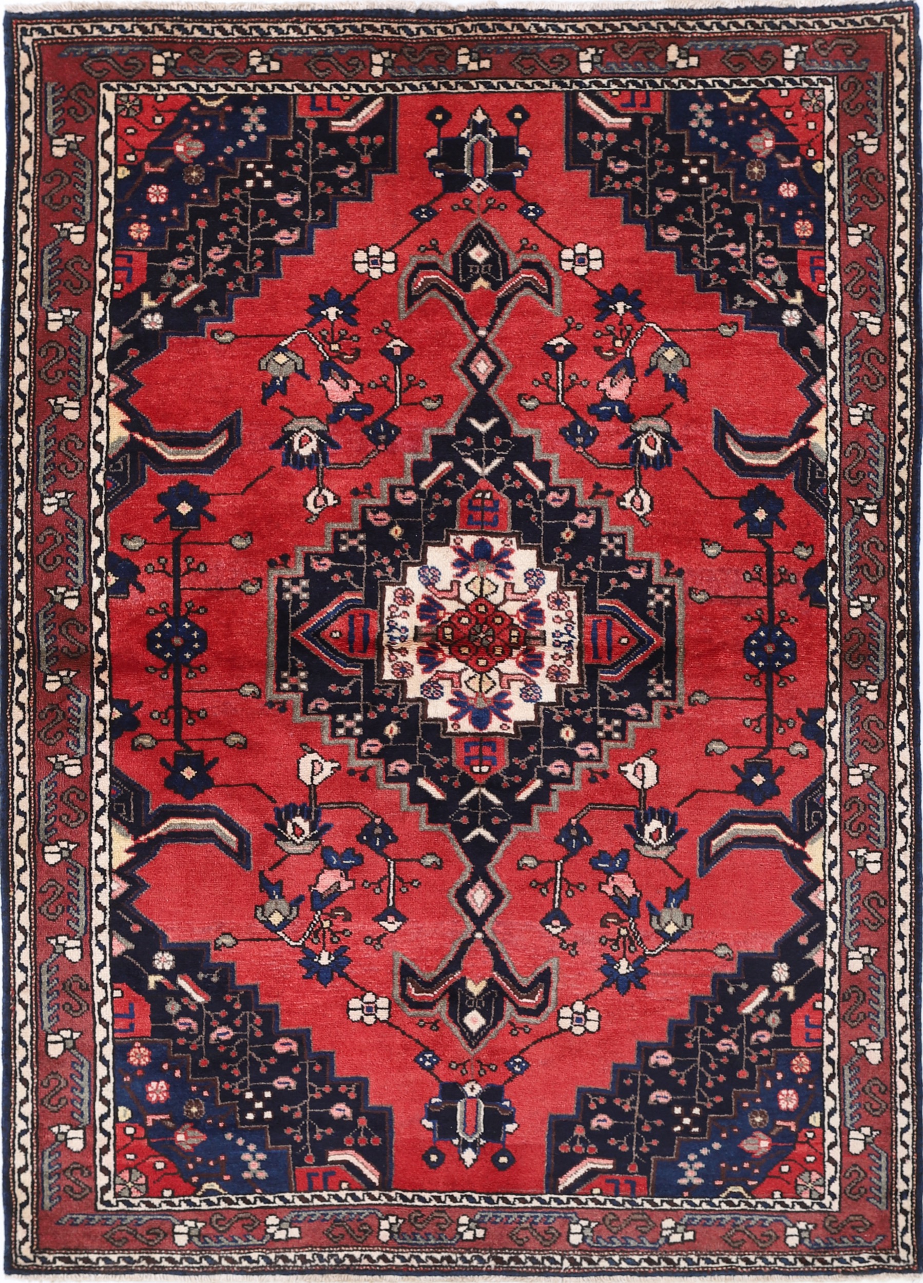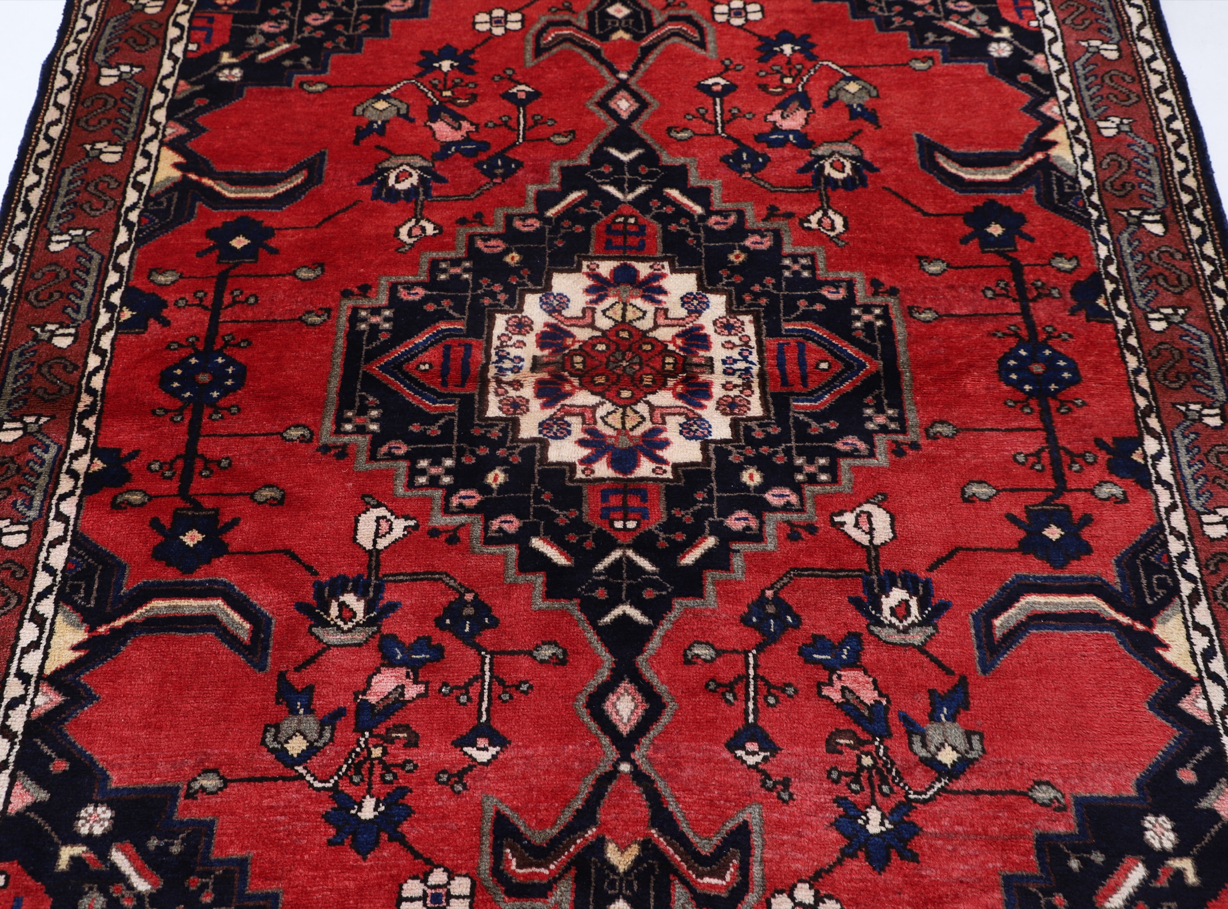 Hand Knotted Hamadan Persian Rug: This exquisite 5′ x 6’11” rug is crafted using traditional techniques. With an aged appearance of 0-20 years, it features a vibrant red color and a captivating red medallion design. Made from 100% wool with a medium pile height of 1/3″-3/8″, this rug has a density of approximately 156 knots per square inch. Its blend of cotton and wool ensures durability and a luxurious feel. Perfect for adding warmth and elegance to any space.