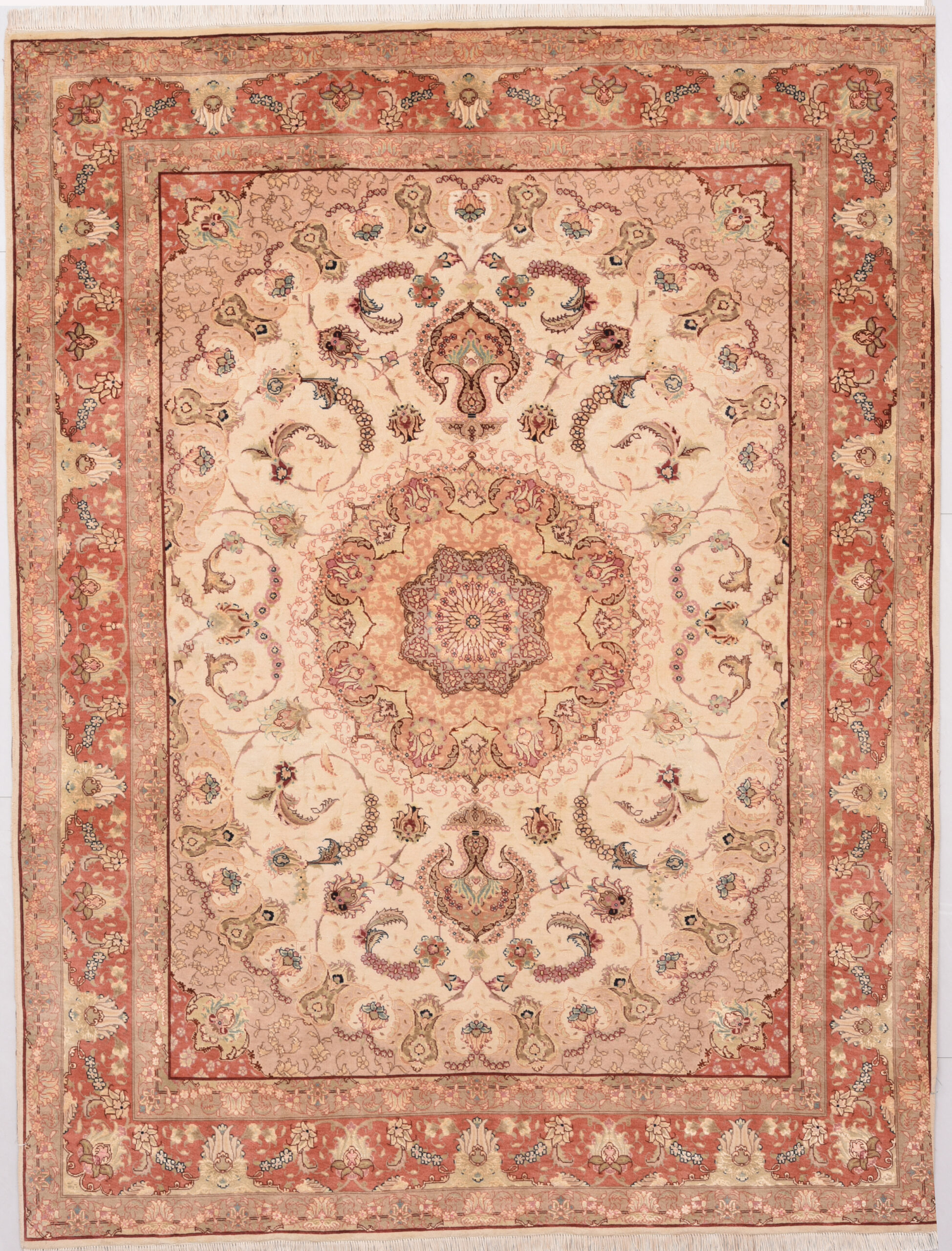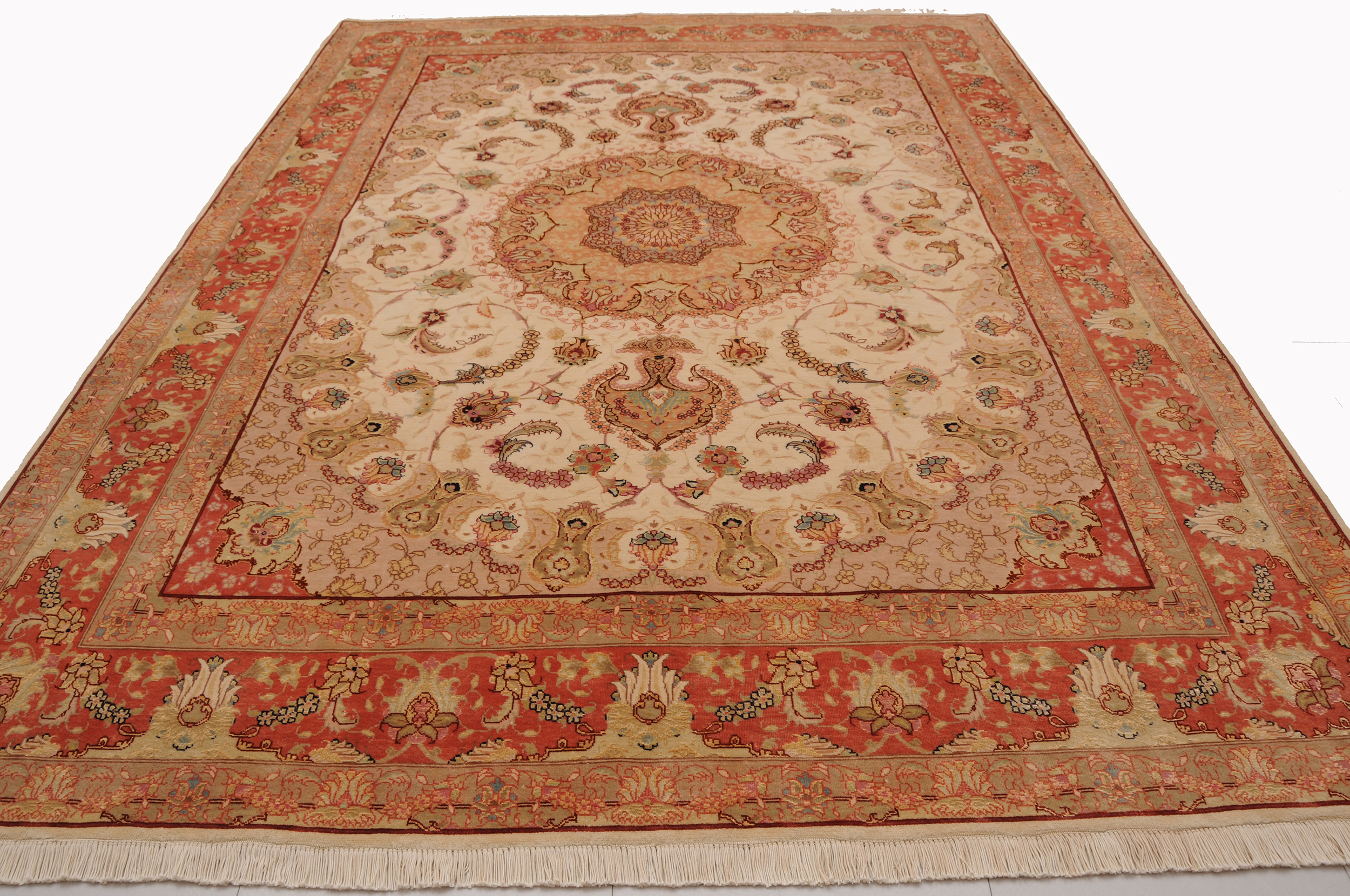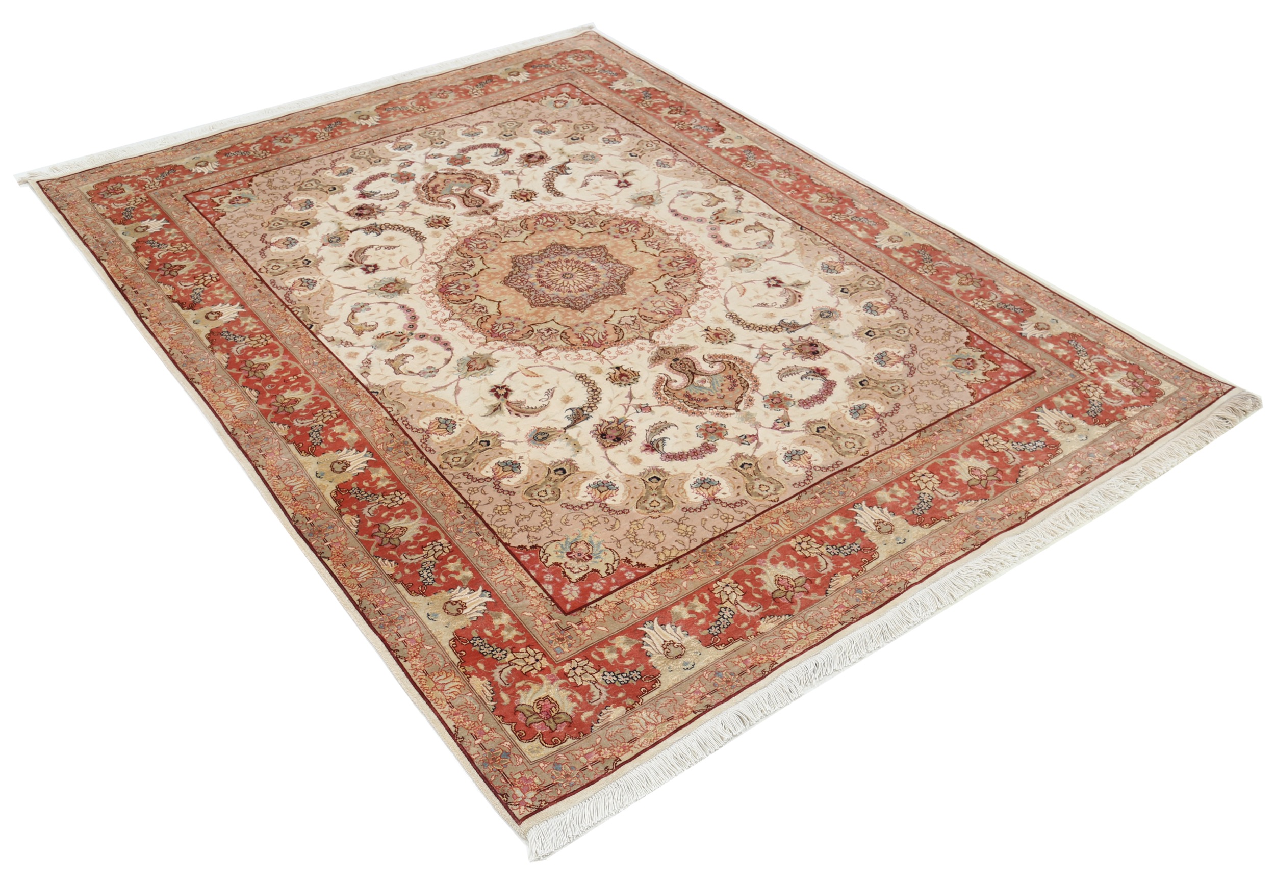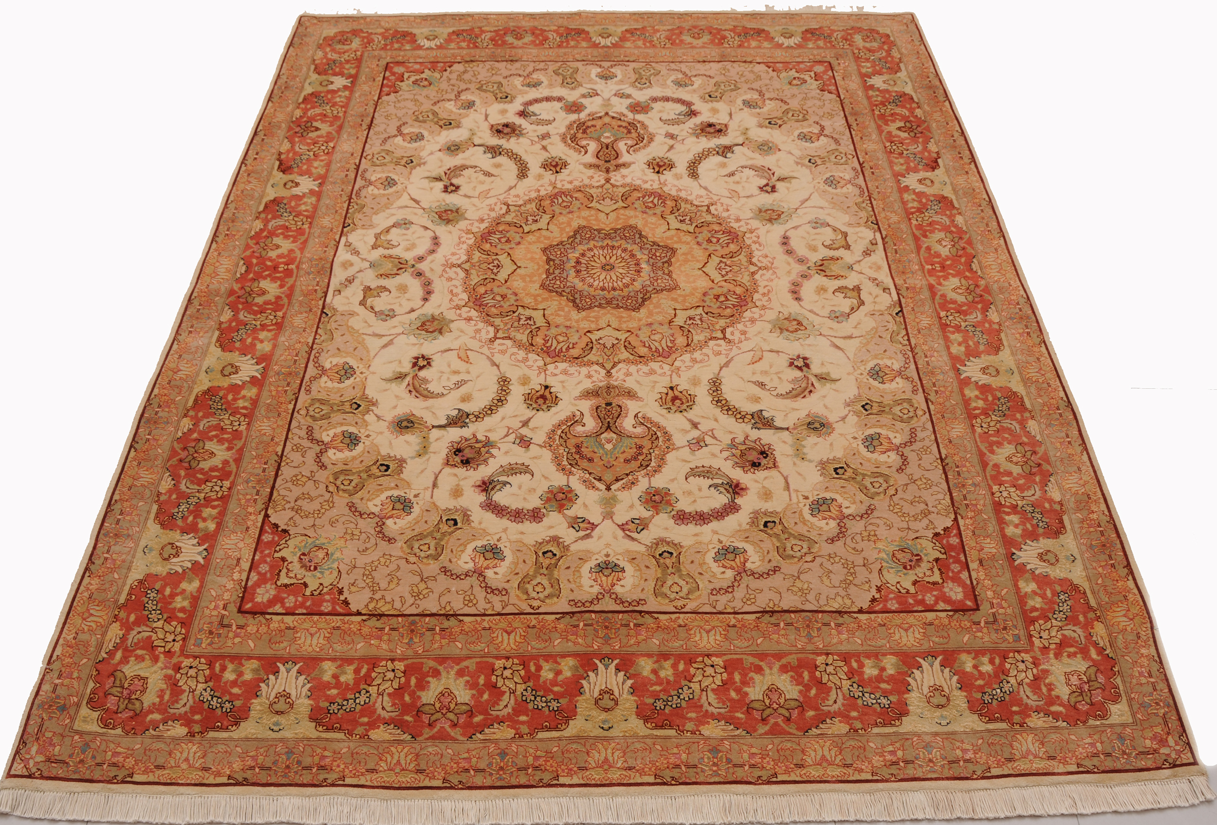 This 5’0″ x 6’8″ Tabriz rug, hand-knotted in Persian, features a floral design. It is woven with Approx. 424KPS, showcasing a field in Beige and a Orange border. The rug has a Medium Pile and a Silk & Wool pile, and is in excellent condition.