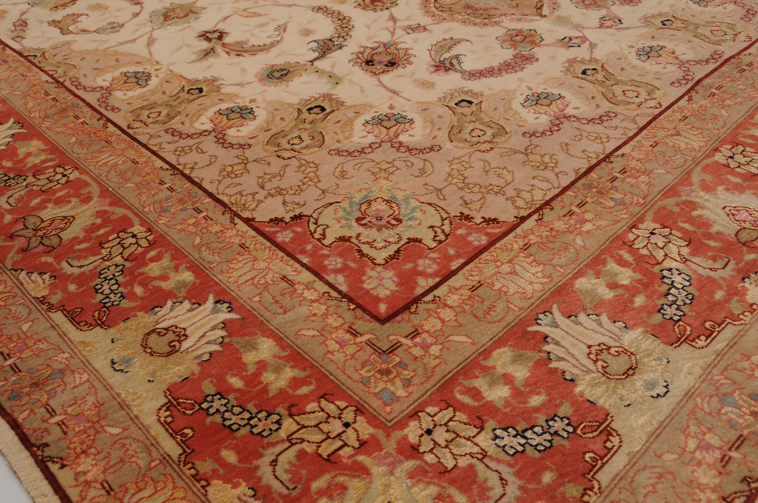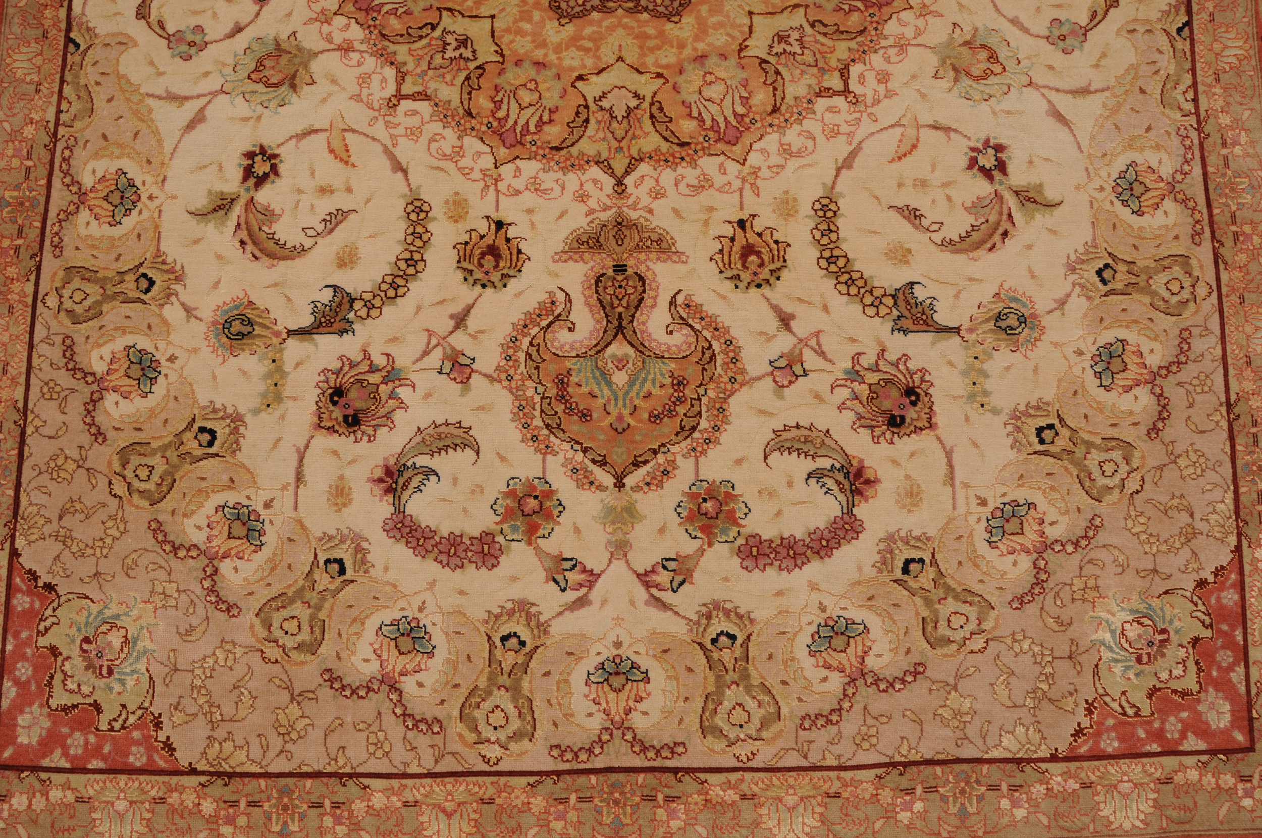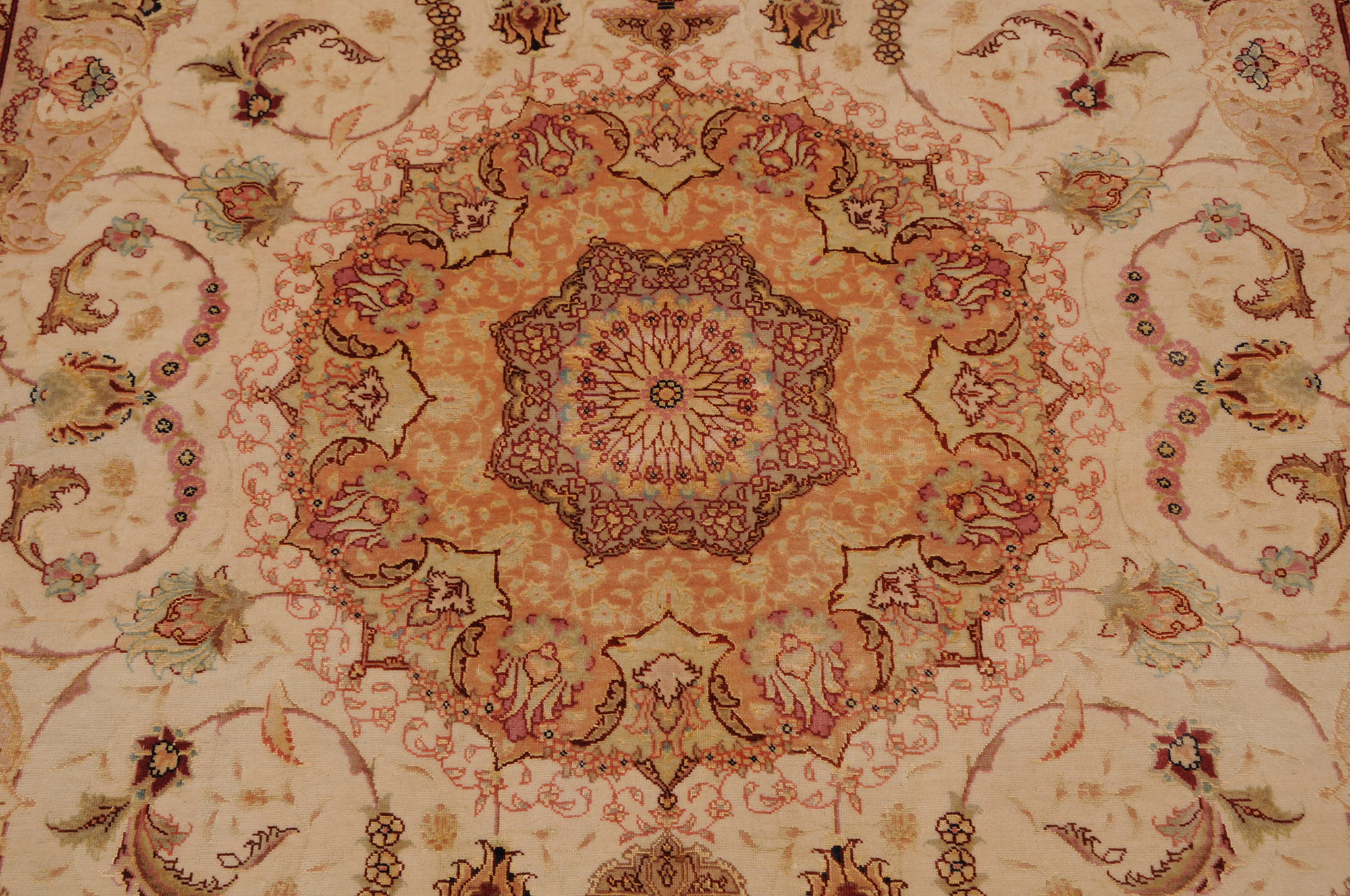 This 5’0″ x 6’8″ Tabriz rug, hand-knotted in Persian, features a floral design. It is woven with Approx. 424KPS, showcasing a field in Beige and a Orange border. The rug has a Medium Pile and a Silk & Wool pile, and is in excellent condition.