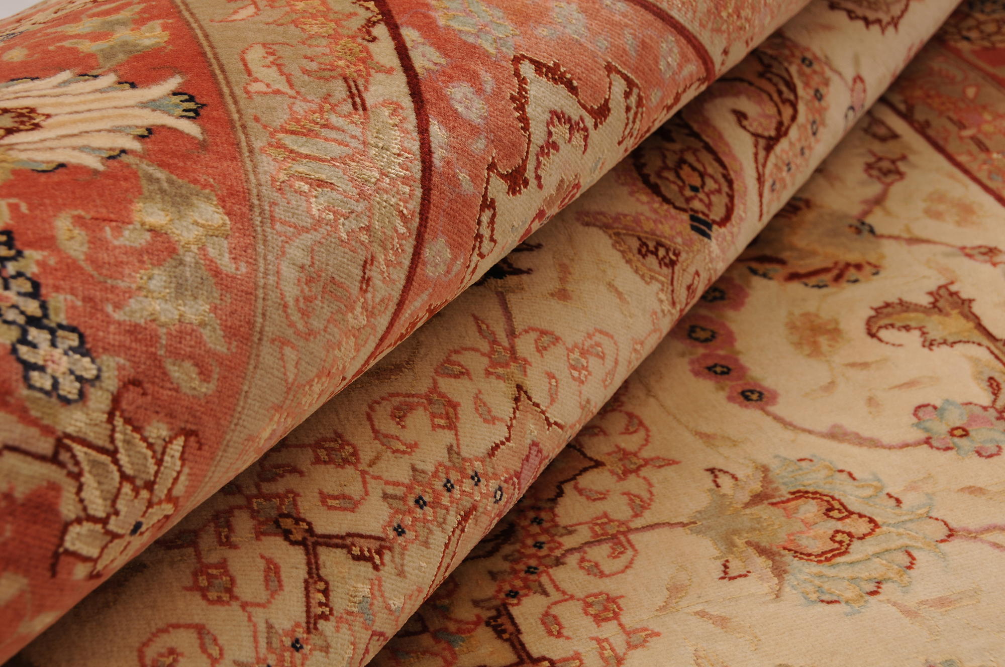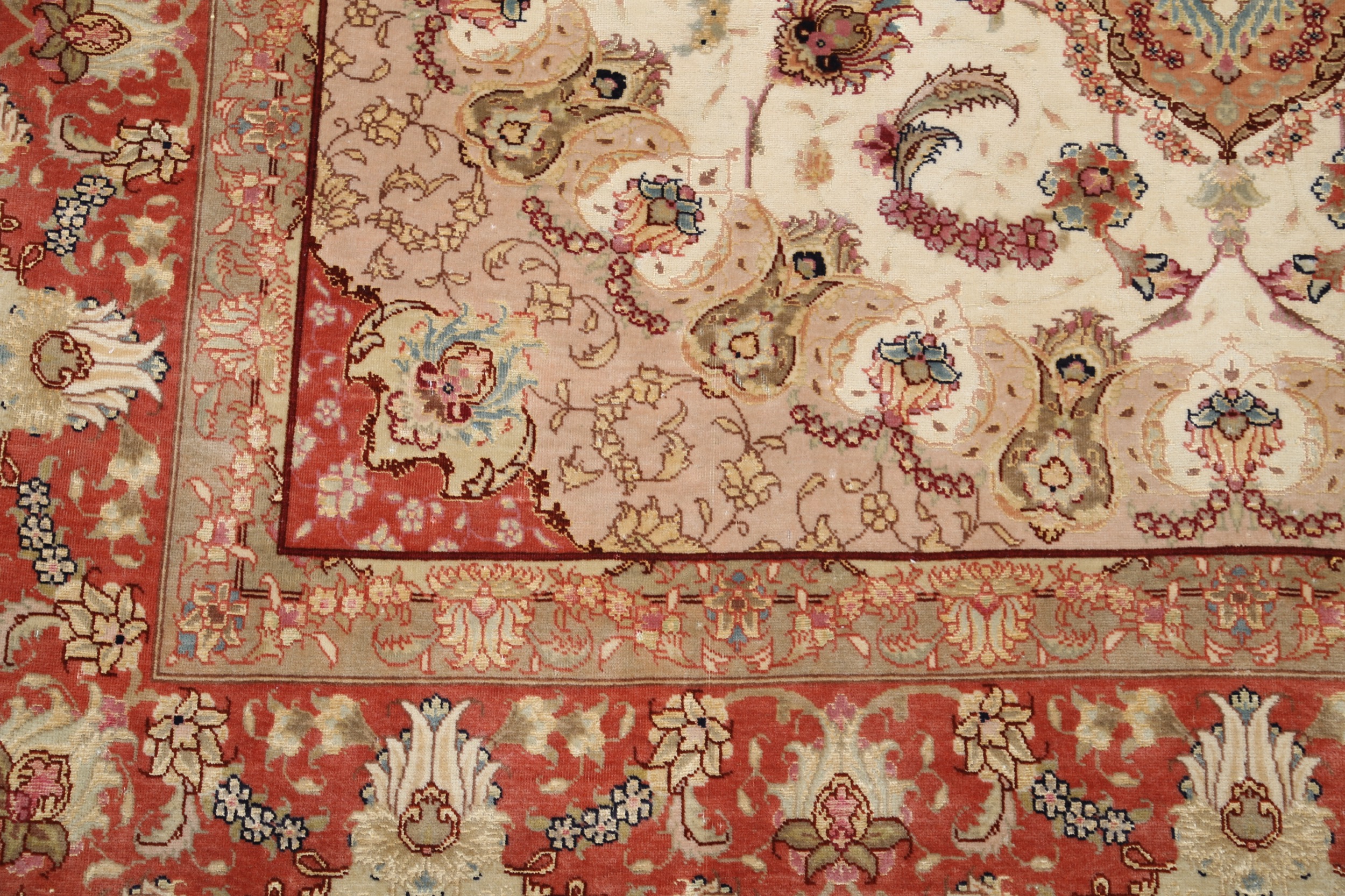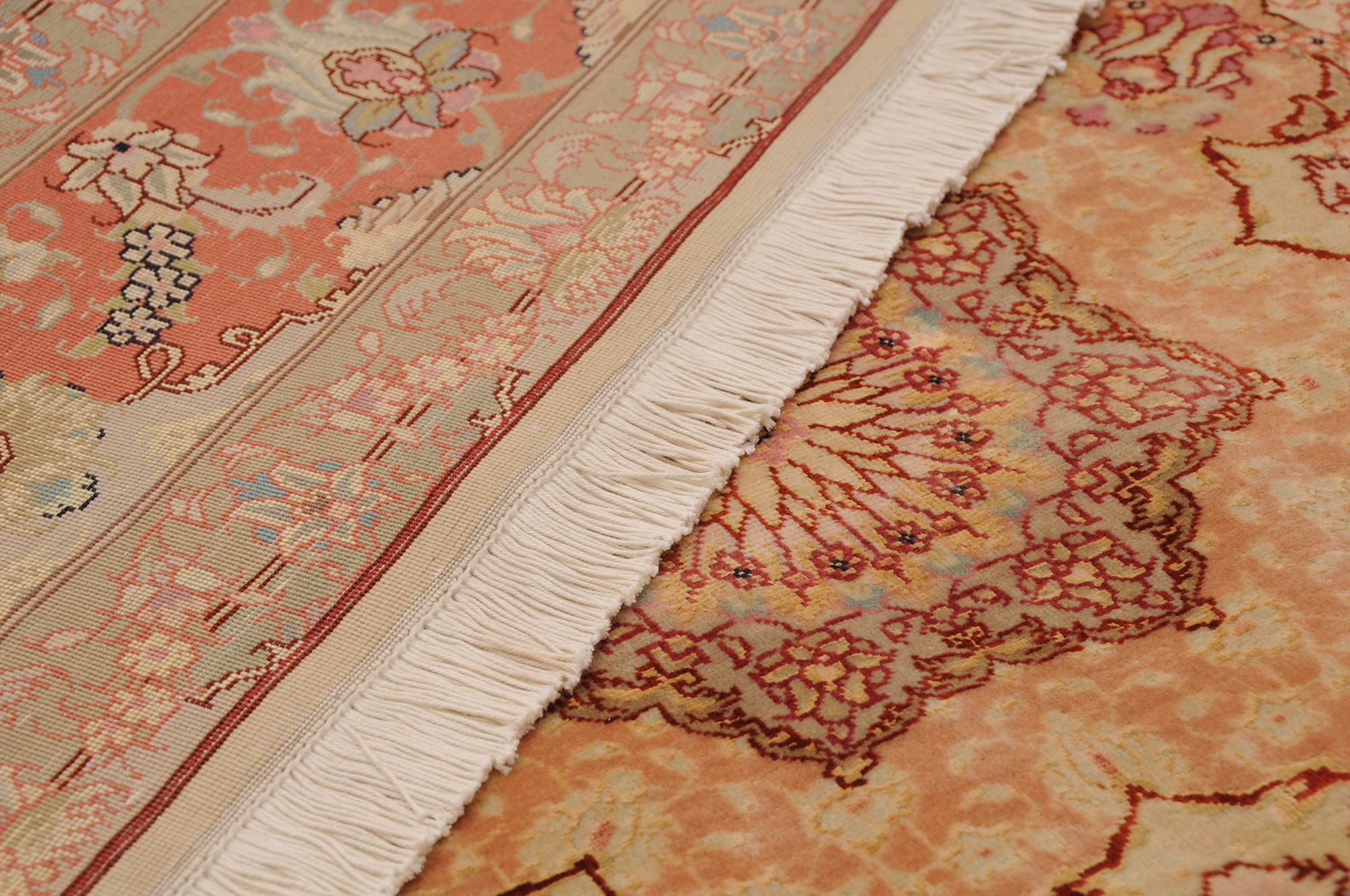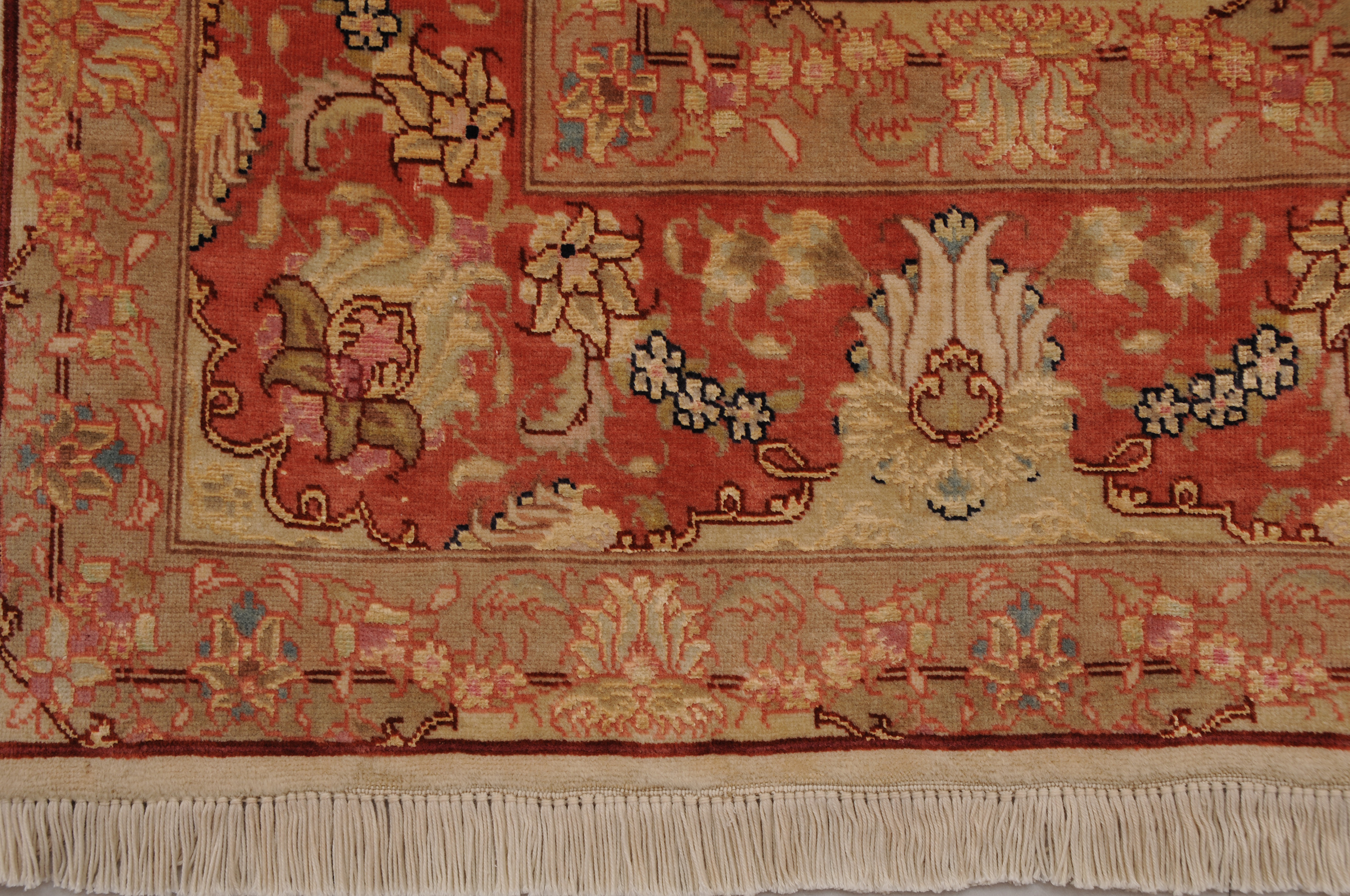 This 5’0″ x 6’8″ Tabriz rug, hand-knotted in Persian, features a floral design. It is woven with Approx. 424KPS, showcasing a field in Beige and a Orange border. The rug has a Medium Pile and a Silk & Wool pile, and is in excellent condition.