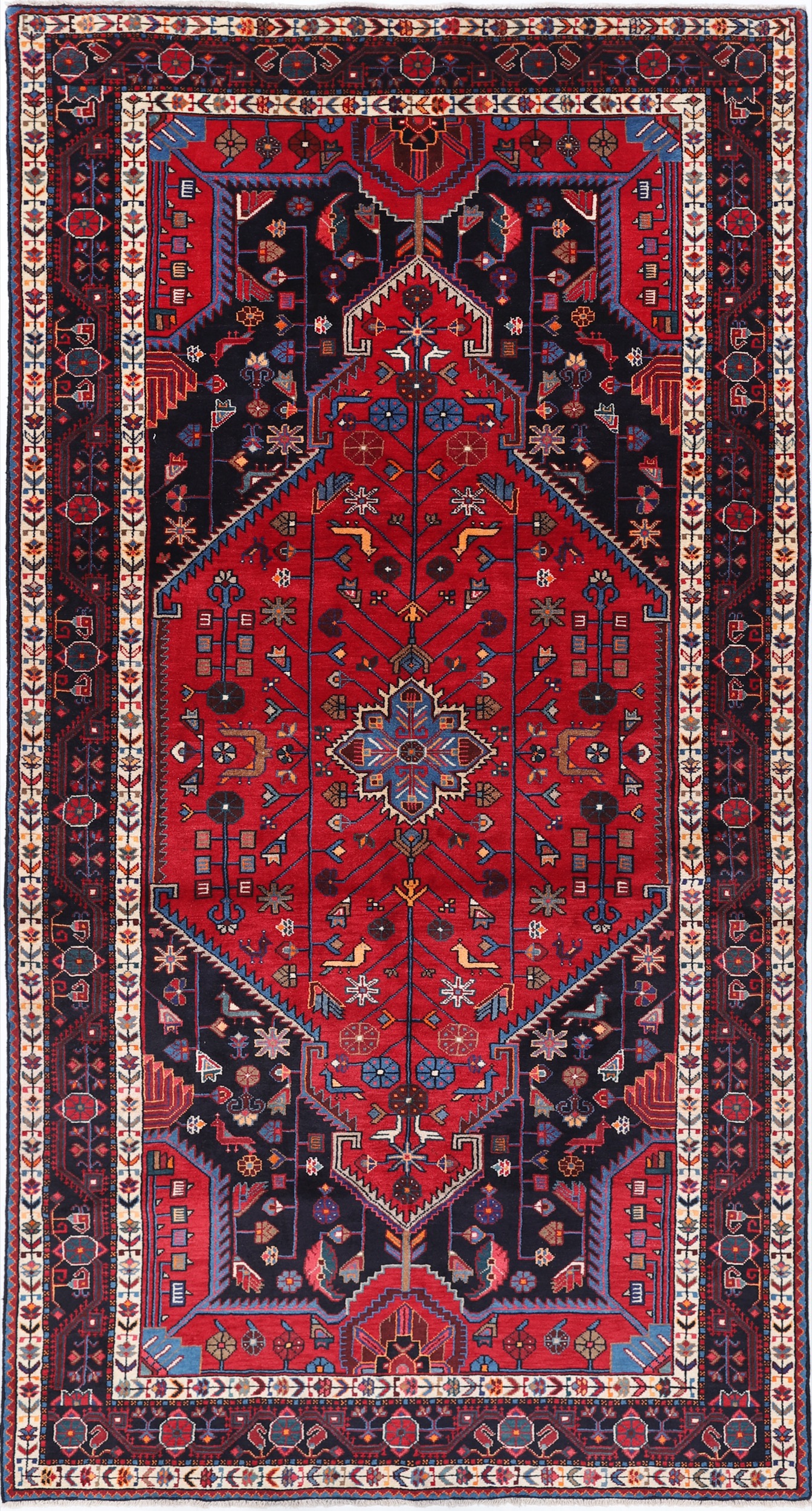 Hand Knotted Malayer Persian Rug, measuring 5’1″ x 10’1″, features an exquisite design in vibrant hues of red and blue. Crafted from 100% wool with a cotton foundation, this rug showcases a geometric pattern with a medium pile height of 1/3″-3/8″. With an estimated knot count of approximately 169 KPSI, this aged masterpiece, aged between 0-20 years, brings both elegance and durability to any space it graces.