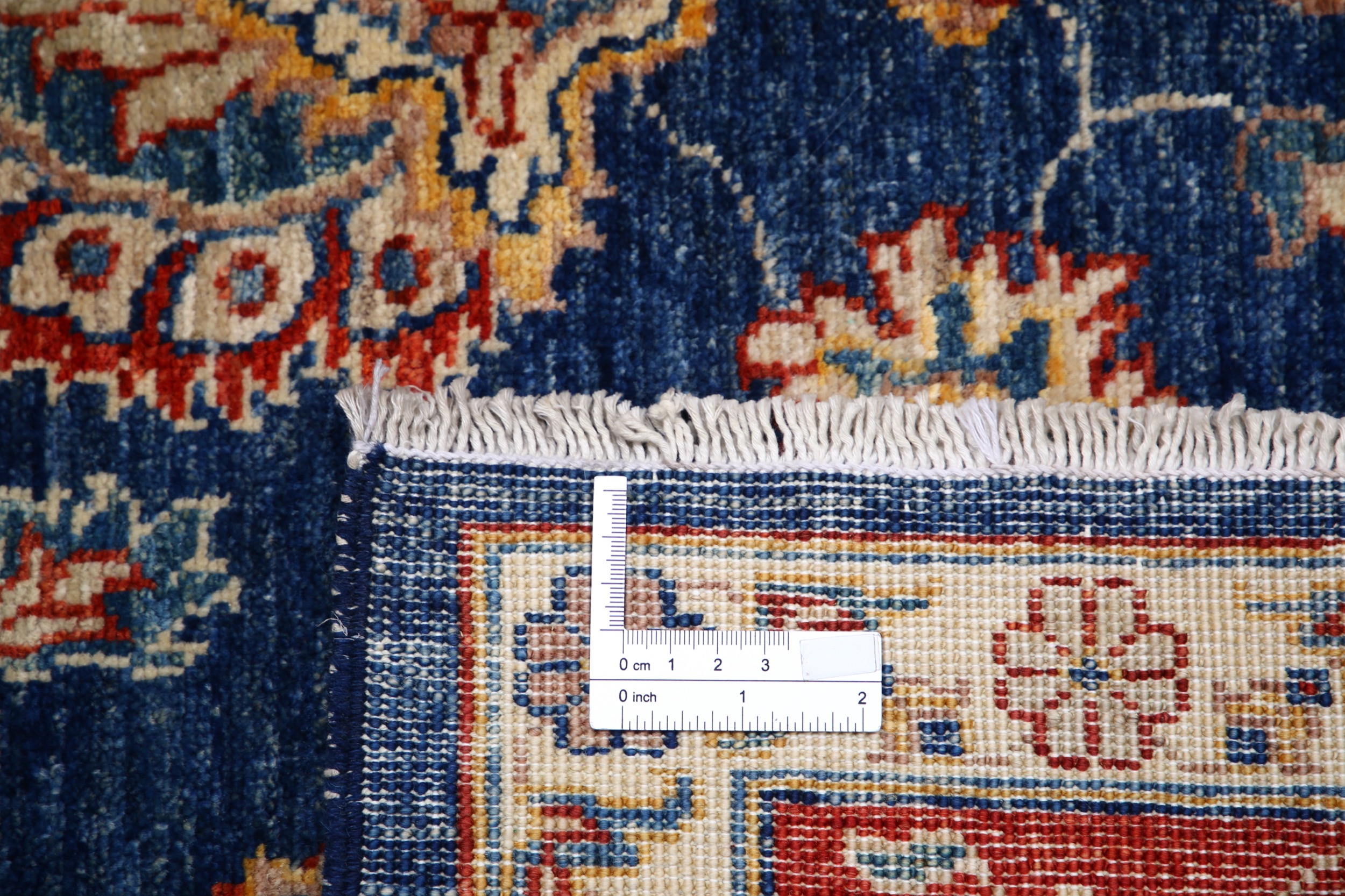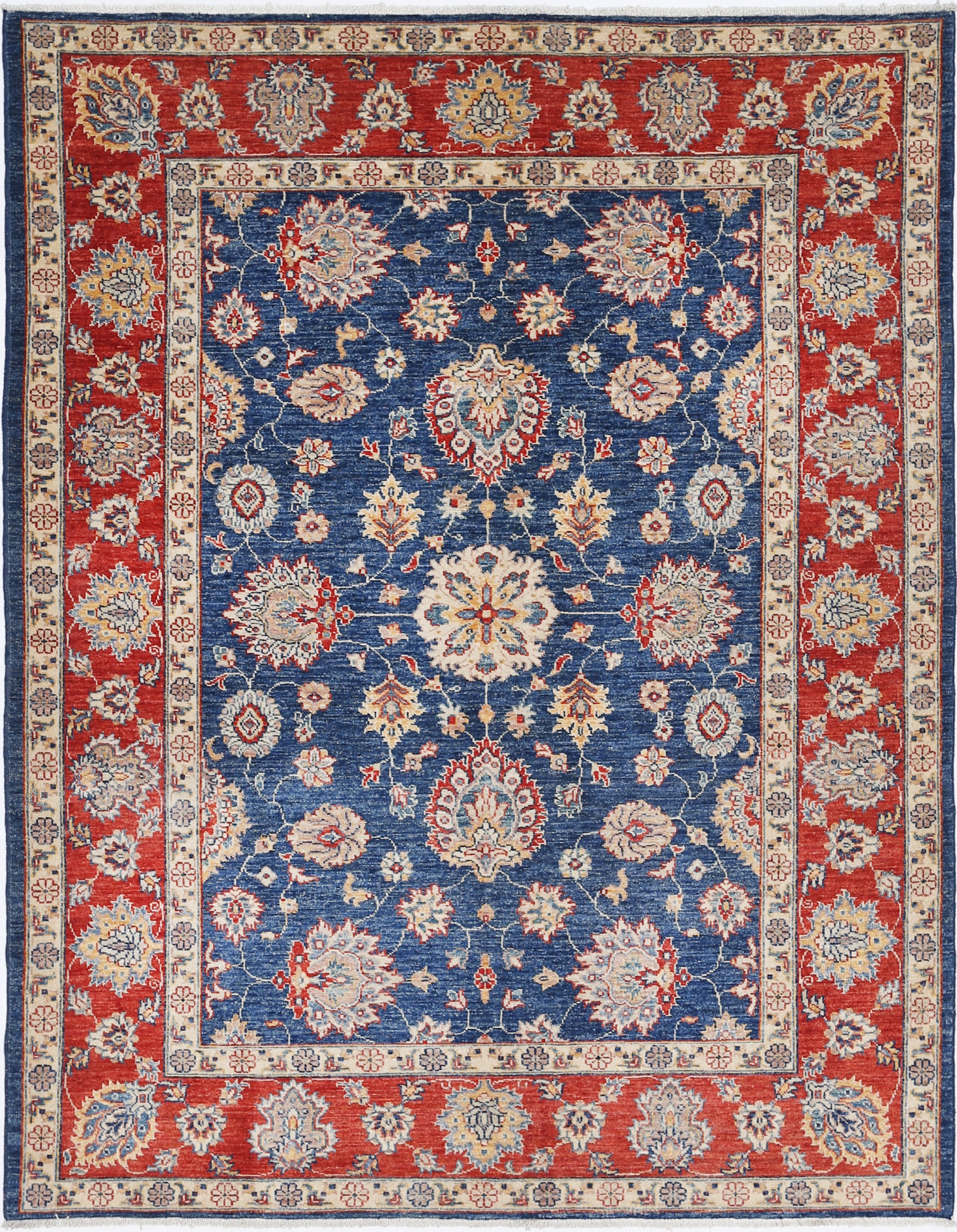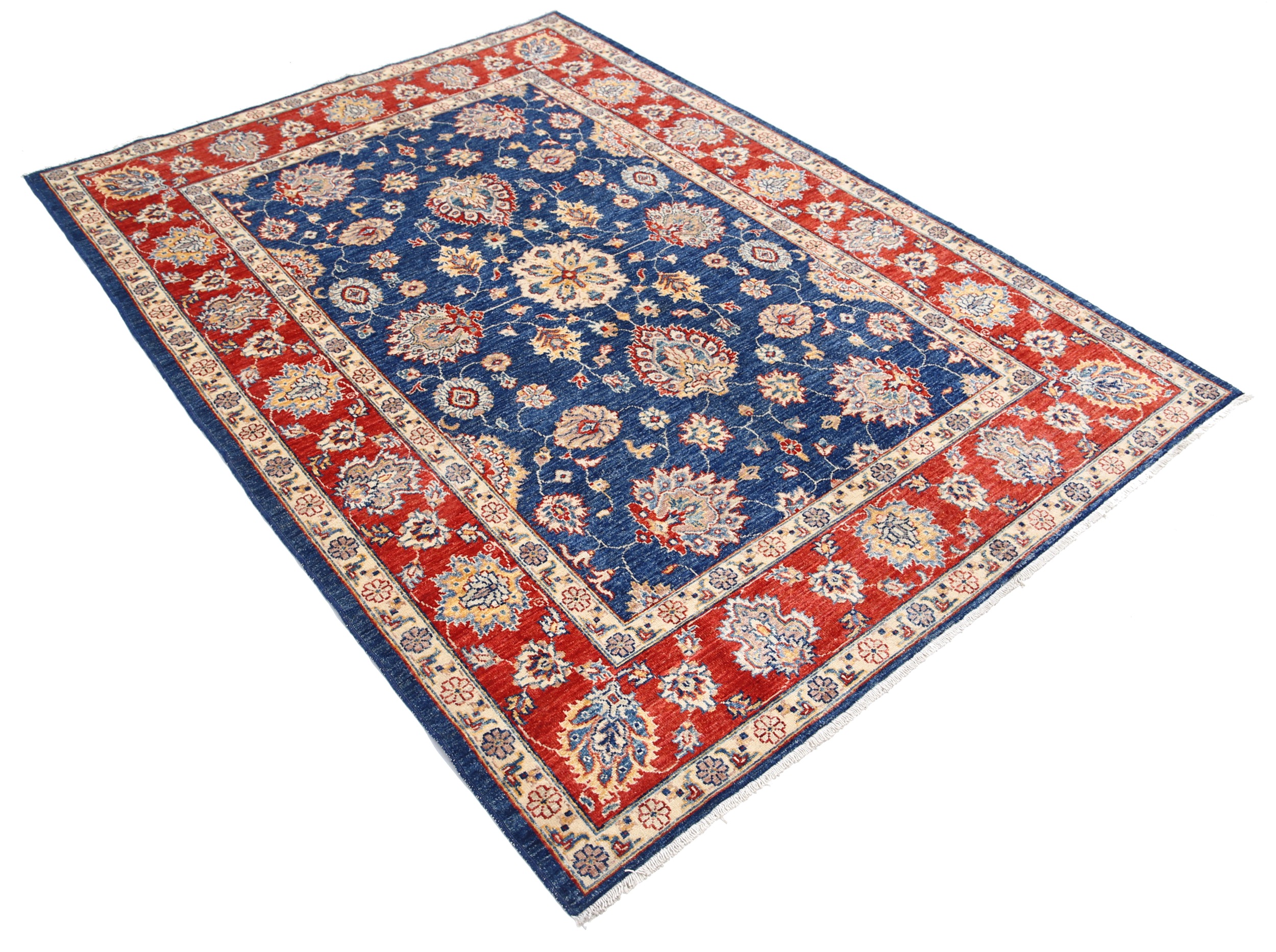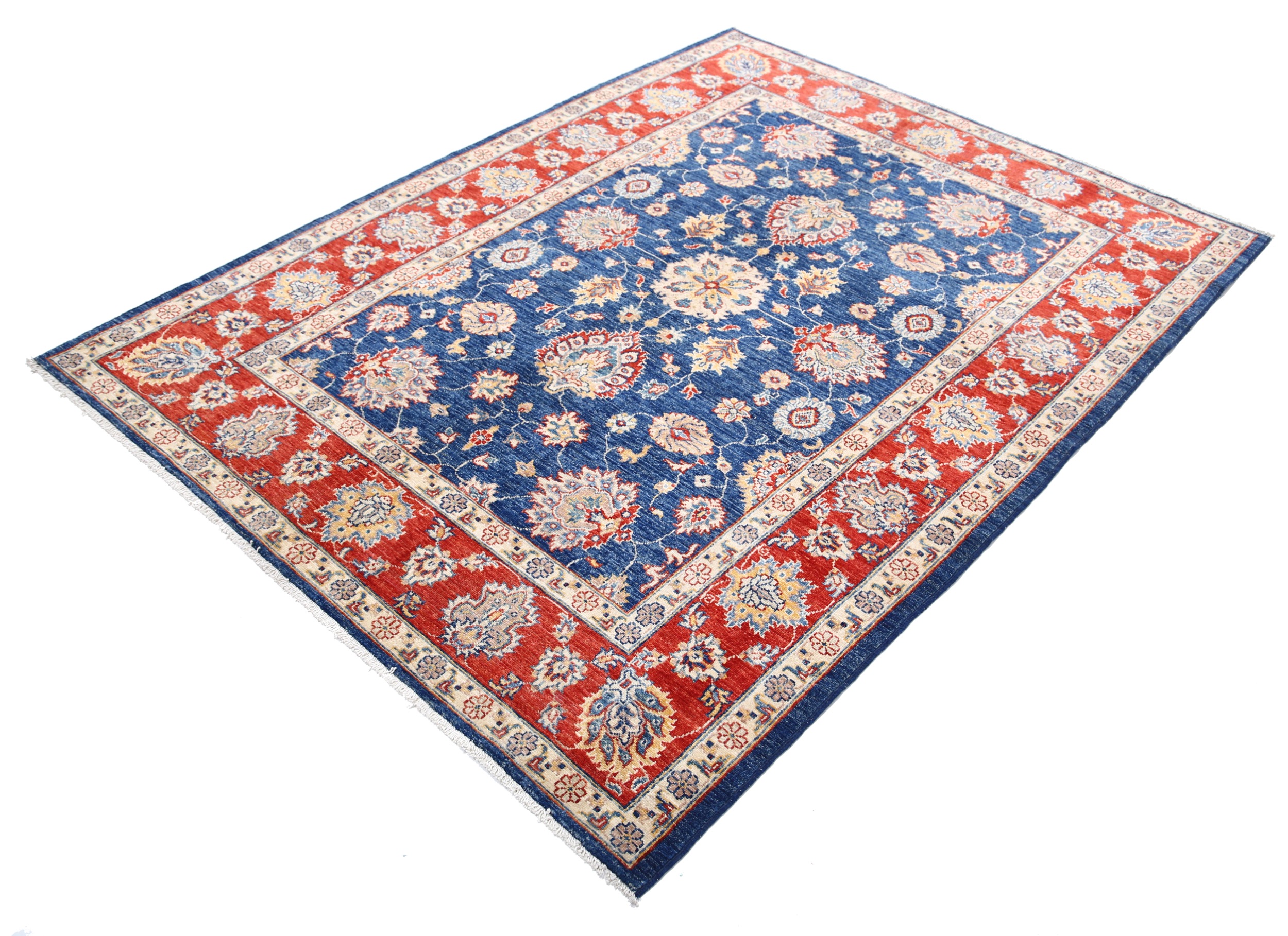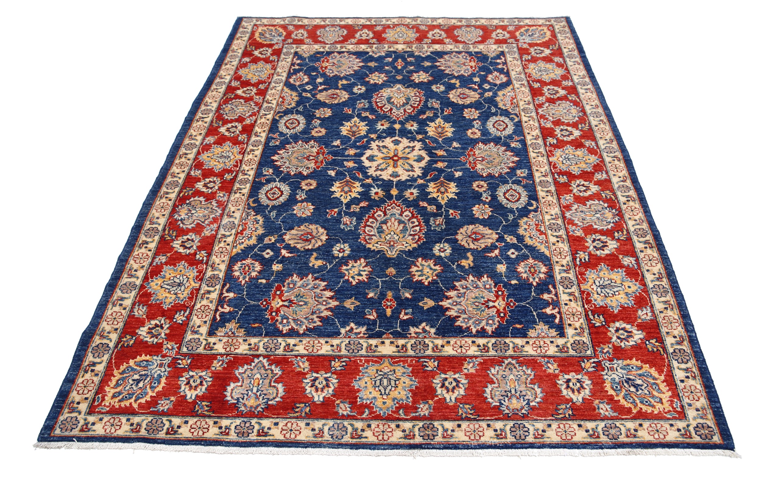 This 5’1″ x 6’9″ Oushak rug, hand-knotted in Afghan / Pakistan, features a floral design. Crafted with approx. 156 kpsi, its field color is Blue with a Red border. The rug has a low medium pile 1/4″-1/3″ and a 100% wool pile, in excellent & washed condition.