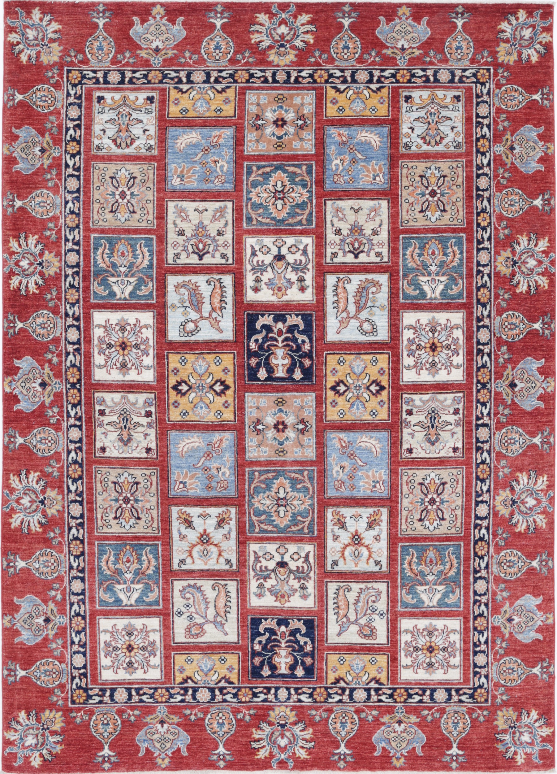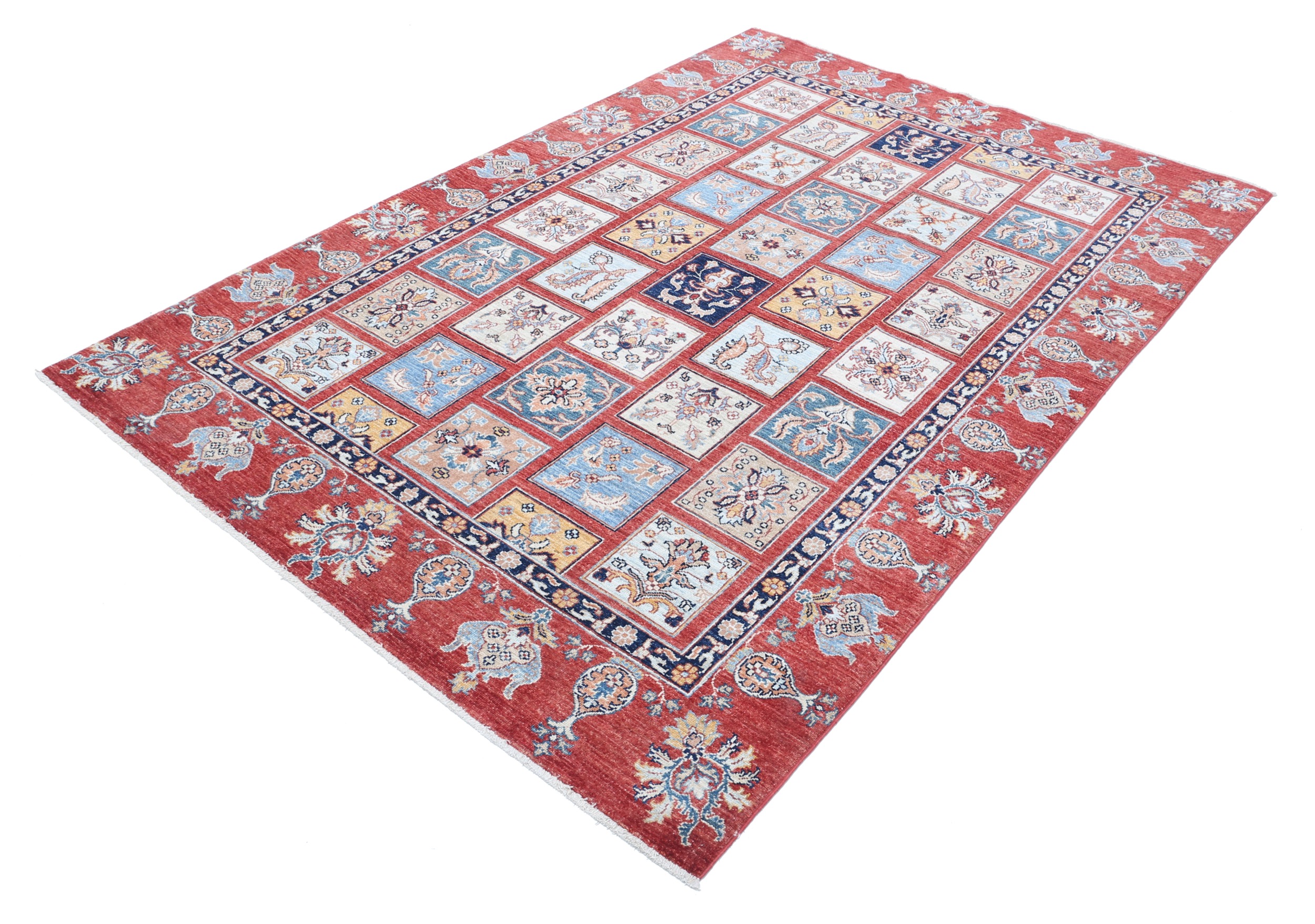 This 5’4″ x 7’9″ Oushak rug, hand-knotted in Afghan / Pakistan, features a panel design. Crafted with approx. 156 kpsi, its field color is Red with a Red border. The rug has a low medium pile 1/4″-1/3″ and a 100% wool pile, in excellent & washed condition.