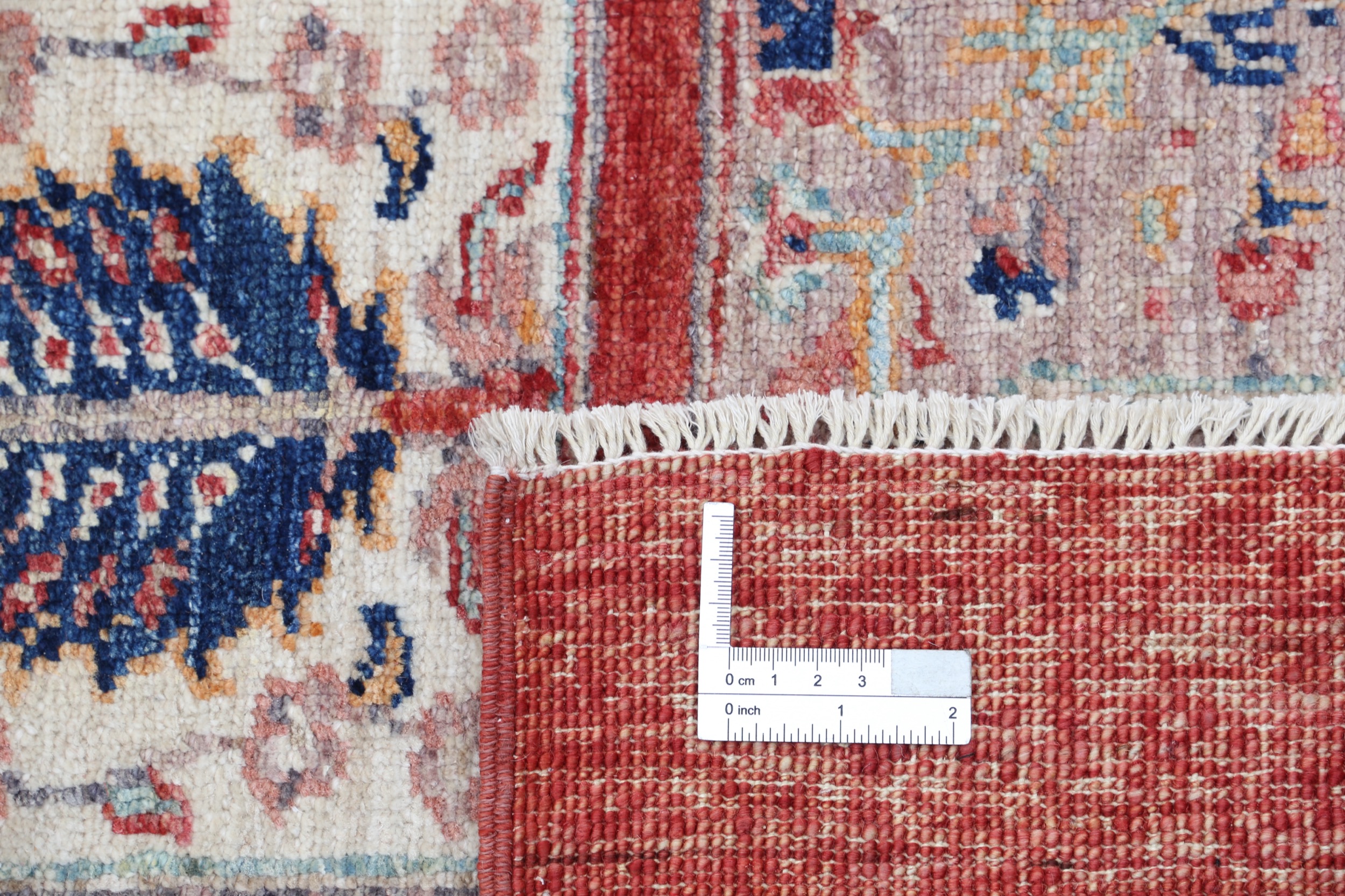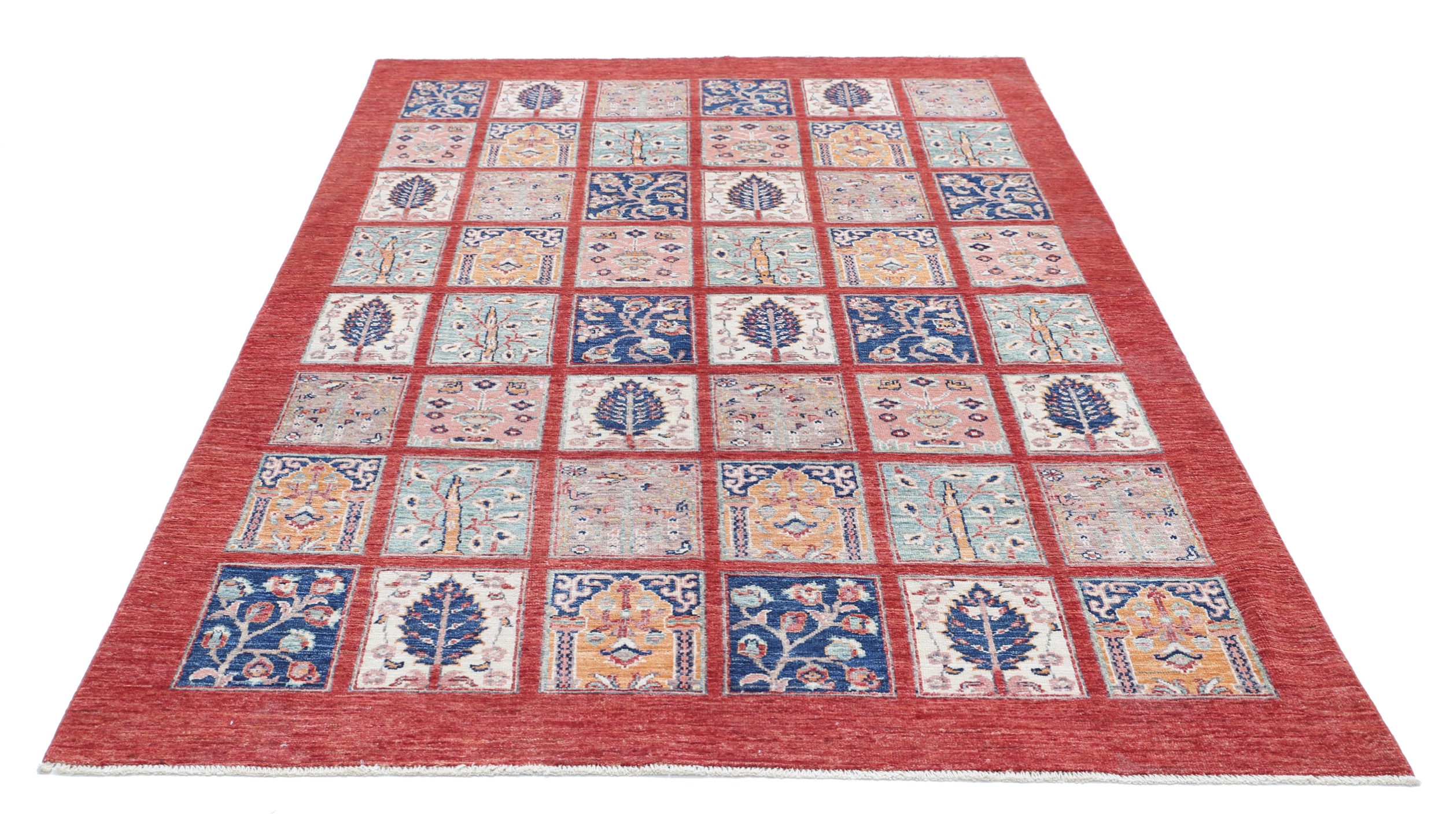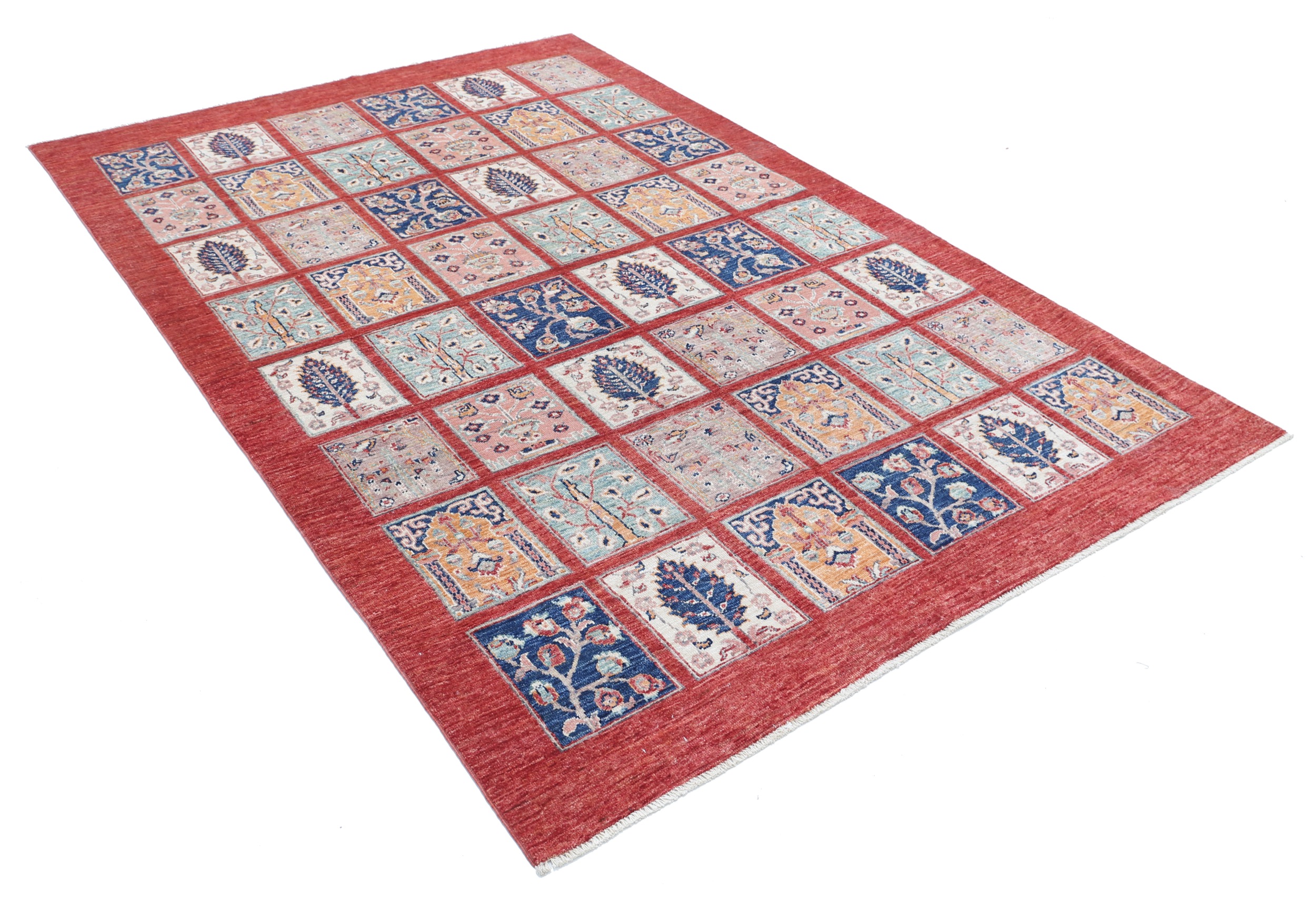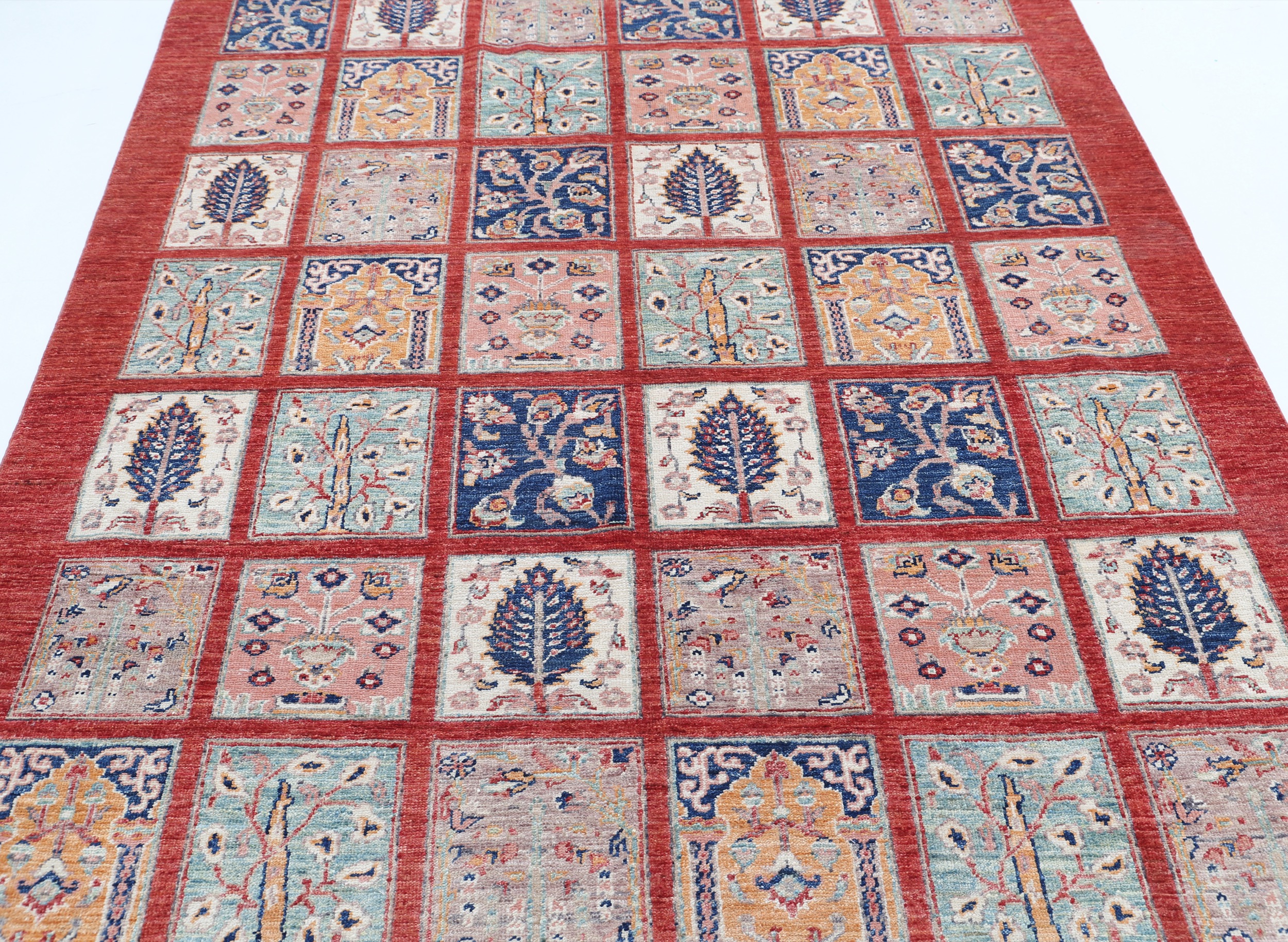 This 5’5″ x 8′ Oushak rug, hand-knotted in Afghan / Pakistan, features a panel design. Crafted with approx. 156 kpsi, its field color is Red with a Red border. The rug has a low medium pile 1/4″-1/3″ and a 100% wool pile, in excellent & washed condition.