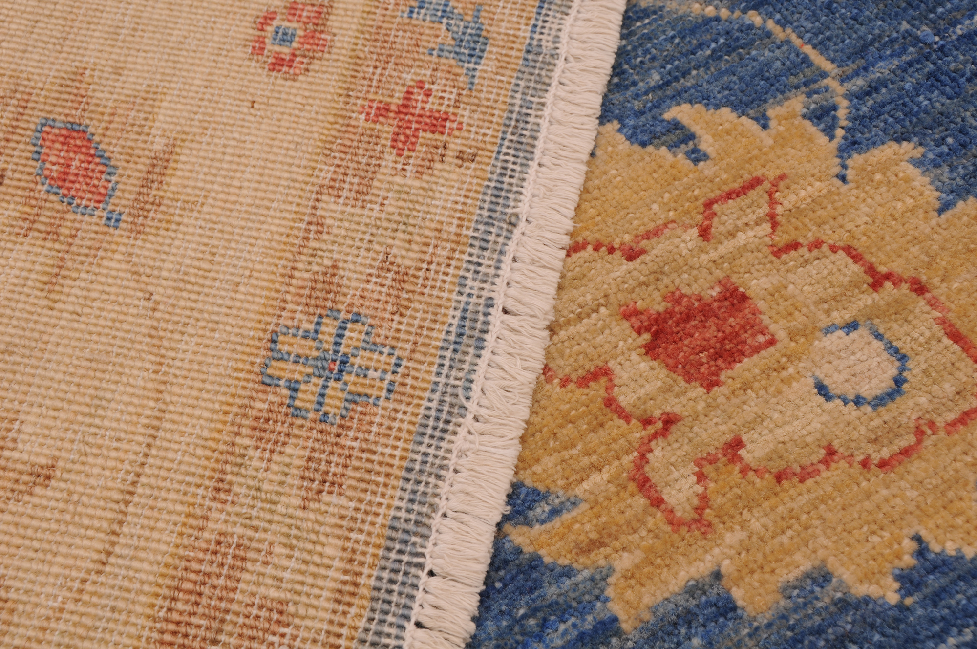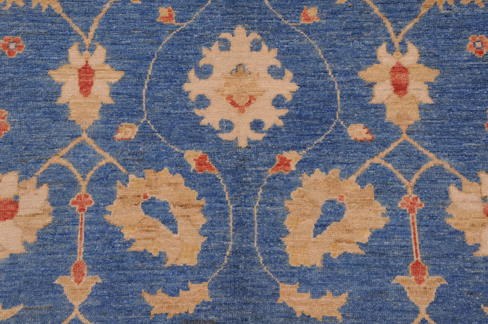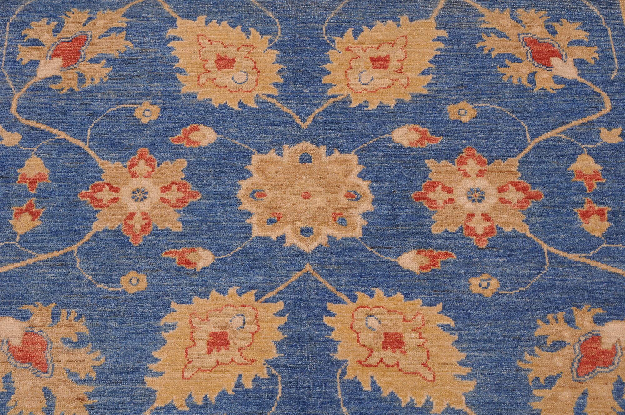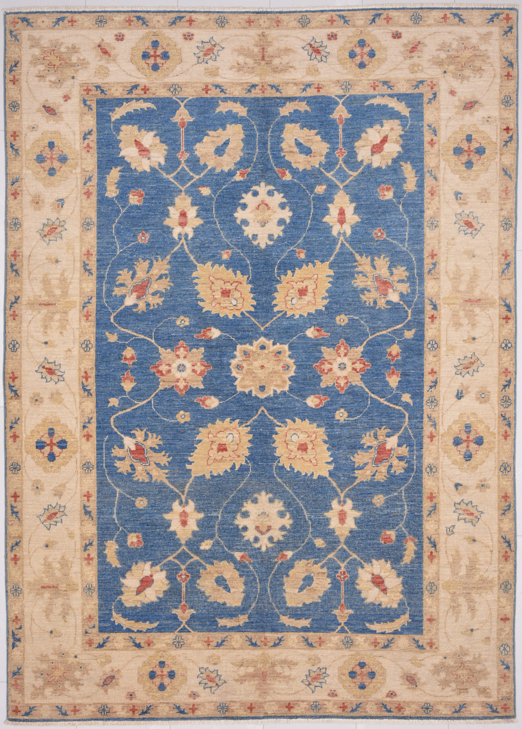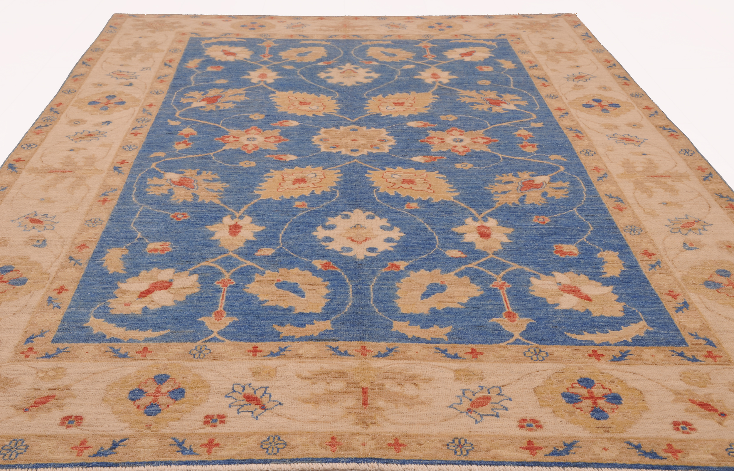 This 5’6″ x 7’9″ Oushak rug, hand-knotted in Afghan / Pakistan, features a floral design. Crafted with approx. 156 kpsi, its field color is Blue with a Beige border. The rug has a low medium pile 1/4″-1/3″ and a 100% wool pile, in excellent & washed condition.