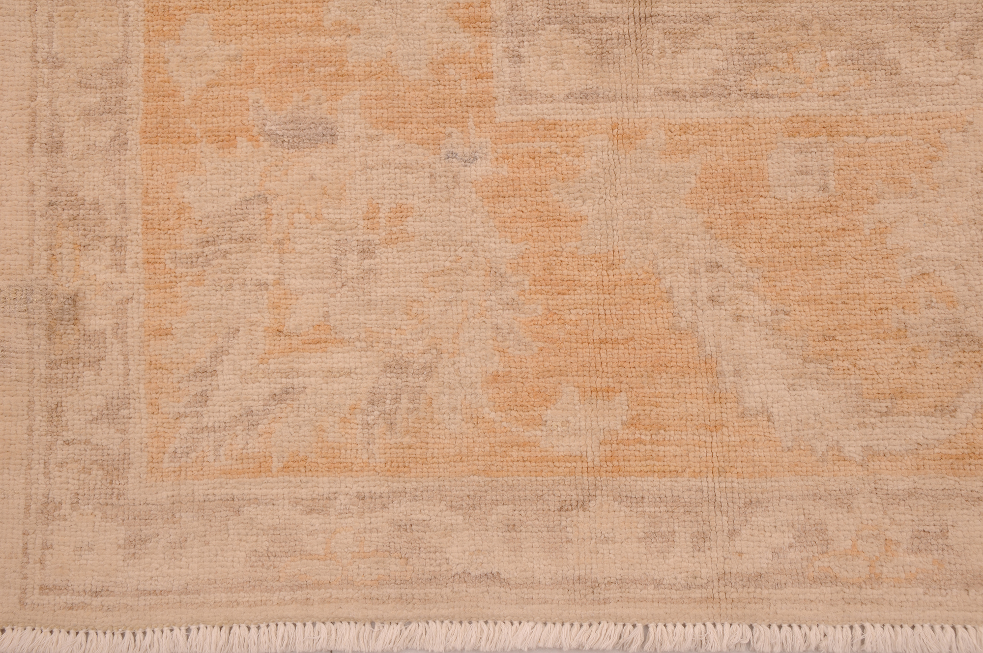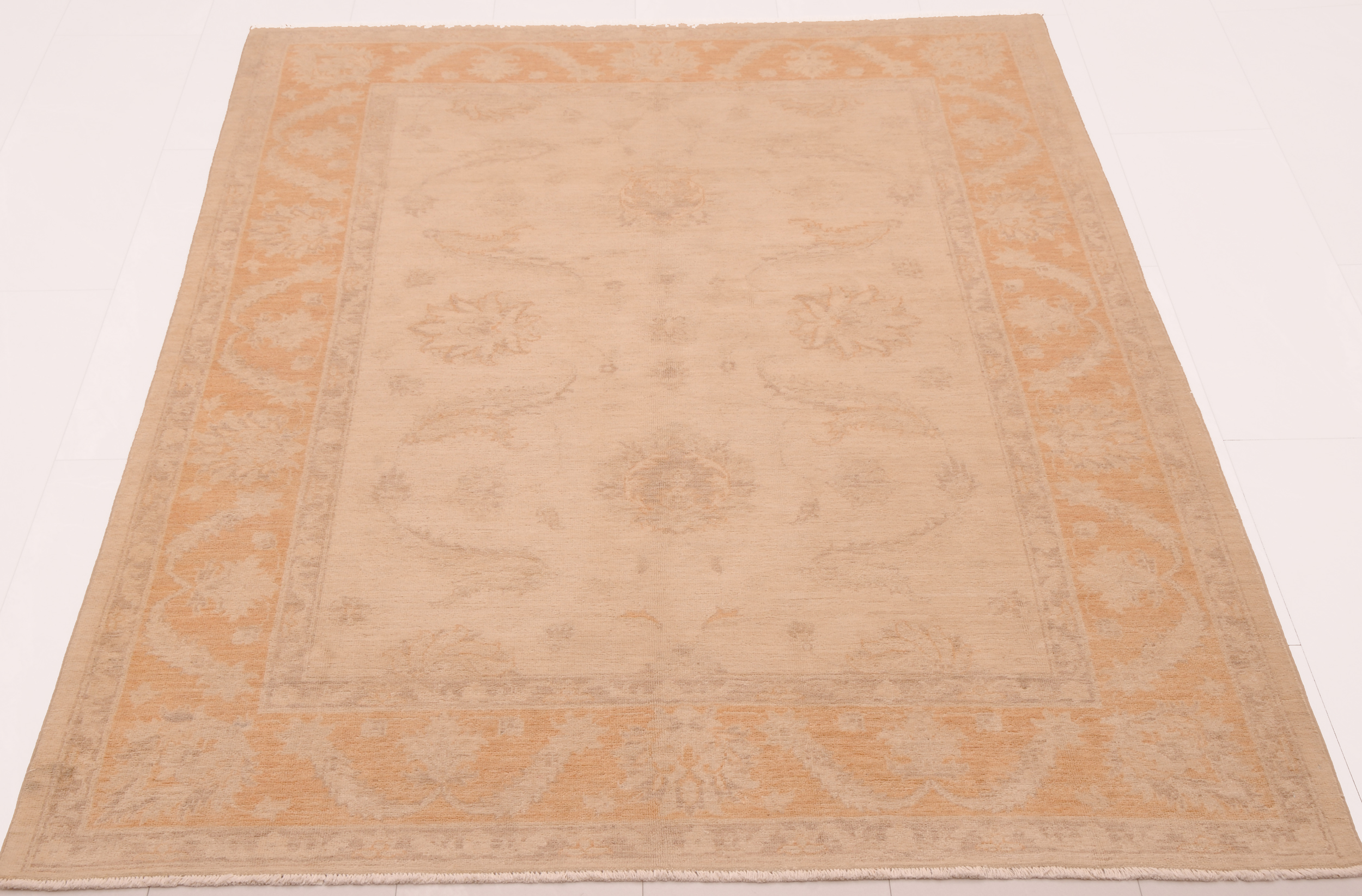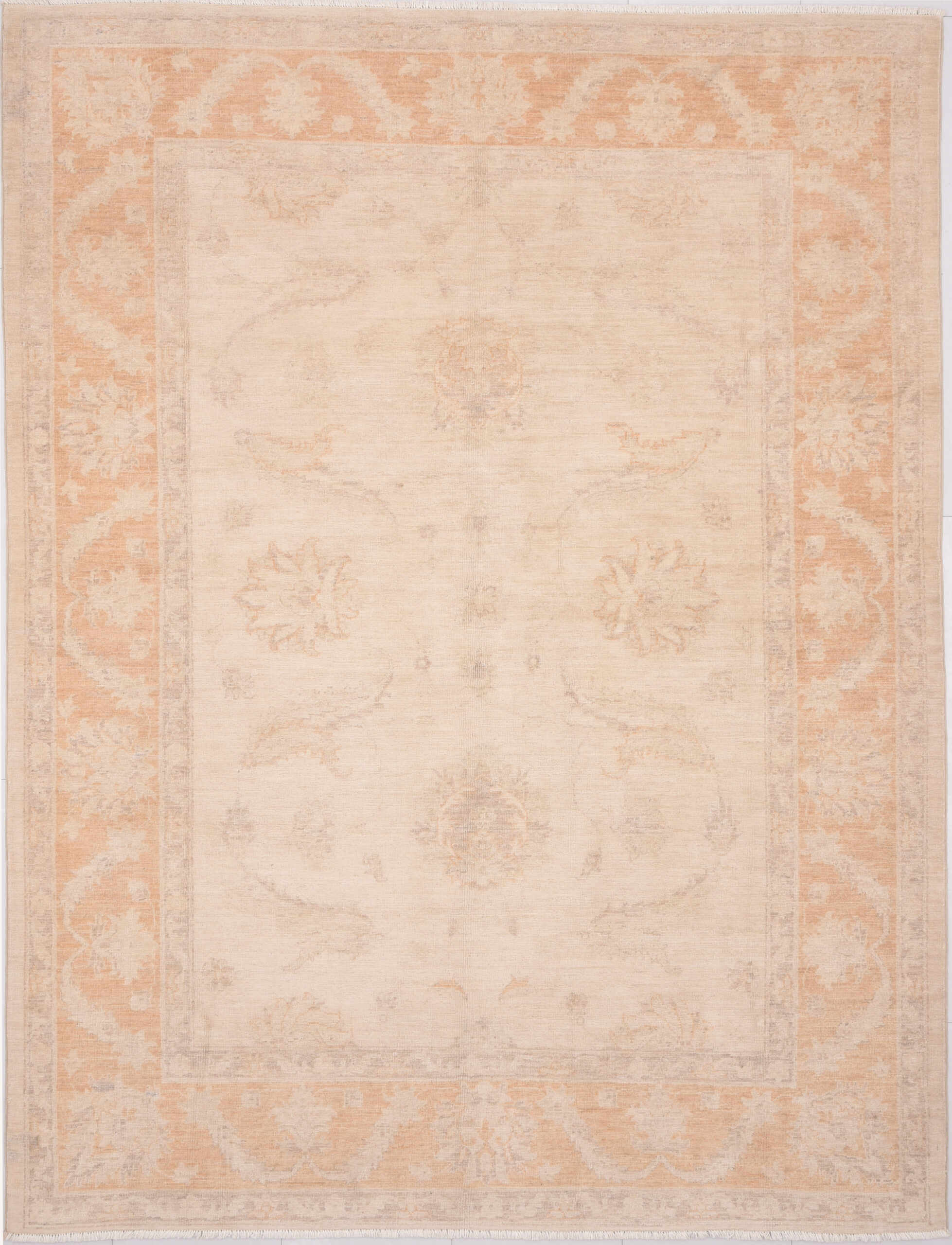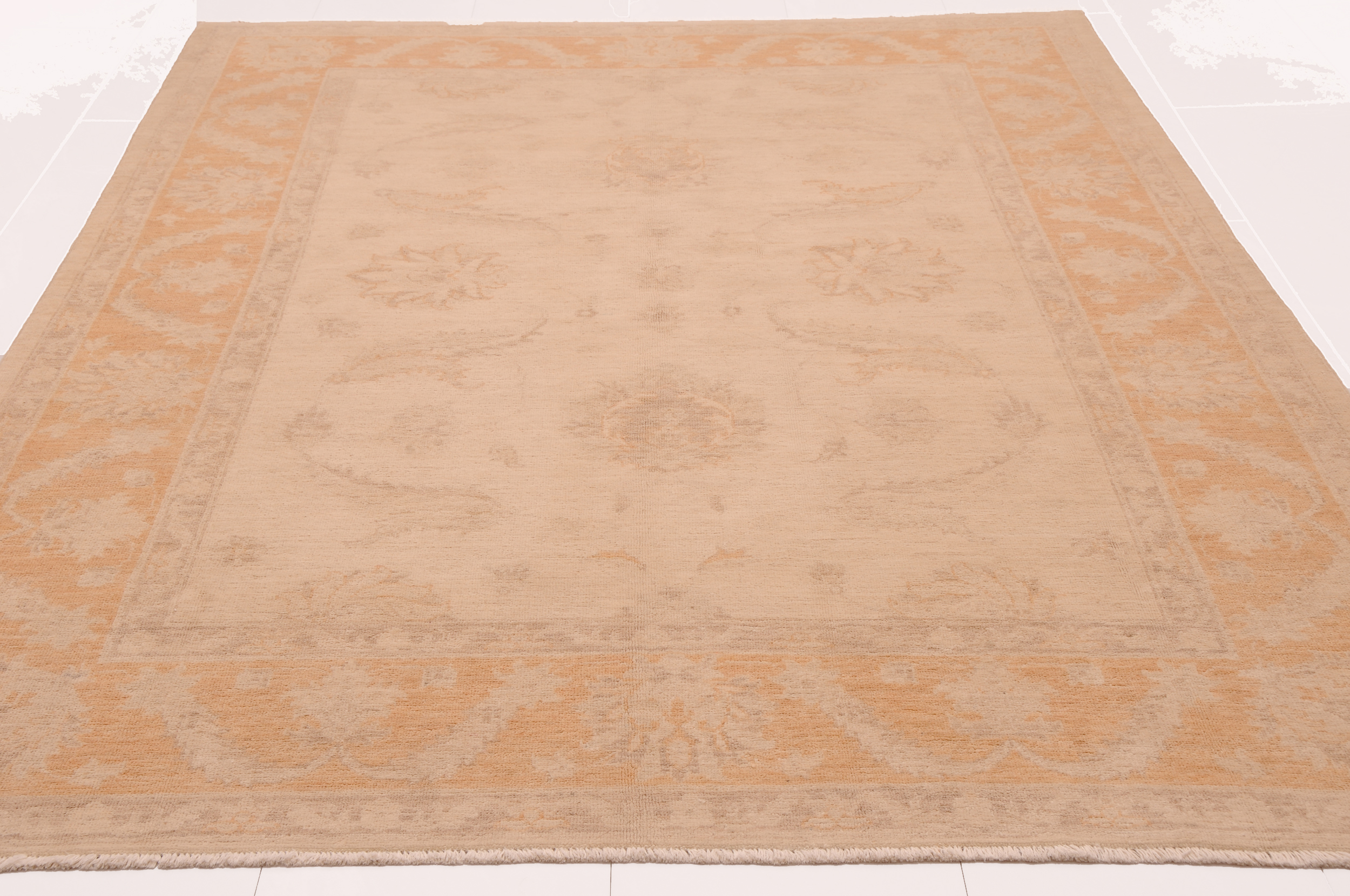 A stunning example of Oriental craftsmanship, this 5’7″ x 7’3″ Oushak rug is hand-knotted in Afghan / Pakistan. Its beige field and orange border frame a detailed floral design, known for its refined, traditional aesthetics. Durable and beautifully textured with a low medium pile 1/4″-1/3″ pile.