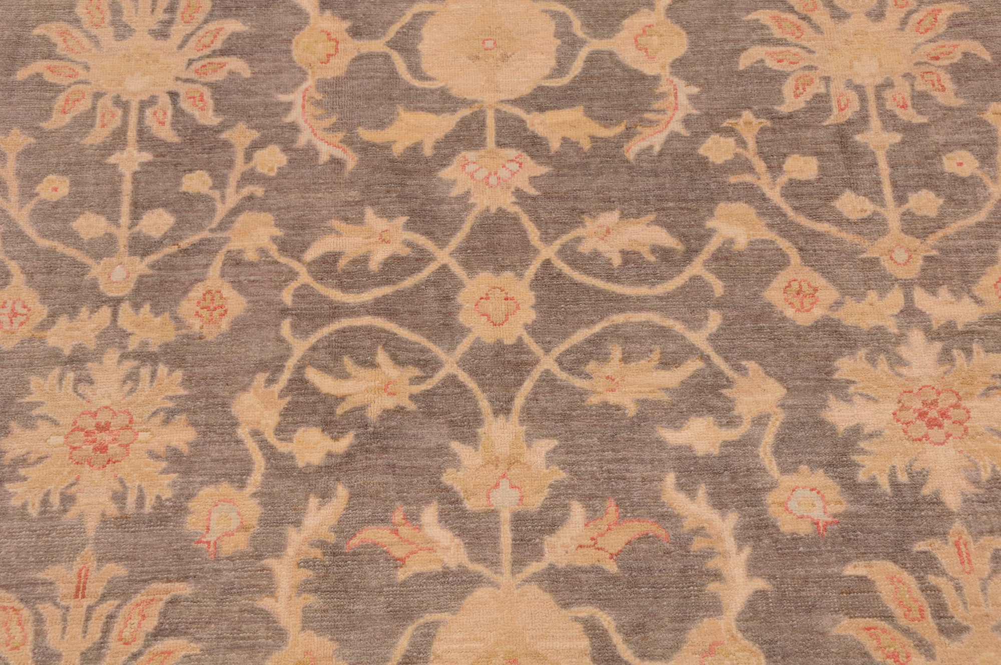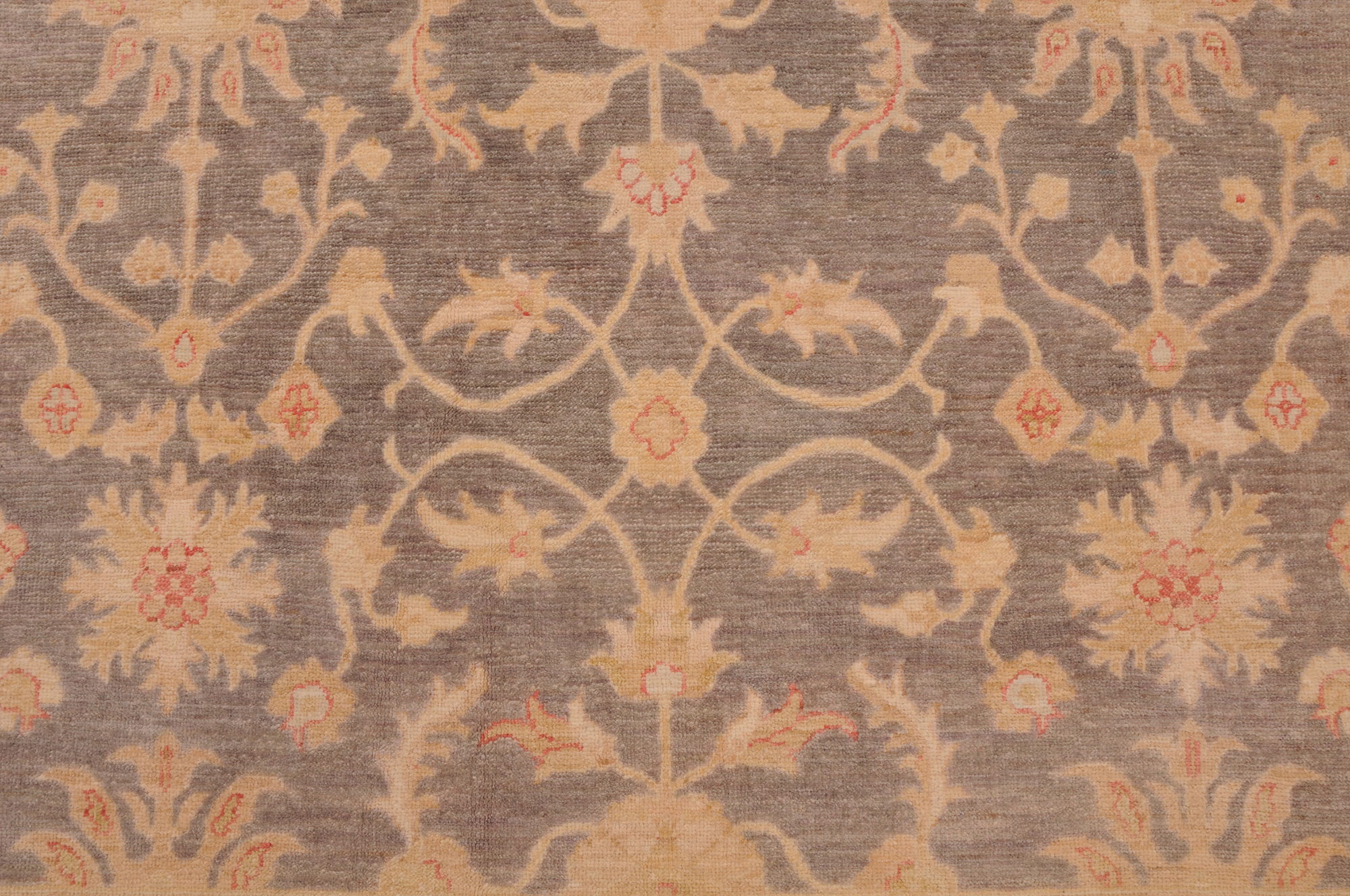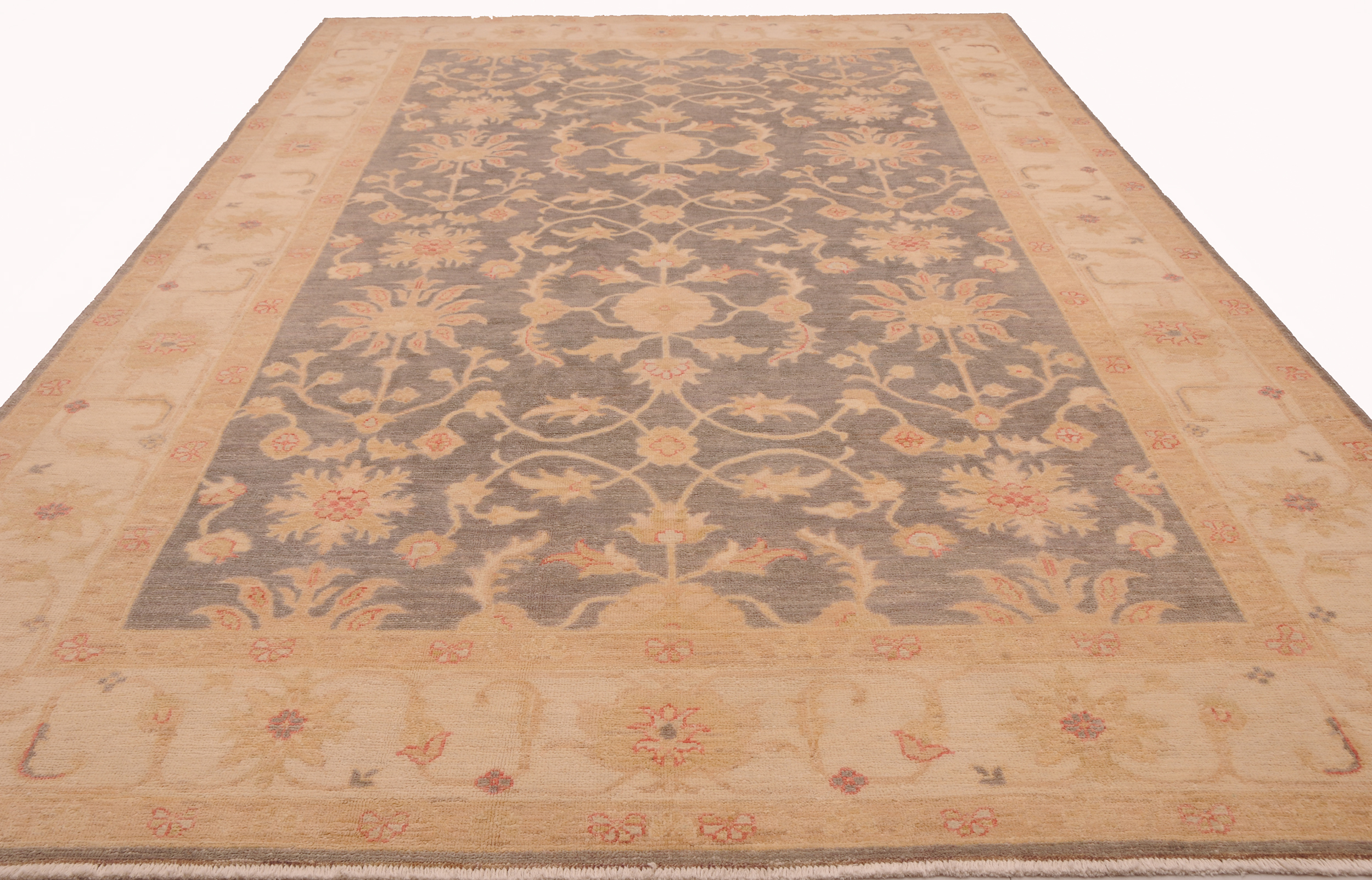 This 5’7″ x 8’8″ Oushak rug, hand-knotted in Afghan / Pakistan, features a floral design. Crafted with approx. 156 kpsi, its field color is Grey with a Beige border. The rug has a low medium pile 1/4″-1/3″ and a 100% wool pile, in excellent & washed condition.