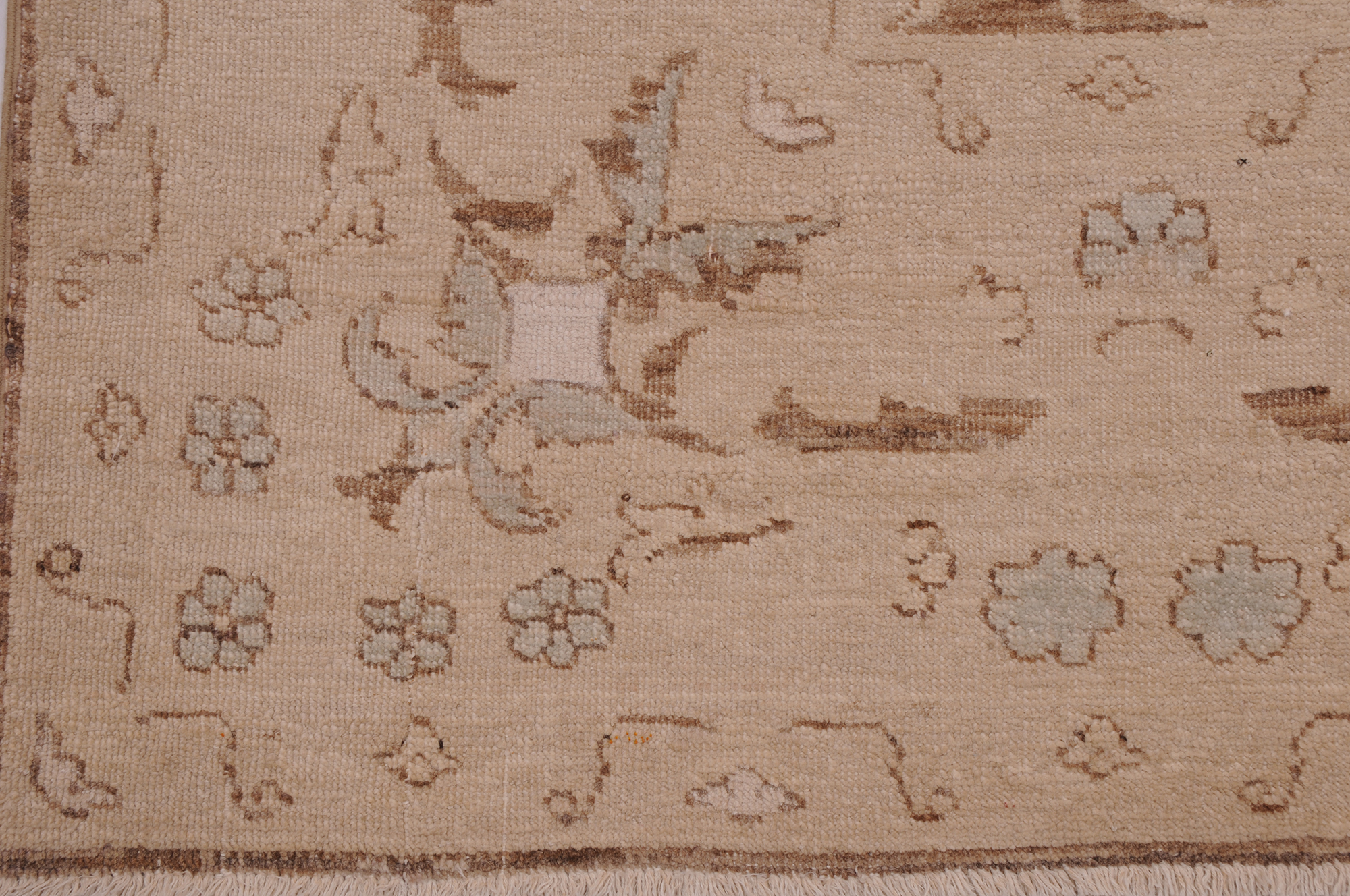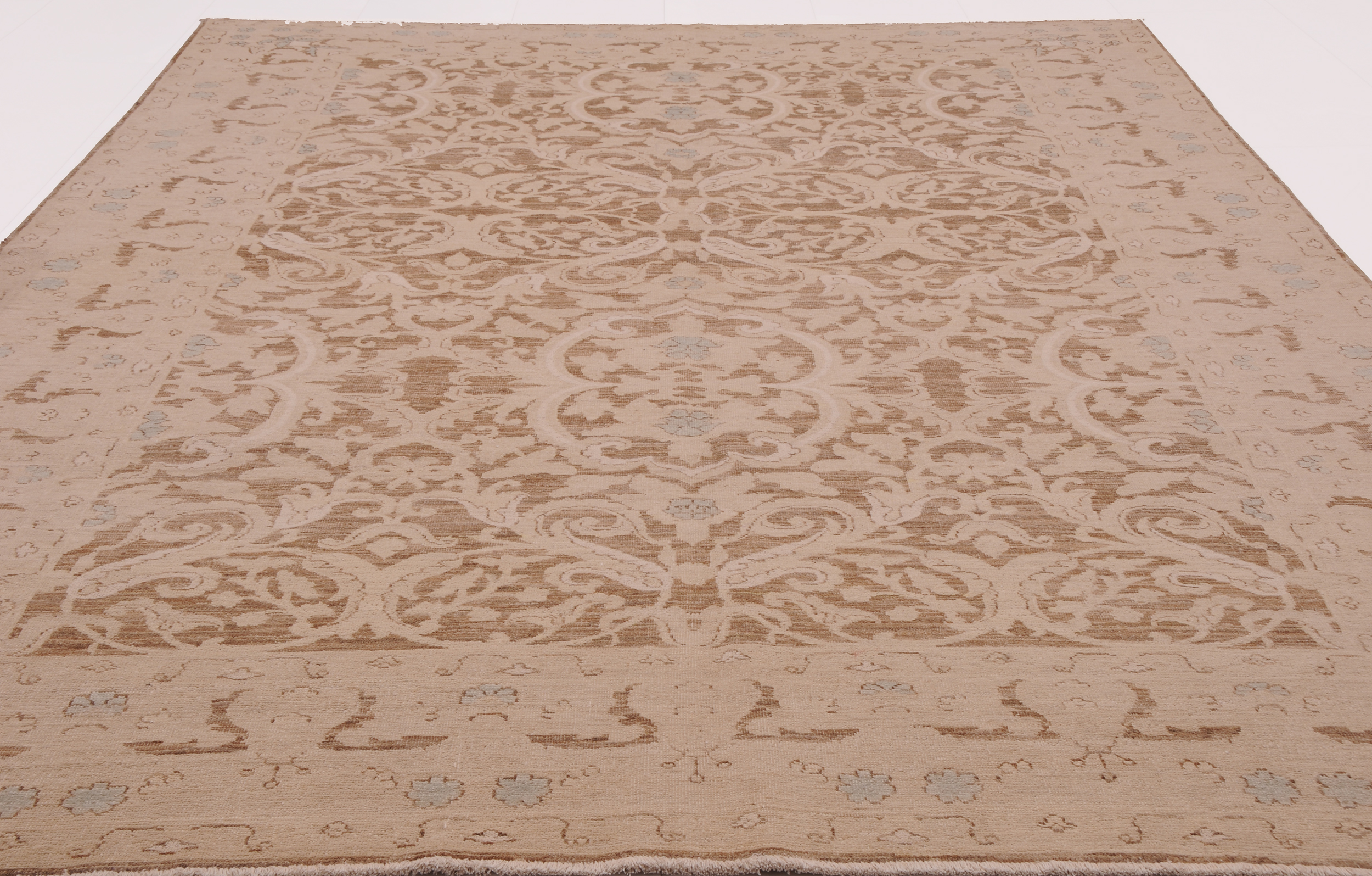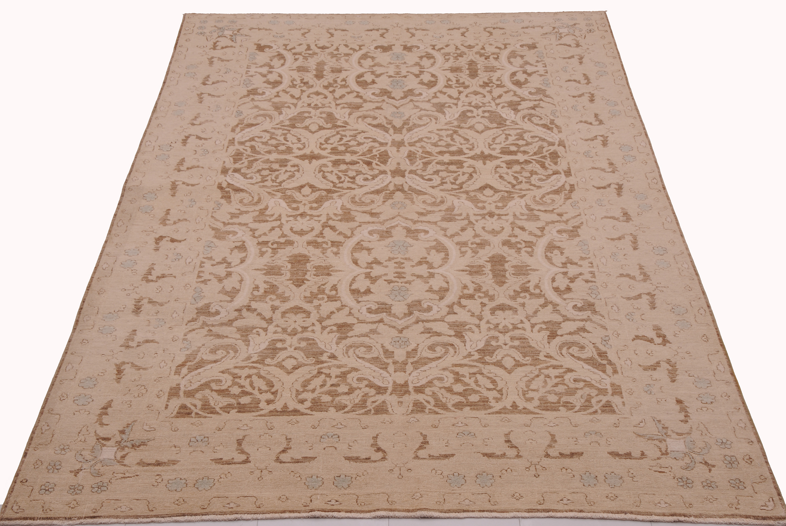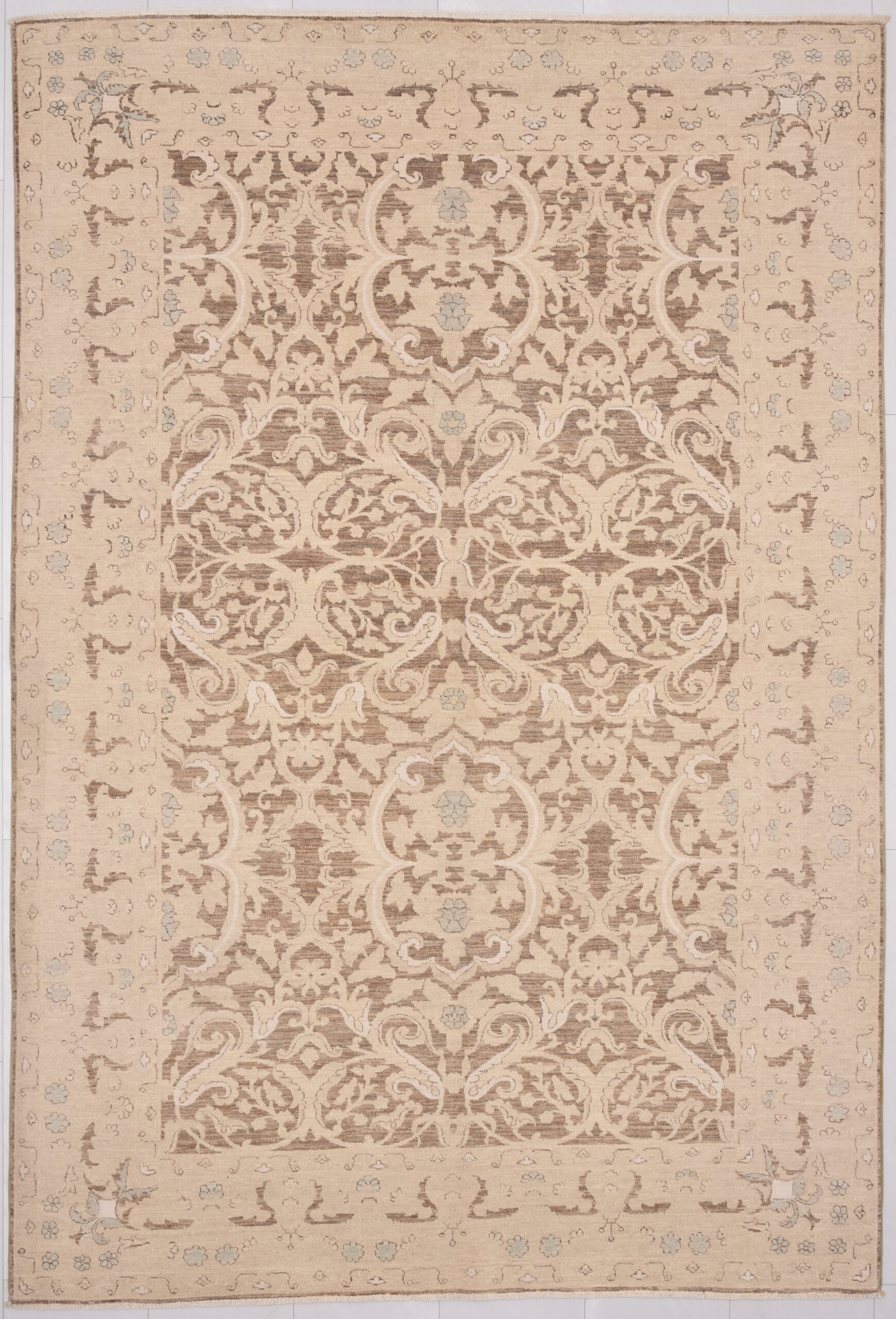 This exquisite 6′ x 8’9″ Oushak rug from Afghan / Pakistan showcases a timeless floral pattern. Hand-knotted with 100% wool on a cotton foundation, it features a brown field and beige border. The floral design adds an elegant character to any space.