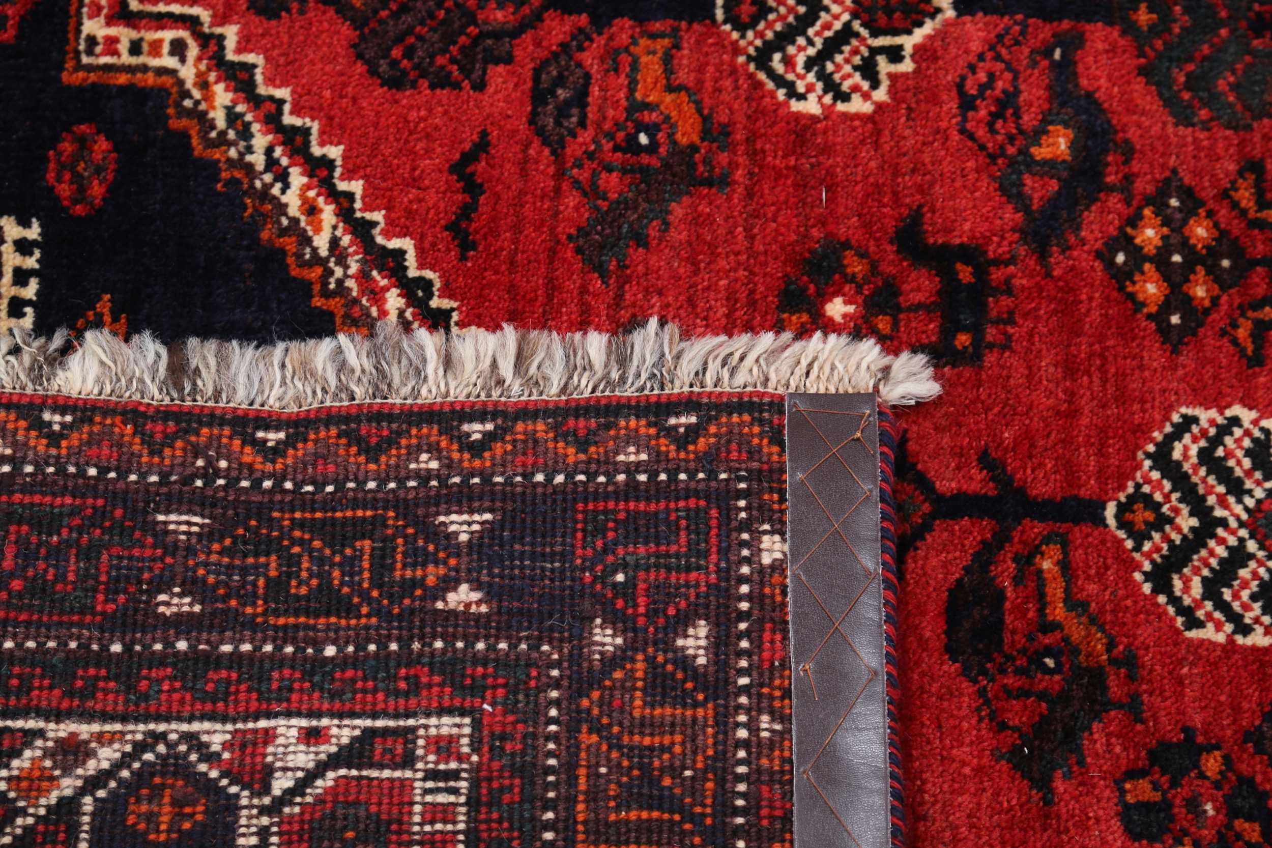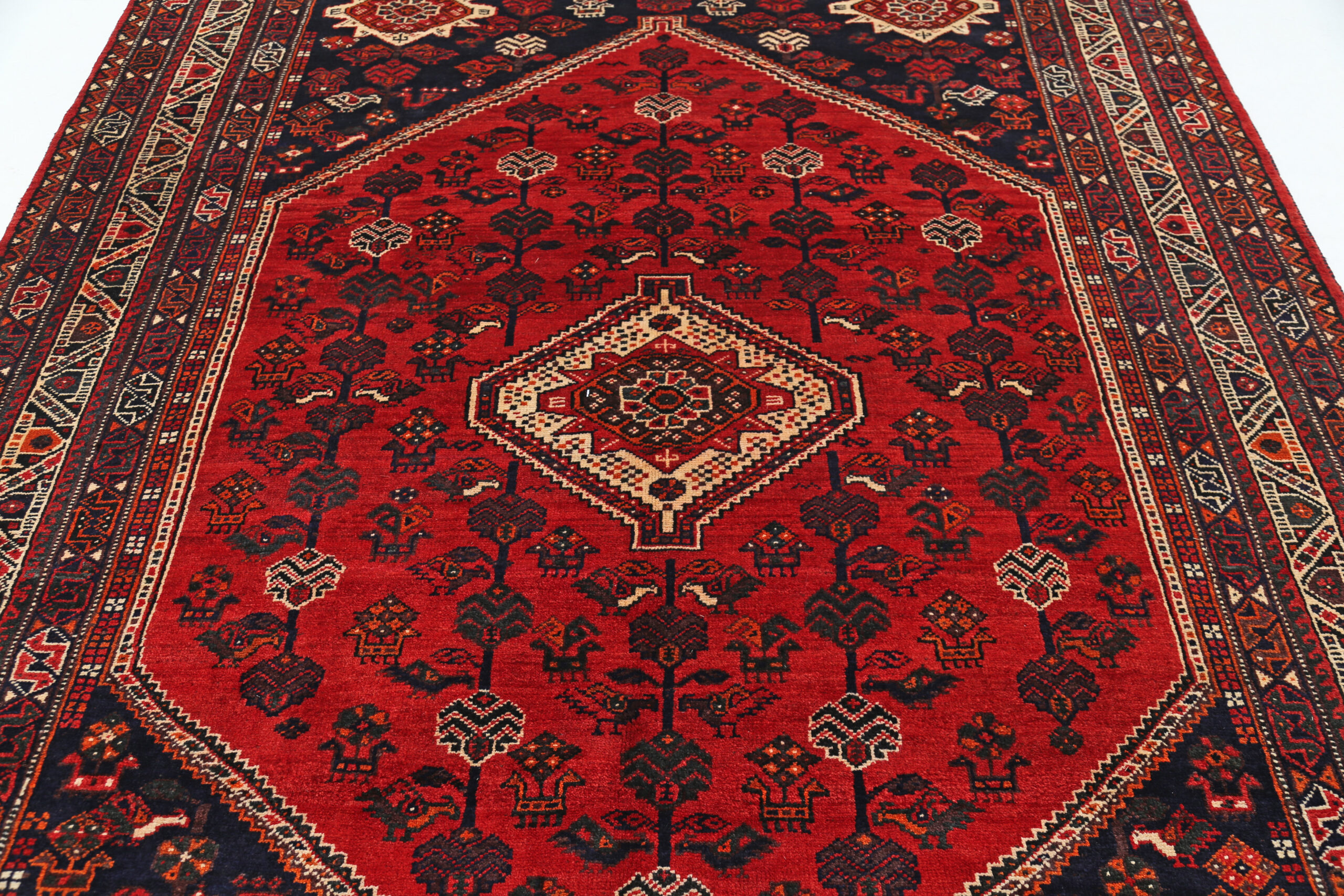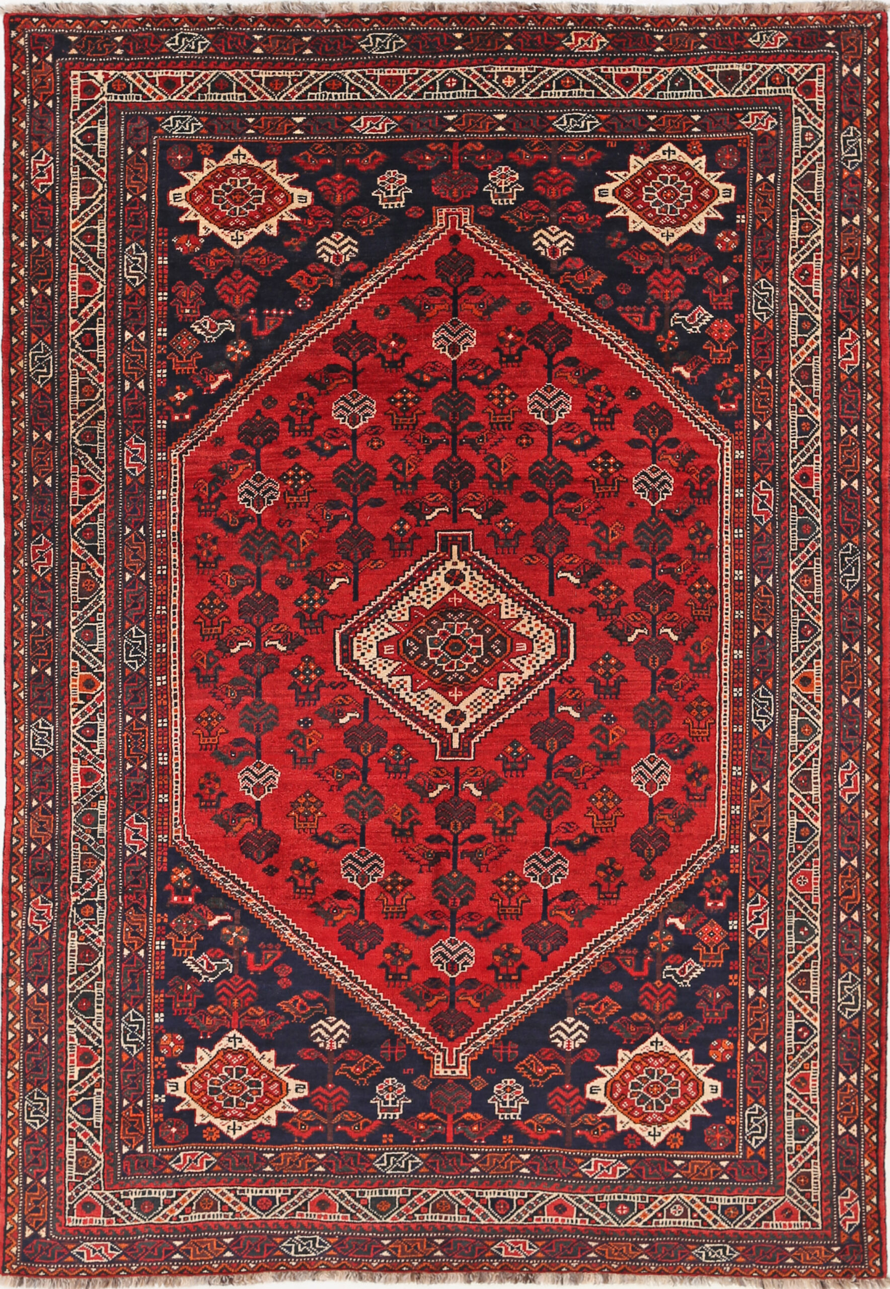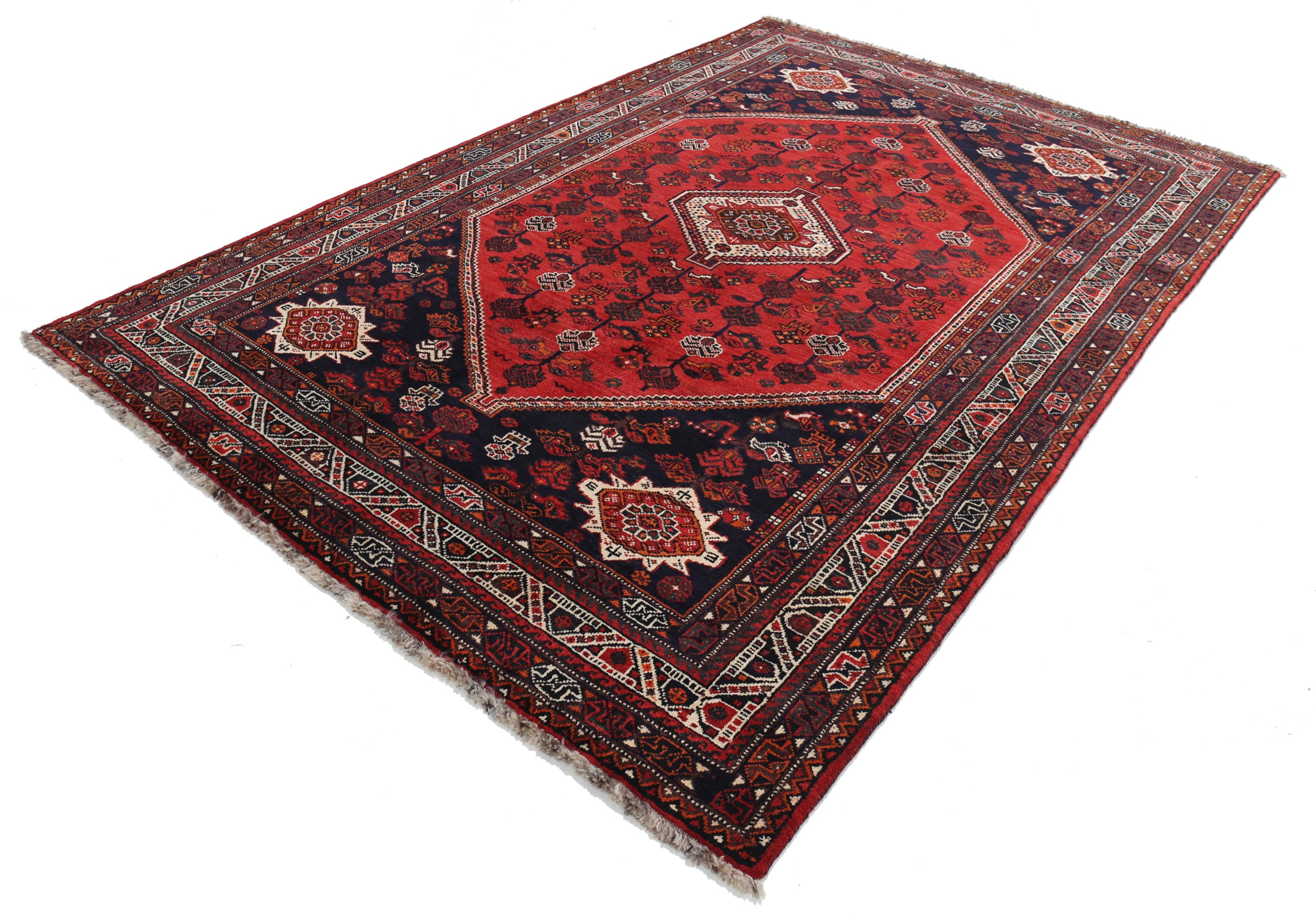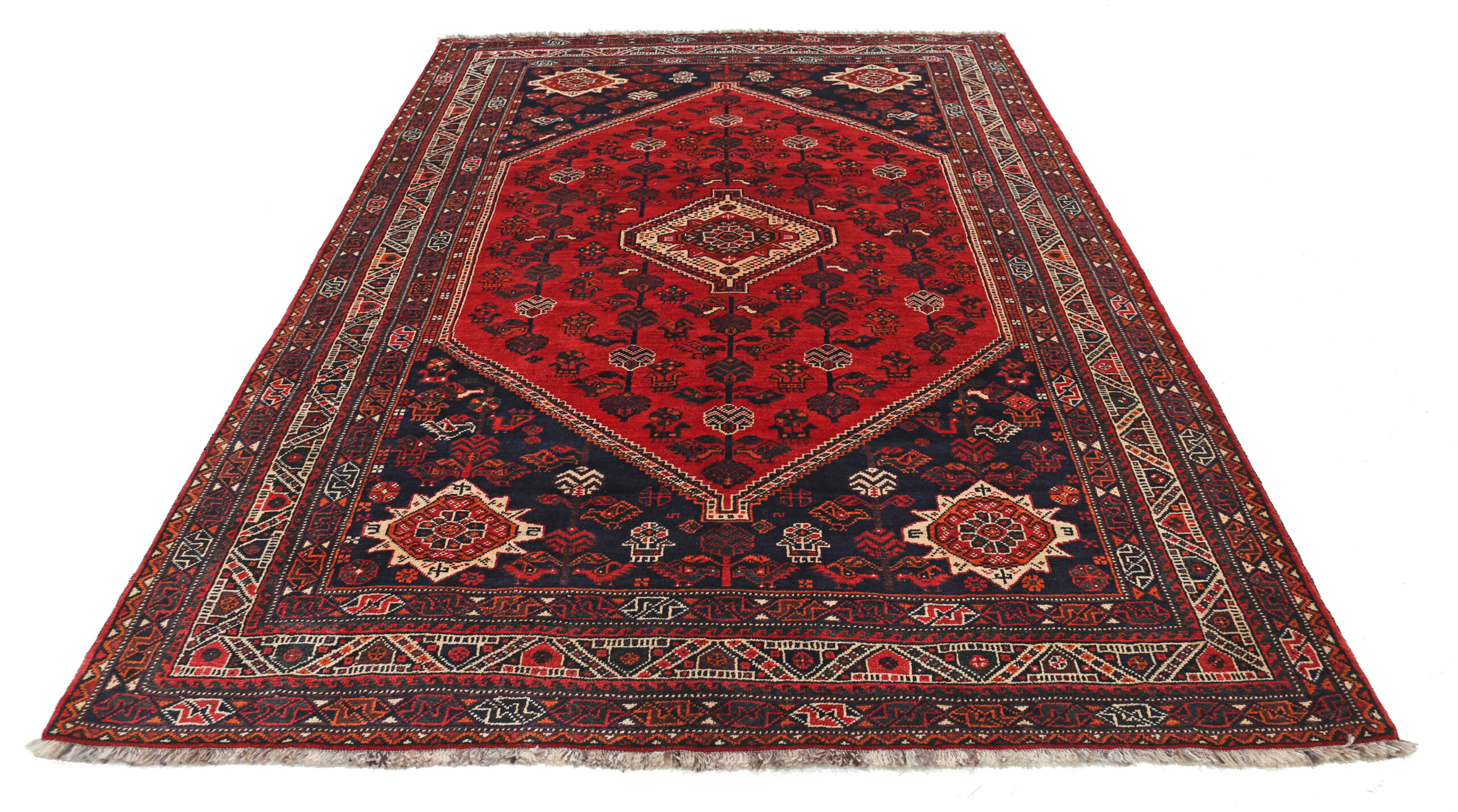 This Persian rug from Shiraz features a geometrical design in beige, black, orange, and green. Made of 100% wool with a medium pile of 1/3″-3/8″, it has an approximate knot density of 120 KPSI. Aged 0-10 years, it measures 6’10” x 10′.