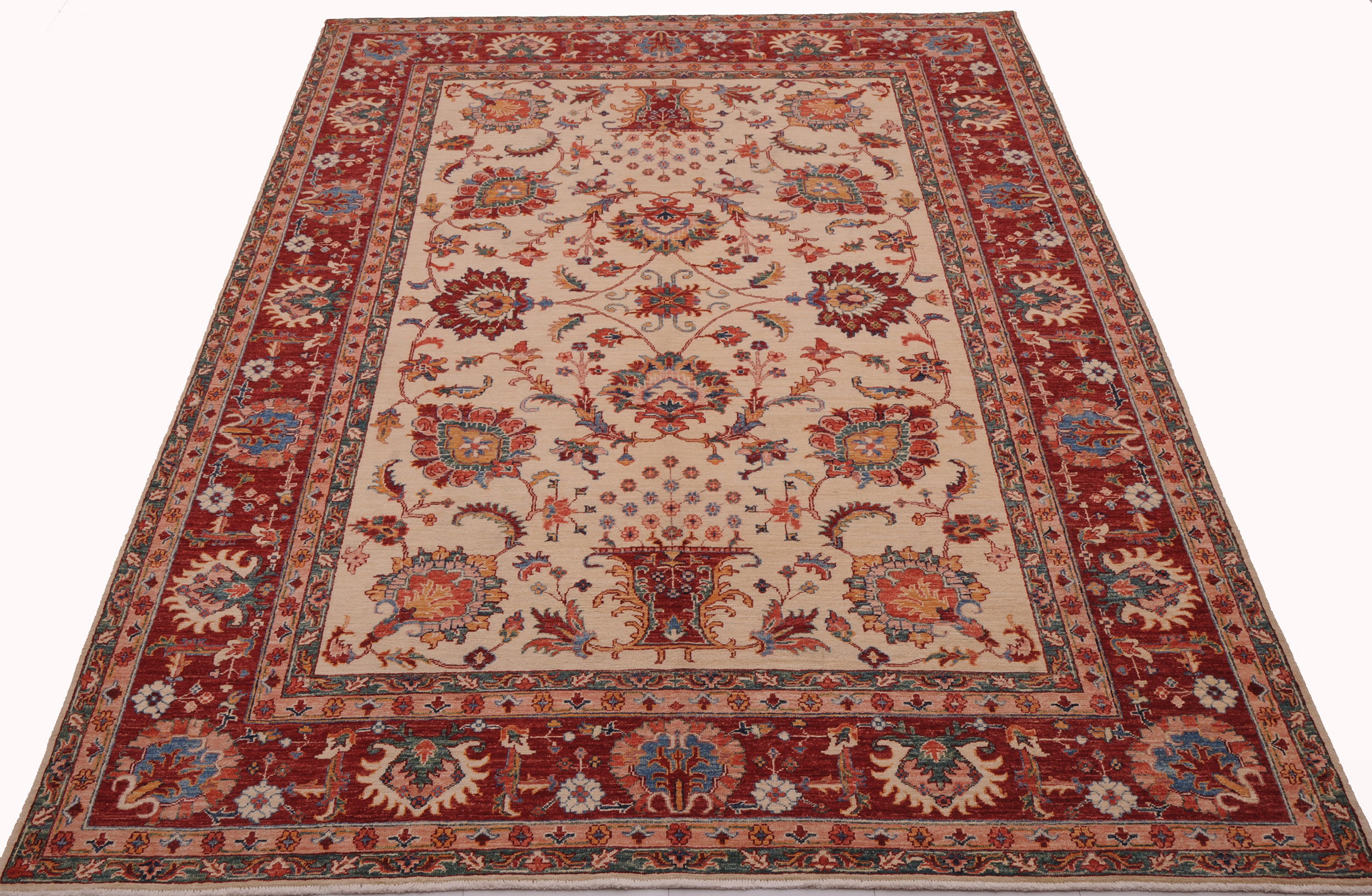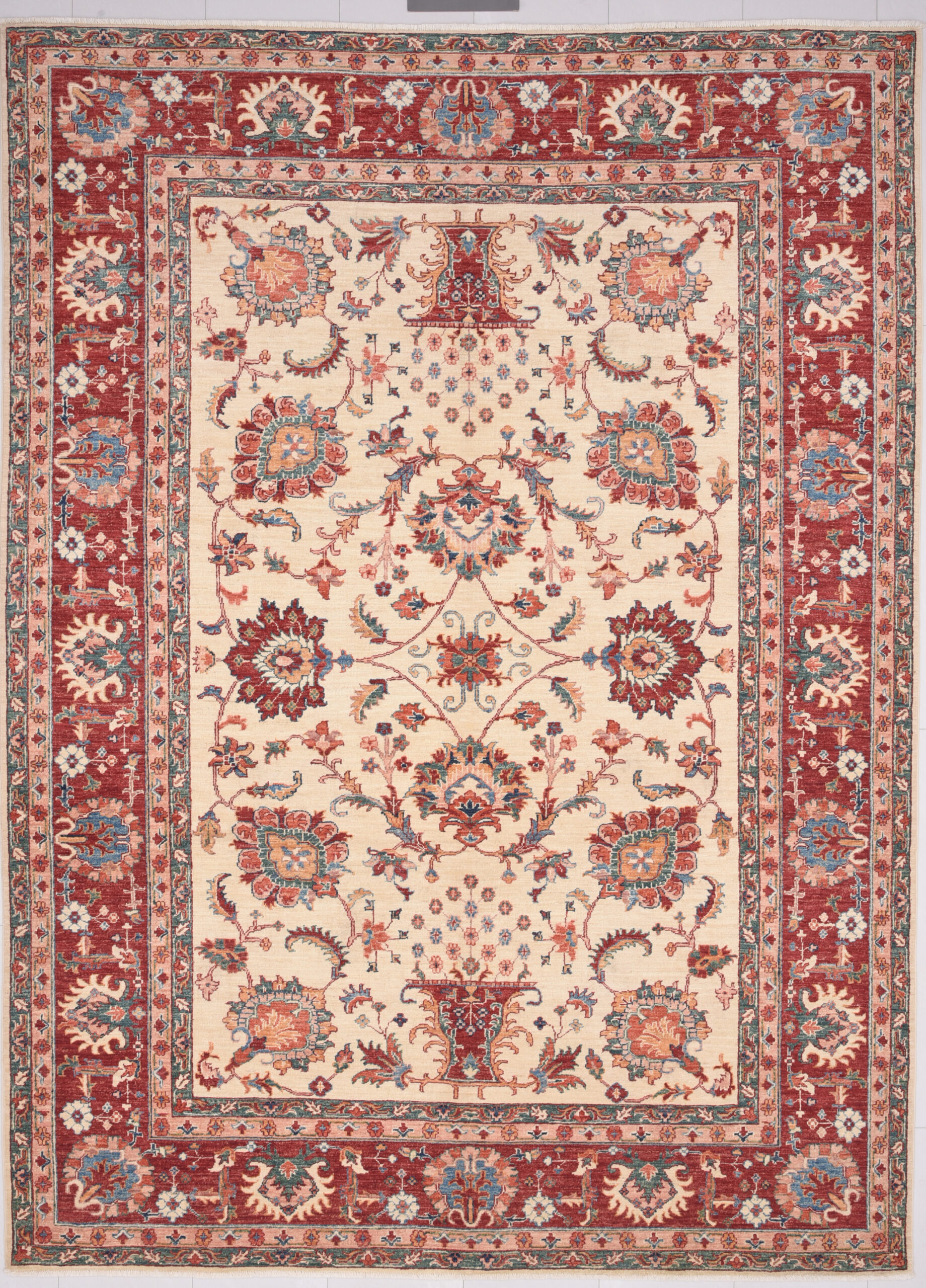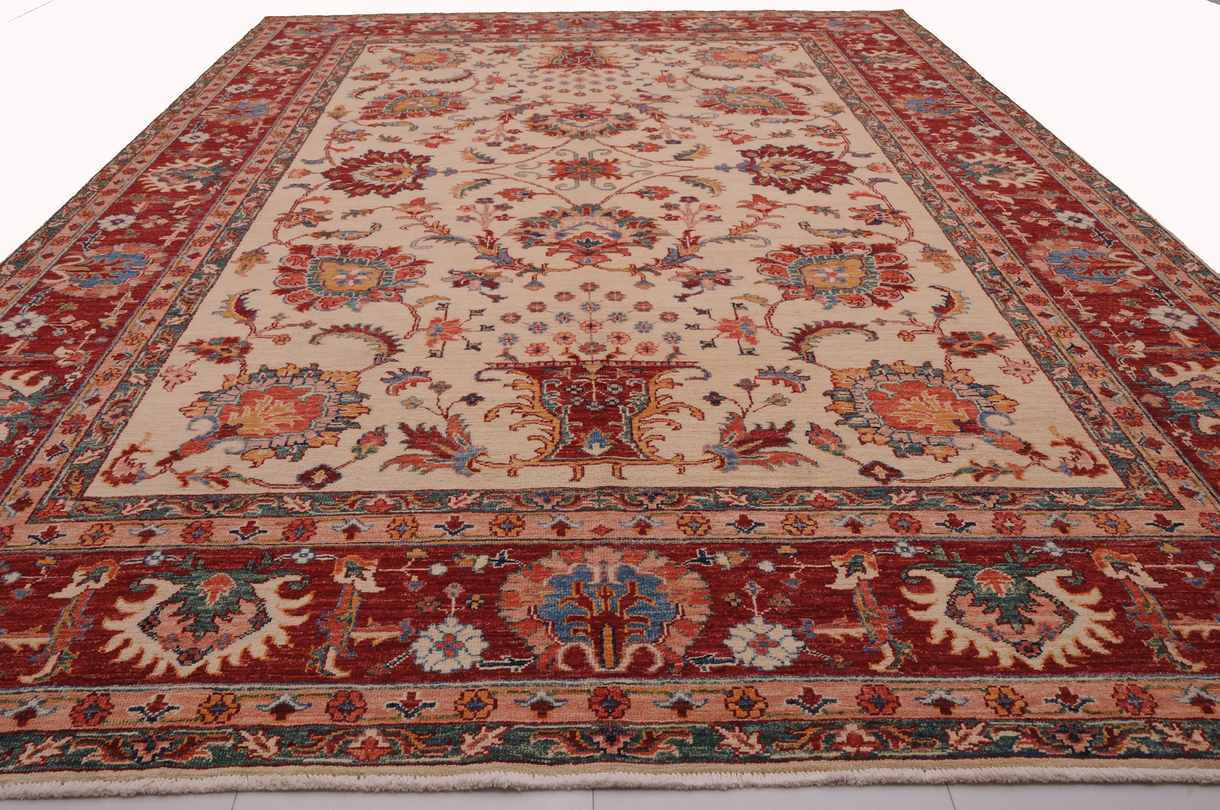 This 6’10” x 9’3″ Oushak rug, hand-knotted in Afghan / Pakistan, features a floral design. Crafted with approx. 156 kpsi, its field color is Beige with a Red border. The rug has a low medium pile 1/4″-1/3″ and a 100% wool pile, in excellent & washed condition.