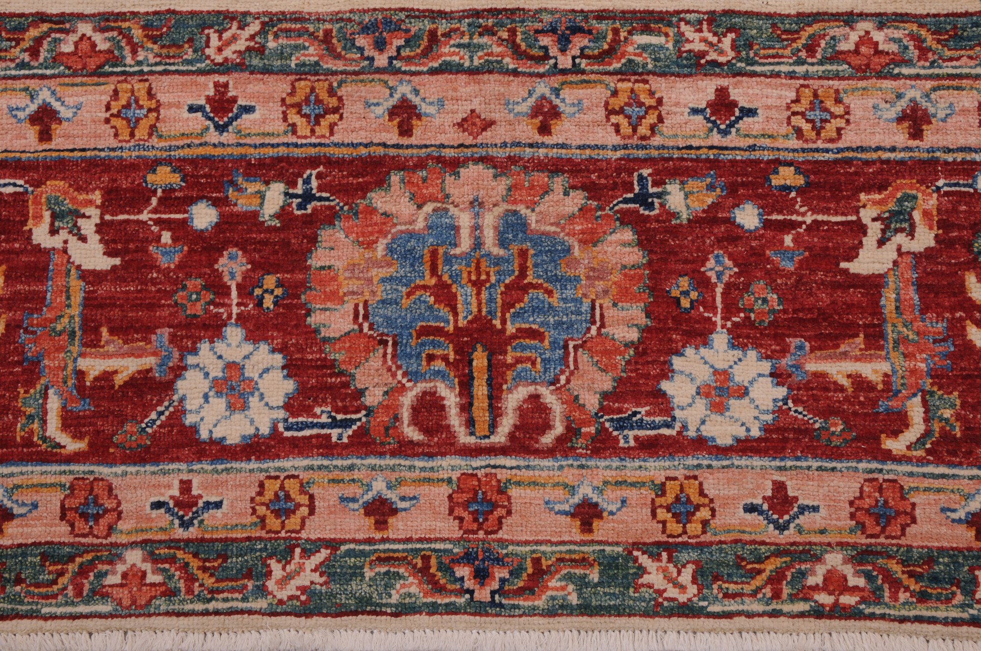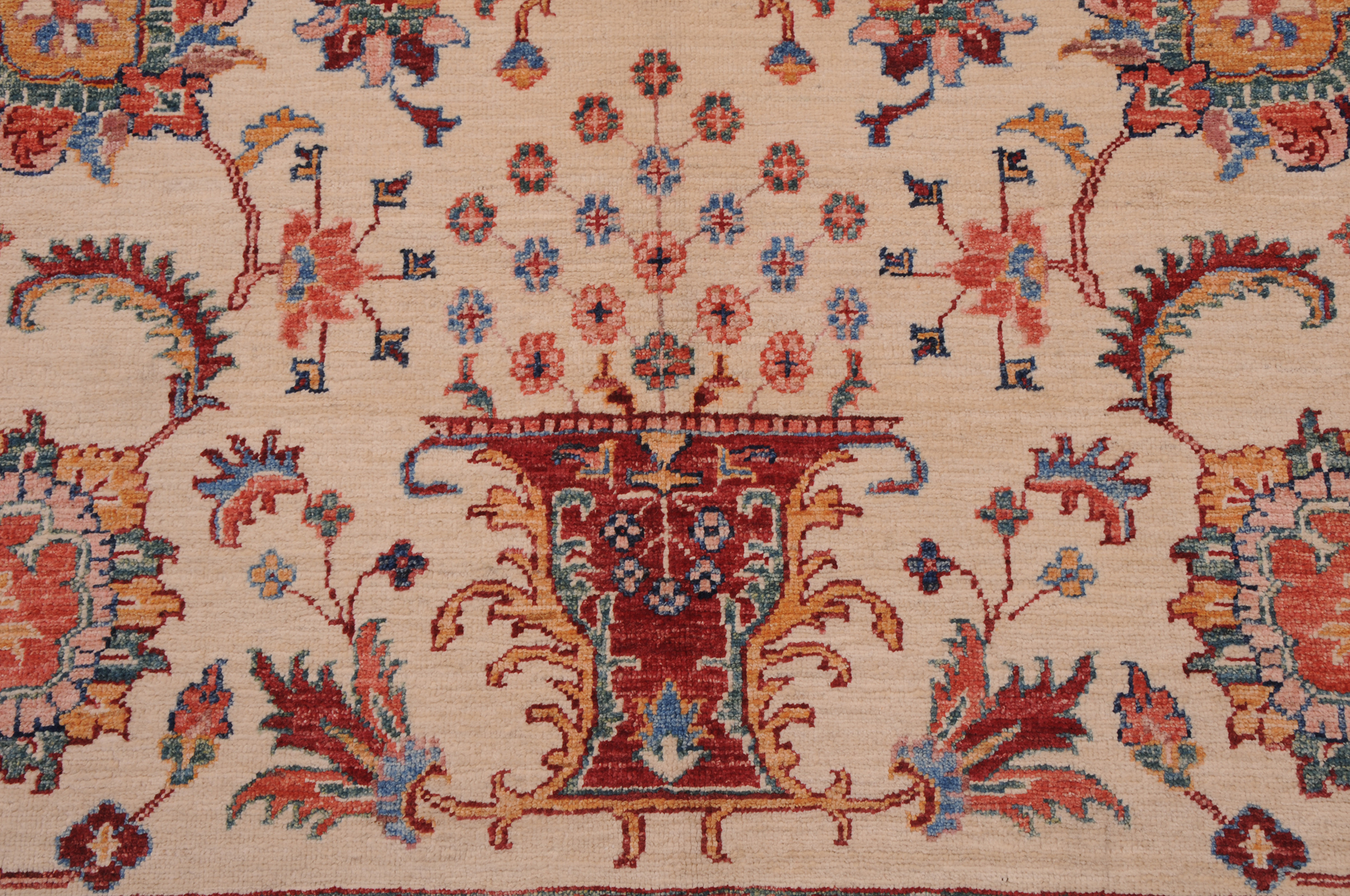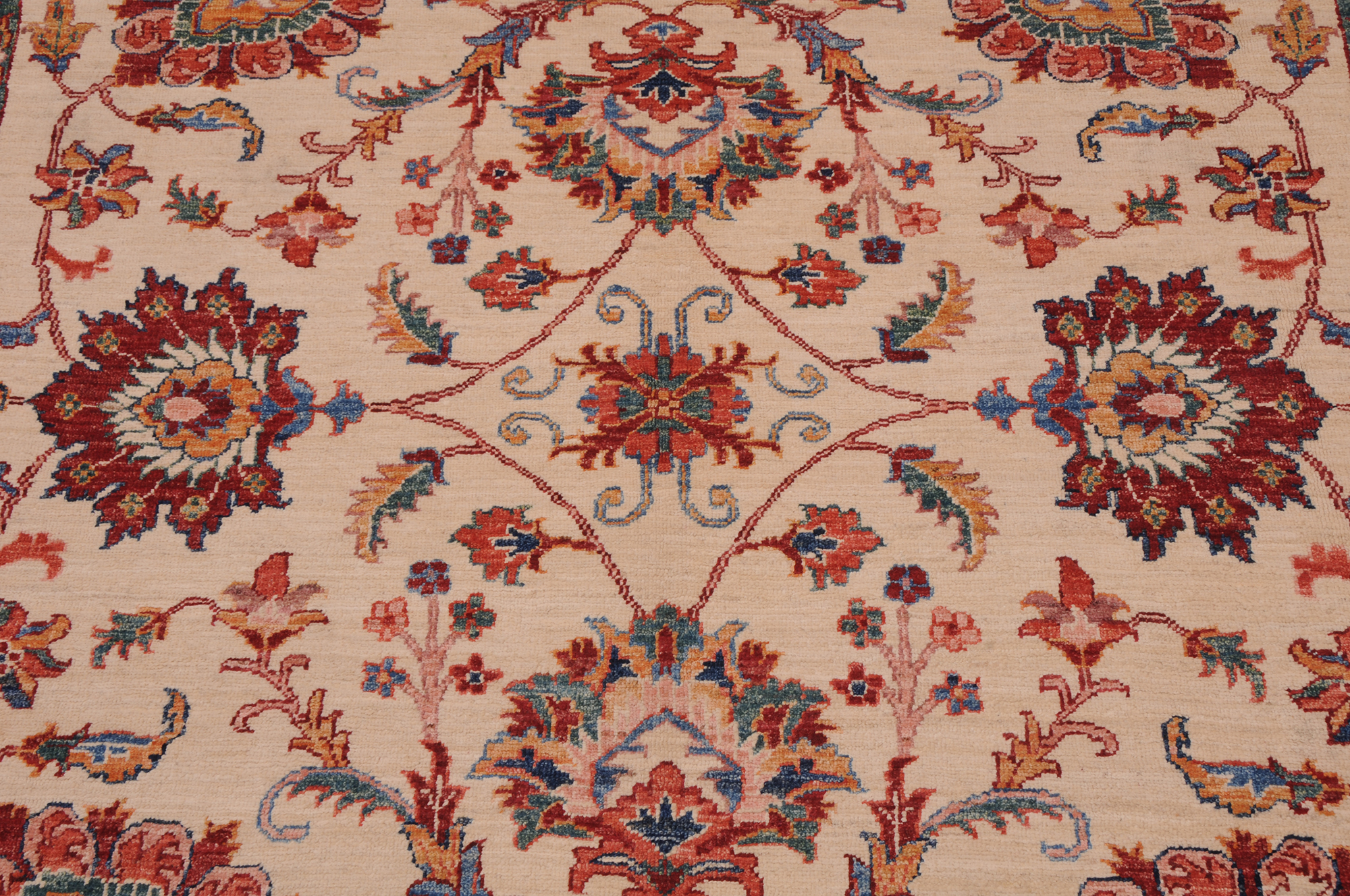 This 6’10” x 9’3″ Oushak rug, hand-knotted in Afghan / Pakistan, features a floral design. Crafted with approx. 156 kpsi, its field color is Beige with a Red border. The rug has a low medium pile 1/4″-1/3″ and a 100% wool pile, in excellent & washed condition.
