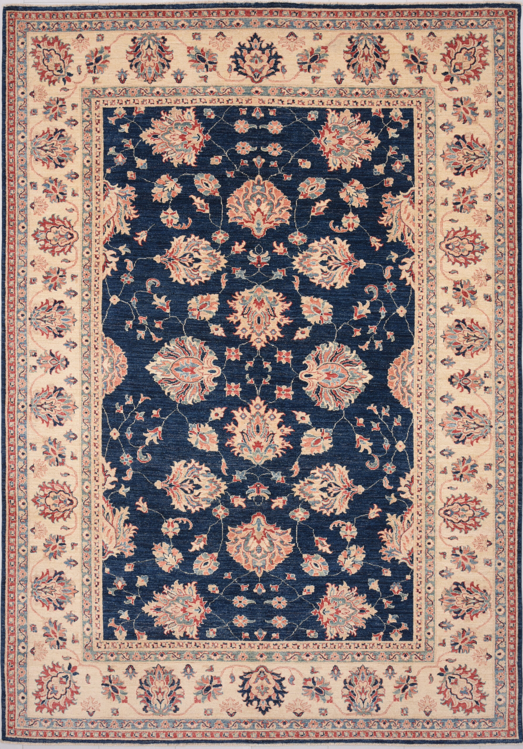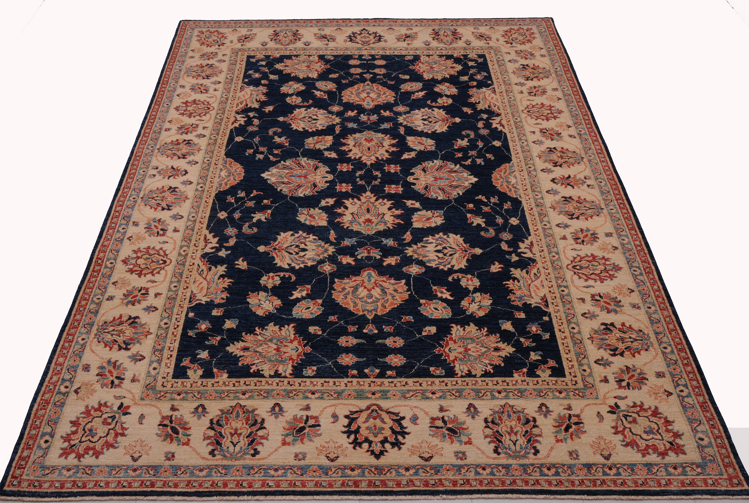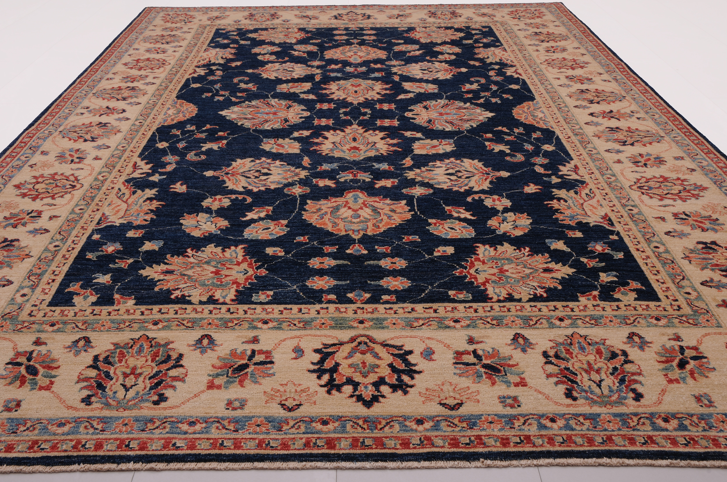 This 6’10” x 9’9″ Oushak rug, hand-knotted in Afghan / Pakistan, features a floral design. Crafted with approx. 156 kpsi, its field color is Blue with a Beige border. The rug has a low medium pile 1/4″-1/3″ and a 100% wool pile, in excellent & washed condition.