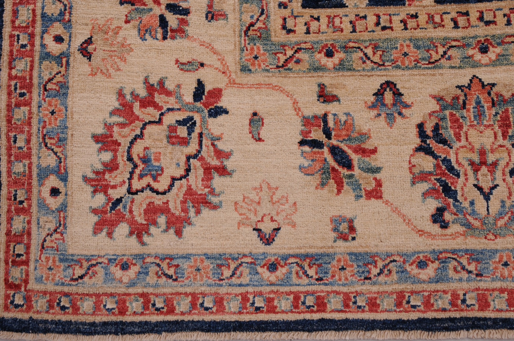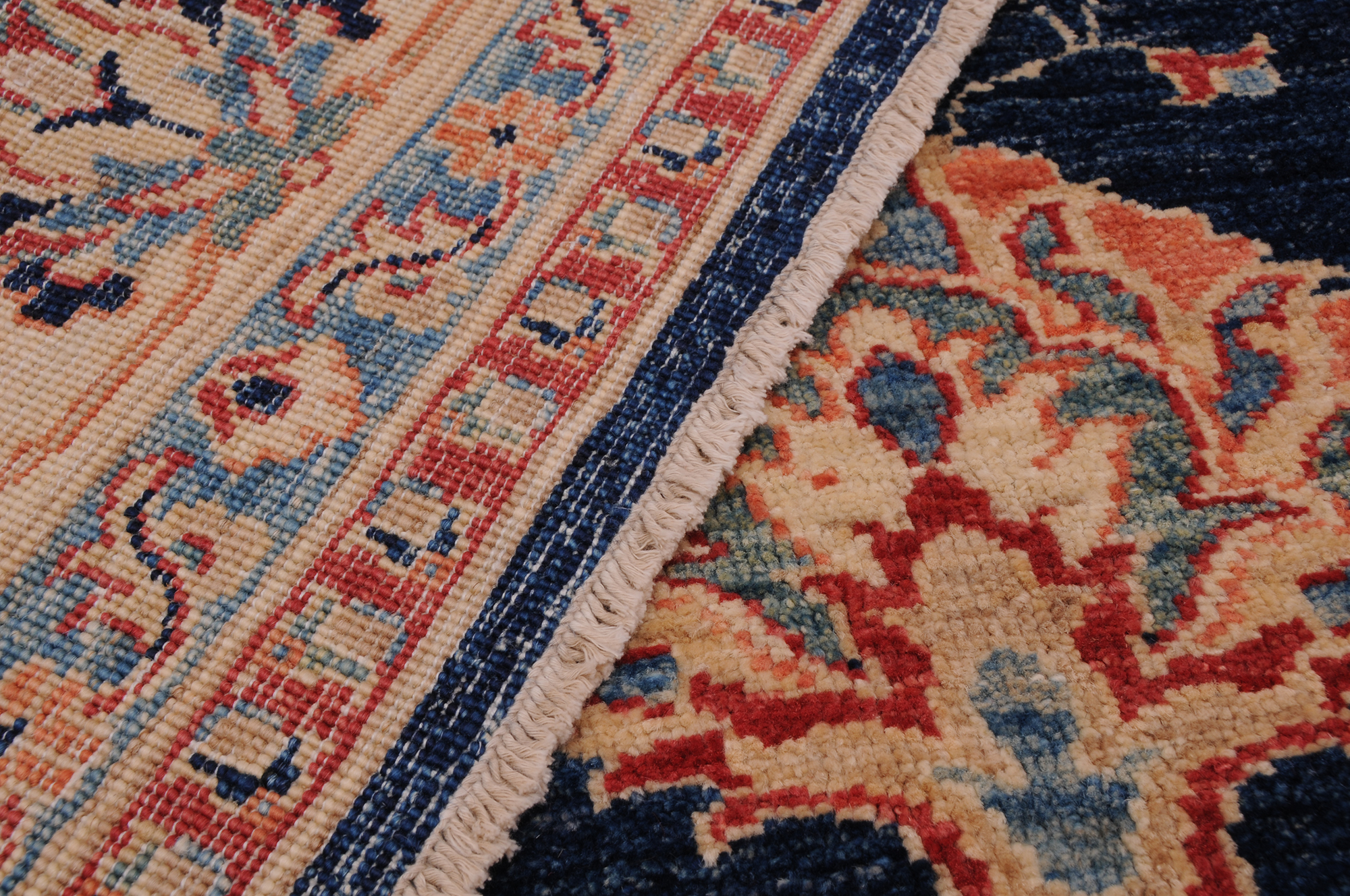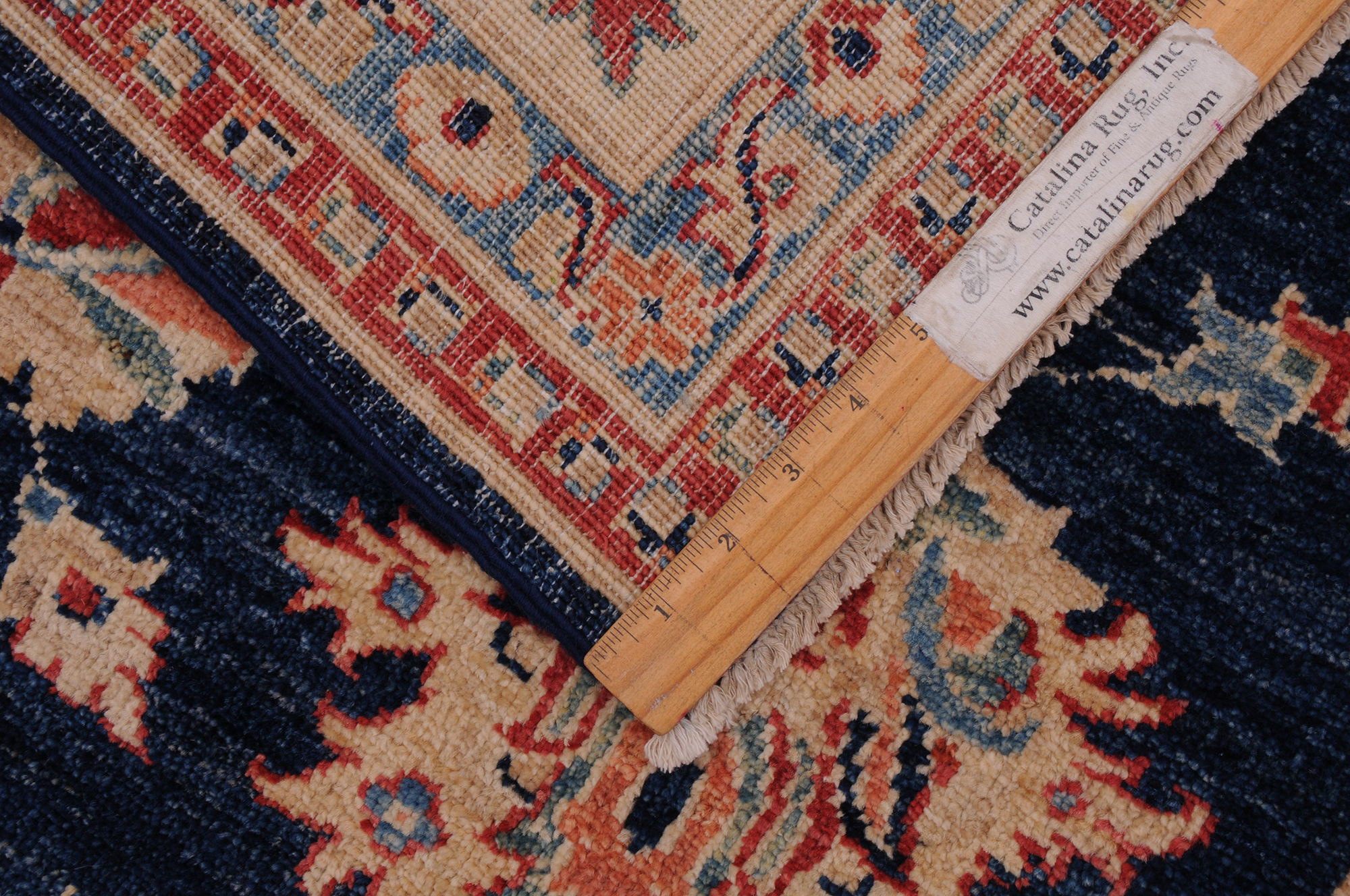 This 6’10” x 9’9″ Oushak rug, hand-knotted in Afghan / Pakistan, features a floral design. Crafted with approx. 156 kpsi, its field color is Blue with a Beige border. The rug has a low medium pile 1/4″-1/3″ and a 100% wool pile, in excellent & washed condition.