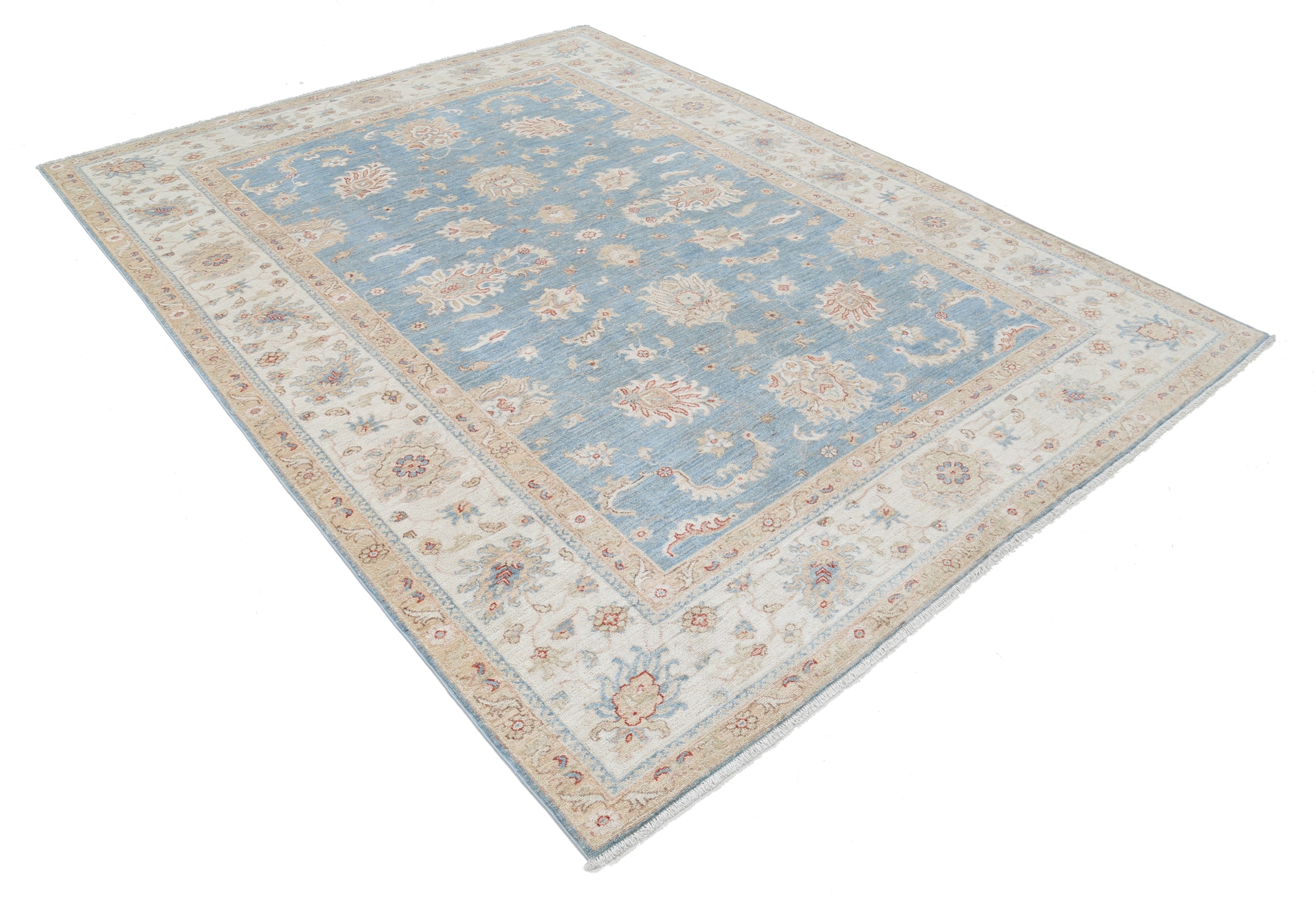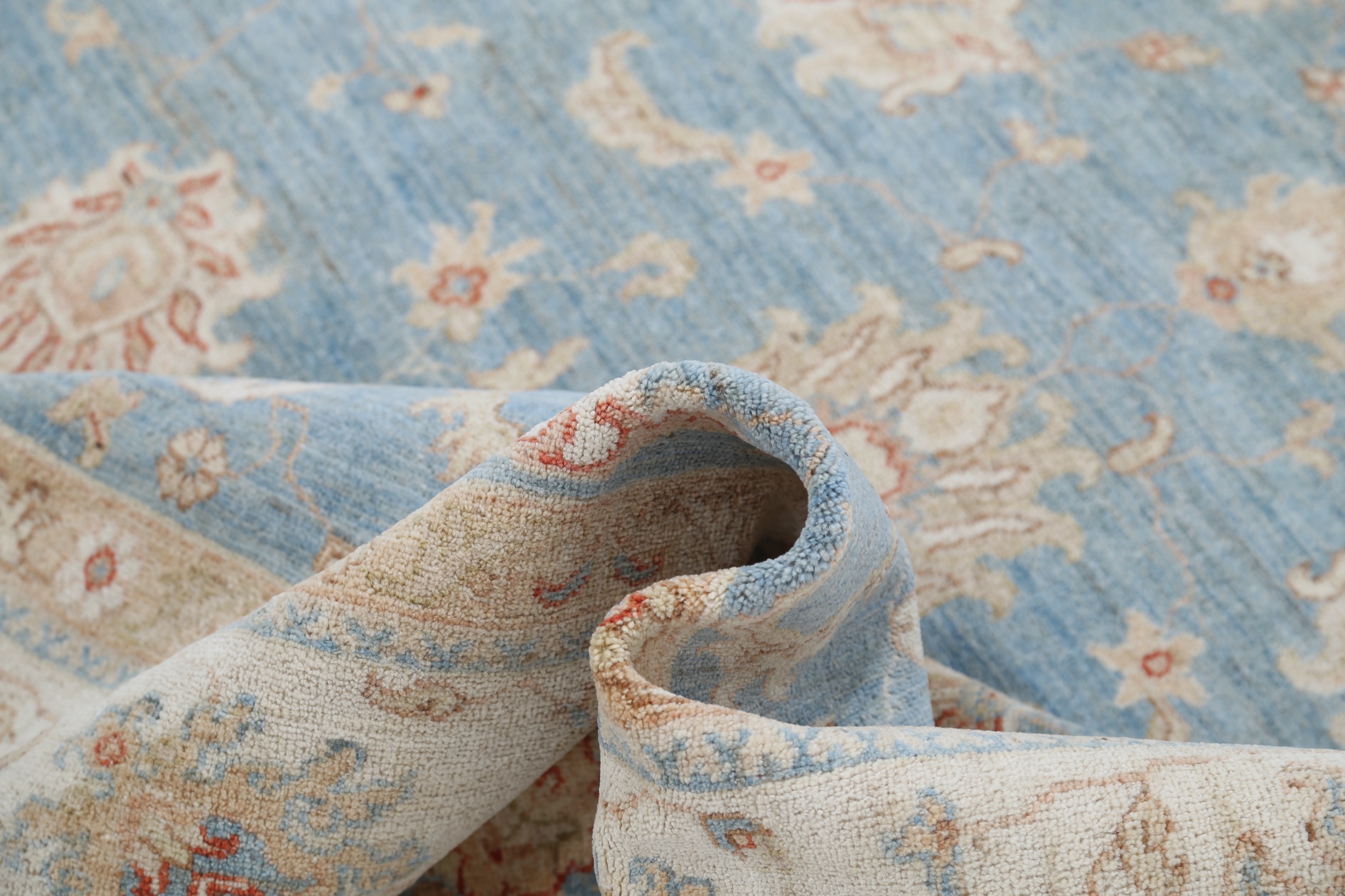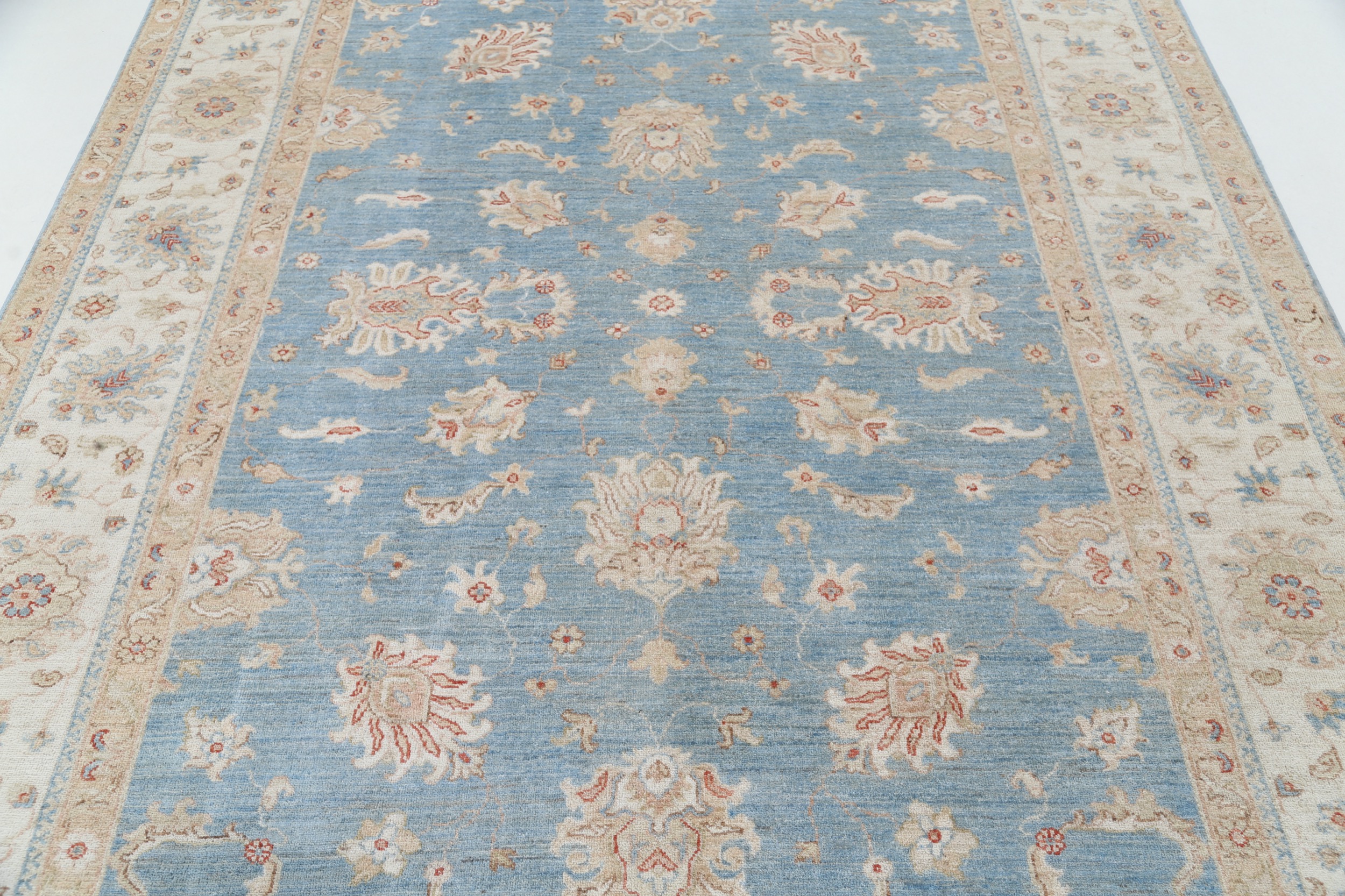This 6’11” x 9’2″ Oushak rug, hand-knotted in Afghan / Pakistan, features a floral design. Crafted with approx. 156 kpsi, its field color is Blue with a Beige border. The rug has a low medium pile 1/4″-1/3″ and a 100% wool pile, in excellent & washed condition.