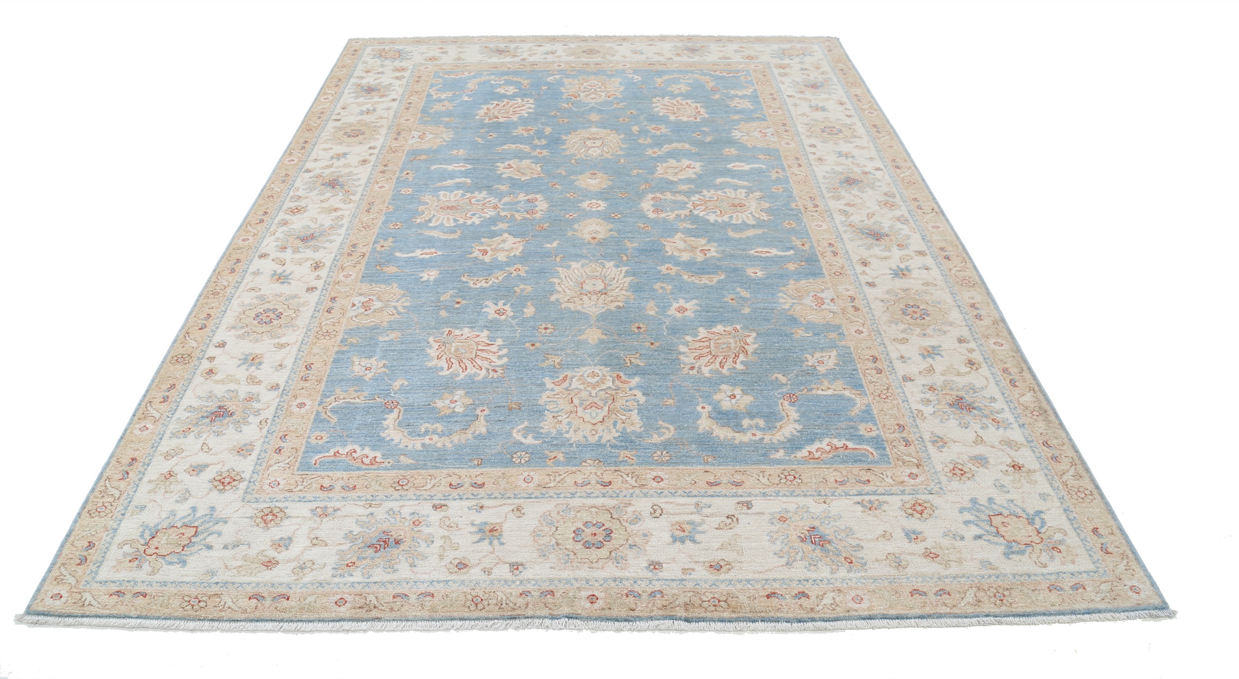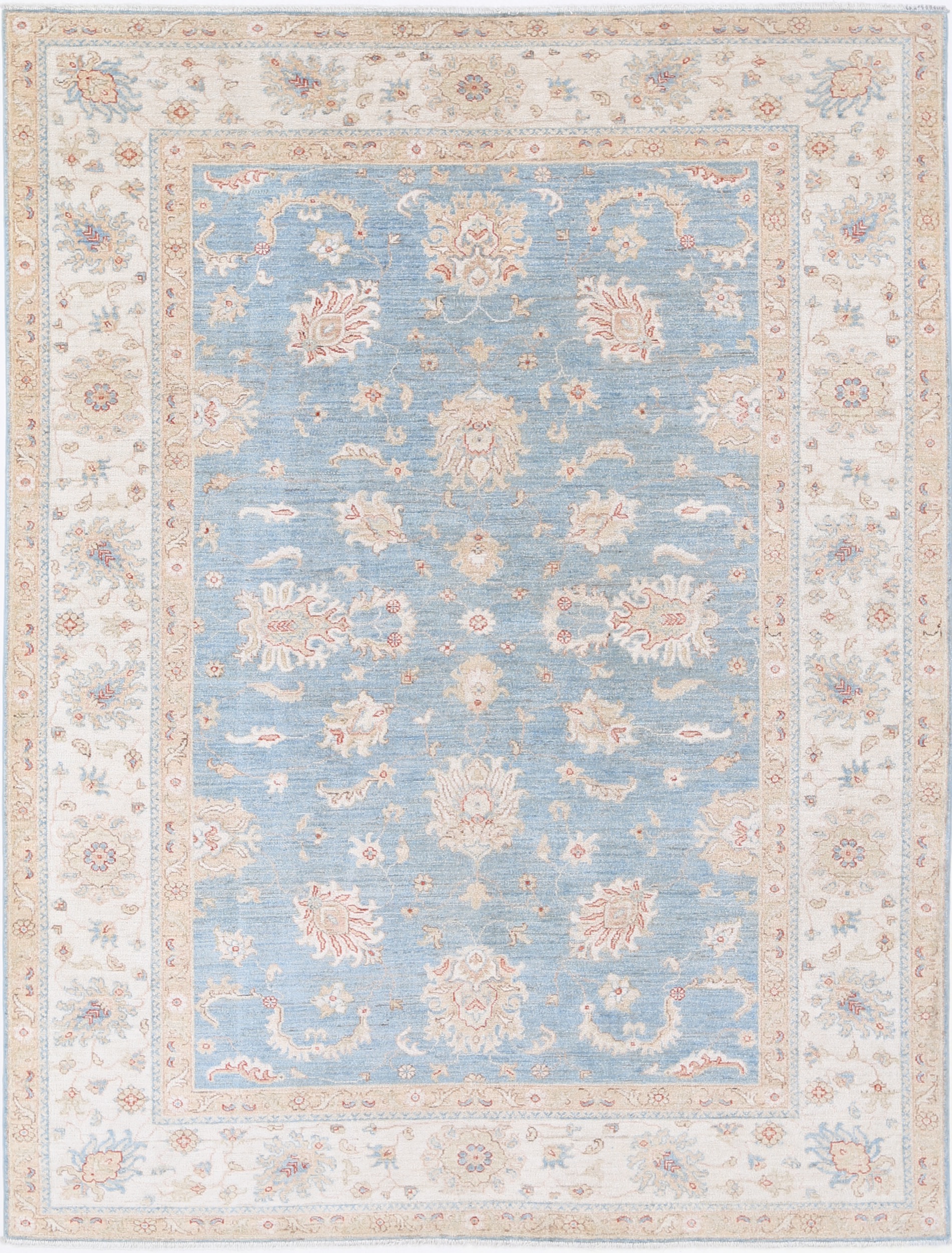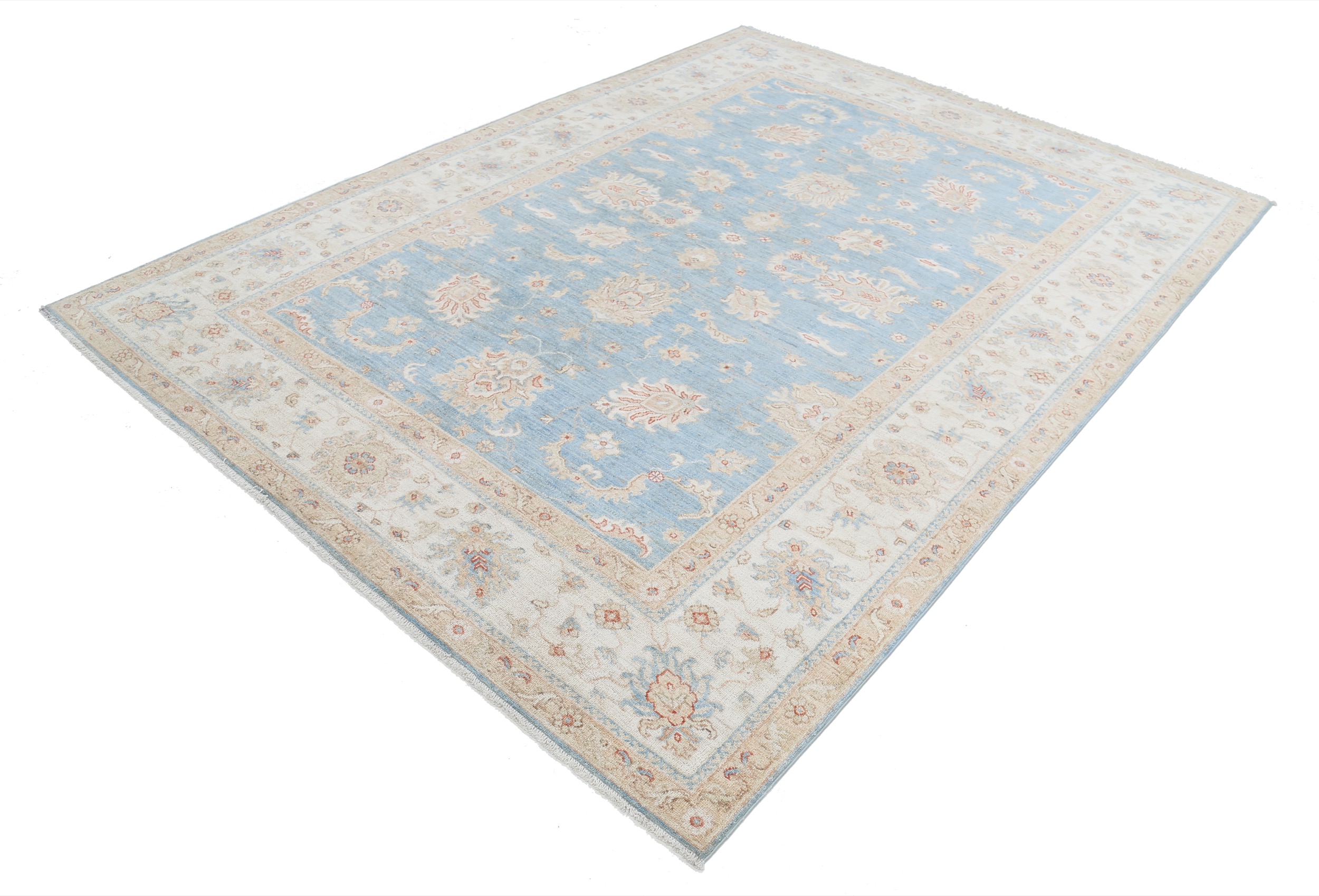 This 6’11” x 9’2″ Oushak rug, hand-knotted in Afghan / Pakistan, features a floral design. Crafted with approx. 156 kpsi, its field color is Blue with a Beige border. The rug has a low medium pile 1/4″-1/3″ and a 100% wool pile, in excellent & washed condition.