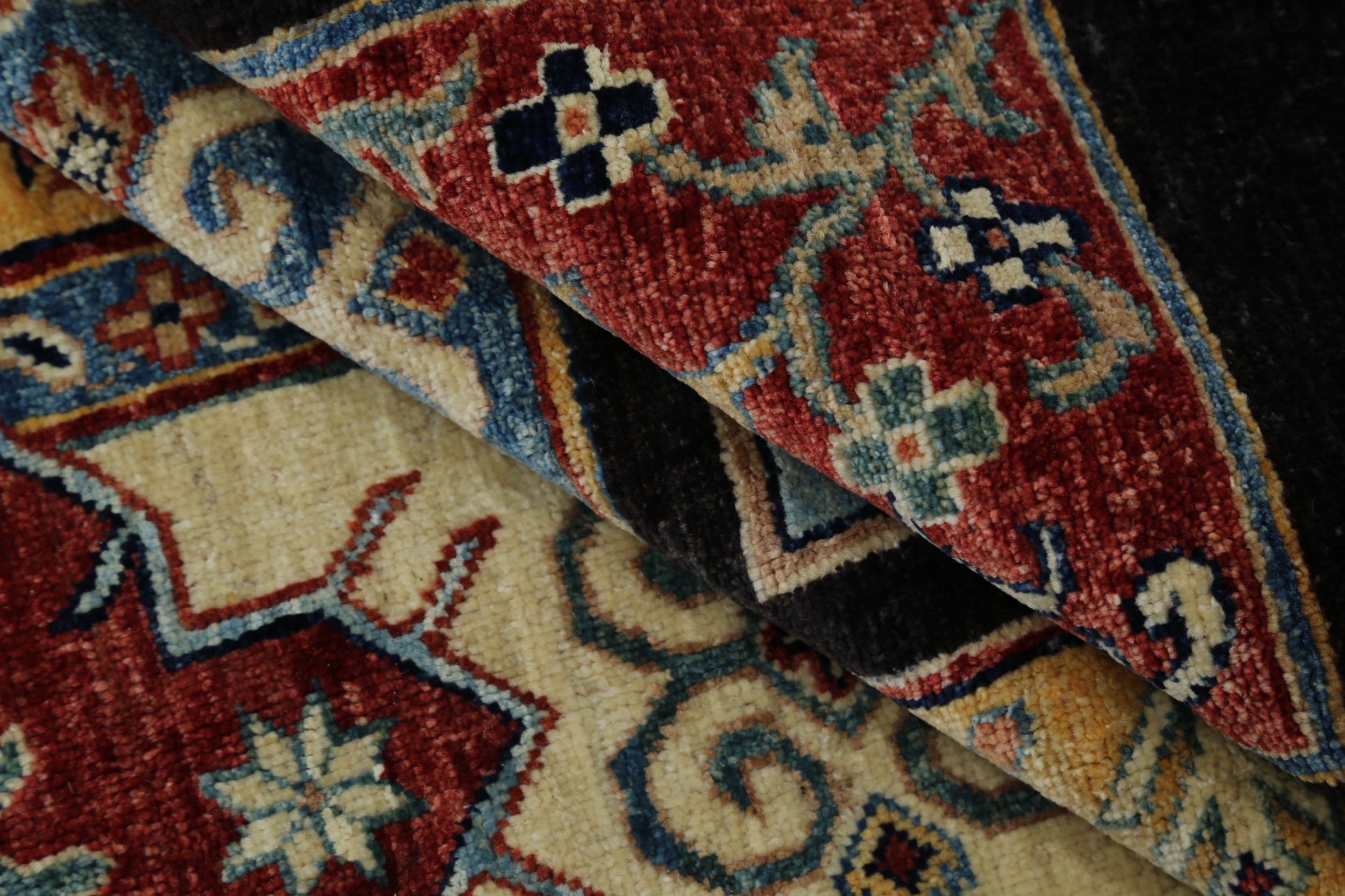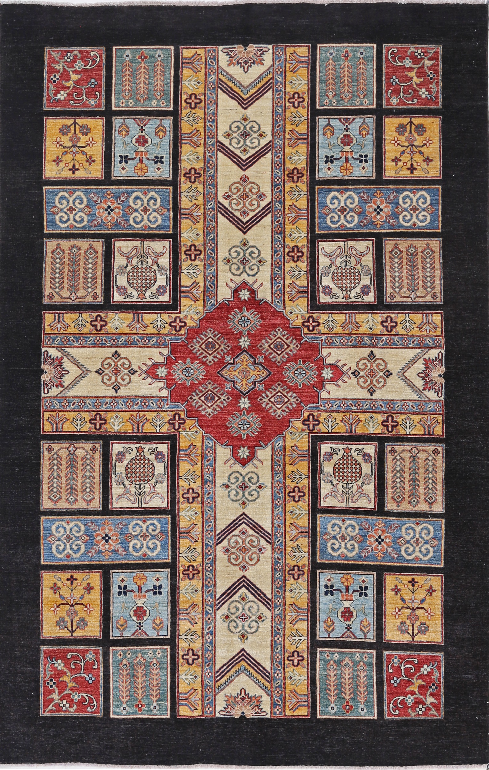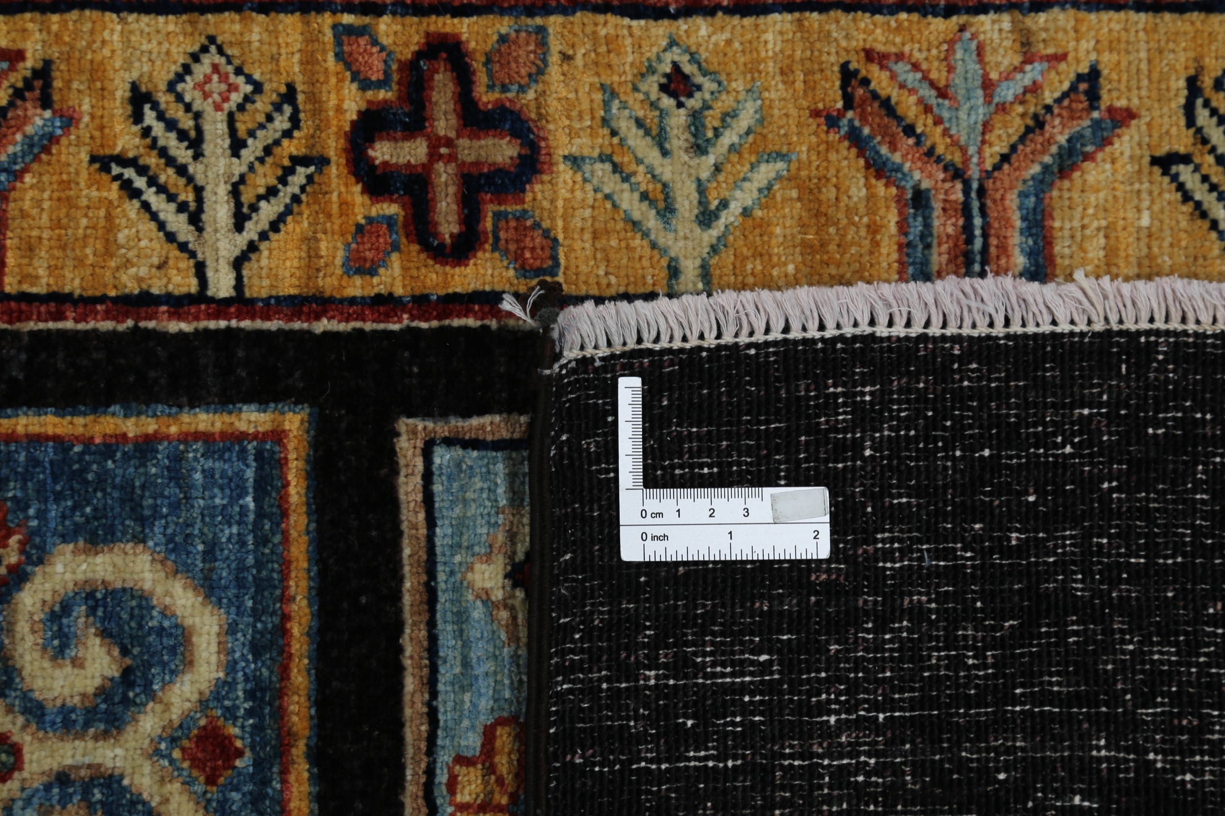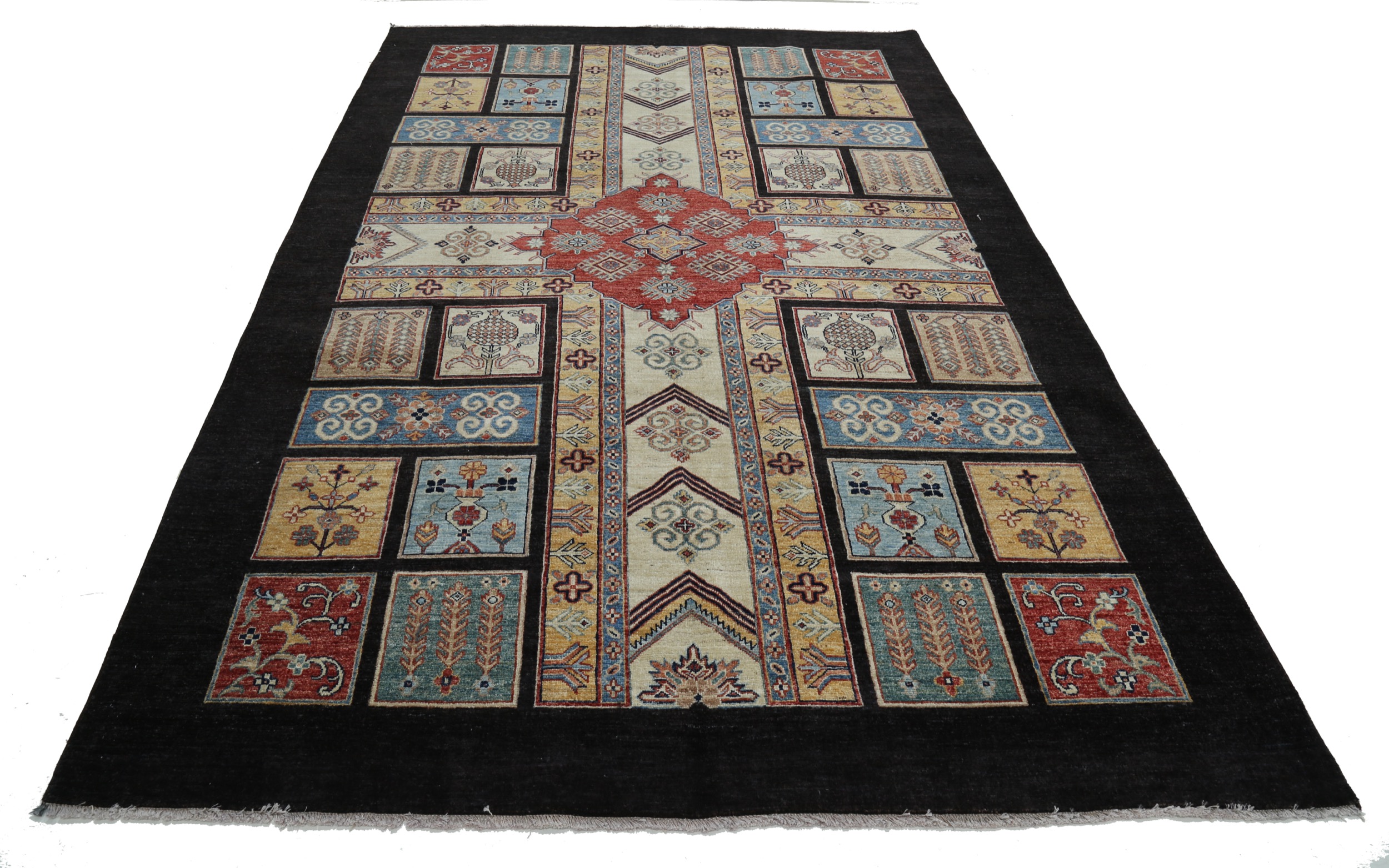 This 6’2″ x 9’8″ Oushak rug, hand-knotted in Afghan / Pakistan, features a floral design. Crafted with approx. 156 kpsi, its field color is Black with a Black border. The rug has a low medium pile 1/4″-1/3″ and a 100% wool pile, in excellent & washed condition.