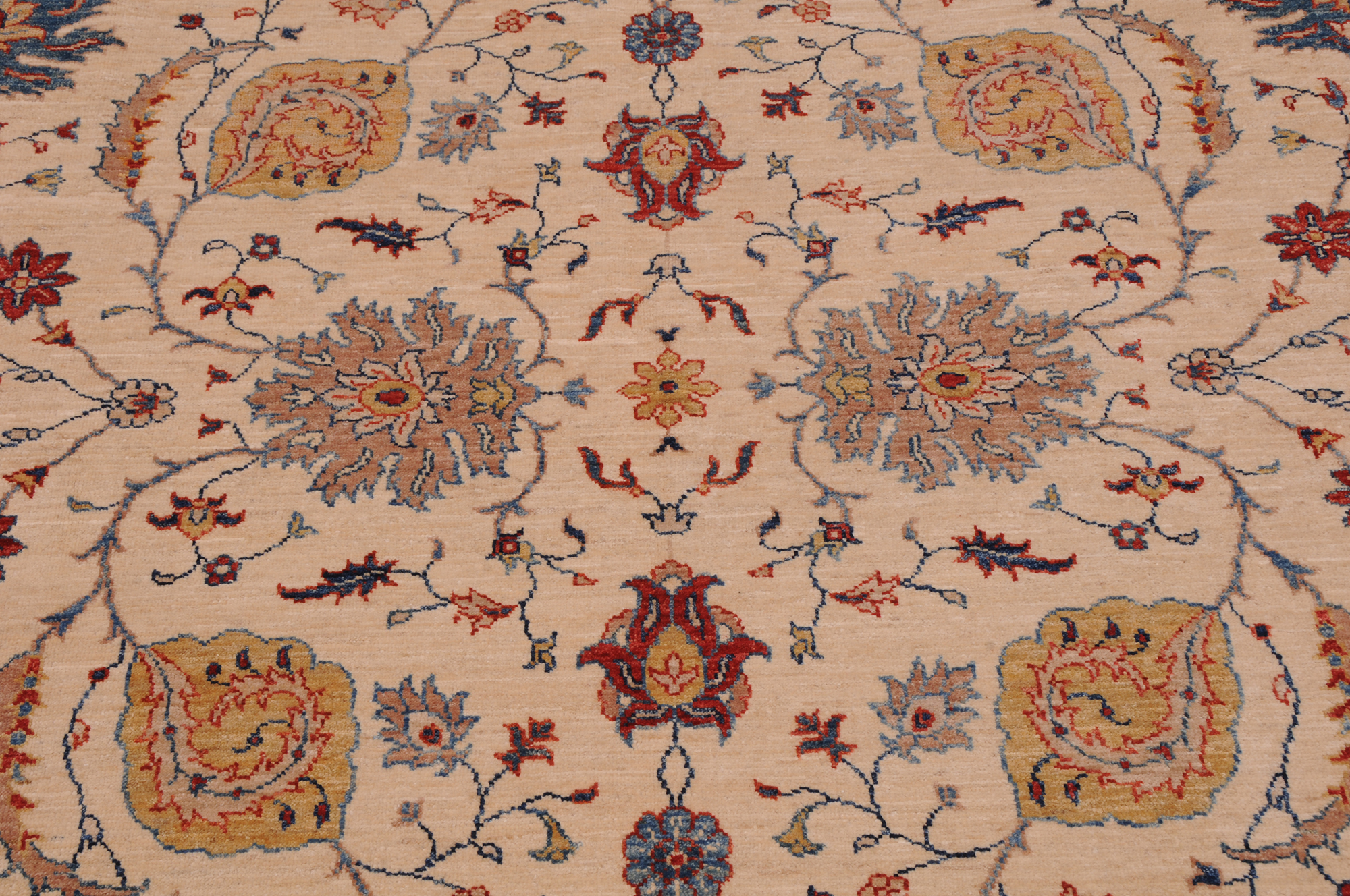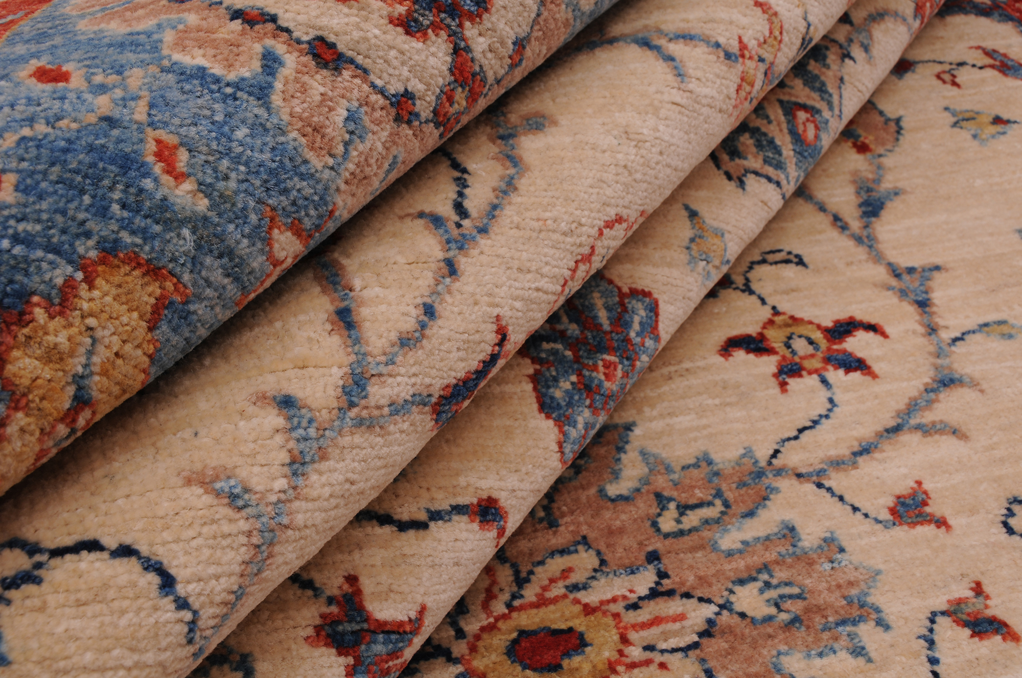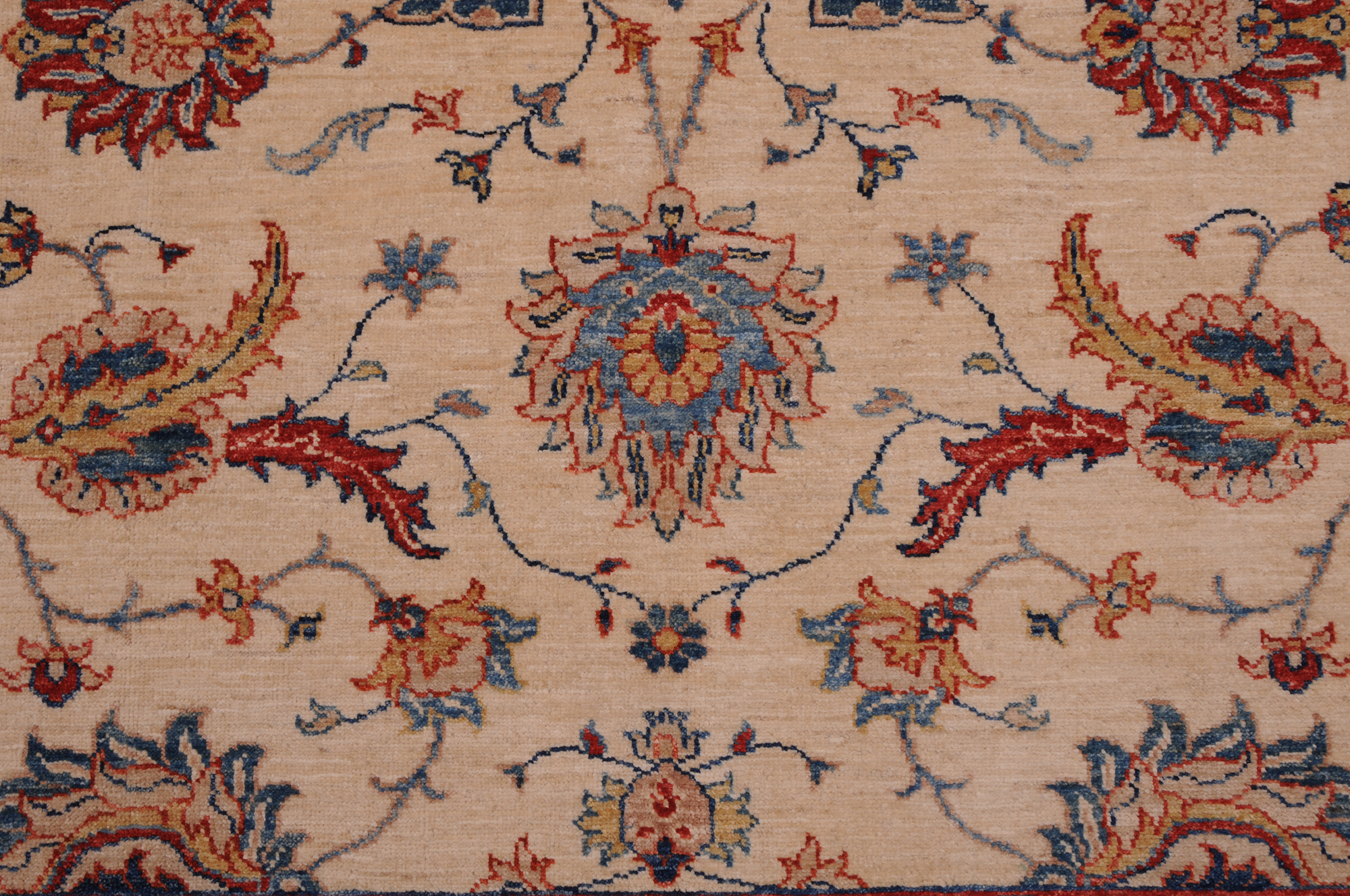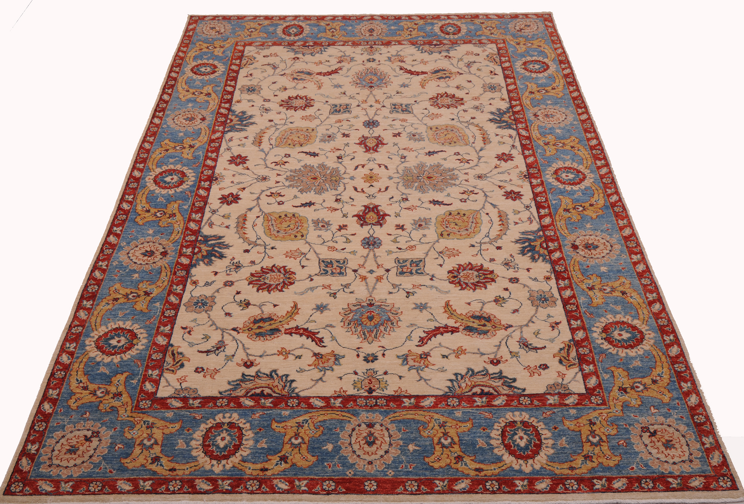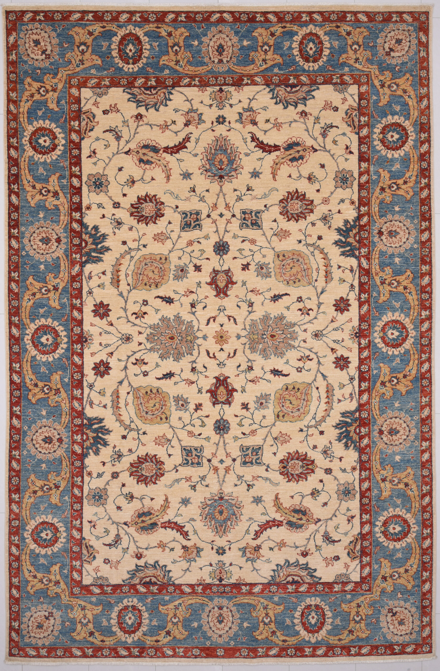 A stunning example of Oriental craftsmanship, this 6’5″ x 9’10” Oushak rug is hand-knotted in Afghan / Pakistan. Its beige field and blue border frame a detailed floral design, known for its refined, traditional aesthetics. Durable and beautifully textured with a low medium pile 1/4″-1/3″ pile.