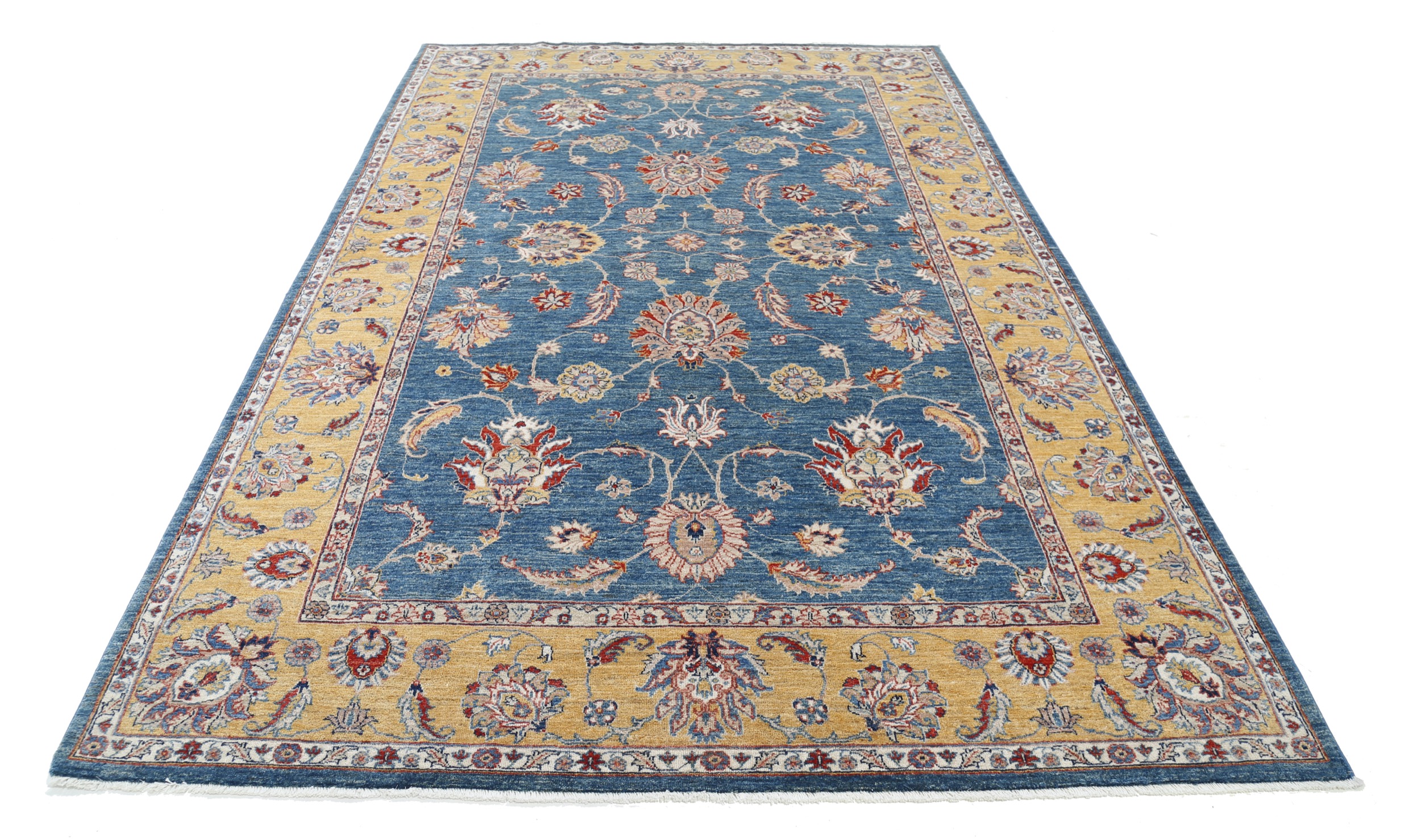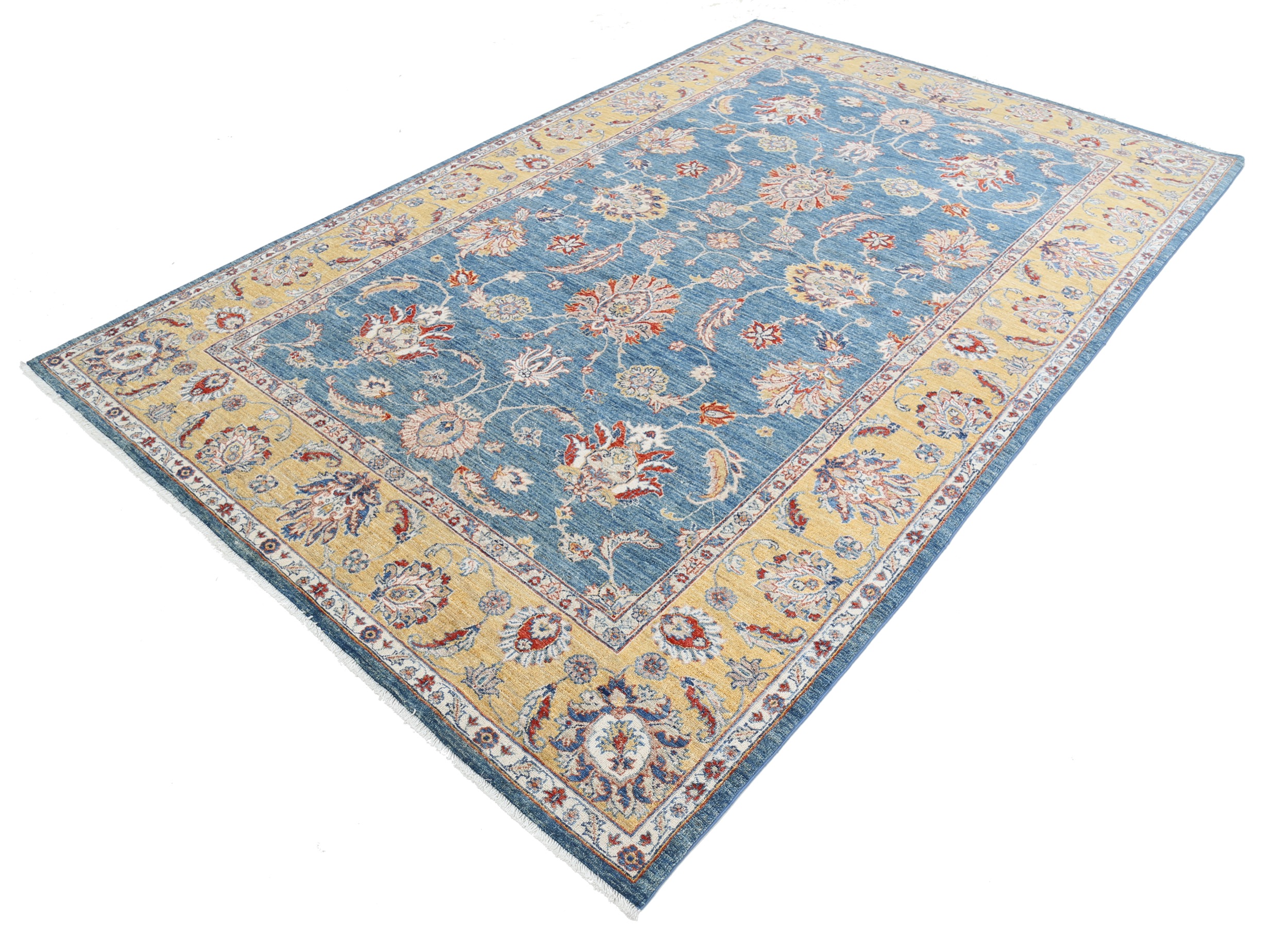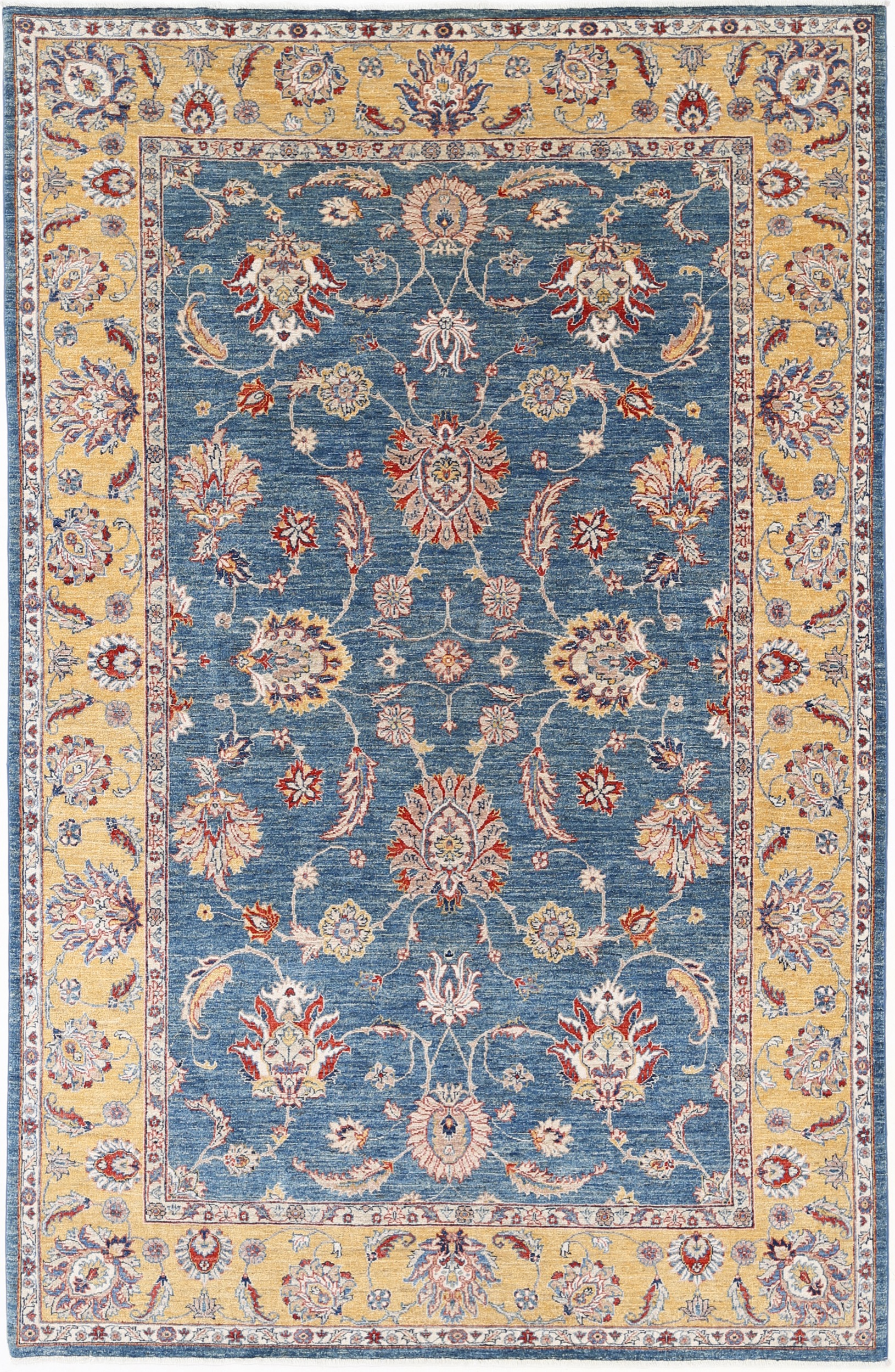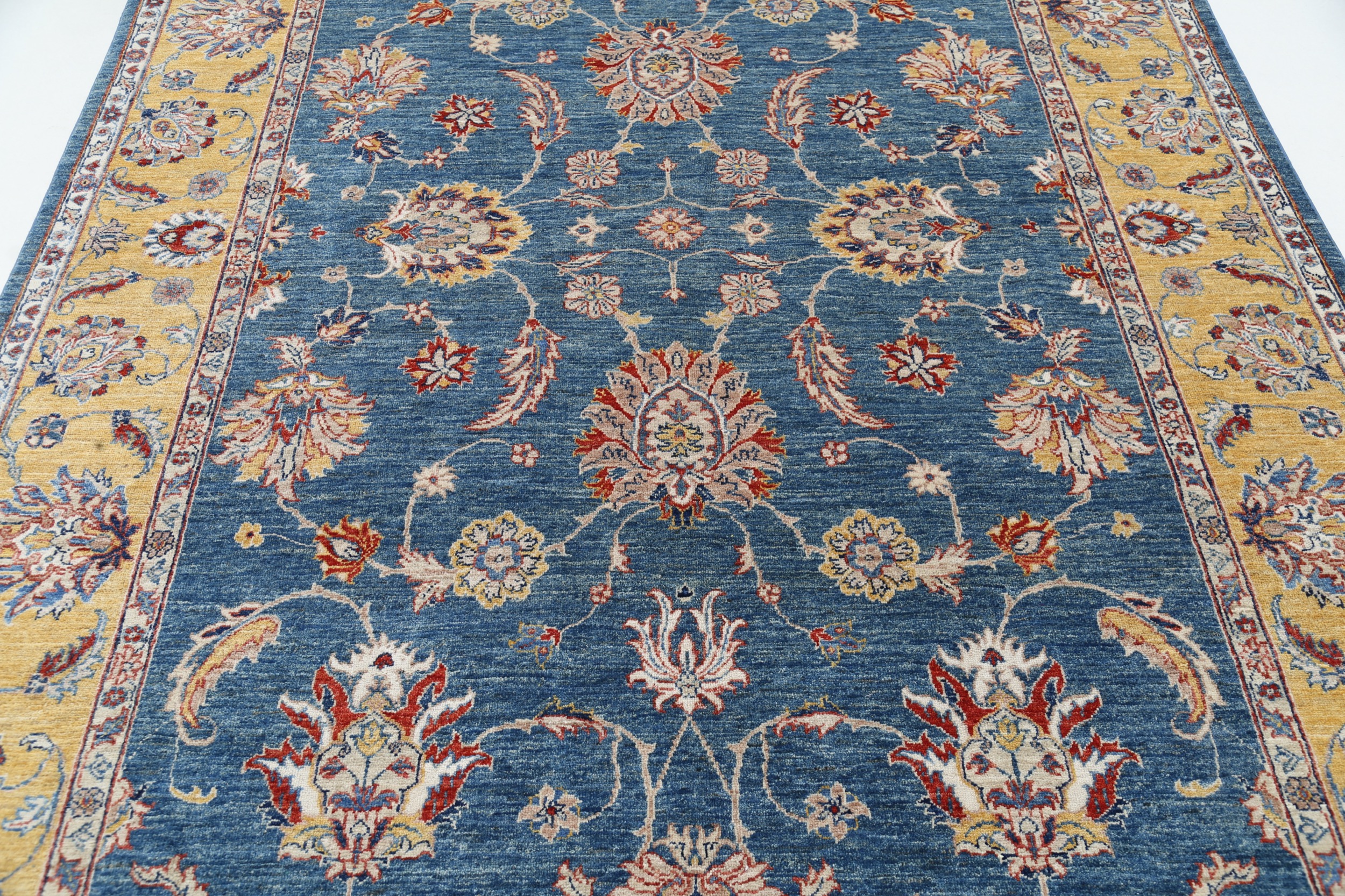 This 6’5″ x 9’10” Oushak rug, hand-knotted in Afghan / Pakistan, features a floral design. Crafted with approx. 156 kpsi, its field color is Blue with a Yellow border. The rug has a low medium pile 1/4″-1/3″ and a 100% wool pile, in excellent & washed condition.
